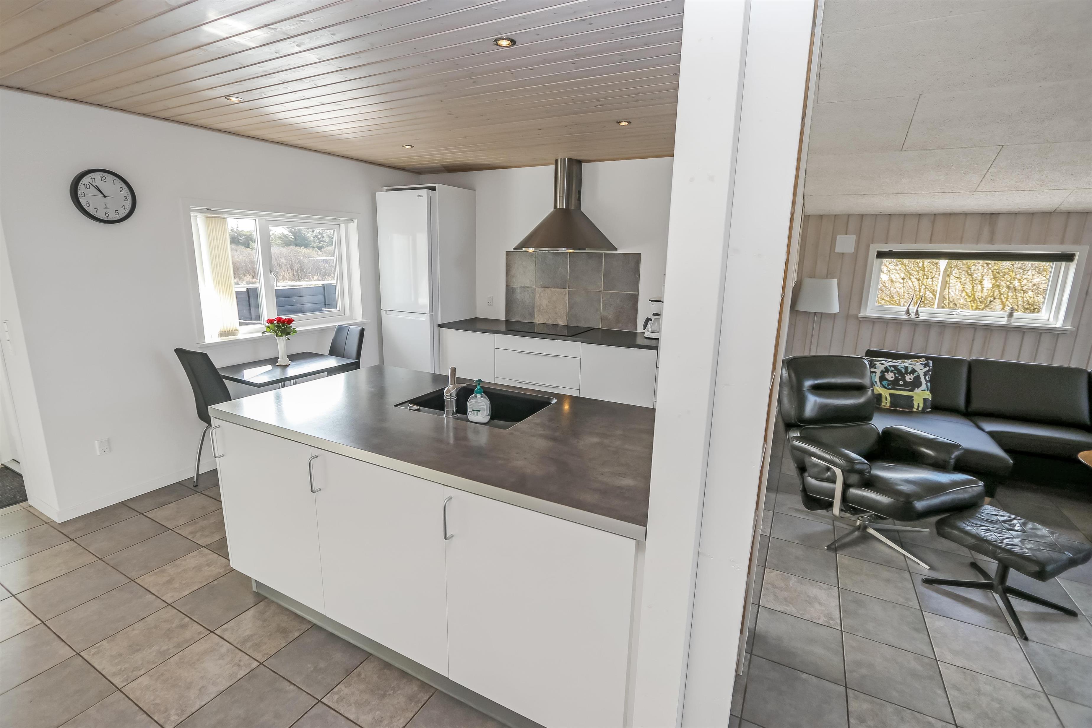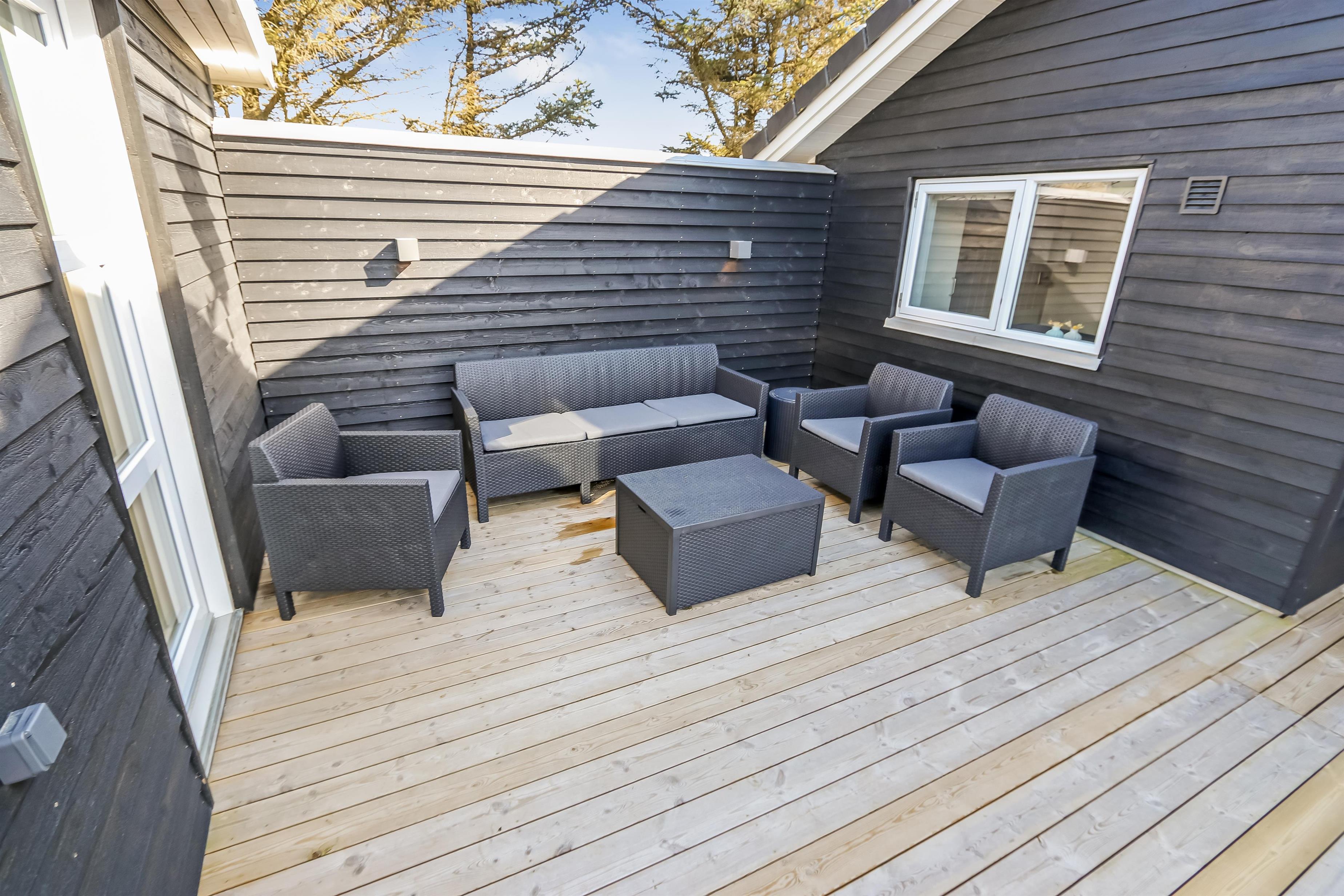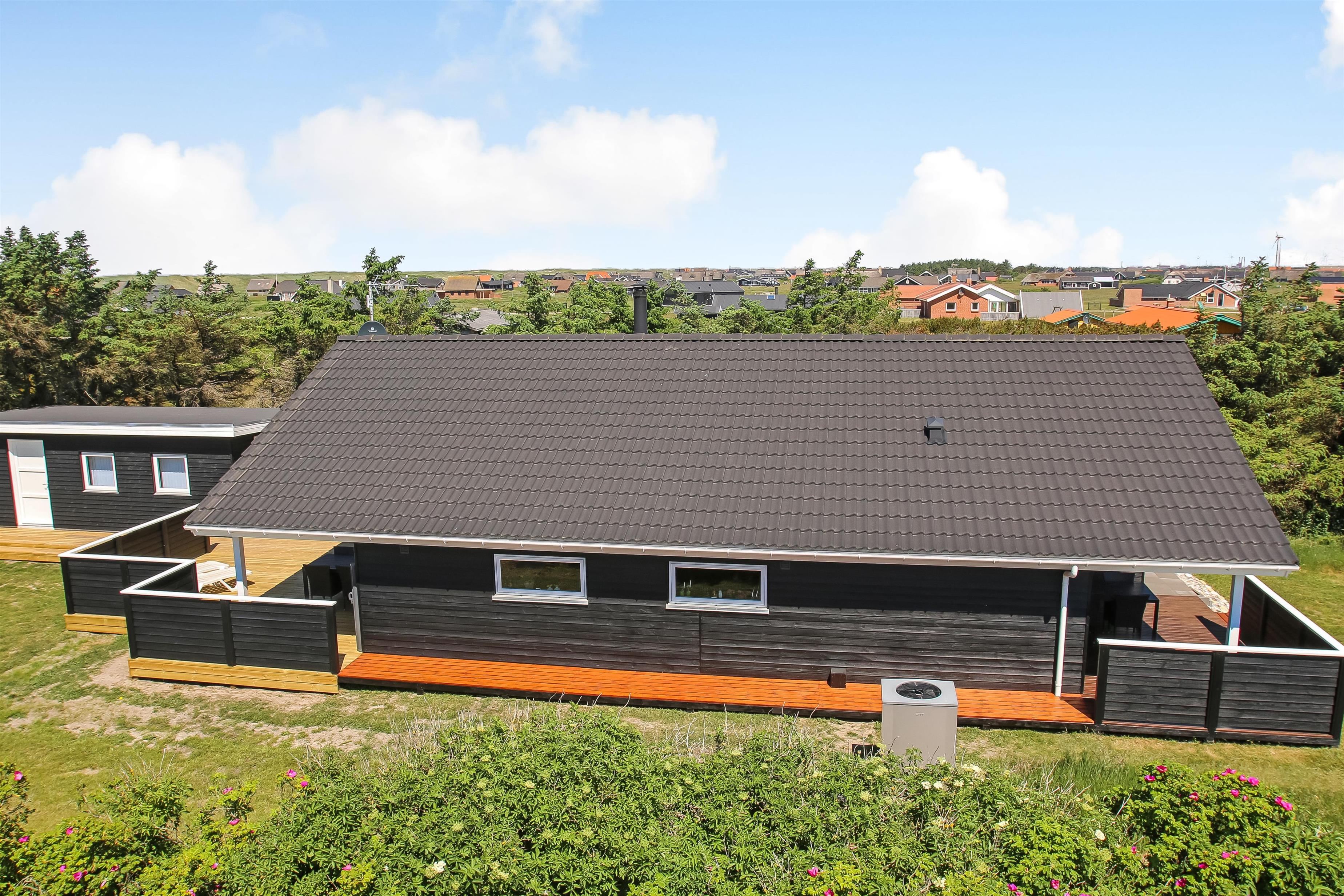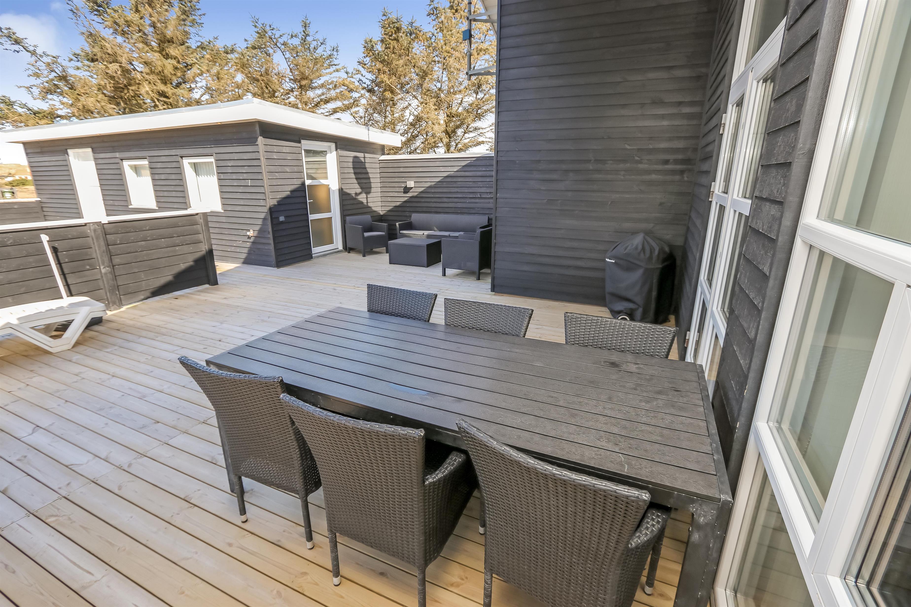 Der er en lækker stor terrasse, som er delvis overdækket. Her er der havemøbler, lounge møbler og 2 solvogne, alle med hynder til, som er i skuret i en hyndeboks. Der er også en kul Grill og grill starter. Der er også en mindre delvis overdækket terrasse foran huset. Her står morgensolen op, hvilket gør det dejligt at sidde og få morgenkaffe om sommeren. Der er kun 250 meter til Vesterhavet og den brede strand, hvor der altid er masser af plads til aktiviteter alt efter sæsonen. Man kan fiske hele året rundt og solbade om sommeren. Drageflyvning er altid muligt og de små elsker at bygge i sandet. Vandreture langs havet er også utroligt populært og her kan man se nogle af de mest fantastiske solnedgange over Vesterhavet.Dette dejlige store rummelige sommerhus ligger kun 250 meter fra Vesterhavet med dejlig sydvestvendt terrasse. Usædvanligt for området så er der højere bevoksning omkring huset - dette giver læ og gør beliggenheden idyllisk. Huset har 1 badeværelse + 1 gæstetoilet samt hele 3 soveværelser og en sovehems. Her er gratis trådløs internet. Husdyr og rygning er ikke tilladt.