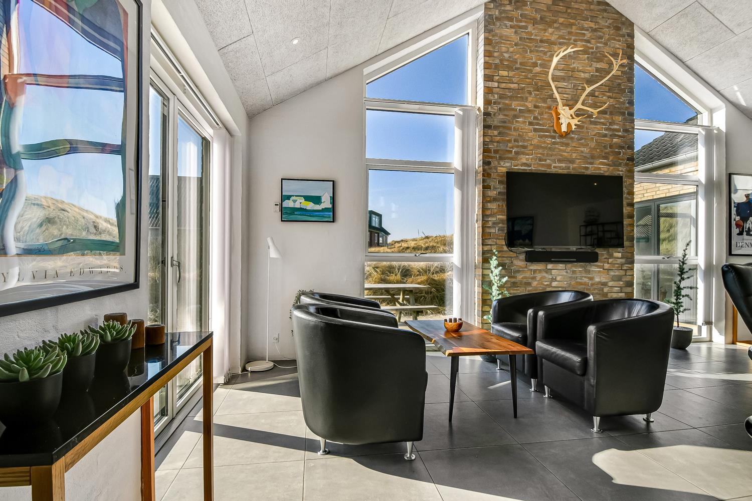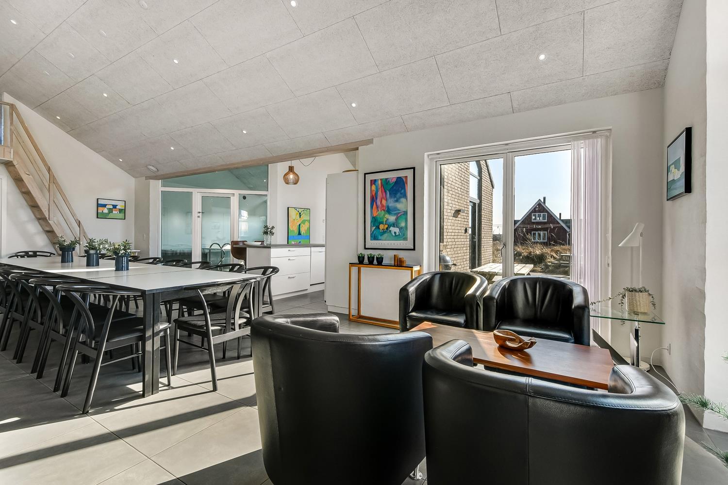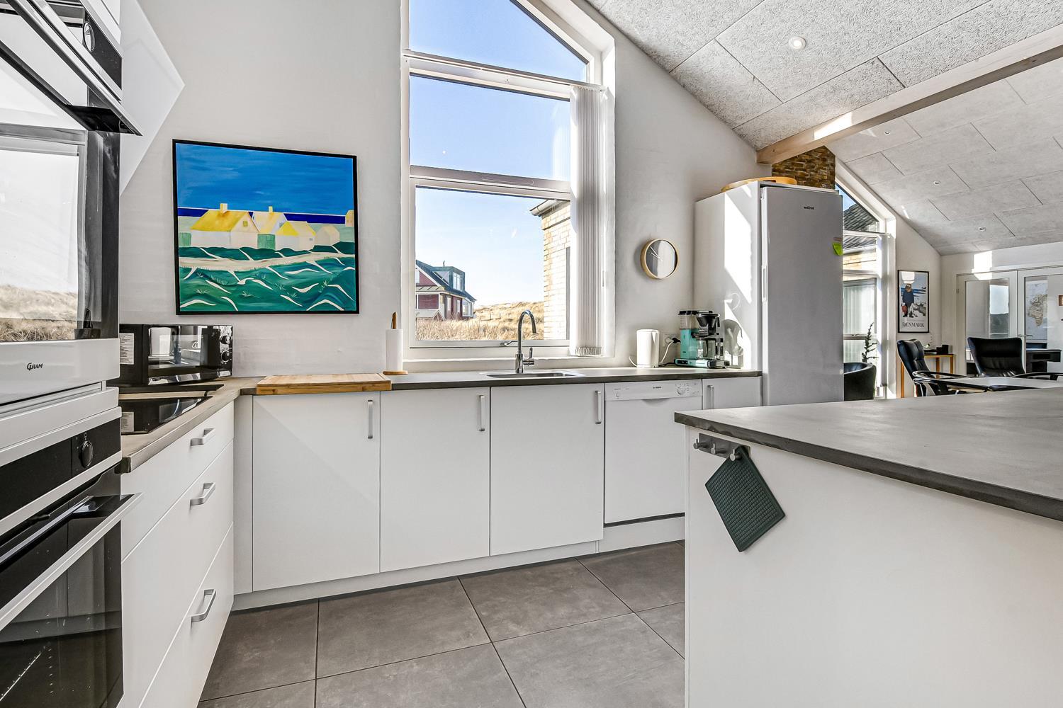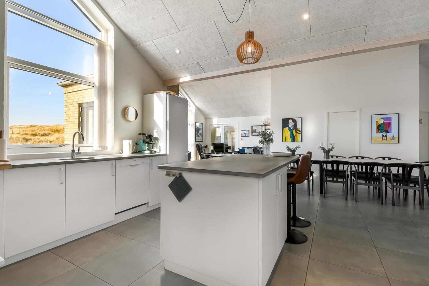 Allerede undervejs ud til dette pragtfulde feriehus, fornemmer man husets fantastiske beliggenhed tæt op ad Vesterhavets store klitter. Huset er 241 m2 stort og har 6 dejlige soverum (1DS, 1DS, 1DS, 1DS, 2ES, 2ES). Derudover forefindes 8 sovemuligheder fordelt på 2 hemse. I hjertet af huset findes et stort, veludstyret køkken / alrum med alt i service / køkkengrej og alt i hårde hvidevarer. Køkkenhjørnet har bl.a. keramiske kogeplader, indbygnings ovn, emhætte, opvaskemaskine og stort køleskab. Nyd maden ved det store spisebord, kig ud af vinduet og se de store høje klitter direkte ved Vesterhavet eller slap af i de bløde kvalitetsmøbler. Se TV på dansk og tysk eller stream din ynglings serie på et af husets smart-TV. Der er flotte, praktiske klinker med gulvvarme i alle husets rum og huset er særdeles rengøringsvenligt.