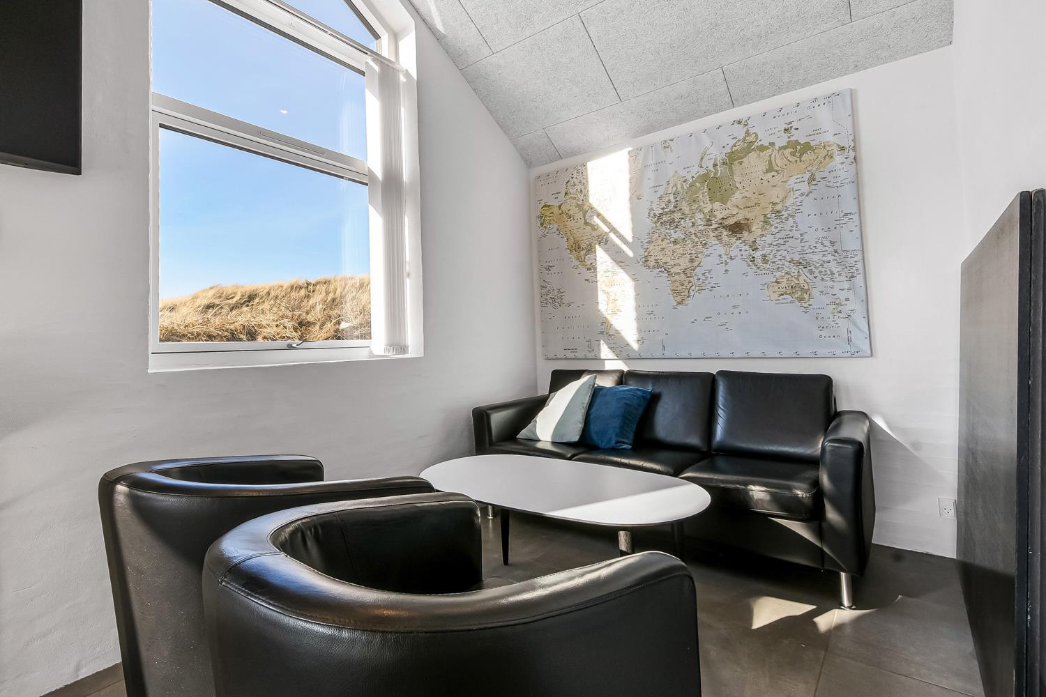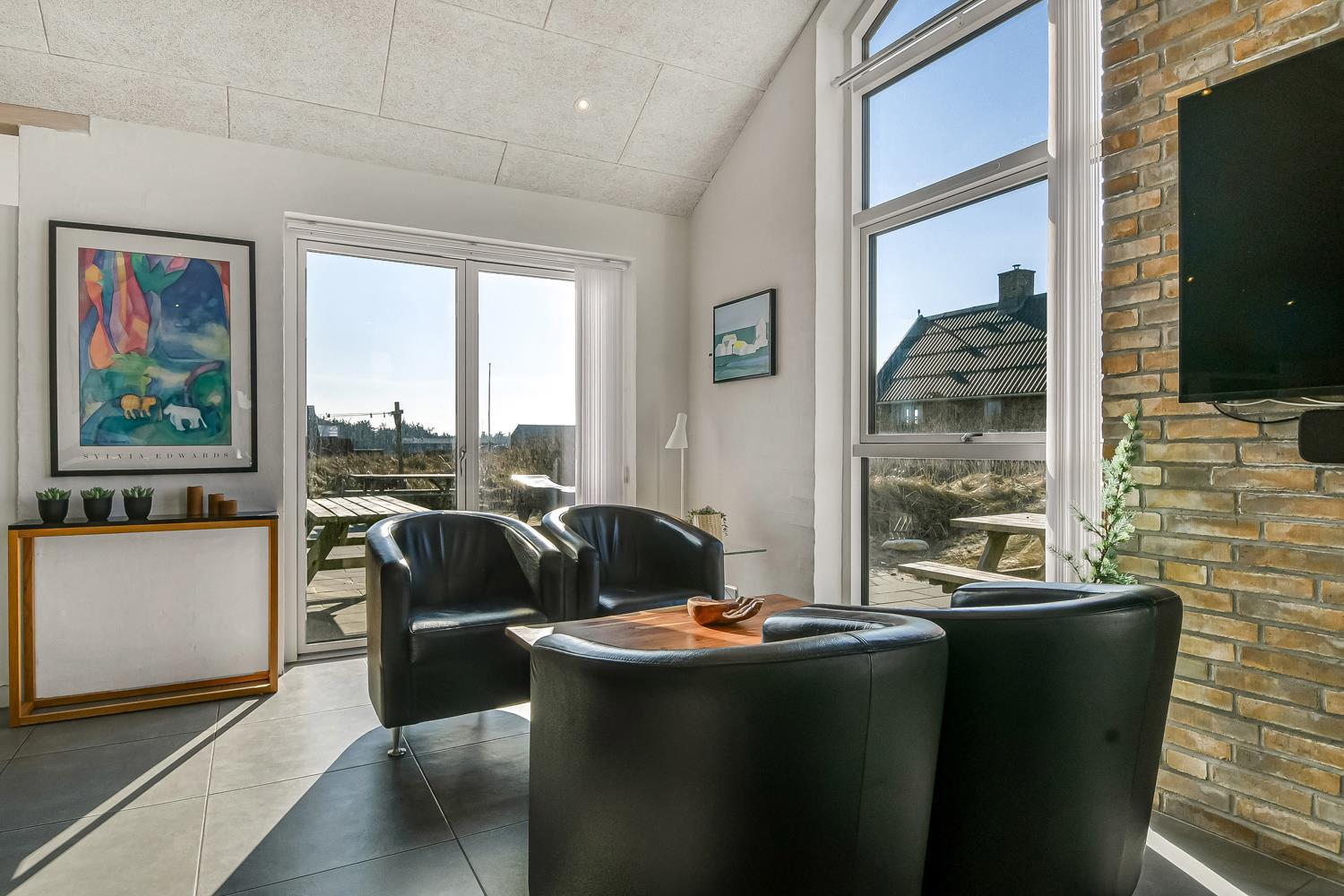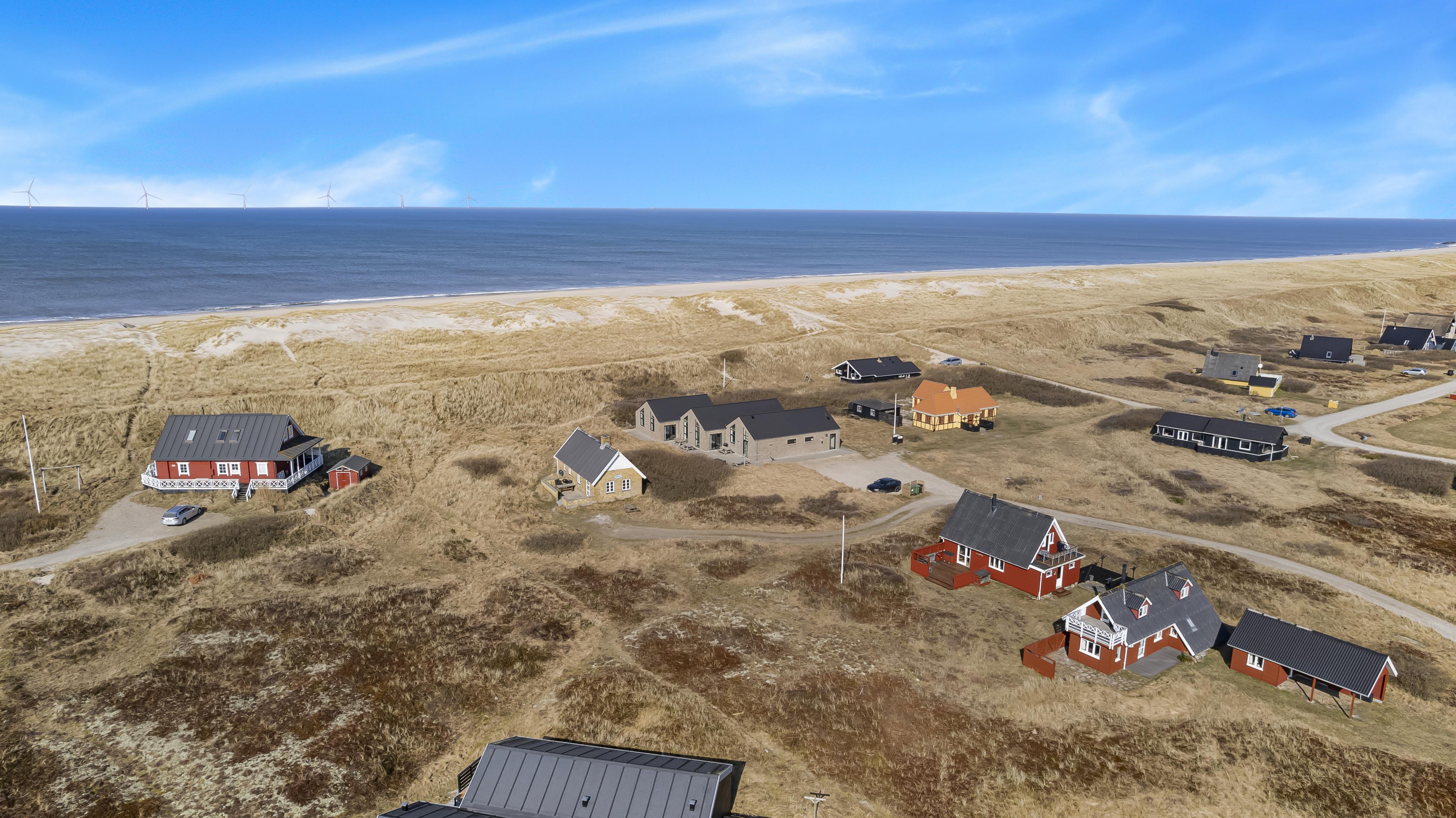 Feriehuset er beliggende på en 2.339 m2 stor klitgrund kun 75 meter fra Vesterhavet. Stort terrasseanlæg havemøbler, solvogne og grill. Nyd solen, hinanden eller en god grillaften. Gå en tur med hunden i det rolige feriehusområde, henover de høje klitter og straks derefter åbenbarer Vesterhavet sig. Hver dag byder Vesterhavet på nye maleriske oplevelse, der invitere til en frisk gå- eller løbetur. Eller hvad med en lille tur på ca. 10 - 15 min op til områdets lille købmand som i sæsonen har åbent og byder på frisk morgenbrød og hvor de daglige indkøb også kan klares. Så hvad enten du er til aktiv ferie eller total afslapning danner dette flotte feriehus den perfekte ramme både hvad angår hus, beliggenhed og omgivelser. Indenfor kort køre afstand nås både den aktive handelsby i Lemvig med flere specialbutikker eller den unikke fiskerby Thyborøn som udover den aktive fiskerihavn også byder på badestrand og op til flere aktivitetstilbud, som alle er et besøg værd.