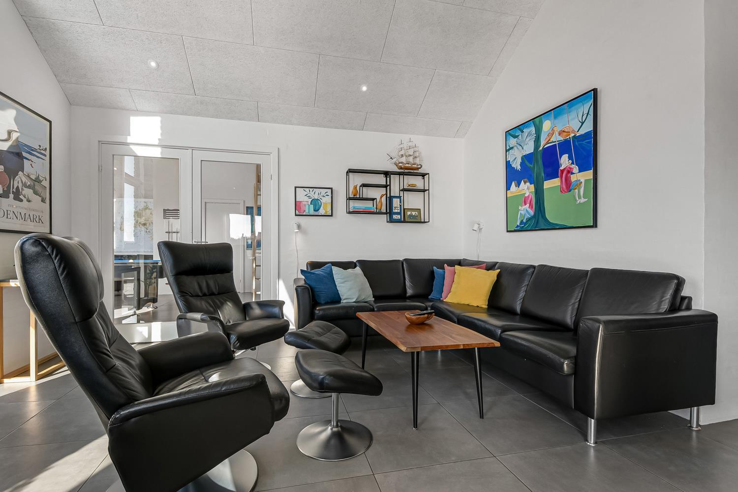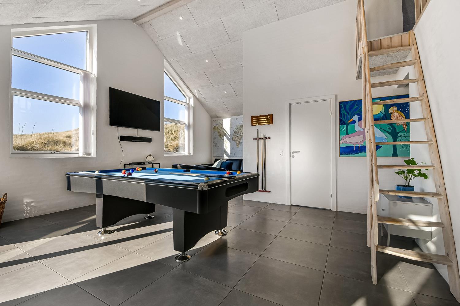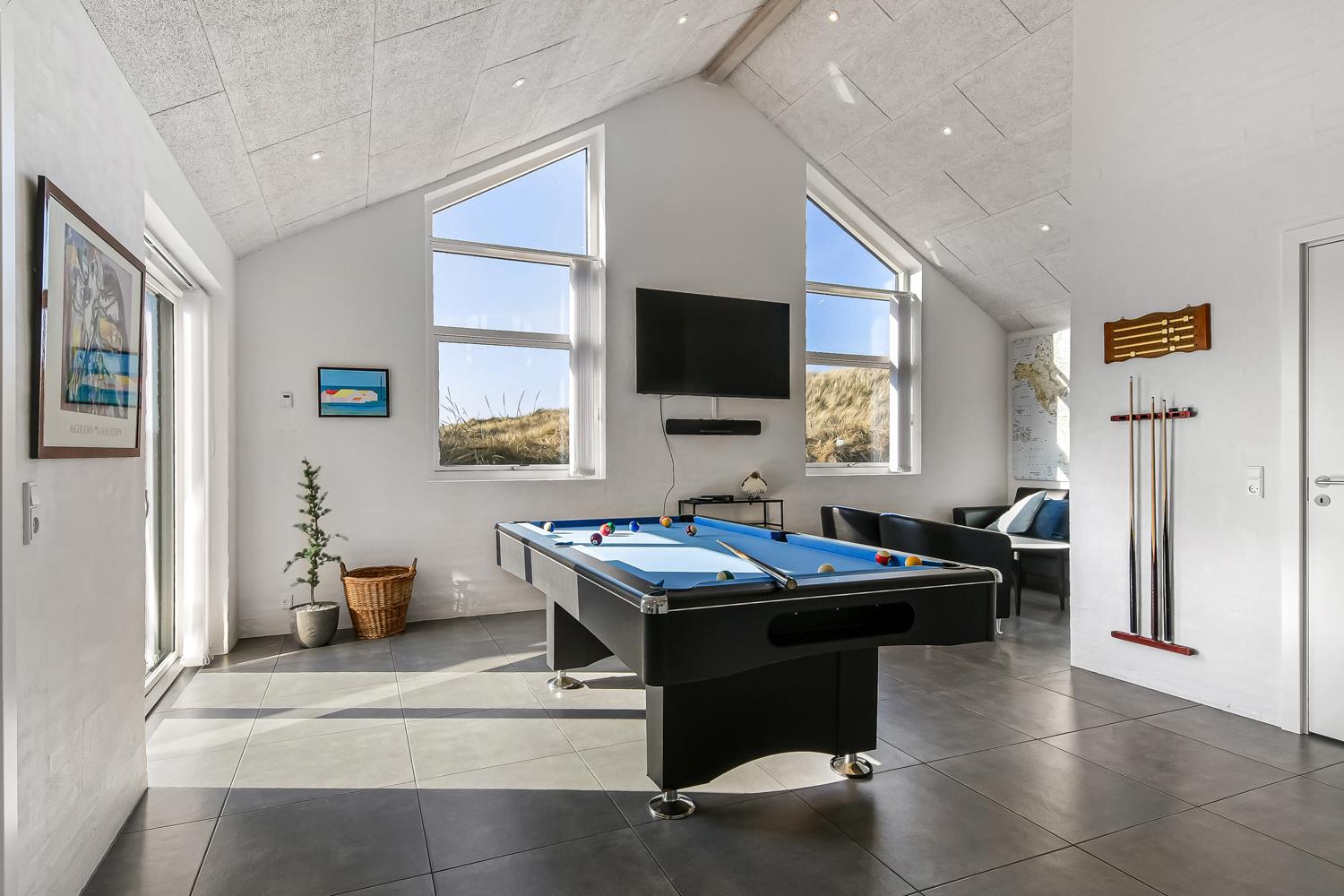 Husets store wellness / pool afdeling rummer også spabad, baderum og separat toilet. Der er indbygget projektor som gør at man kan se TV på huset store hvide væg, mens man er i poolen eller sidder i spabadet. En dejlig, flot sauna med separat indgang udefra. Aktivitetsrummet har kombineret poolbord og bordtennis samt nye lædermøbler og endnu et smart-TV magen til det første og med samme muligheder. m.m. 2 badeværelser, med toilet, bruser, håndvask samt gulvvarme og herudover er der et toilet med håndvask samt separat baderum i poolafdelingen. Stor entré byder velkommen og her er der Vaskemaskine og tørretumbler separat fryseskab. Til børnene er der barneseng og barnestol. Nyt luft til vand anlæg gør huset særdeles energivenligt og bevirker også et billigere forbrug Max. 2 husdyr er tilladt. Huset lejes ikke ud til ungdomsgrupper. Depositum i vintersæson kr. 7000 og sommersæson kr. 3500. Har man el-bil eller en Plug-In hybrid, så er der opsat ladeboks.
