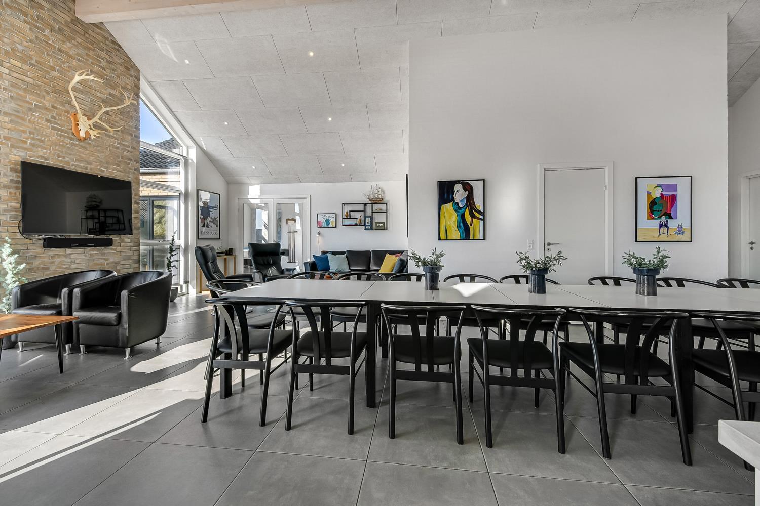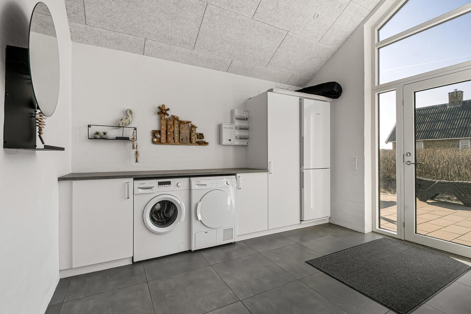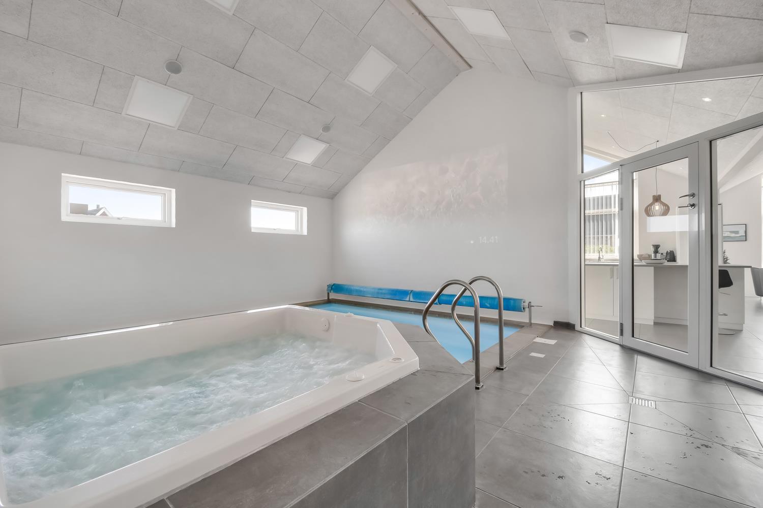 Husets store wellness / pool afdeling rummer også spabad, baderum og separat toilet. Der er indbygget projektor som gør at man kan se TV på huset store hvide væg, mens man er i poolen eller sidder i spabadet. En dejlig, flot sauna med separat indgang udefra. Aktivitetsrummet har kombineret poolbord og bordtennis samt nye lædermøbler og endnu et smart-TV magen til det første og med samme muligheder. m.m. 2 badeværelser, med toilet, bruser, håndvask samt gulvvarme og herudover er der et toilet med håndvask samt separat baderum i poolafdelingen. Stor entré byder velkommen og her er der Vaskemaskine og tørretumbler separat fryseskab. Til børnene er der barneseng og barnestol. Nyt luft til vand anlæg gør huset særdeles energivenligt og bevirker også et billigere forbrug Max. 2 husdyr er tilladt. Huset lejes ikke ud til ungdomsgrupper. Depositum i vintersæson kr. 7000 og sommersæson kr. 3500. Har man el-bil eller en Plug-In hybrid, så er der opsat ladeboks.