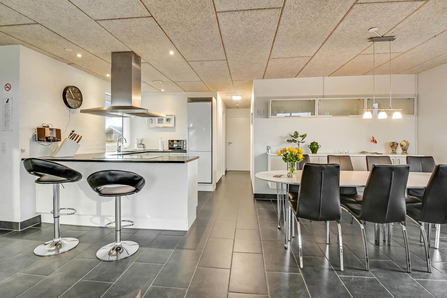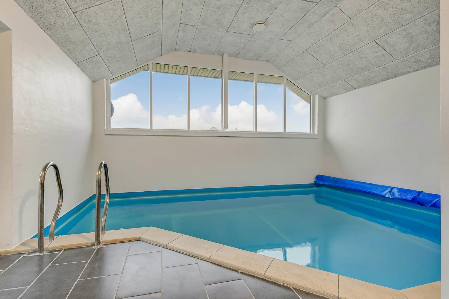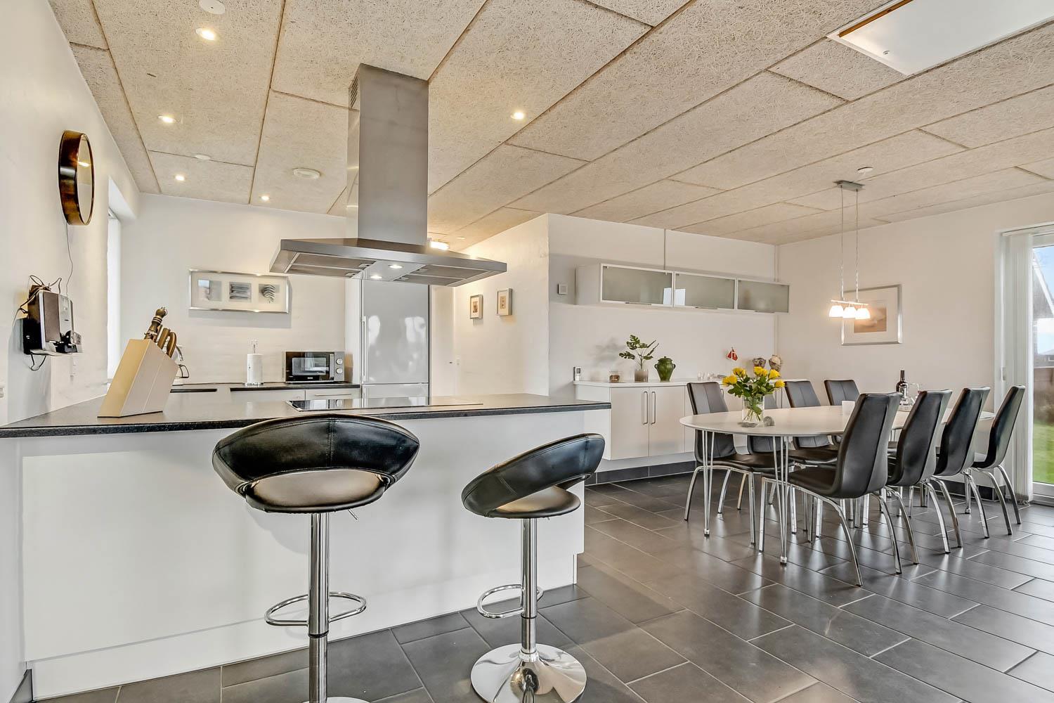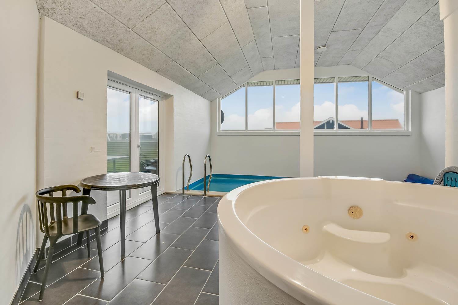 Totalrenoveret feriehus som er indrettet med et dejligt og meget funktionelt køkken, som er kombineret med stuen. Køkkenet er selvfølgelig med elkeramisk kogeplade og indbygningsovn, opvaskemaskine og mikroovn samt et køle-fryseskab (70 l fryser). Stuen er med komfortabel møblering og her finder du fladskærms-TV med DR1 og TV2 samt en parabol, hvorfra man kan tage de tyske programmer, DVD og stereoanlæg. 4 gode soverum med 1DS + 1DS + 1DS + 4K. Til de mindste er der barnestol og barneseng til rådighed. Huset er med 2 badeværelser, hvor det ene er med håndvask, bruser og toilet samt vaskemaskine og gulvvarme. Det andet er med direkte adgang fra poolrummet og med bruser, toilet, håndvask samt adgang til saunaen, dette badeværelse er selvfølgelig også med gulvvarme. Der er samme klinkegulv med gulvvarme, som går gennem hele huset. Poolrummet består selvfølgelig af selve poolen og har desuden et spabad til 4 personer. Har man el-bil eller en Plug-In hybrid, så er der ved Ladeboks til Type 2 ladestik, der kan lade op til 11 kWh. 2 hunde er tilladt. Dette hus er et ikke rygerhus. Depositum vintersæson kr. 4500 og sommersæson kr. 2200.
