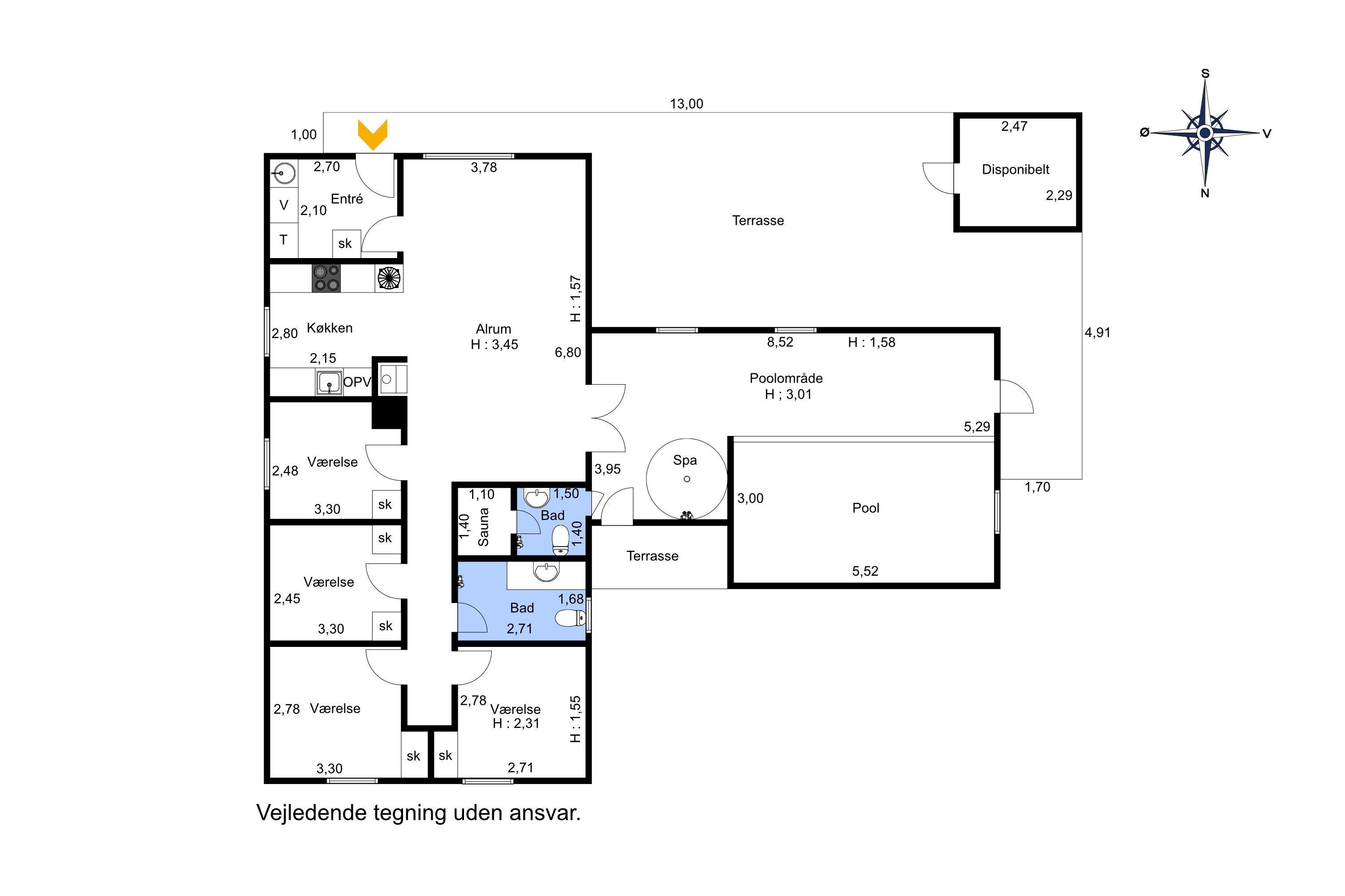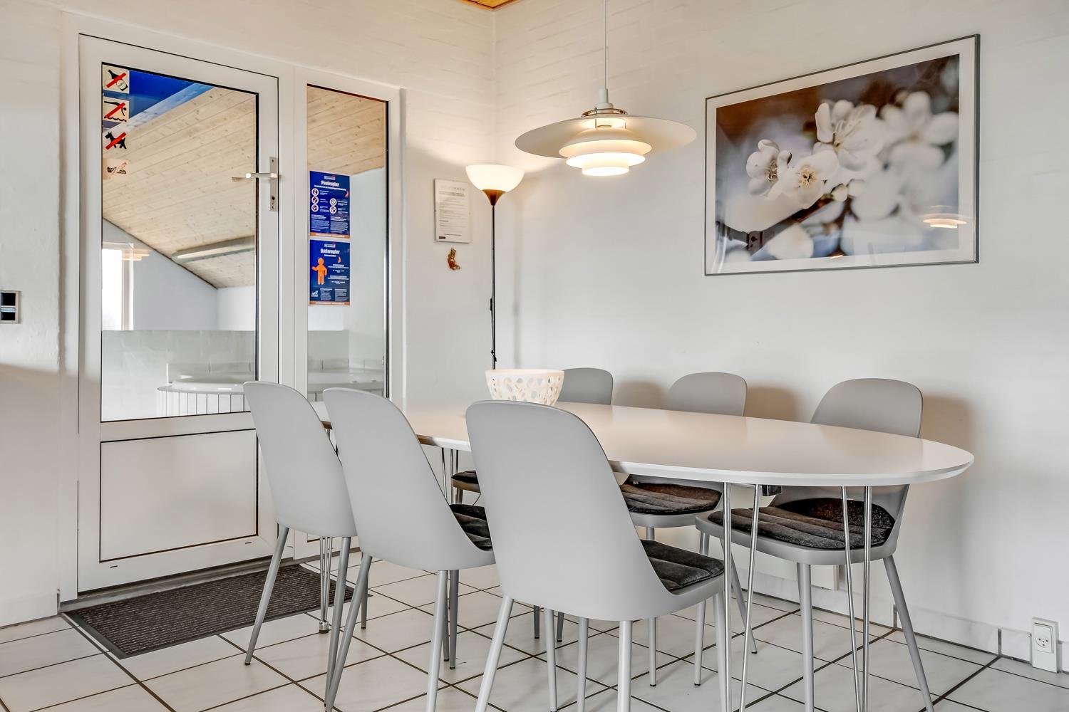 Husets hovedrum er køkken-alrummet. Køkkenet er veludstyret med køleskab med fryseboks og hertil kommer også en separat fryser på 50 liter. Hertil kommer mikrobølgeovn og opvaskemaskine. Mens maden bliver lavet kan de andre hygge ved spiseborde eller i sofagruppen, mens man nyder varmen fra brændeovnen. Smart-TV så du kan tage dine egne TV-Pakker hjemmefra samt DR1 og tyske satellitkanaler, DVD og CD er standard. Internetadgang er der ligeledes sørget for så man kan streame film eller andet hvis man selv medbringer PC til dette, som kan kobles på fladskærmen. Genvex er installeret og sørger for et godt indeklima. Fra stuen er der direkte adgang til poolrummet. Her er indrettet en hyggekrog og højtalere, så man kan tage lyden med fra stuen ind i poolrummet. Poolen måler 5,50 x 3,00 x 1,40 meter og lige ved siden af er det muligt aat benytte spabadet, som har en kapacitet på 4 personer. Poolrummet har også et tilliggende badeværelse som har gulvvarme, håndvask, bruser, toilet og sauna. Hovedtoilettet i huset har ligeledes gulvvarme, bruser, toilet og håndvask. I denne del af huset ligger de 4 soveværelser også. Der er 2 værelser med 1 dobbeltseng i hver, 2 værelser med 2 enkeltsenge i hver. Ovenikøbet forefindes der 1 børneseng og 1 barnestol i huset, så det gør det lettere at have "den lille" med. Har man el-bil eller en Plug-In hybrid, så er der til huset et ladestik.vaskemaskine og tørretumbler i huset, så man behøver ikke bekymre sig om at tage for lidt tøj med. Et husdyr er tilladt. Huset er energioptimeret, med luft/vand varmepumpe til poolopvarmningen, hvilket reducerer el forbruget markant. Der er tale om et ikke-ryger hus.
