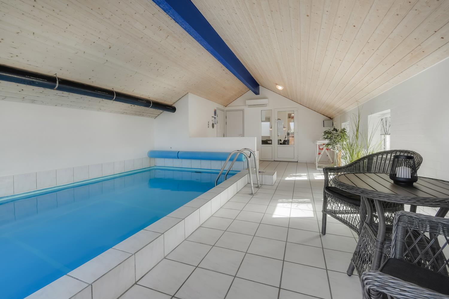 Hyggeligt poolhus på 156m2 med 4 personers spabad, sauna og en skøn sydterrasse. Huset er ideel til 1 eller 2 familier, som gerne vil bo i gåafstand til Vesterhavet. Gratis internetadgang.