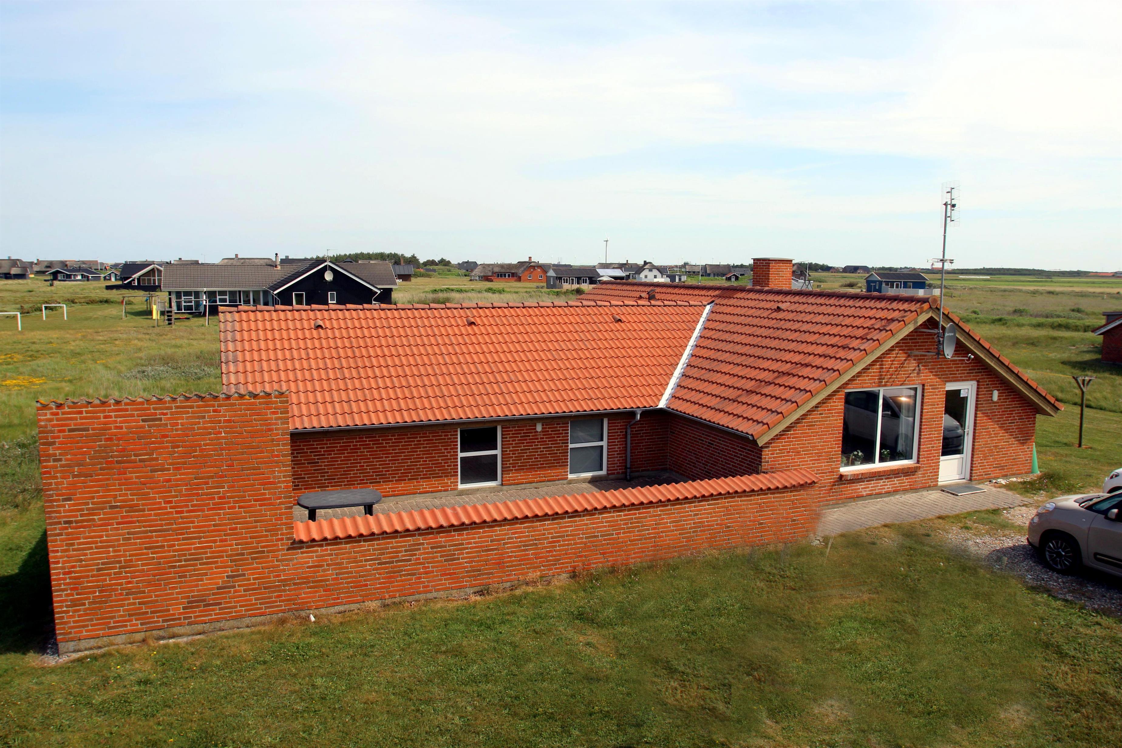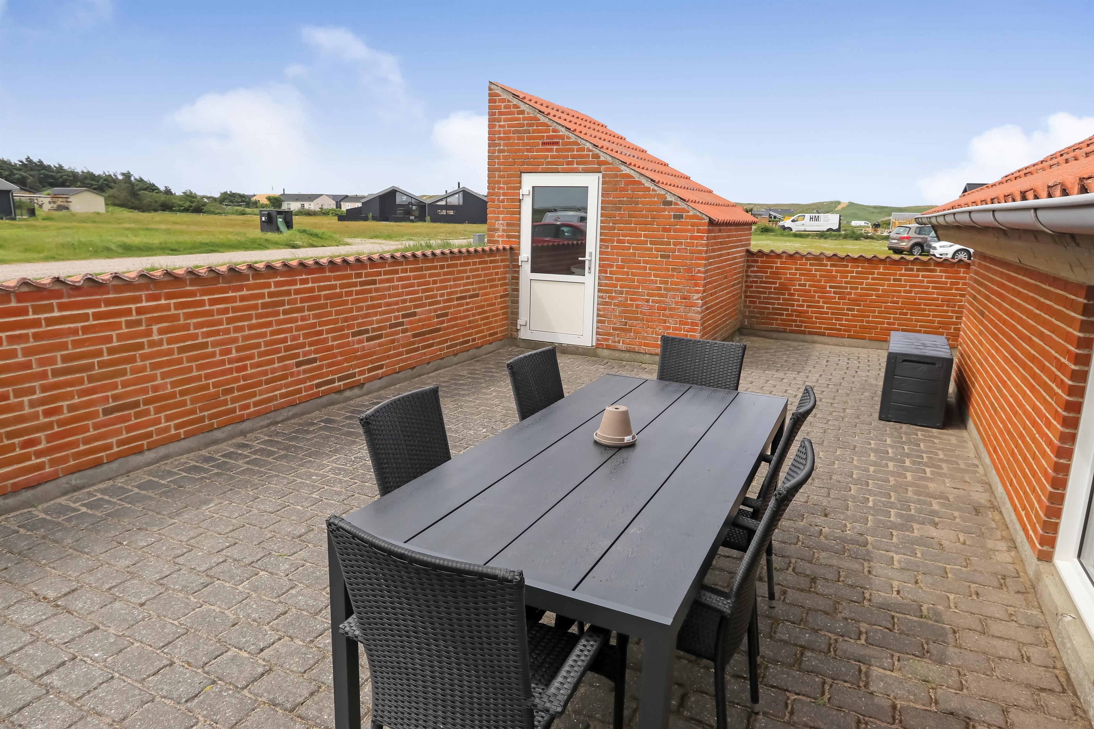 Huset har en 45 m² stor lukket terrasse med liggestole, havemøbler og grill. Grunden er forholdsvis flad og egner sig godt til legeaktiviteter. Der er en sandkasse til børnene. Butikker findes mindre end 2 km væk og efter en kort køretur kan du også nå havnebyen Thyborøn eller den charmerende by Lemvig ved Limfjorden.