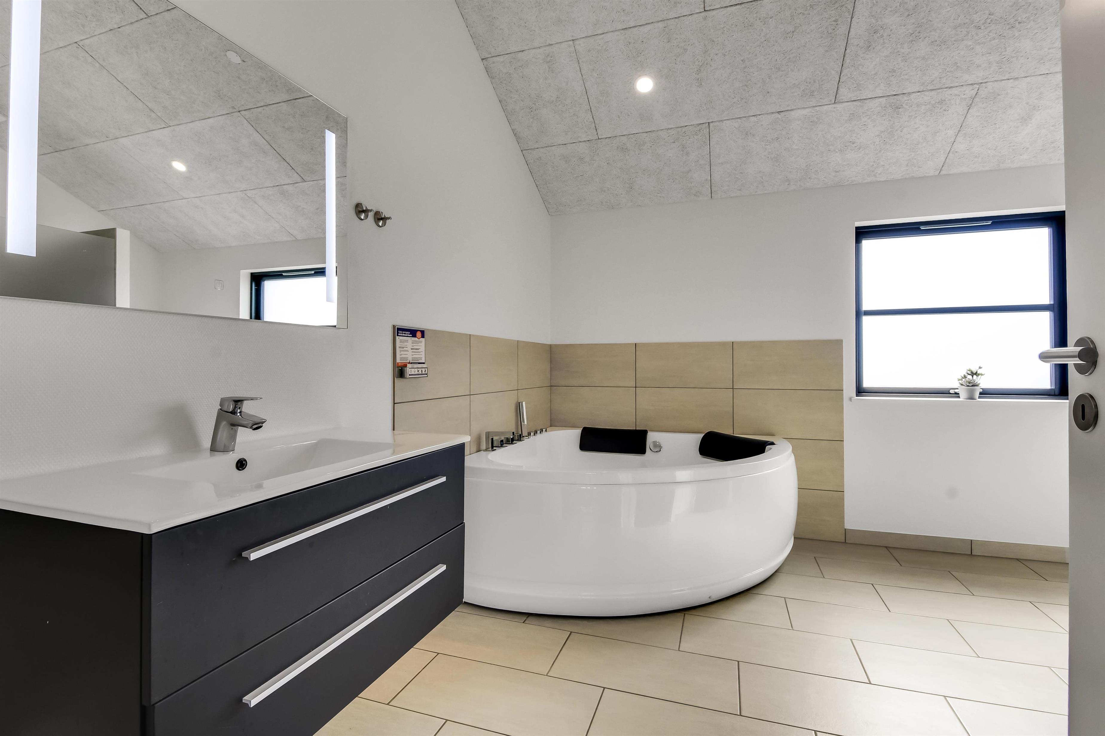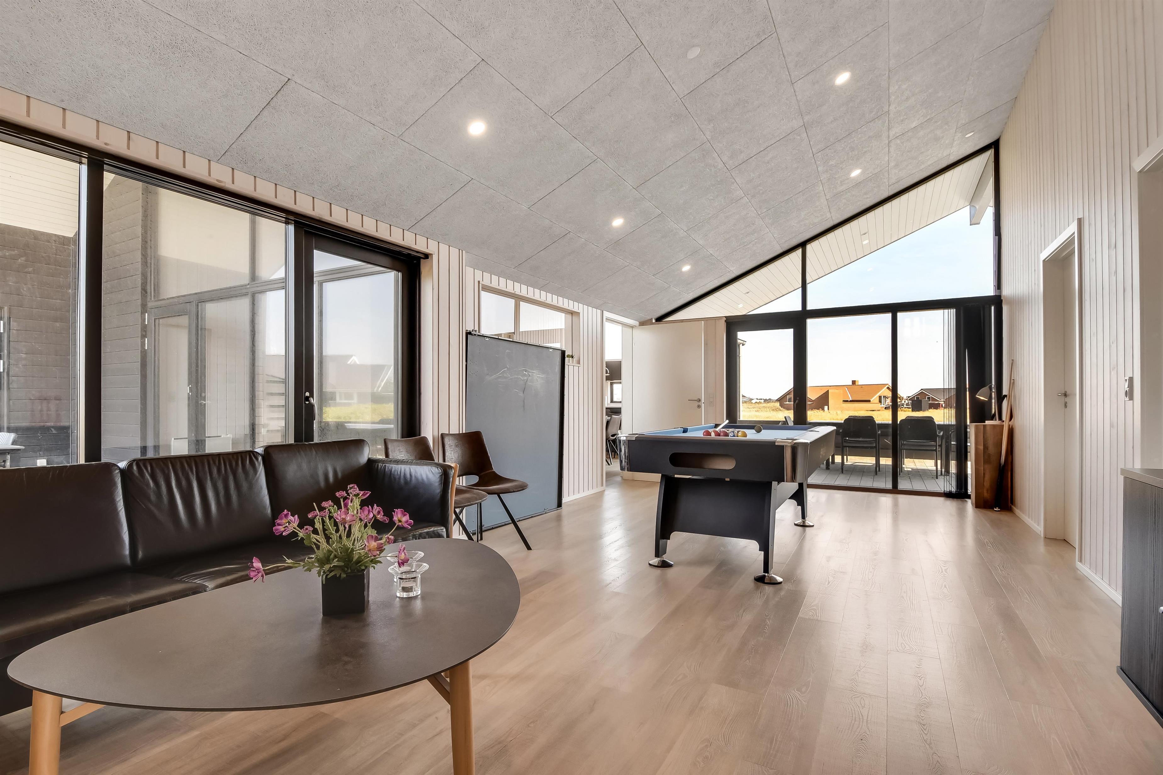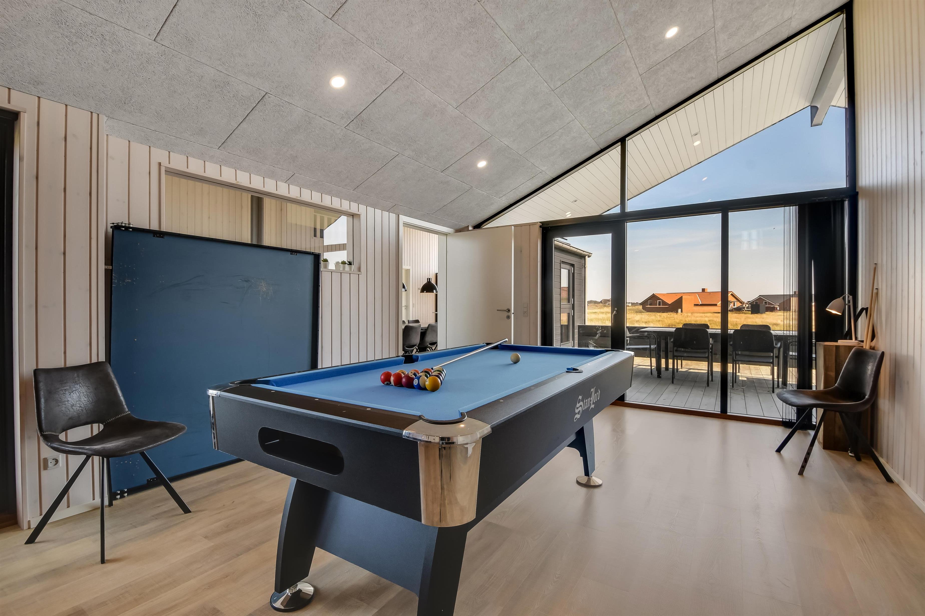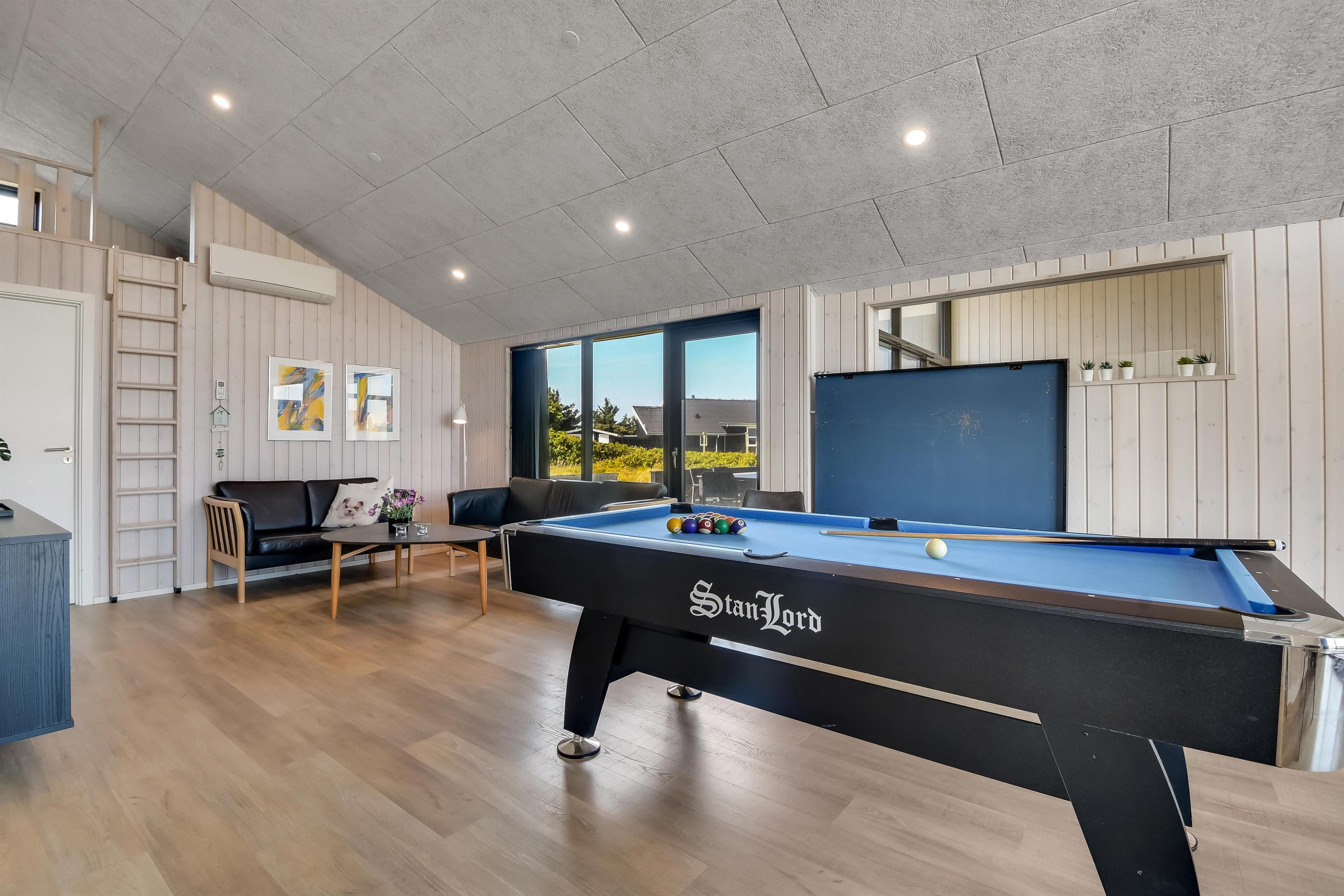 Midt i huset er aktivitetsrummet placeret. Rummet fungerer også som fordeler rum til 3 af husets soveværelser samt det store badeværelse. I rummet står et poolbord, som også kan laves om til et bordtennisbord, bløde, nye lædermøbler samt endnu et smart-TV magen til det første og med samme muligheder. Udgang til terrasseanlæg er en selvfølge og den installerede varmepumpe hjælper til at spare på omkosteningerne til opvarmning og sørger for et super indeklima. Det store, rummelige badeværelse har spabad, direkte adgang til saunaen, toilet, håndvask, klinkegulv med gulvvarme og bruseniche med glasdør.