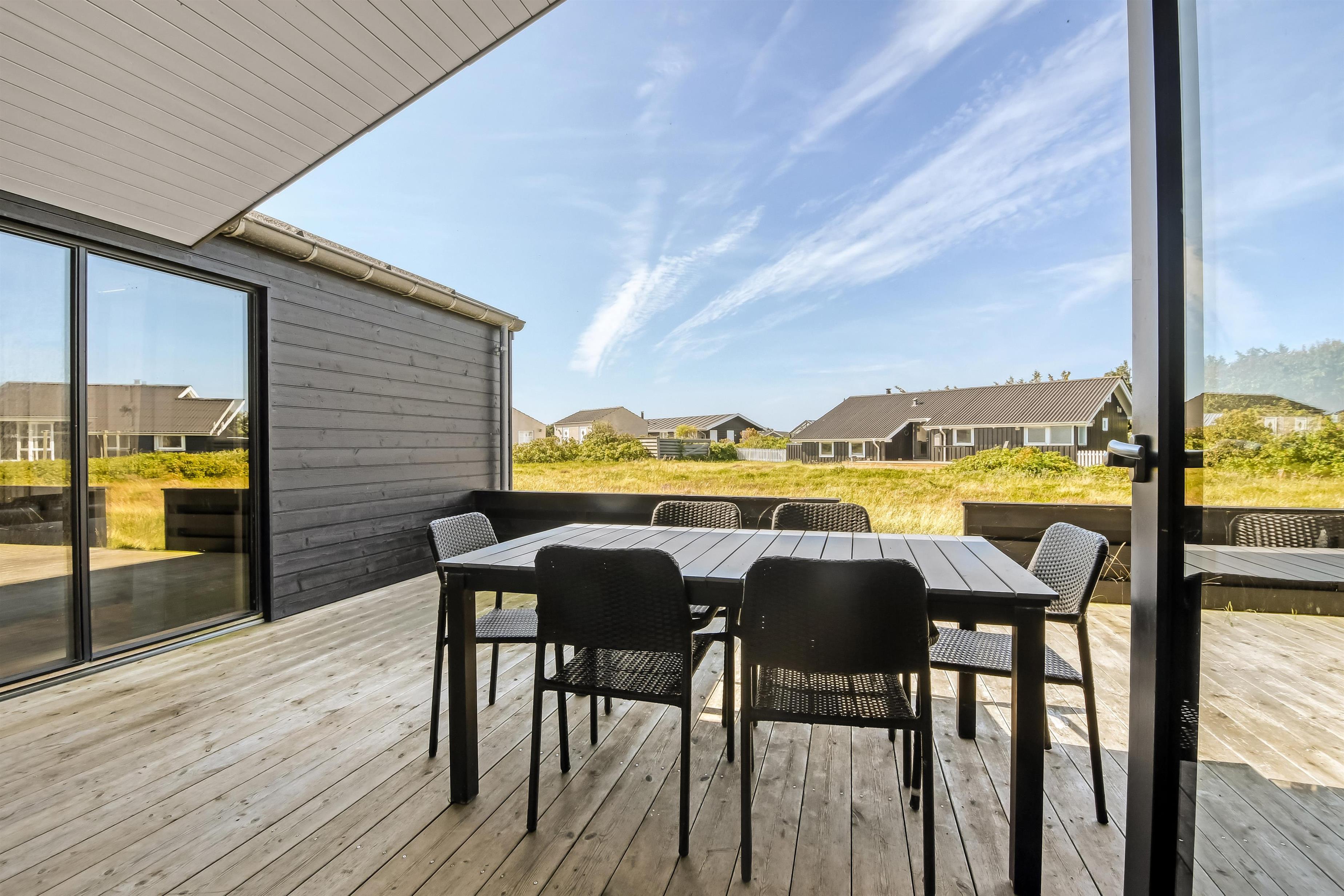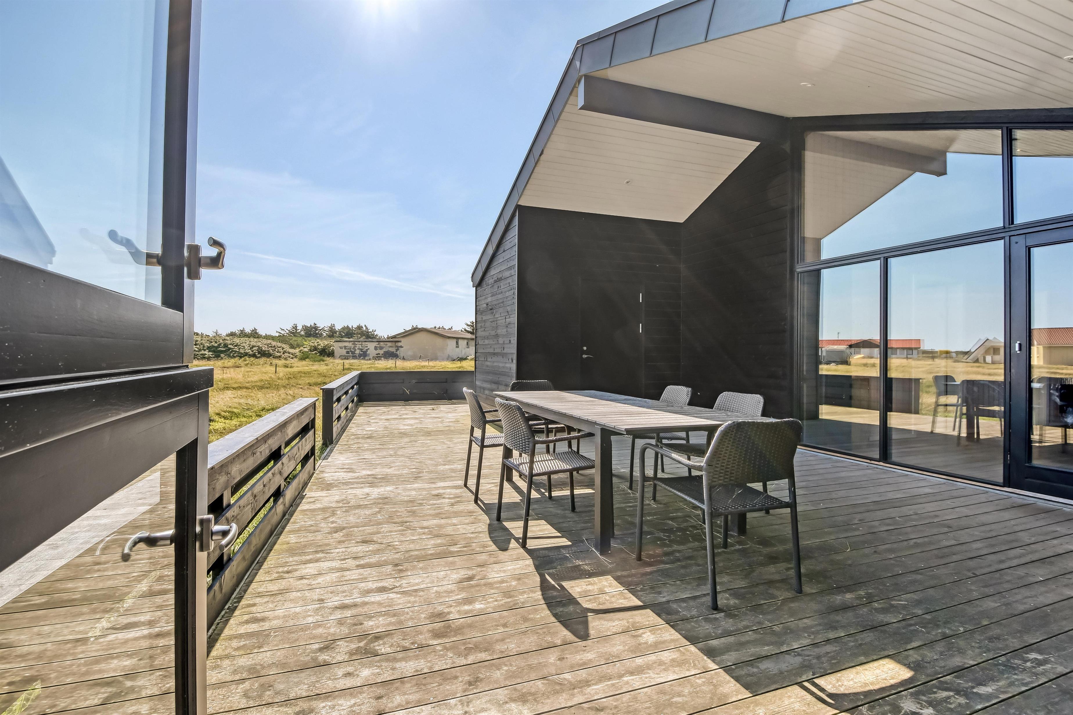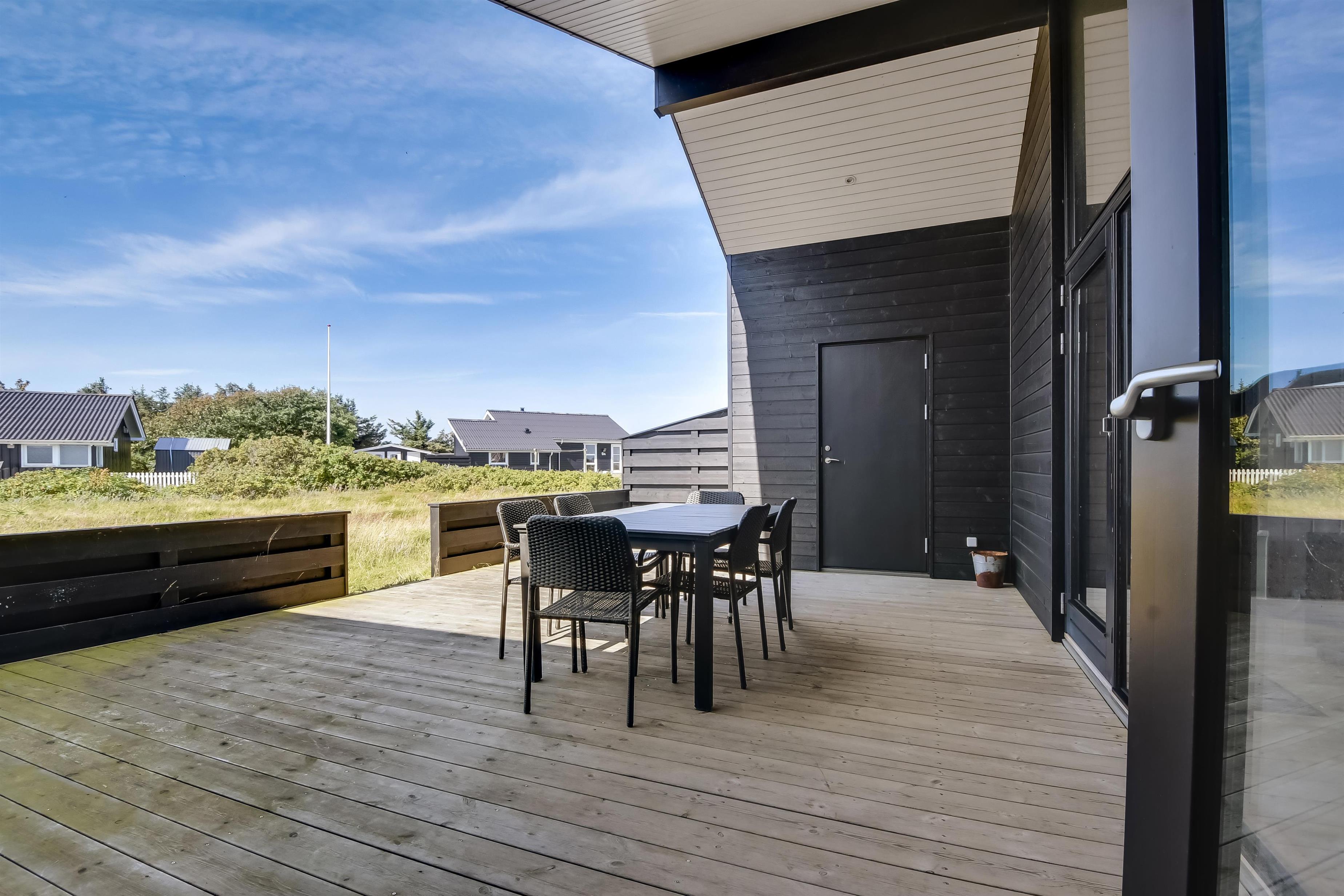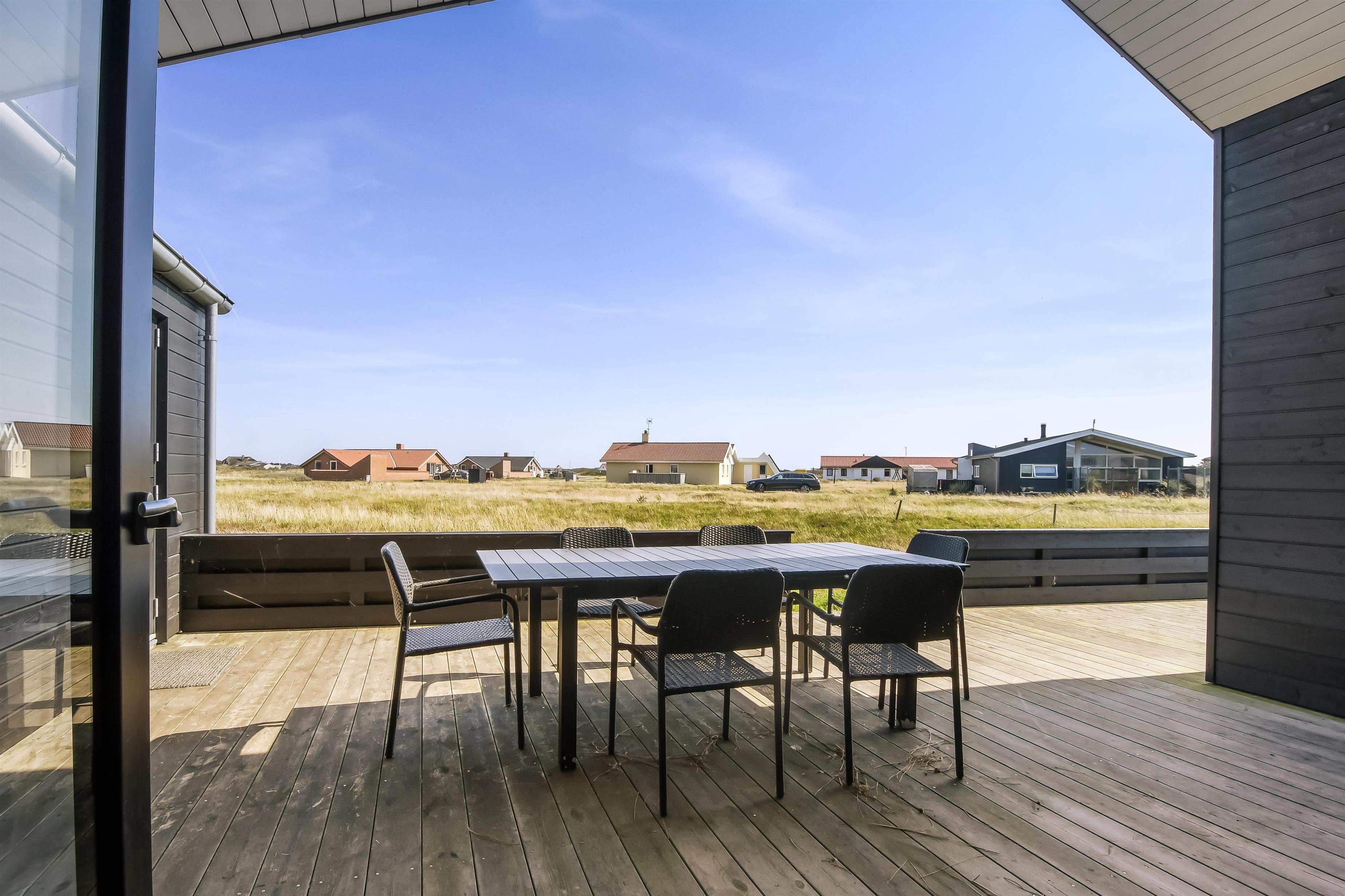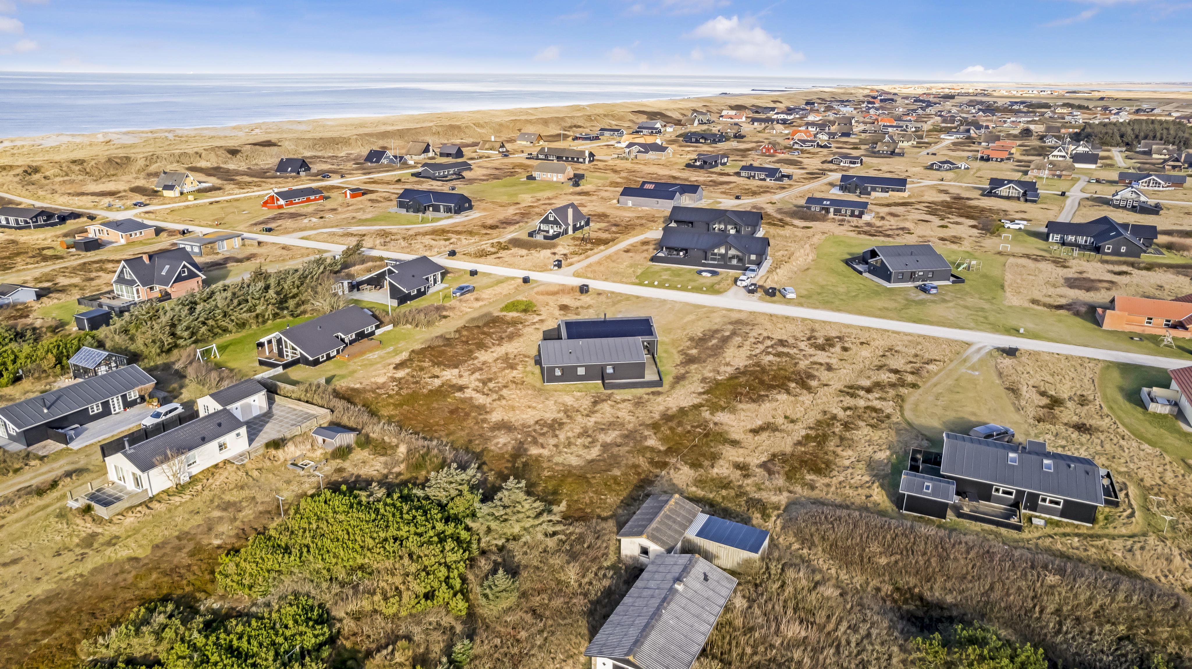 Kun 200 meter fra huset ligger det brusende Vesterhav og fra huset kan de høje klitter ses og nydes. 2 delvist overdækket terrasseanlæg giver unikke muligheder for en plads i solen hele dagen og begge terrasser har havemøbler. Der er grill og liggesole som kan flyttes efter behov. Ekstra opbevaringsrum med seperat fryser på ca. 100L. Hver dag byder Vesterhavet på nye maleriske oplevelse, der invitere til en frisk gå- eller løbetur. Eller hvad med en lille tur på ca. 10 - 15 min op til områdets lille købmand som i sæsonen har har åbent og byder på frisk morgenbrød og hvor de daglige indkøb også kan klares. Så hvad enten du er til aktiv ferie eller total afslapning danner dette flotte feriehus den perfekte ramme både hvad angår hus, beliggenhed og omgivelser.