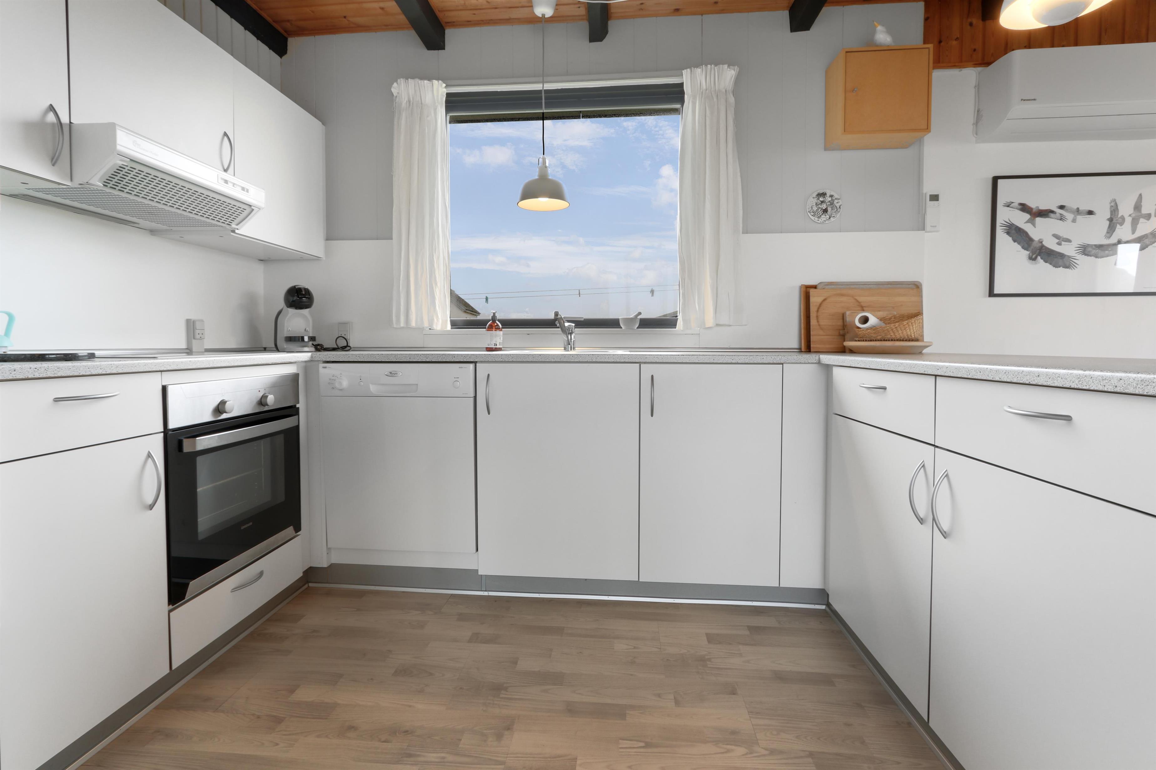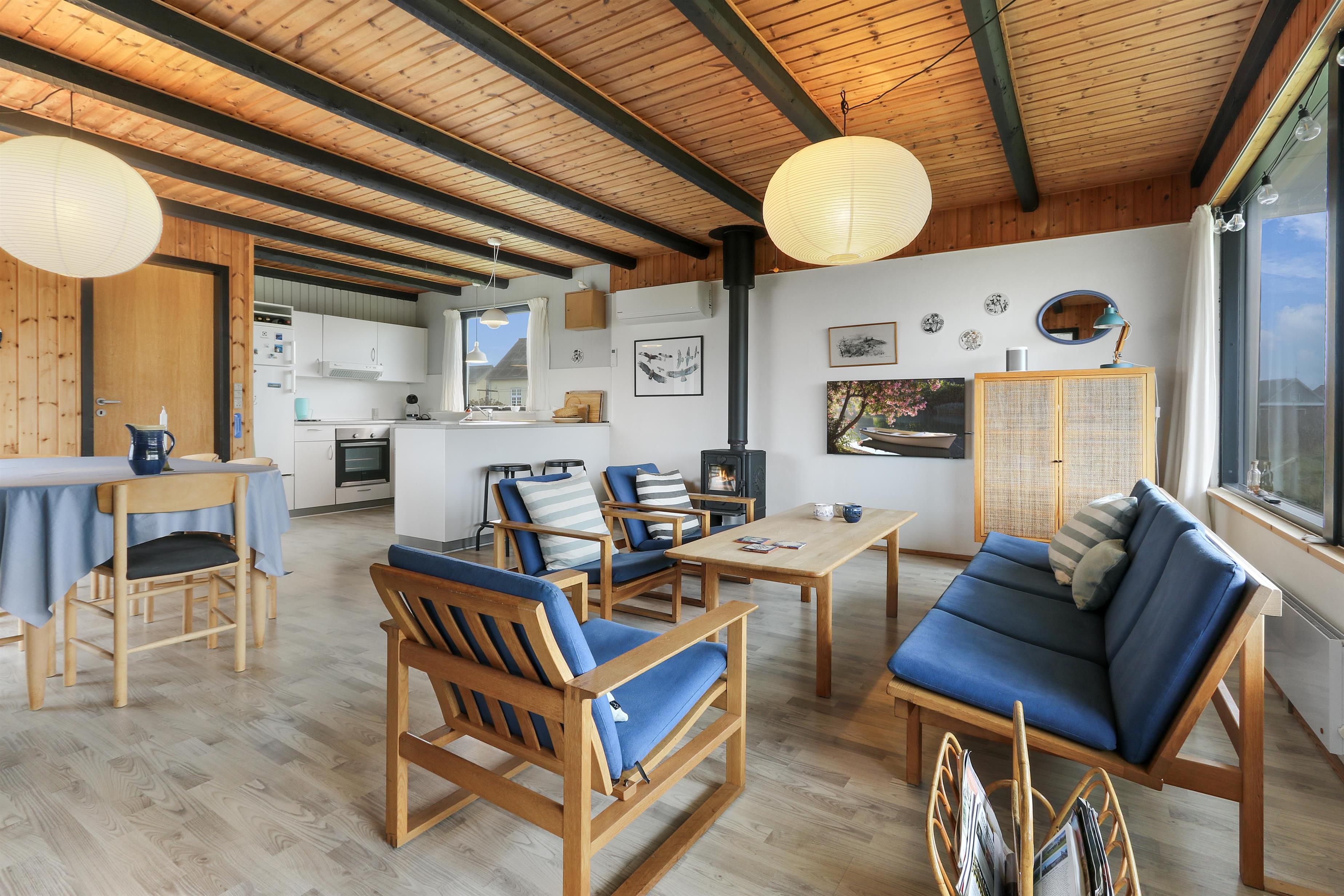 Her får I et overskueligt sommerhus, hvor I kan nyde ferien. En fin entre byder velkommen. Dejlig opholdsstue kombineret med et køkkenhjørne er husets centrale rum. Her er et godt lysindfald, der gør rummet hyggeligt og rart at være i. Køkkenet er med komfur med keramiske kogeplader, emhætte, køleskab med fryseboks og opvaskemaskine. Tæt ved køkkenet står spisebordet til 6 personer, som hele familien kan samles ved, når sulten skal stilles. Opholdsstuen har polstermøbler, Smart-TV med mulighed for streaming af radio og TV-programmer samt tyske og danske kanaler. Der findes ligeledes en luft til luft varmepumpe til opvarmning af huset. Dejlig brændeovn og udsigt til klitterne ved Vesterhavet. 3 soveværelser (1DS, 1DS, 1DS). Badeværelse med bruser, toilet, håndvask, vaskemaskine og klinkegulv. Trægulv i opholdsrum samt på to af værelserne og gulvtæppe i det ene soveværelse. Ikke-ryger hus. Husdyr ikke tilladt.