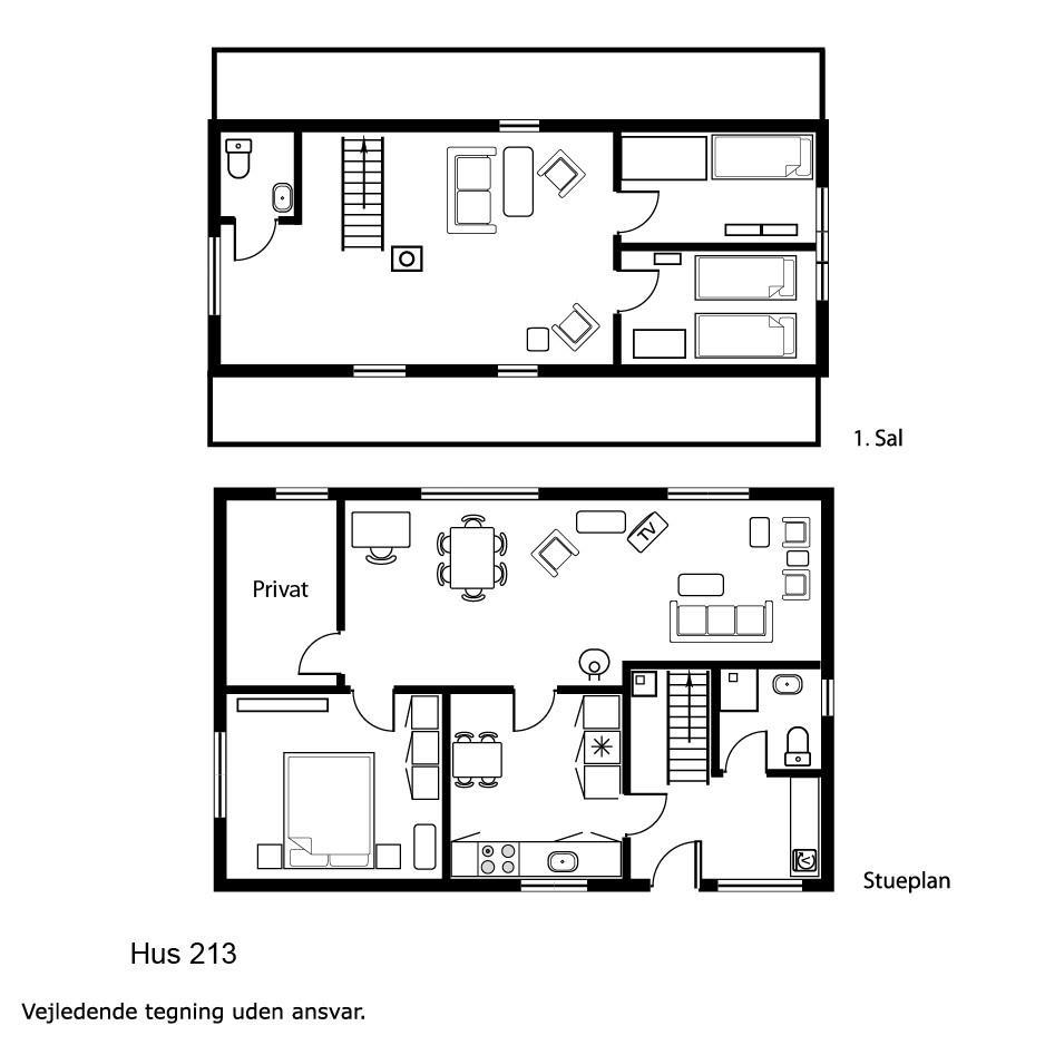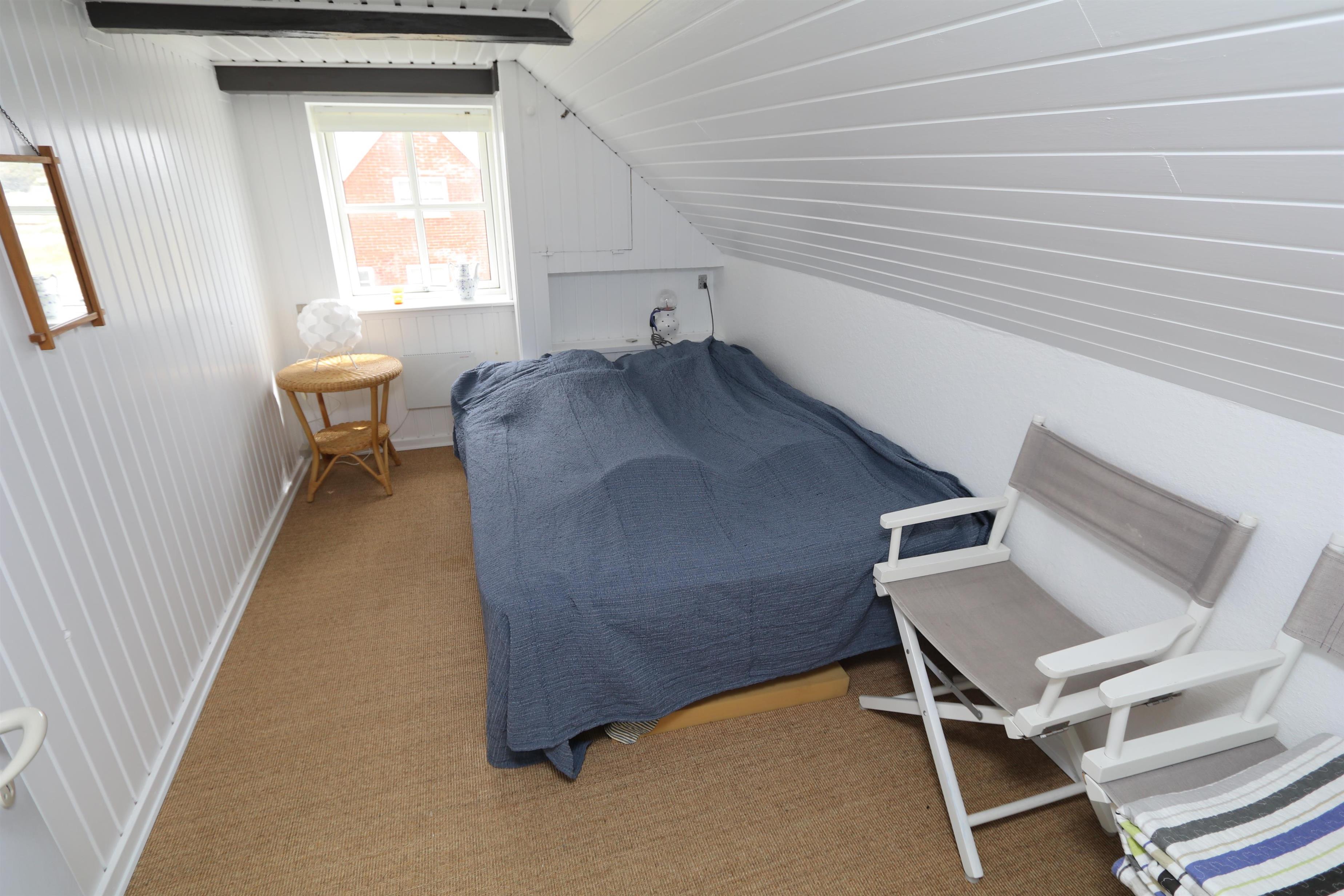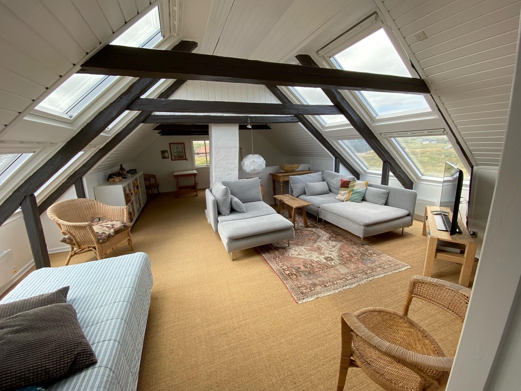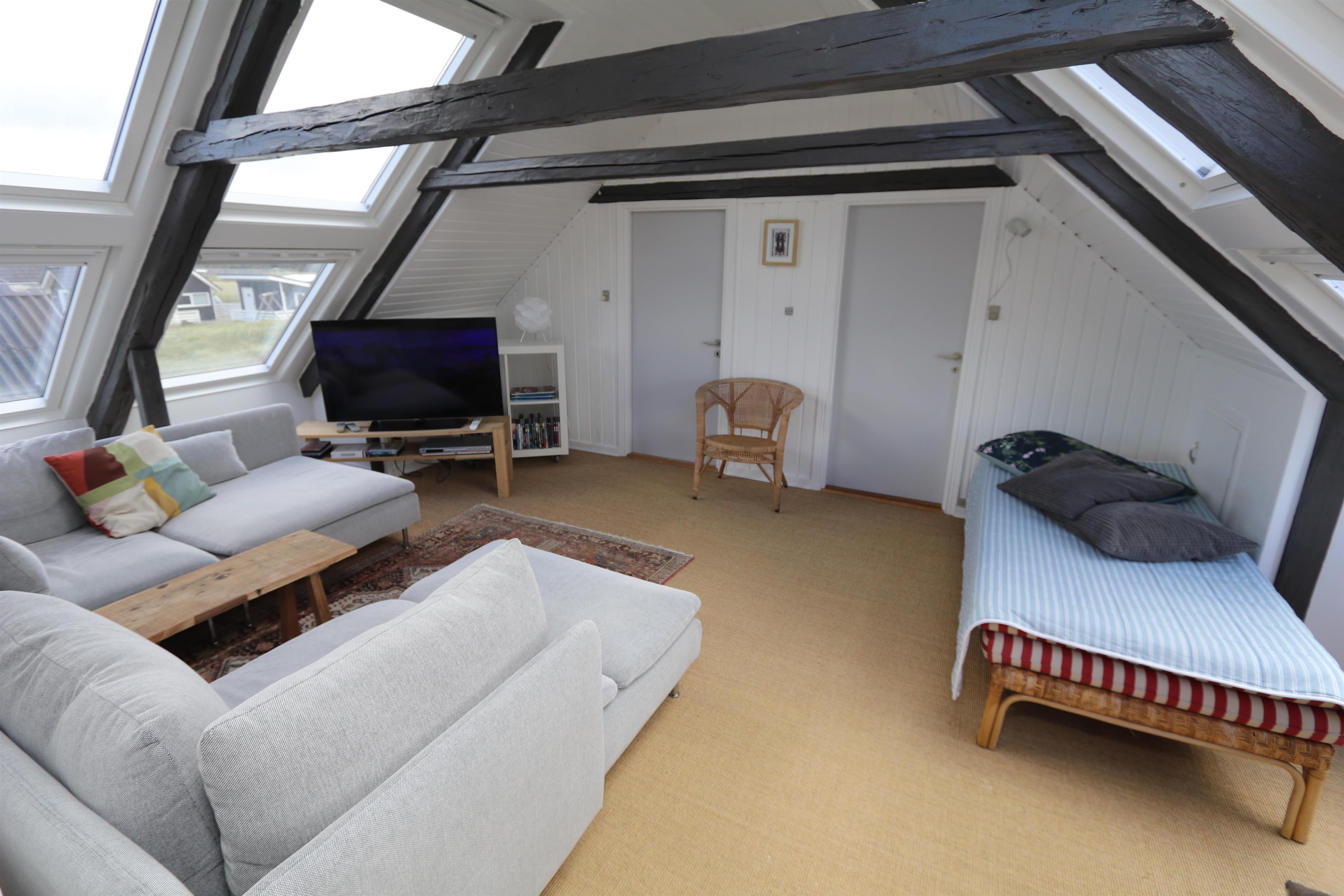Via den brugervenlige trappe i entréen kommer I let op på 1. Etage. Her er der endnu et dejligt opholdsrum, 2 soveværelser (1DS, 1DS) samt et ekstra toilet. Lofthøjden på 1. etgae er 1,85 m. Fra 1. etage er der en fantastisk udsigt til klitterne. Desuden er 2 store vinduesfag i hver sin side af taget. Disse store tagvinduer giver en fantastisk lysindfald og en unik mulighed for at nyde udsigten til den ekstraordinære beliggenhed. Ved de bløde polstermøbler er der også et smart-TV der giver mulighed for streaming af egne abonnementer som bl.a. kan være netflix, HBO eller lignende samt DVD/CD afspiller. På det ekstra toilet er der håndvask, toilet og linoleumsgulv. Lofthøjden på 1. sal er 1,85 cm.