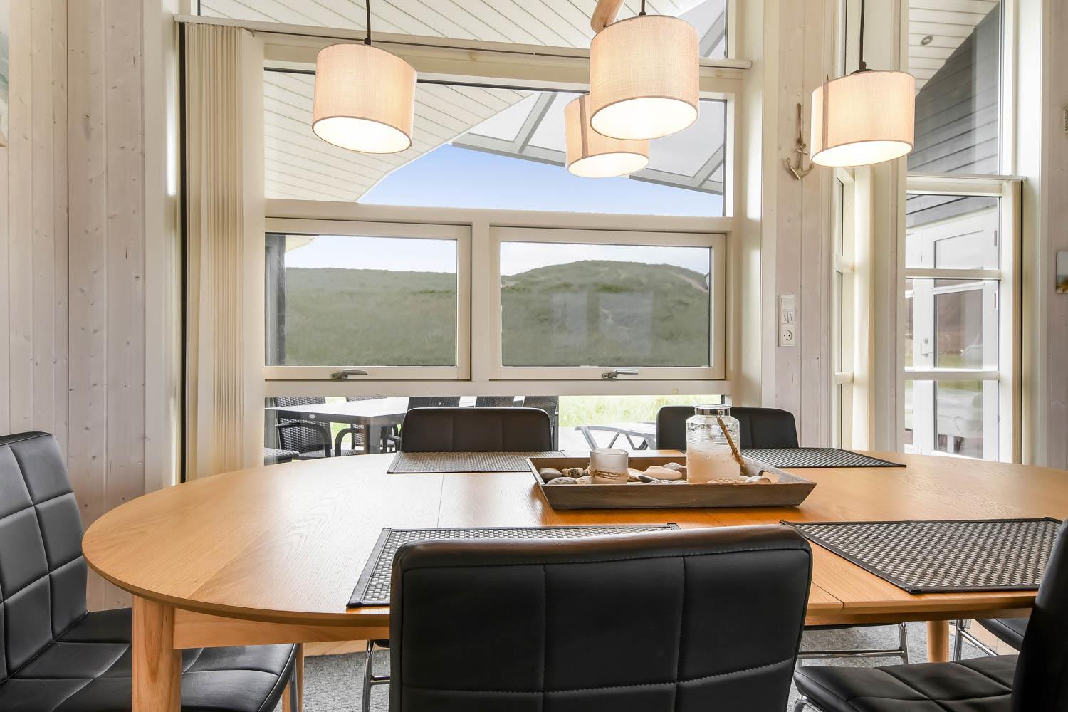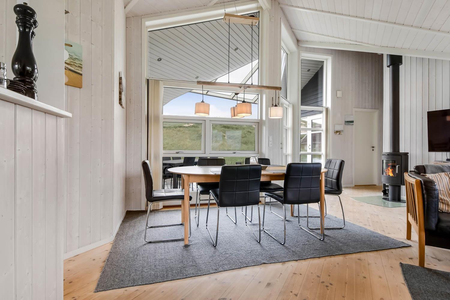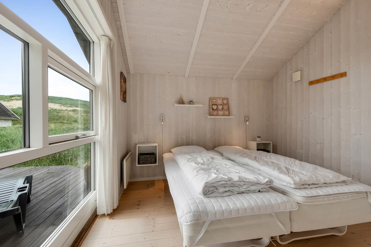 Godt feriehus på ca. 90 m2 med udsigt til Klitterne ved Vesterhavet. Huset er bygget i 2011 og er løbende renoveret senest i 2023. 3 gode soveværelser (1DS, 1DS, 2ES) samt en hems til begejstring for mange børn og barnlige sjæle. Huset er praktisk indrettet i lyse og venlige farver og med pæne lædermøbler. En dejlig entré byder jer velkommen. Funktionelt og veludstyret køkkenhjørne med bl.a. opvaskemaskine, køleskab med fryseboks, mikroovn, glaskeramiske kogeplader, indbygningsovn, airfryer og emhætte. Opholdsstuen har faldskærms-TV med tyske og danske kanaler, sound bar, DVD-afspiller, CD afspiller, radio, spiseplads samt en hyggelig brændeovn, der sammen med den opsatte varmepumpe sørger for at alle kan holde varmen selv på de kolde, charmerende efterårsdage. Stort, moderne badeværelset med bla. spa, direkte adgang til saunaen, bruseniche, toilet, håndvask og klinkegulv med gulvvarme. Fra entreen er der adgang til et ekstra badeværelse med toilet, bruser, håndvask og klinkegulv med gulvvarme. Praktiske rengøringsvenlige gulve i alle sove- og opholdsrum. Der er selvfølgelig også tørretumbler og vaskemaskine i huset. Barnestol og barneseng er i huset. Har man el-bil eller en Plug-In hybrid, så er der Ladeboks ved huset til Type 2 ladestik, der kan lade op til 11 kWh. Ikke ryger hus. Max. 2 husdyr tilladt.