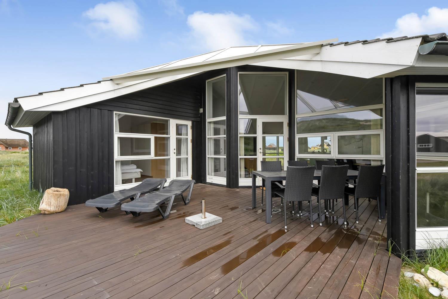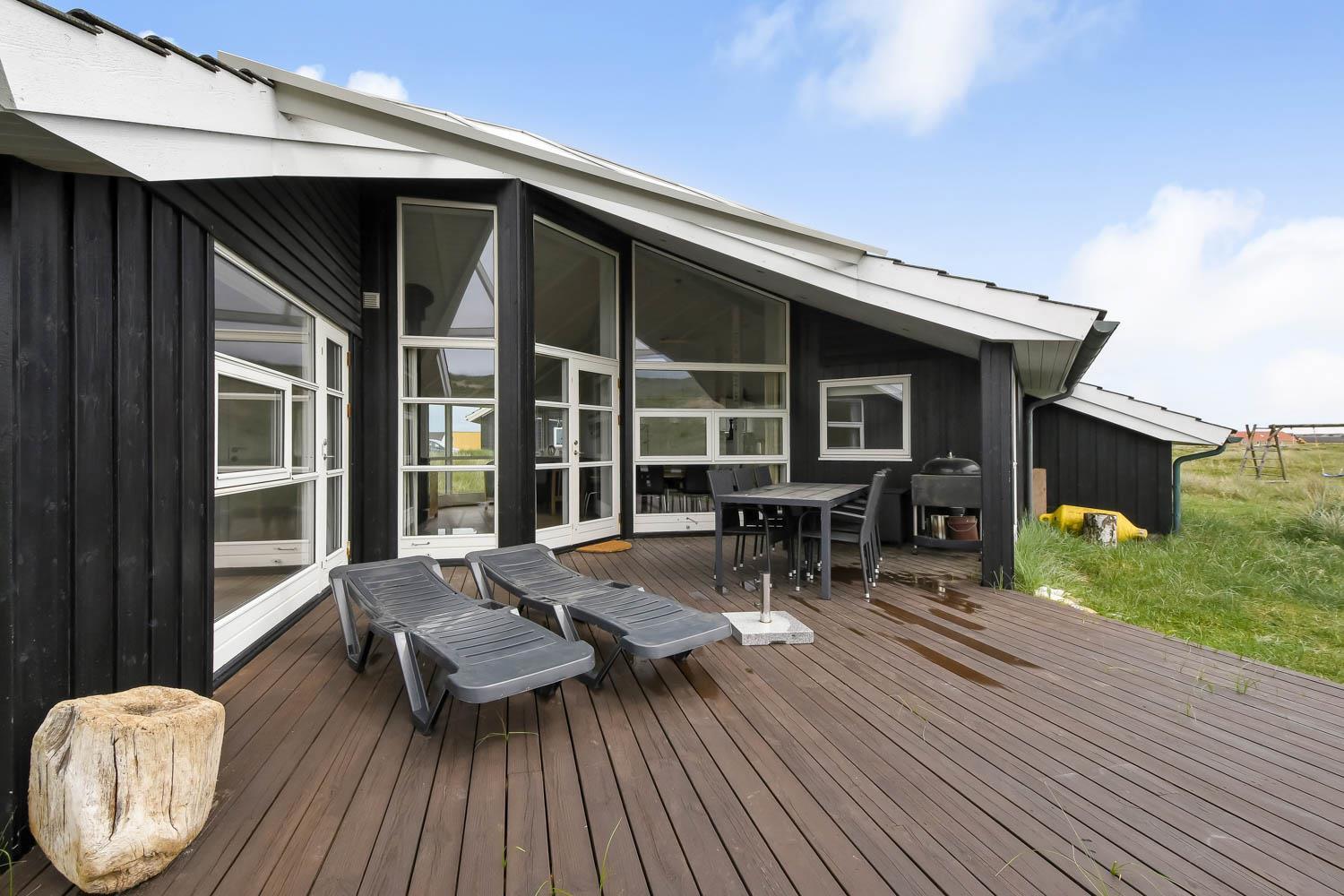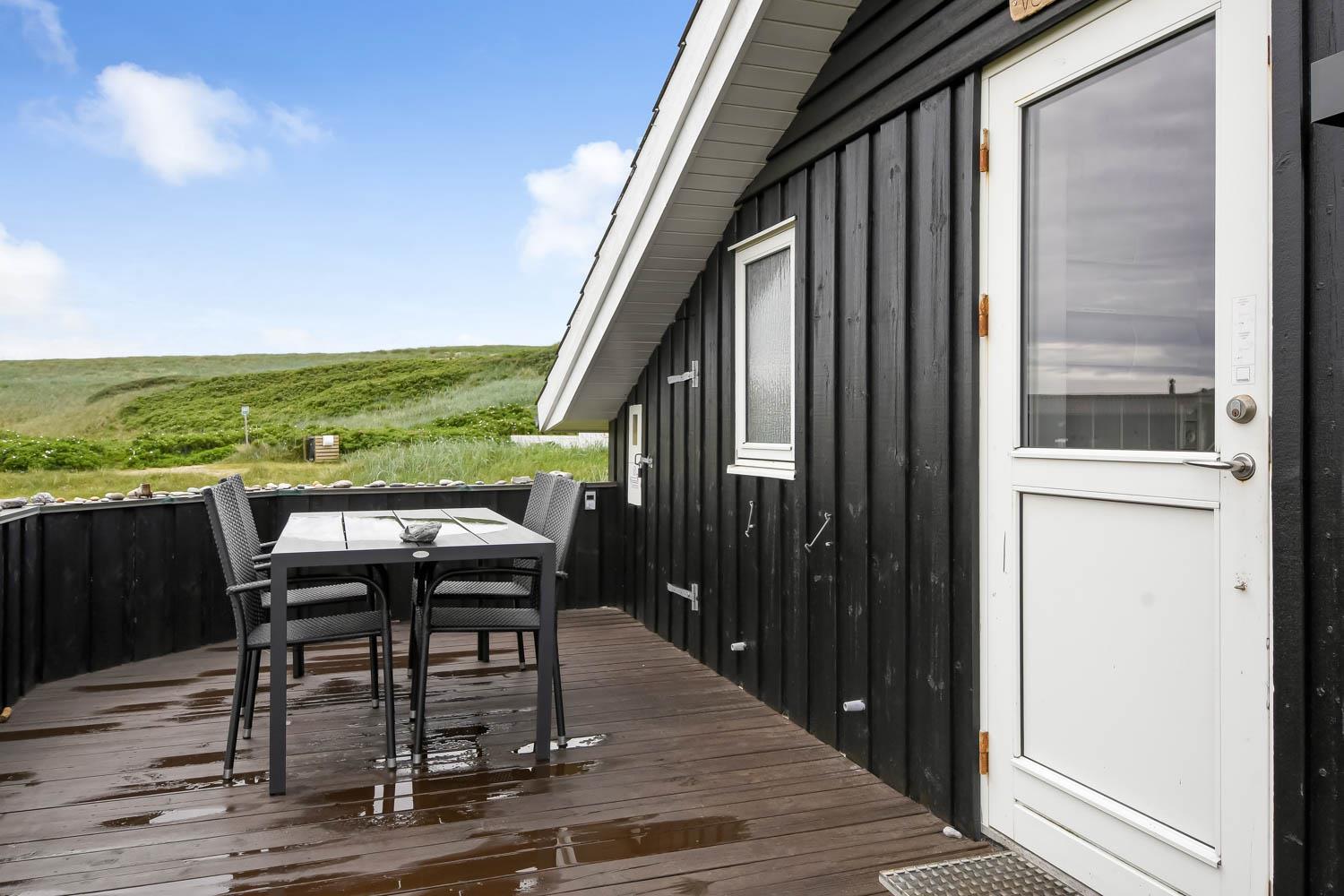 Huset har udgang til en delvis overdækket terrasse med havemøbler, parasol, liggestole og grill. Nyd solen eller en grillaften til lyden af bølgernes Brusen som høres i baggrunden. Perfekt beliggende feriebolig med klitudsigt, der vil danne rammerne om jeres hel unikke ferie tæt ved Vesterhavet. Her er fantastiske omgivelser, og det er en oplevelse i sig selv at bo helt tæt ved de høje klitter, som er det eneste der adskiller huset fra Vesterhavet. Huset er beliggende for enden af en blind vej kun ca. 100 m fra Vesterhavet på en ca. 1.224 m2 grund. Nyd at Vesterhavet hver dag fortæller en ny historie, som i kan opleve på tætteste hold. Samtidig er der kun 500 m til indkøbsmuligheder og 1.000 m til nærmeste restaurant. Vi anbefaler også gerne et besøg i havnebyen Thyborøn 15 km nord for sommerhuset eller den gamle købstad Lemvig 13 km mod øst.