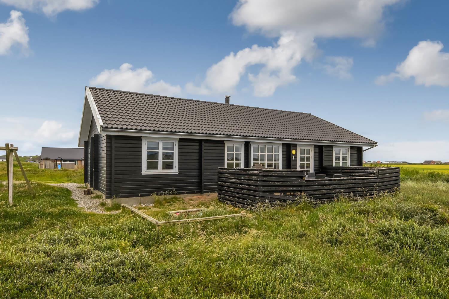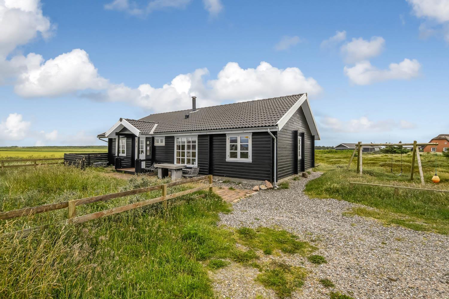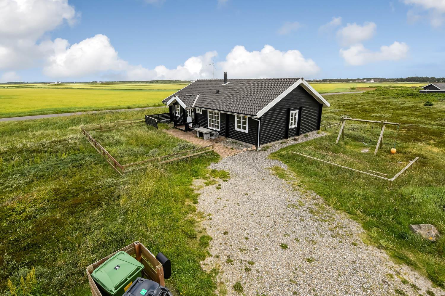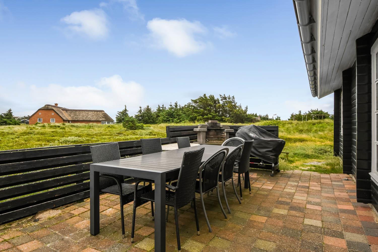 Huset er beliggende på en ca. 2.750 m2 stor naturgrund kun ca. 300 m fra Vesterhavet. Dejlig terrasse med havemøbler, liggestole og grill. Til børnene er der gynge og sandkasse. Dejligt feriehus med masser af muligheder. 5 - 10 min fra huset ligger Vesterhavet, der altid inviterer til en frisk gå- eller løbetur. Der er ca. 1.600 m til indkøbsmuligheder, der også byder på frisk morgenbrød. Her kan de daglige indkøb også klares. Inden for 25-30 minutter kan flere aktiviteter og shoppingmuligheder nås. Så hvad enten I er til aktiv ferie eller total afslapning, danner dette flotte feriehus en dejlig ramme både hvad angår hus, beliggenhed og omgivelser.