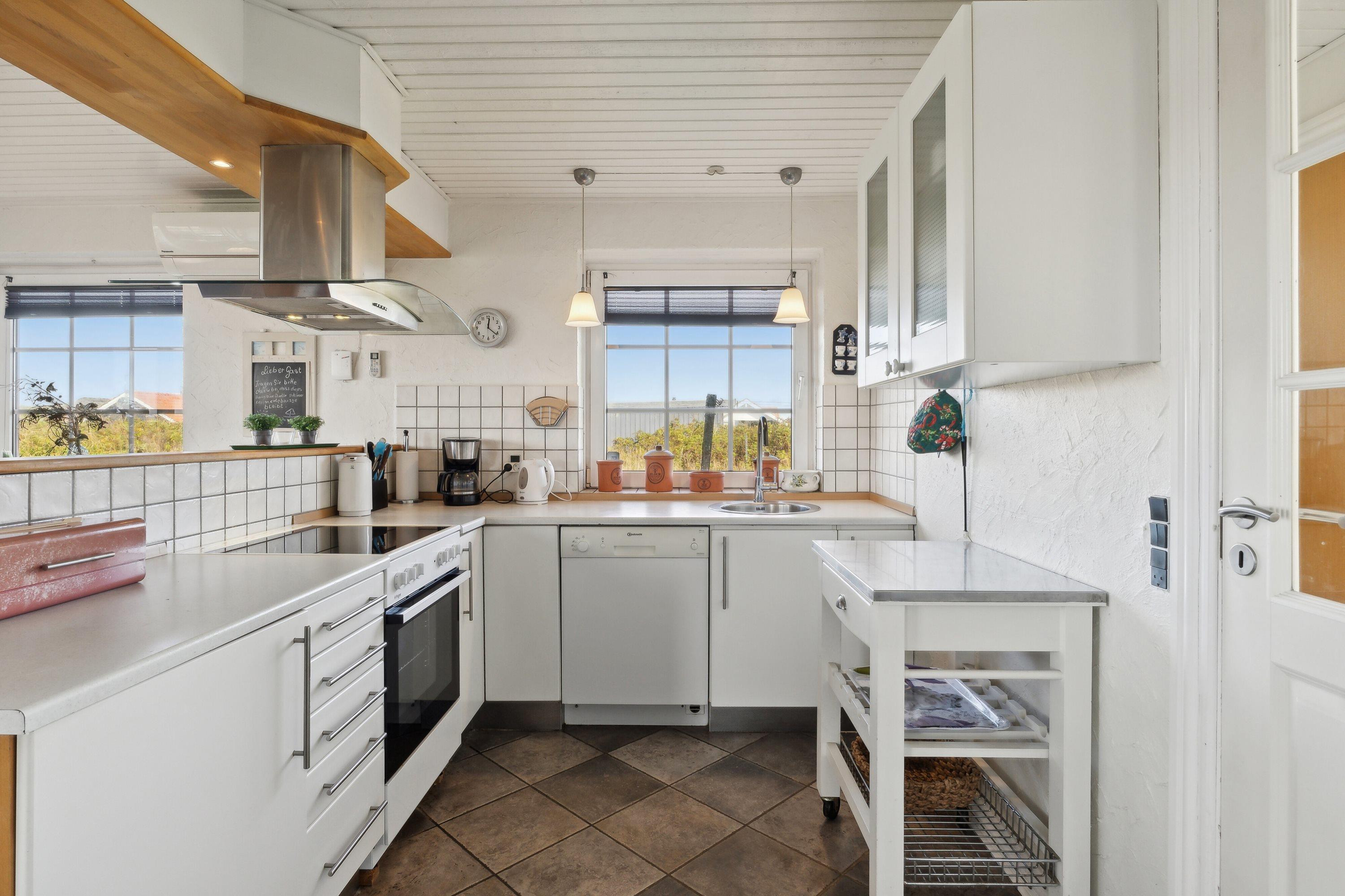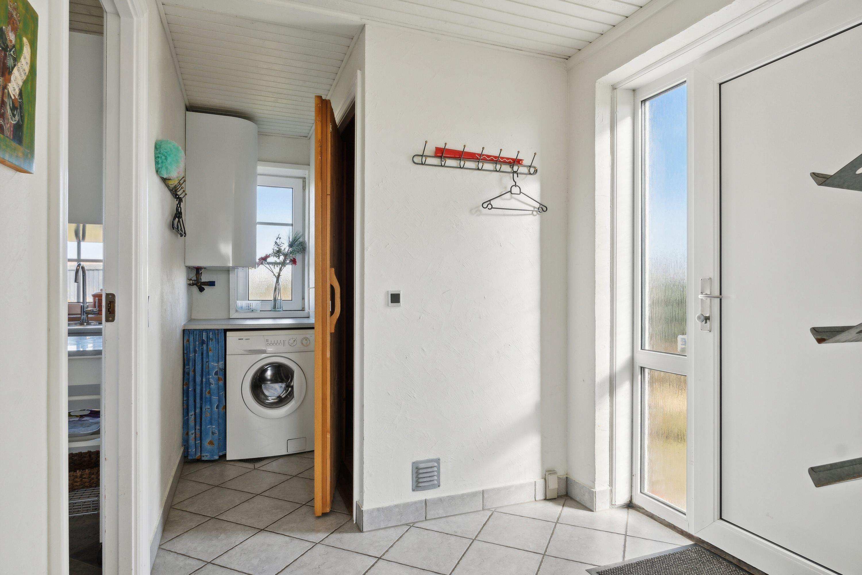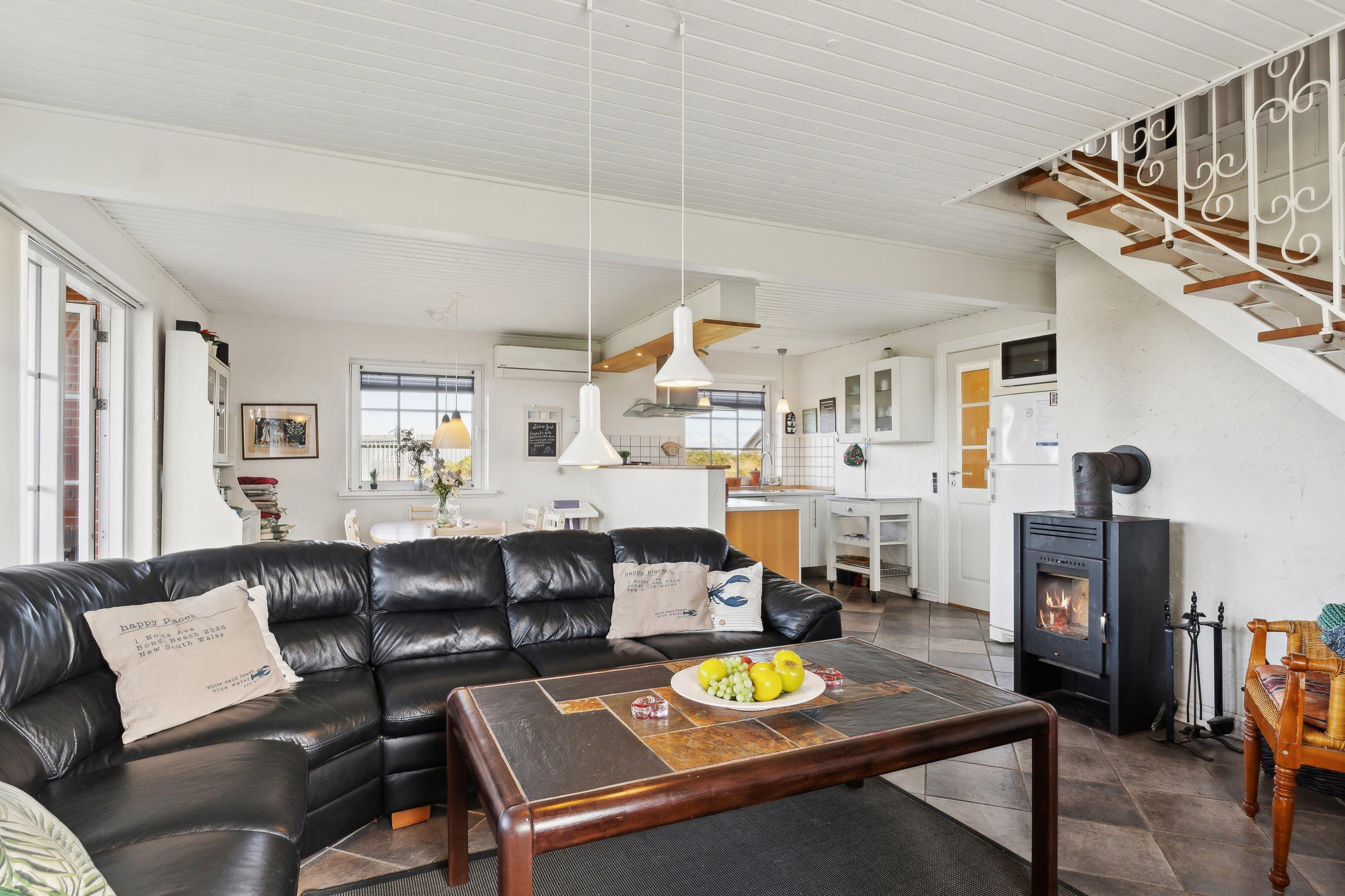 En dejlig entre med vaskemaskine og god plads til at hænge jakke og stille fodtøj tager i mod jer. Huset er lyst og venligt indrettet med bl.a. dejligt køkken med køleskab med frys, mikroovn og opvaskemaskine. Rigtig flot køkken som er kombineret med stuen hvor der er behagelige lædermøbler, brændeovn. TV med DR samt DVD, der er klinkegulv med gulvvarme i både køkken og stueafdelingen. Fra stuen er der en trappe op til 1. sal hvor husets 4 soveværelser er. 4 soveværelser: Første etage: (dobbeltseng) + (dobbeltseng) + et værelse med en seng + et værelse med en seng. Dejligt stort badeværelse med brus og spabad samt klinkegulv med gulvvarme.