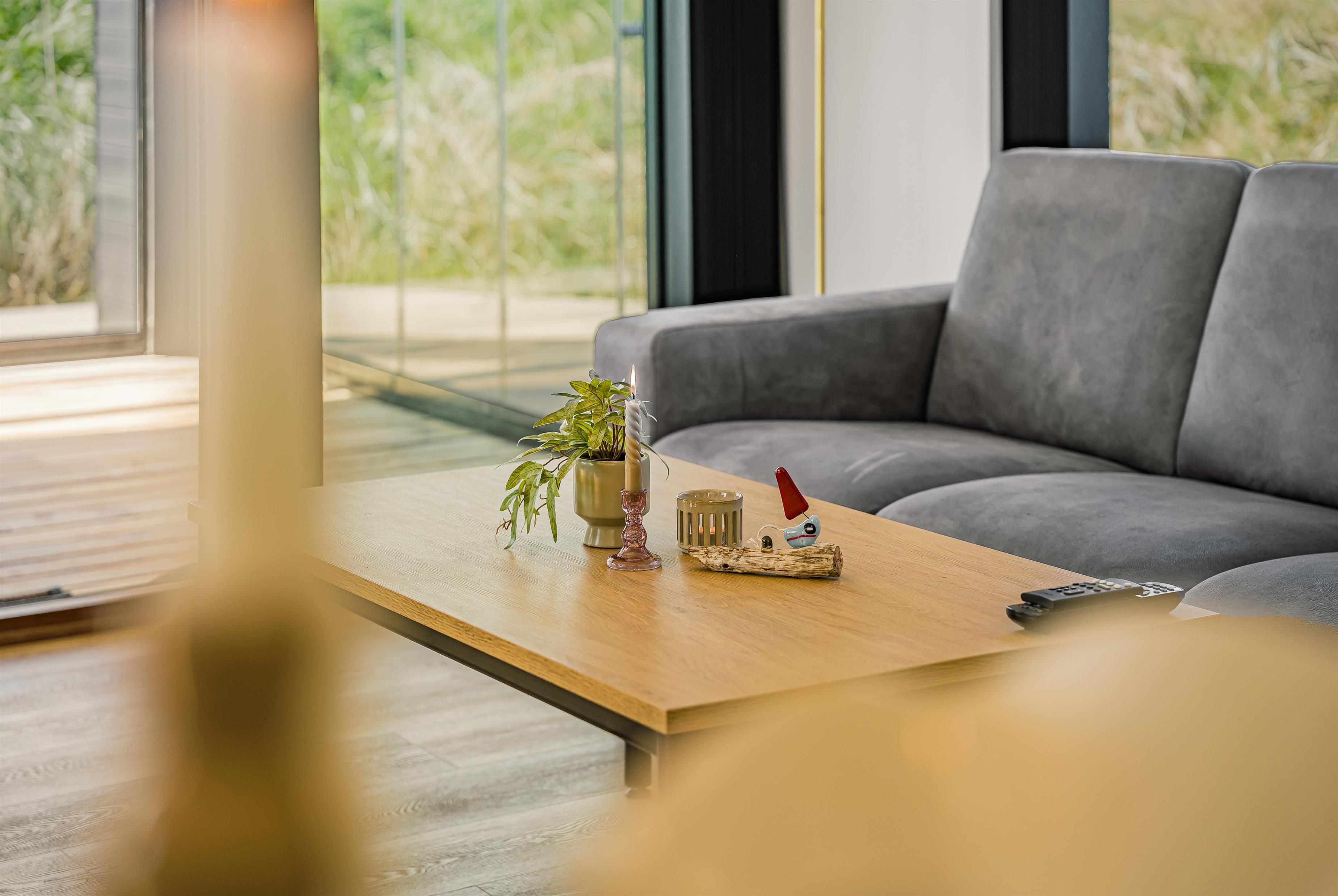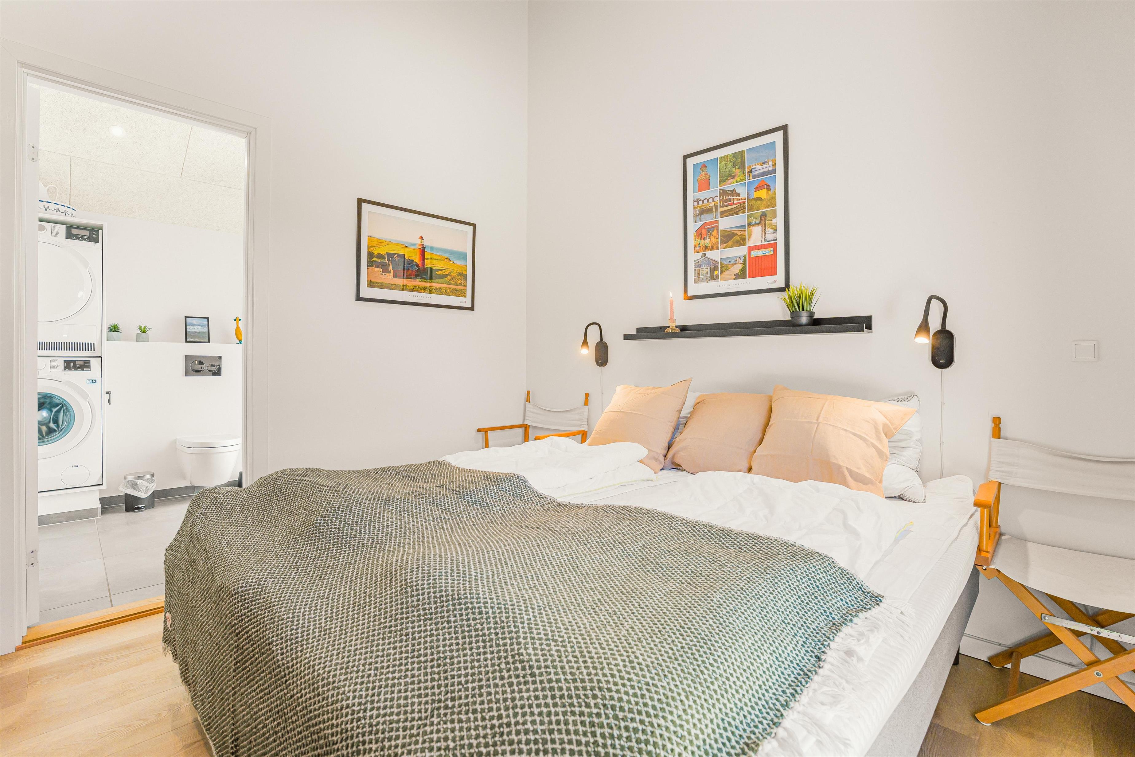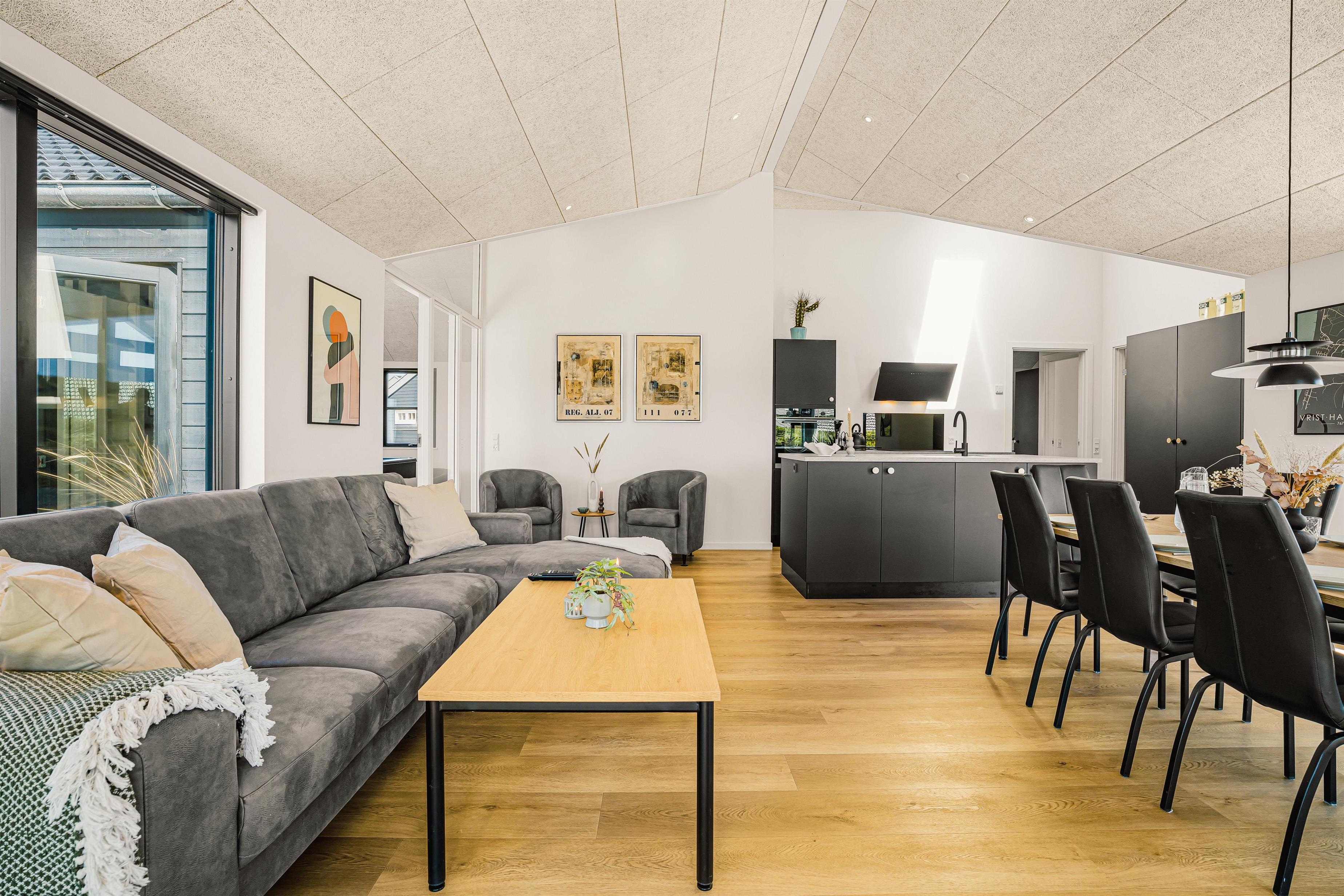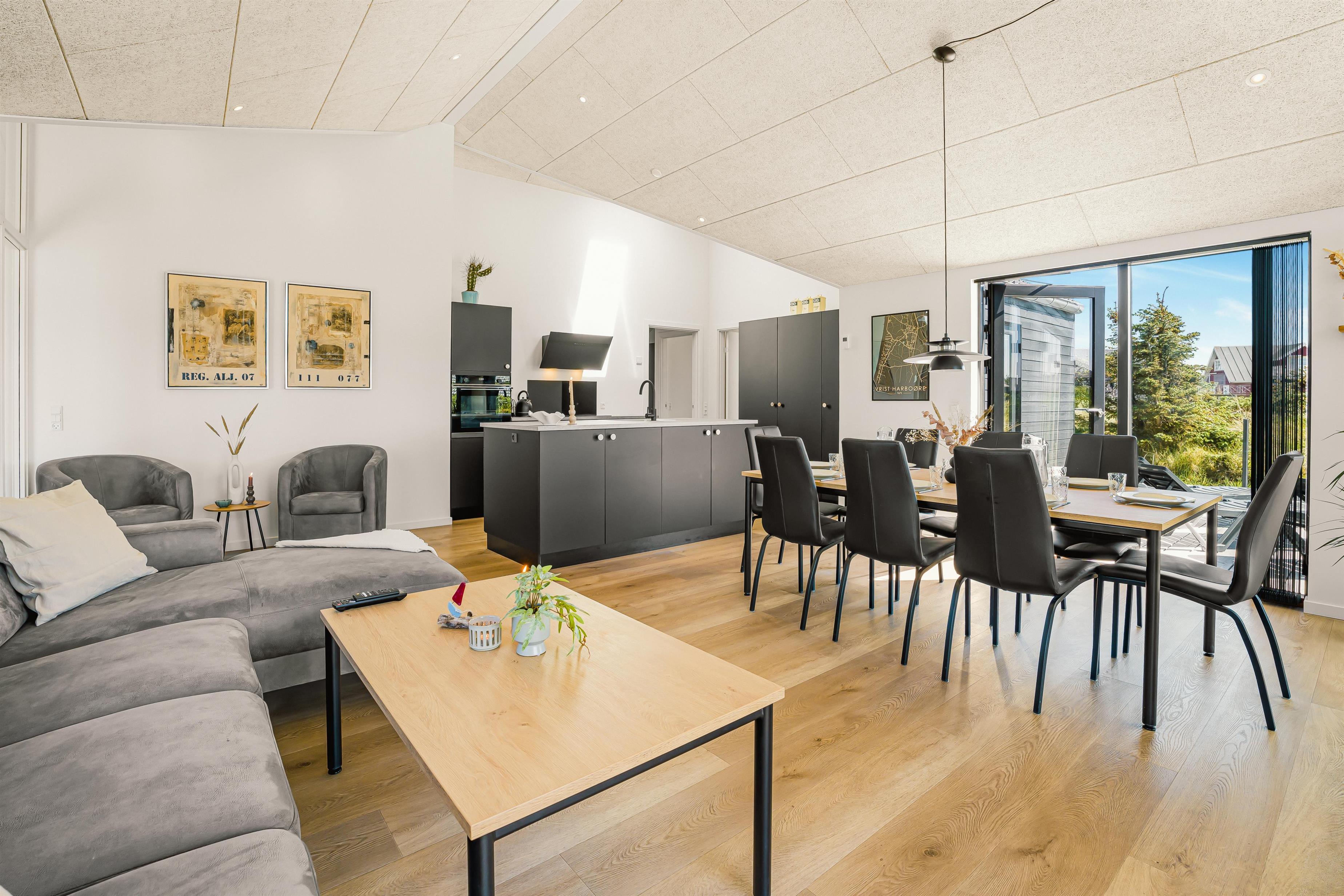 Husets hjerte er det store, åbne opholdsrum, hvor køkken, spiseplads og stue går ud i ét. Her er loft til kip, store vinduer og masser af naturligt lys, og det er netop her, man for alvor mærker feriehusets særlige atmosfære. Det moderne køkken er fuldt udstyret med alt, hvad man har brug for – og lidt til – og ligger i åben forbindelse med spisepladsen og den indbydende stue, som er møbleret med lækre kvalitetsmøbler og udstyret med TV, Chromecast og både danske og tyske kanaler. Her er der rigelig plads til samvær, afslapning og hygge – uanset om det er til en god film, en brætspilsaften eller bare at nyde stilheden og udsigten. Fra stuen er der adgang til master bedroom med eget toilet/bad.