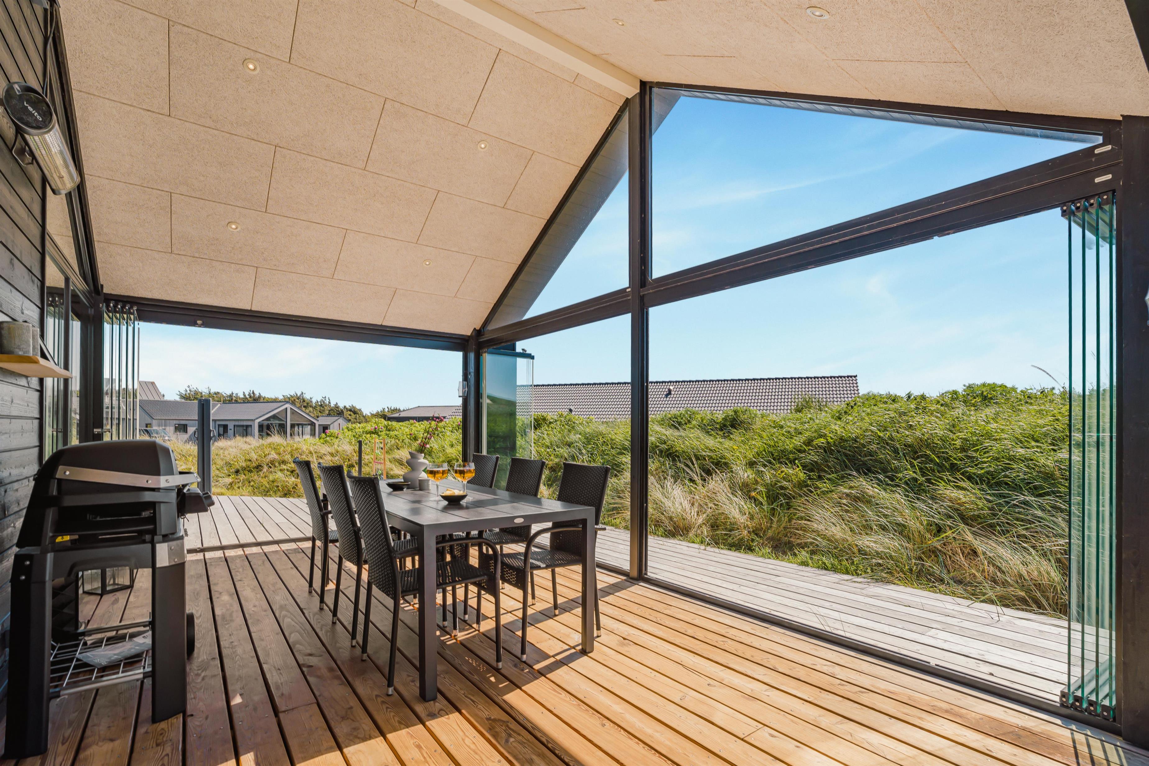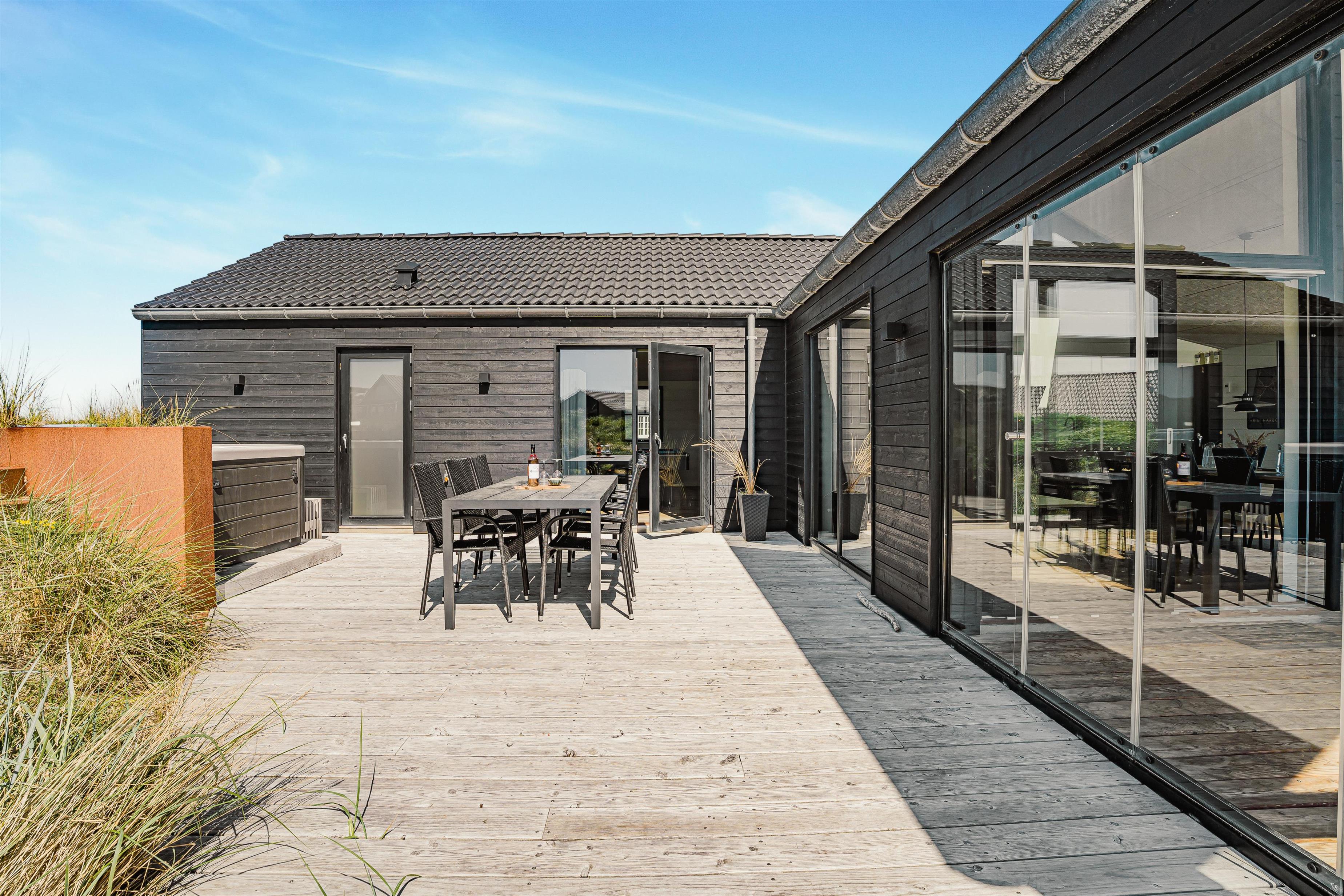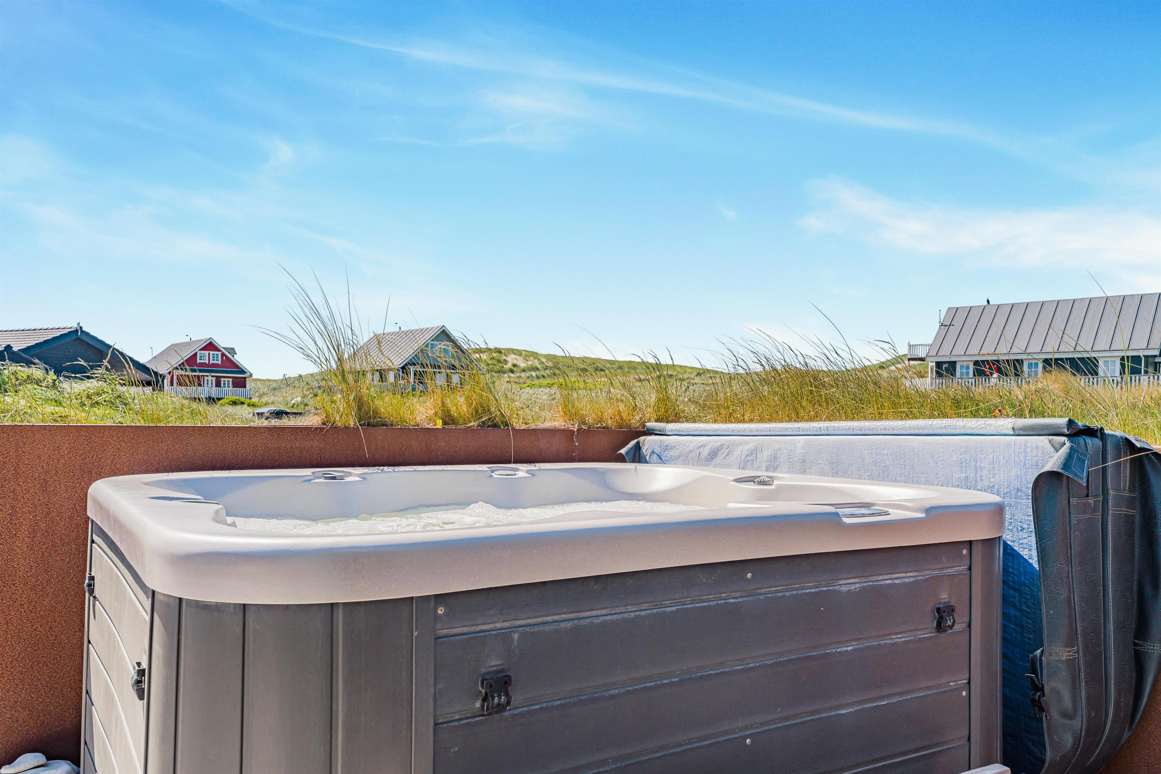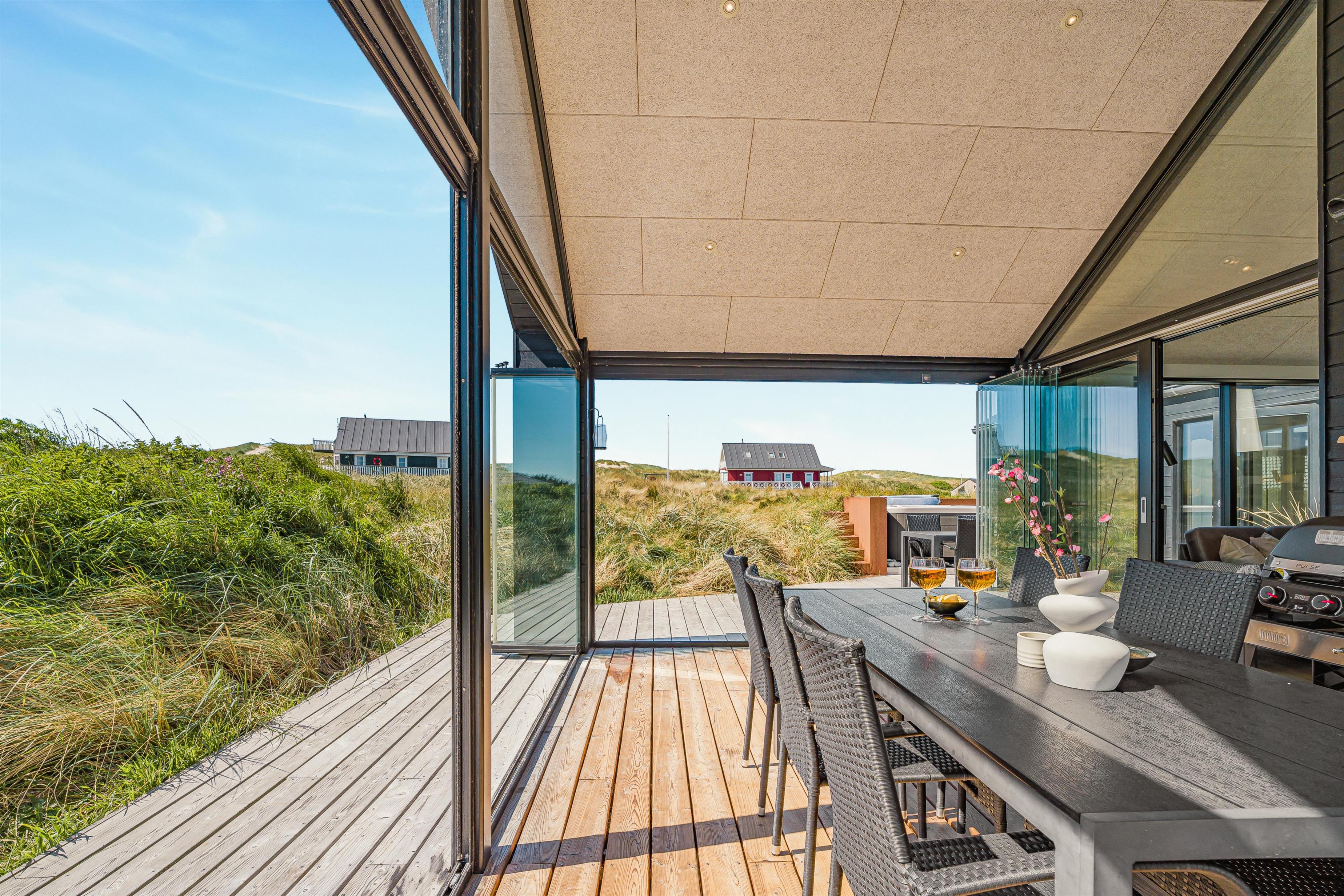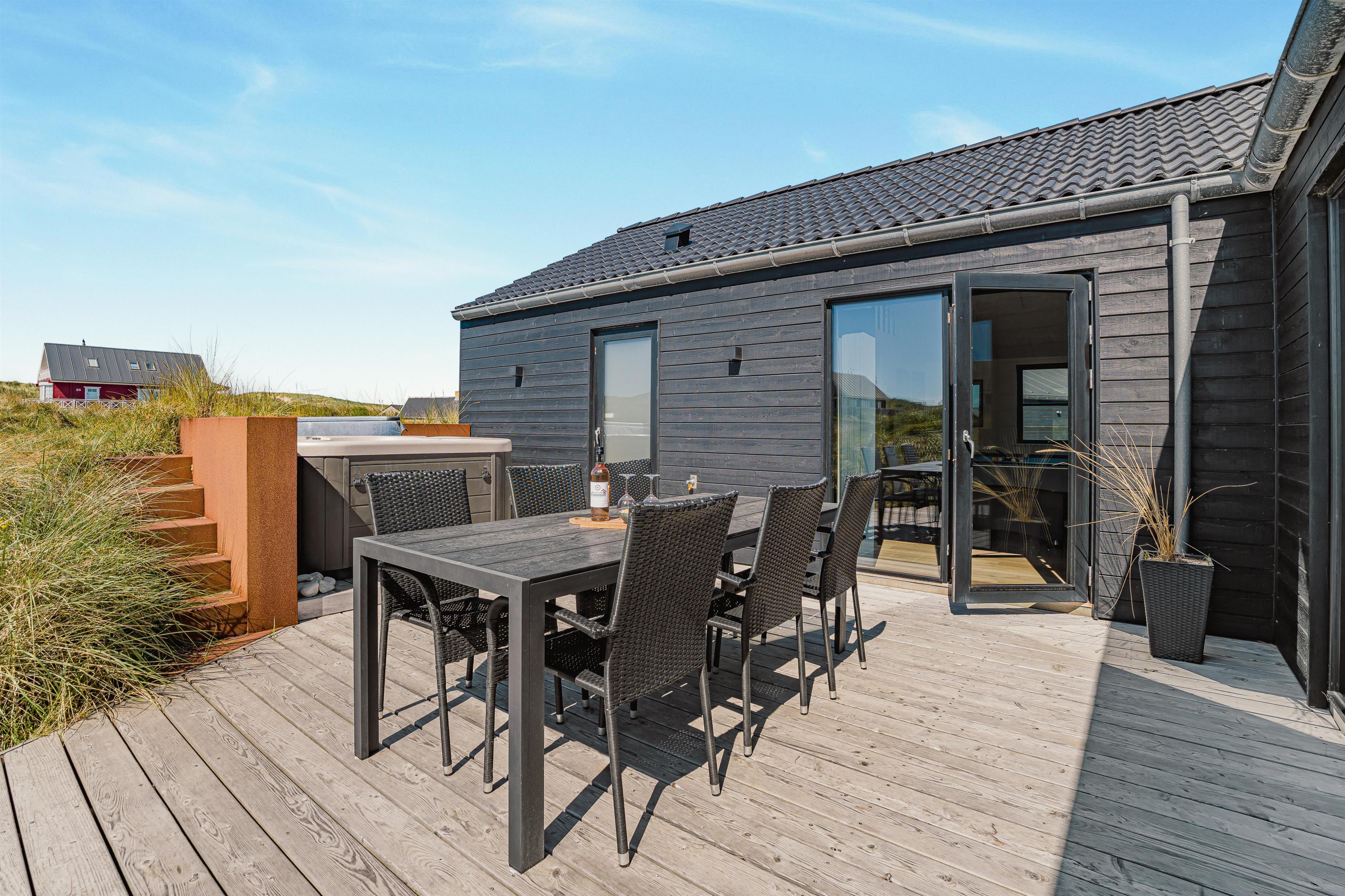 Udelivet er en central del af ferieoplevelsen i dette hus, og det store terrasseanlæg er indrettet med både åbne og overdækkede områder, så man altid kan finde sol eller læ – alt efter vejret. Et af højdepunkterne er den udendørs spa, som kan nydes både om dagen med udsigt til klitterne og om aftenen under stjernehimlen – en helt særlig oplevelse, der inviterer til ren afslapning og velvære. Her kan man virkelig mærke, hvordan både krop og sind finder ro.