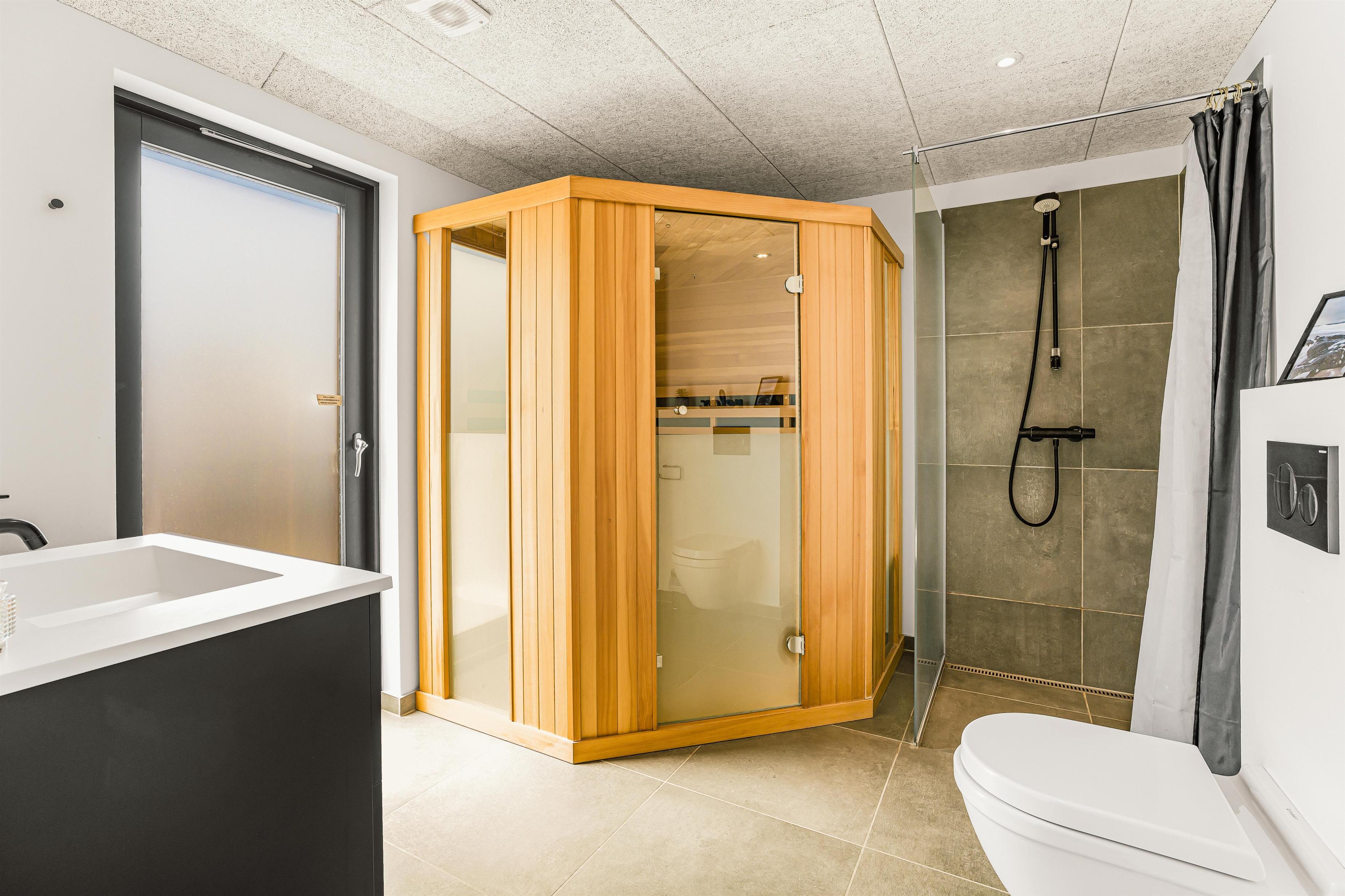 Huset rummer yderligere et stort badeværelse med bruser, toilet og håndvask, og her er der også adgang til husets indendørs sauna. Den direkte udgang til terrassen herfra gør det oplagt at kombinere wellness med den friske havluft – for eksempel en varm sauna efterfulgt af en pause i liggestolen under åben himmel.