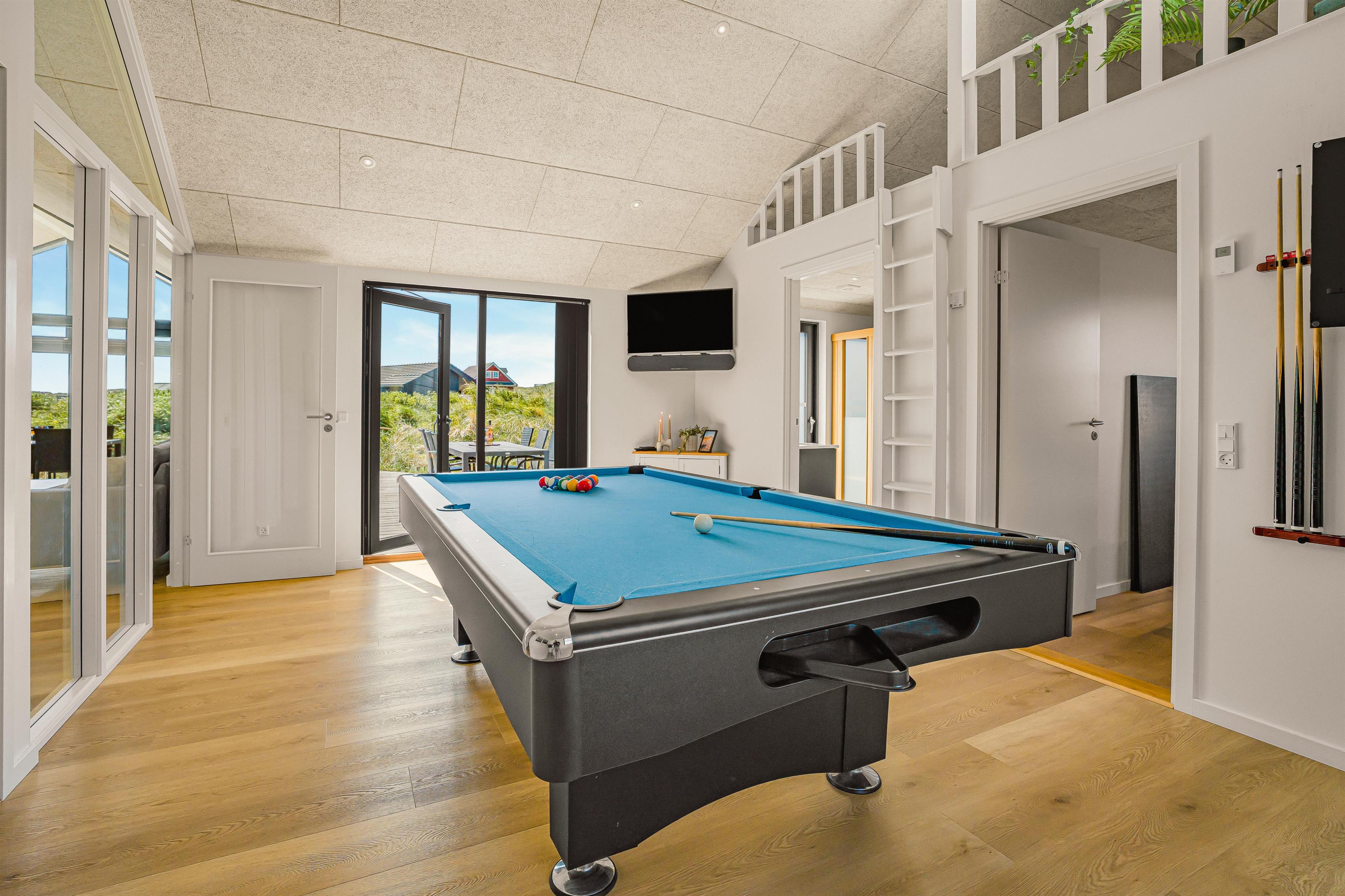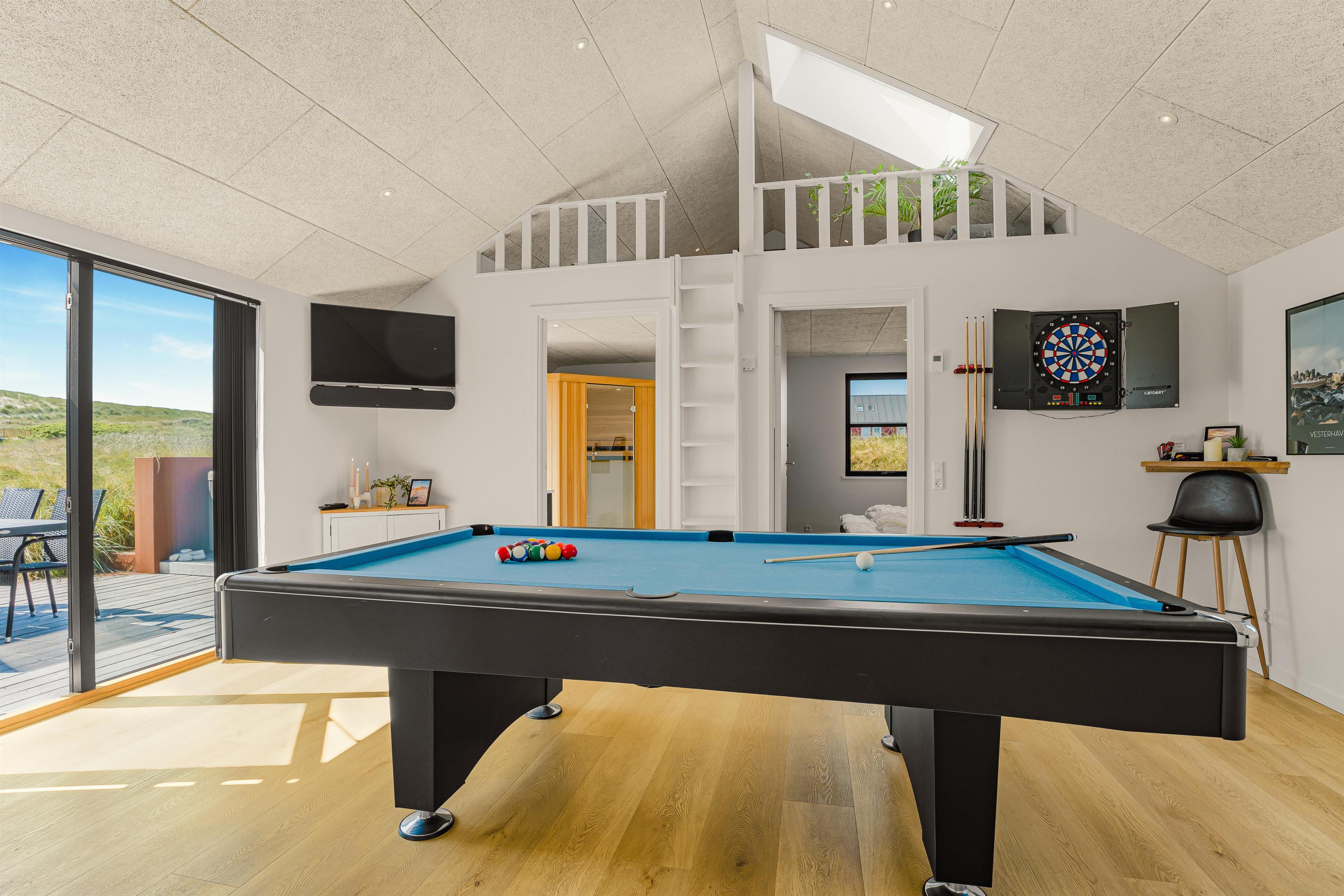 For den aktive familie byder huset også på et separat aktivitetsrum med ekstra TV med Chromecast og hvor både dart, bordtennis og poolbord står klar til hyggelige turneringer og sjov for store og små. I aktivitesrummet er der også en stige til en hyggelig hems med kig til klitterne – perfekt som legehjørne for børnene, en stille læsekrog eller skærmhygge med endnu et TV med Chromecast. Der er ligeledes adgang til 2 soveværelser hver med 1 DS.