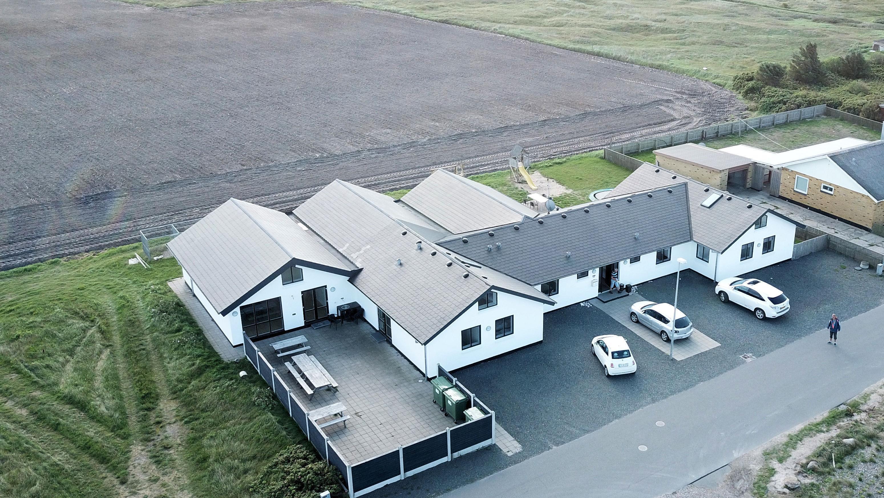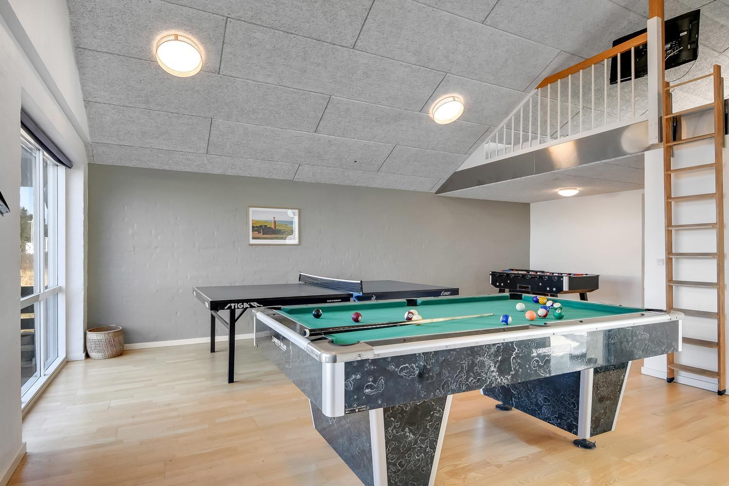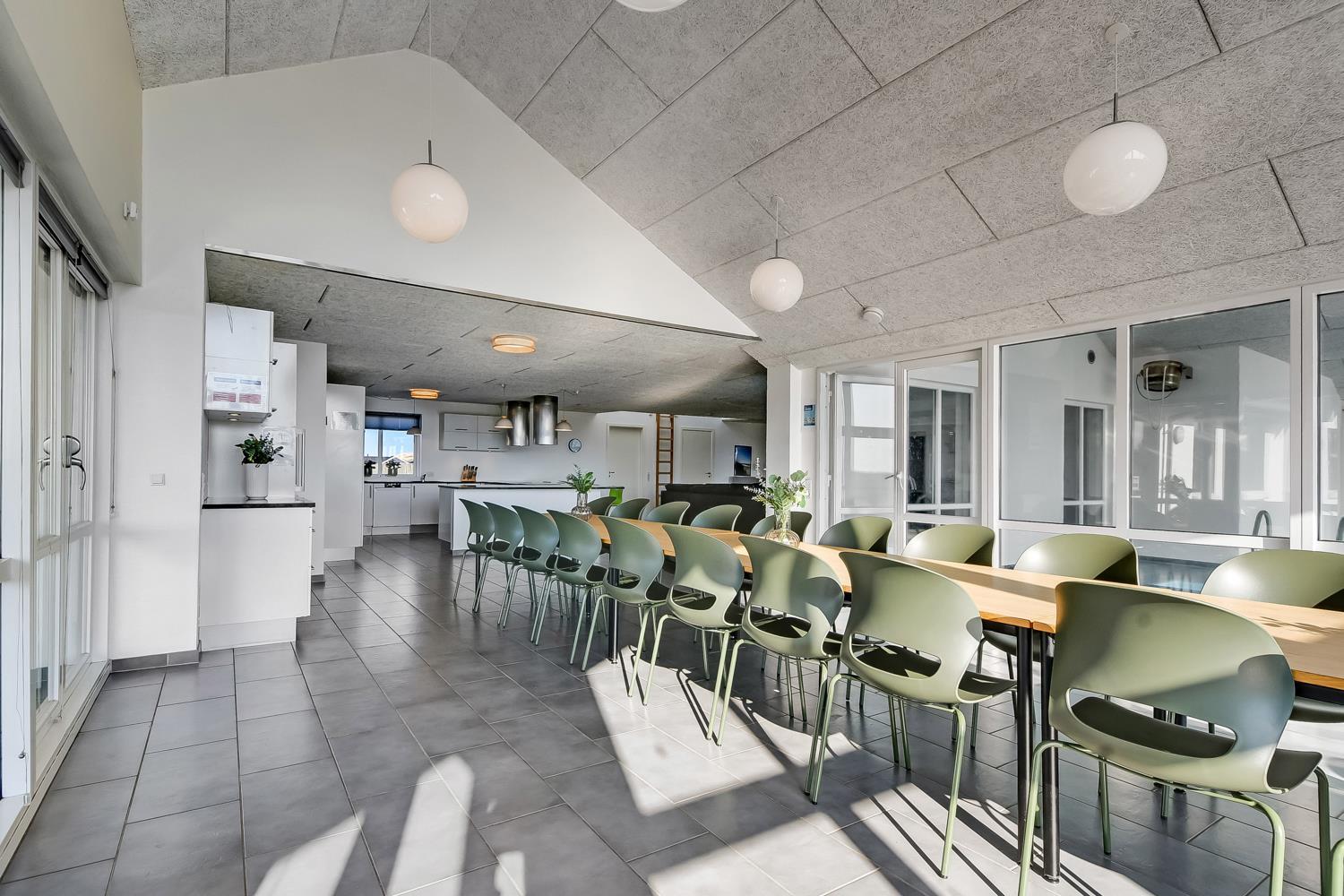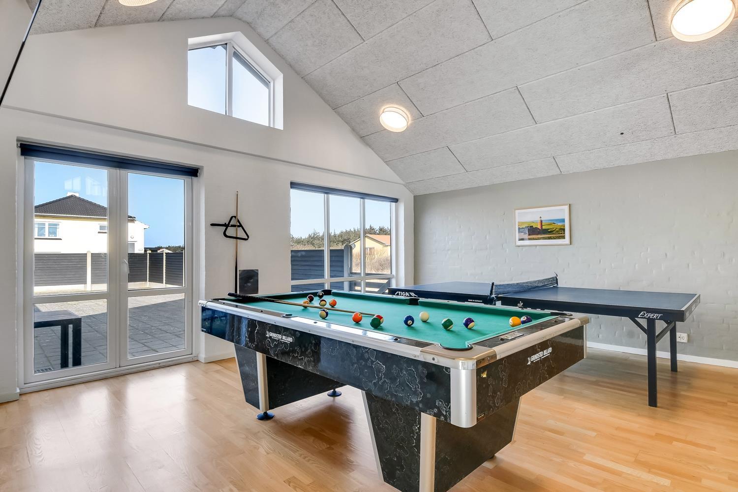 10 soverum: (DS + 1E) + (DS + 1E) + (DS + 1E) + (DS) + (DS) + (DS) + (DS) + (DS) + (DS) + (DS) og dertil kommer 4 store hemse alle med 3 sovepladser. Det 425 m2 store luksushus er indrettet med alle tænkelige, moderne faciliteter og er særdeles veludstyret for såvel en som flere familier der ønsker at tilbringe en afslappende ferie i et wellness-luksushus sammen. Rummelig, lys og venlig opholdsstue med store vinduespartier, fladskærm, parabol med danske, tyske, norske og svenske programmer. Radio. Meget veludstyret og velindrettet køkken med stor spiseplads, 2 håndvaske, 2 opvaskemaskiner, 2 komfure med ovne, mikroovn samt 3 køleskabe med fryser. Huset er indrettet med et stort aktivitetsrum med billard, bordtennisbord, bordfodbold, fladskærm, parabol og Playstation. Flot pool-wellnesrum hvor familien rigtig kan slappe af og more sig i den 24m2 store pool med ekstra, lille børnepool samt svømmetræner, i det indbydende spabad til 6 personer eller under koldtvandskarret. Fra poolrummet er der adgang til husets sauna samt til et badeværelse med bruser. Derudover er der endnu 2 badeværelser, begge med toilet, håndvask og bruser og et dejligt, rummeligt bryggers med vaskemaskine og tørretumbler. Indgangsdørenes bredde til badeværelserne er hhv. 60 cm, 60 cm og 80 cm. Huset er dels med gulvopvarmede klinker og dels med trægulve. Til de små er der 2 højstole og 2 babysenge. Huset lejes ikke ud til ungdomsgrupper. Adgang til Harboøre Centeret . Huset er lavet som et energi rigtigt hus der opvarmes med jordvarme. Depositum vintersæson kr. 8000 og sommersæson kr. 5000