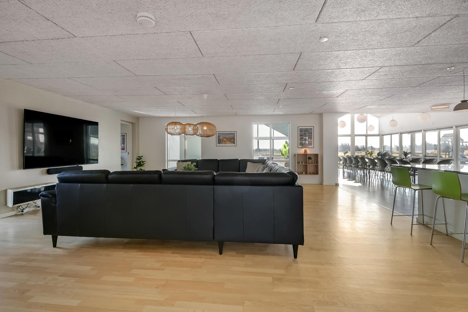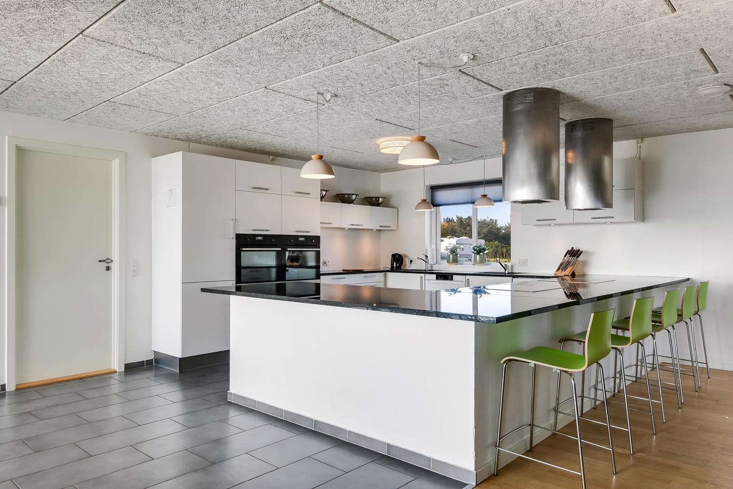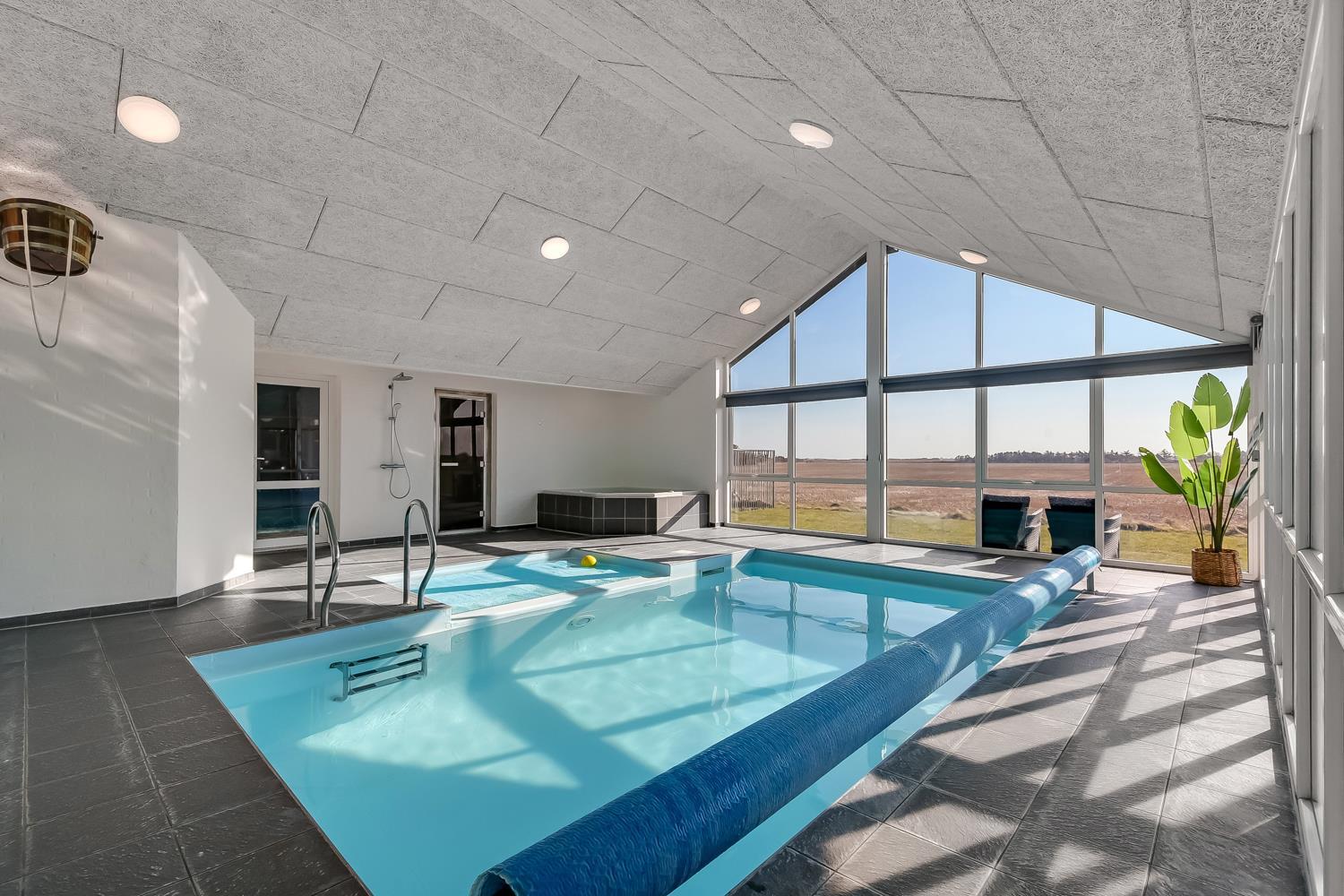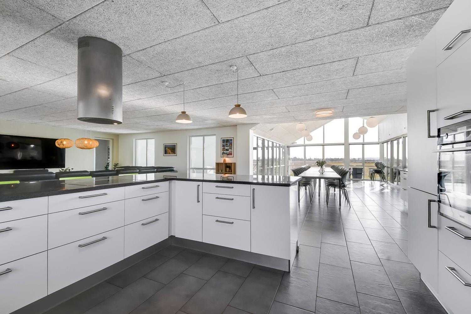 10 soverum: (DS + 1E) + (DS + 1E) + (DS + 1E) + (DS) + (DS) + (DS) + (DS) + (DS) + (DS) + (DS) og dertil kommer 4 store hemse alle med 3 sovepladser. Det 425 m2 store luksushus er indrettet med alle tænkelige, moderne faciliteter og er særdeles veludstyret for såvel en som flere familier der ønsker at tilbringe en afslappende ferie i et wellness-luksushus sammen. Rummelig, lys og venlig opholdsstue med store vinduespartier, fladskærm, parabol med danske, tyske, norske og svenske programmer. Radio. Meget veludstyret og velindrettet køkken med stor spiseplads, 2 håndvaske, 2 opvaskemaskiner, 2 komfure med ovne, mikroovn samt 3 køleskabe med fryser. Huset er indrettet med et stort aktivitetsrum med billard, bordtennisbord, bordfodbold, fladskærm, parabol og Playstation. Flot pool-wellnesrum hvor familien rigtig kan slappe af og more sig i den 24m2 store pool med ekstra, lille børnepool samt svømmetræner, i det indbydende spabad til 6 personer eller under koldtvandskarret. Fra poolrummet er der adgang til husets sauna samt til et badeværelse med bruser. Derudover er der endnu 2 badeværelser, begge med toilet, håndvask og bruser og et dejligt, rummeligt bryggers med vaskemaskine og tørretumbler. Indgangsdørenes bredde til badeværelserne er hhv. 60 cm, 60 cm og 80 cm. Huset er dels med gulvopvarmede klinker og dels med trægulve. Til de små er der 2 højstole og 2 babysenge. Huset lejes ikke ud til ungdomsgrupper. Adgang til Harboøre Centeret . Huset er lavet som et energi rigtigt hus der opvarmes med jordvarme. Depositum vintersæson kr. 8000 og sommersæson kr. 5000