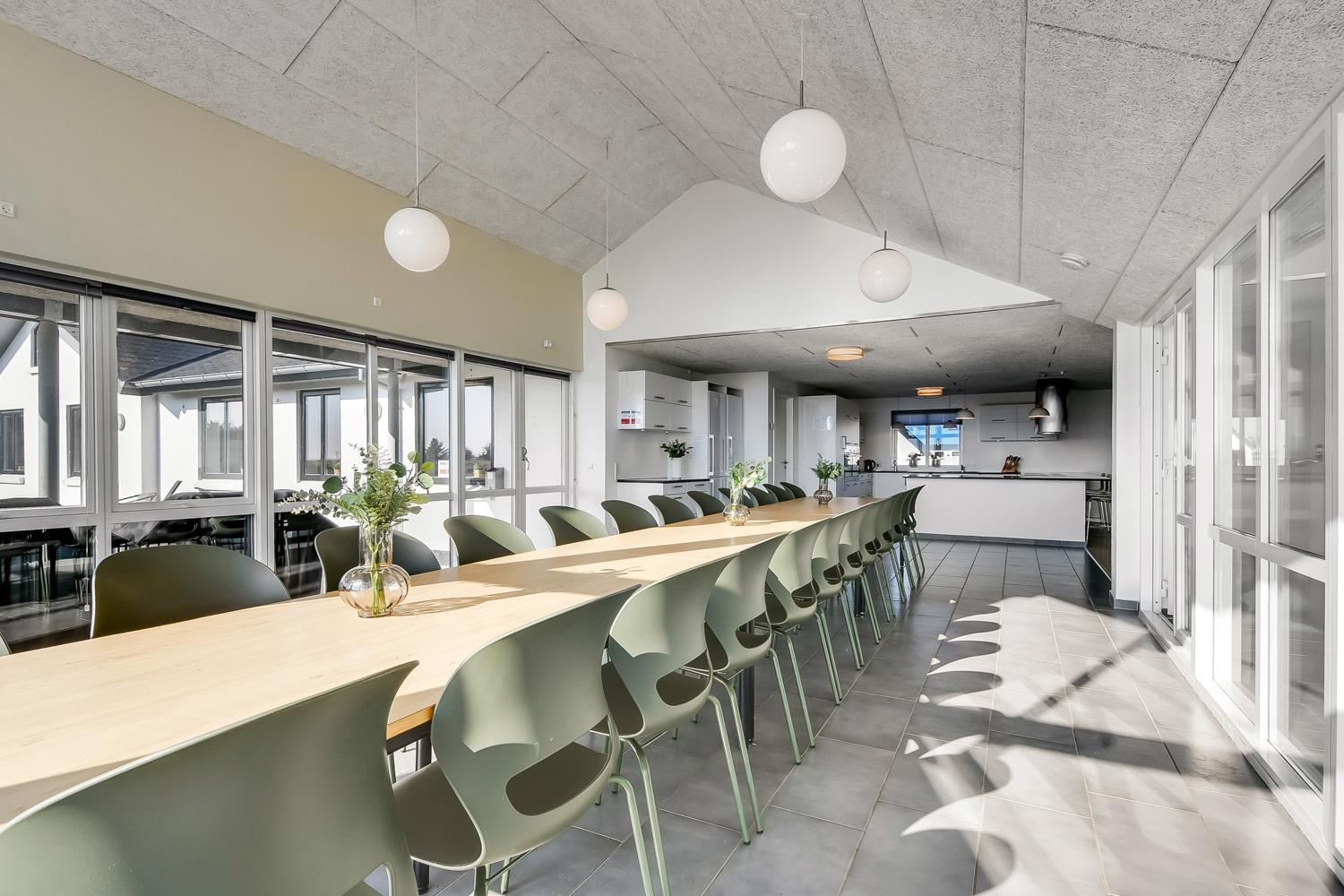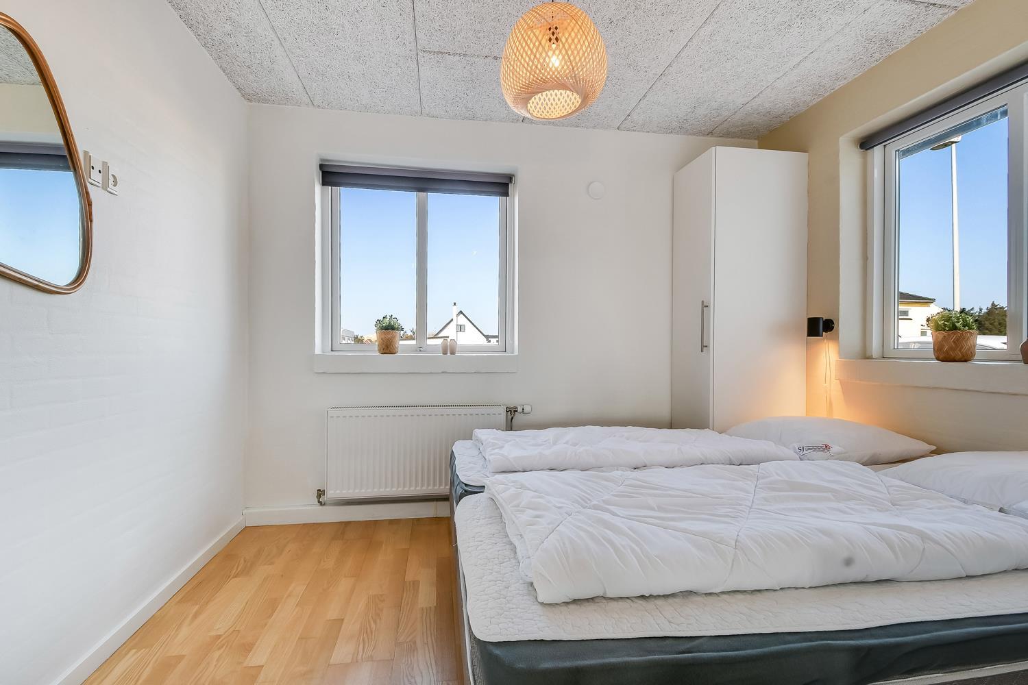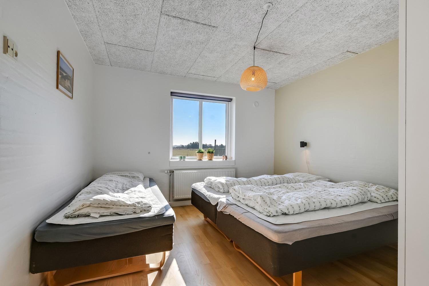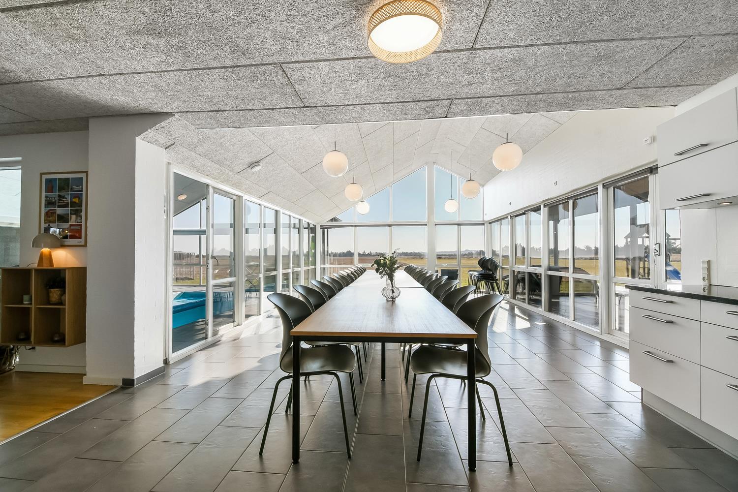 10 soverum: (DS + 1E) + (DS + 1E) + (DS + 1E) + (DS) + (DS) + (DS) + (DS) + (DS) + (DS) + (DS) og dertil kommer 4 store hemse alle med 3 sovepladser. Det 425 m2 store luksushus er indrettet med alle tænkelige, moderne faciliteter og er særdeles veludstyret for såvel en som flere familier der ønsker at tilbringe en afslappende ferie i et wellness-luksushus sammen. Rummelig, lys og venlig opholdsstue med store vinduespartier, fladskærm, parabol med danske, tyske, norske og svenske programmer. Radio. Meget veludstyret og velindrettet køkken med stor spiseplads, 2 håndvaske, 2 opvaskemaskiner, 2 komfure med ovne, mikroovn samt 3 køleskabe med fryser. Huset er indrettet med et stort aktivitetsrum med billard, bordtennisbord, bordfodbold, fladskærm, parabol og Playstation. Flot pool-wellnesrum hvor familien rigtig kan slappe af og more sig i den 24m2 store pool med ekstra, lille børnepool samt svømmetræner, i det indbydende spabad til 6 personer eller under koldtvandskarret. Fra poolrummet er der adgang til husets sauna samt til et badeværelse med bruser. Derudover er der endnu 2 badeværelser, begge med toilet, håndvask og bruser og et dejligt, rummeligt bryggers med vaskemaskine og tørretumbler. Indgangsdørenes bredde til badeværelserne er hhv. 60 cm, 60 cm og 80 cm. Huset er dels med gulvopvarmede klinker og dels med trægulve. Til de små er der 2 højstole og 2 babysenge. Huset lejes ikke ud til ungdomsgrupper. Adgang til Harboøre Centeret . Huset er lavet som et energi rigtigt hus der opvarmes med jordvarme. Depositum vintersæson kr. 8000 og sommersæson kr. 5000