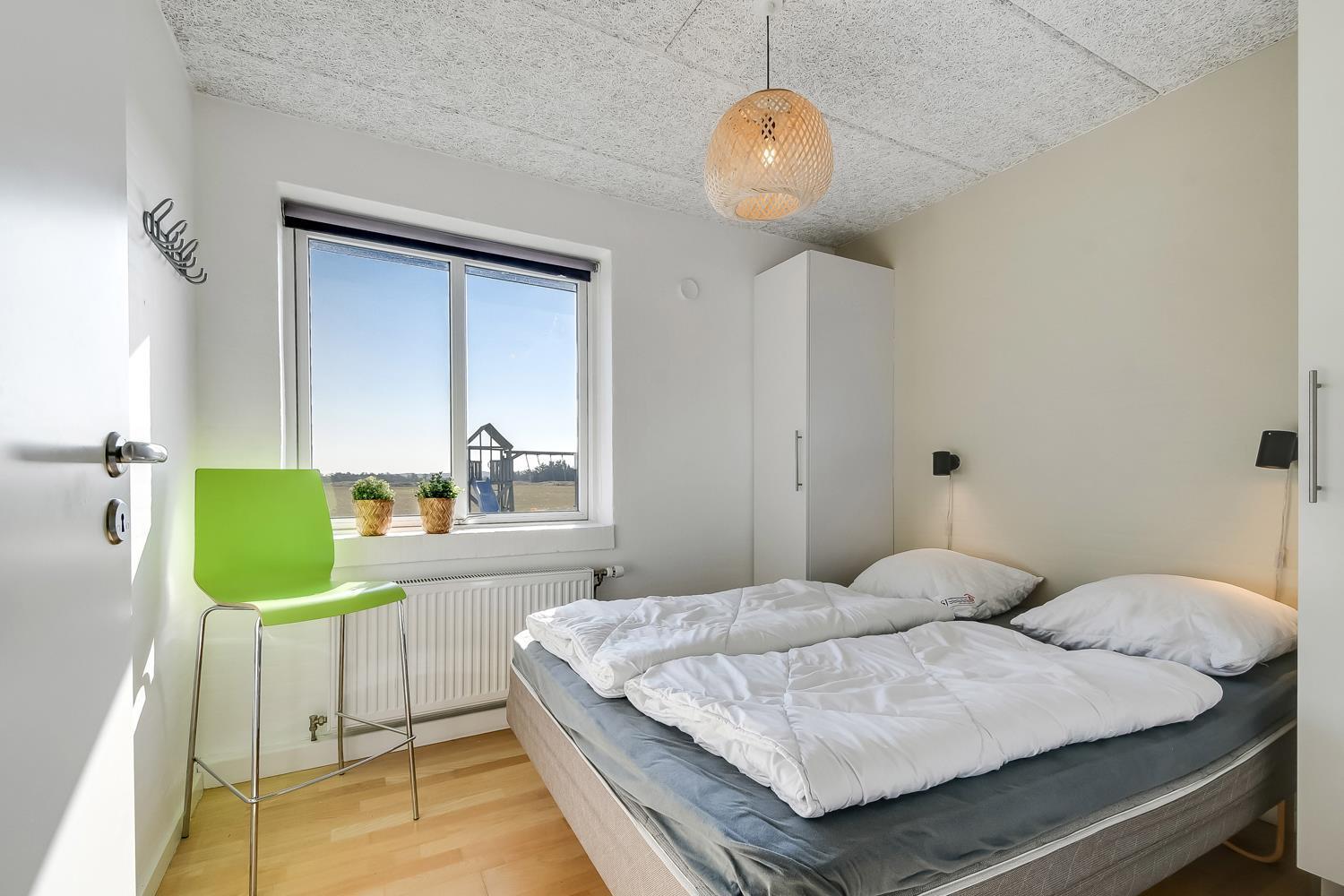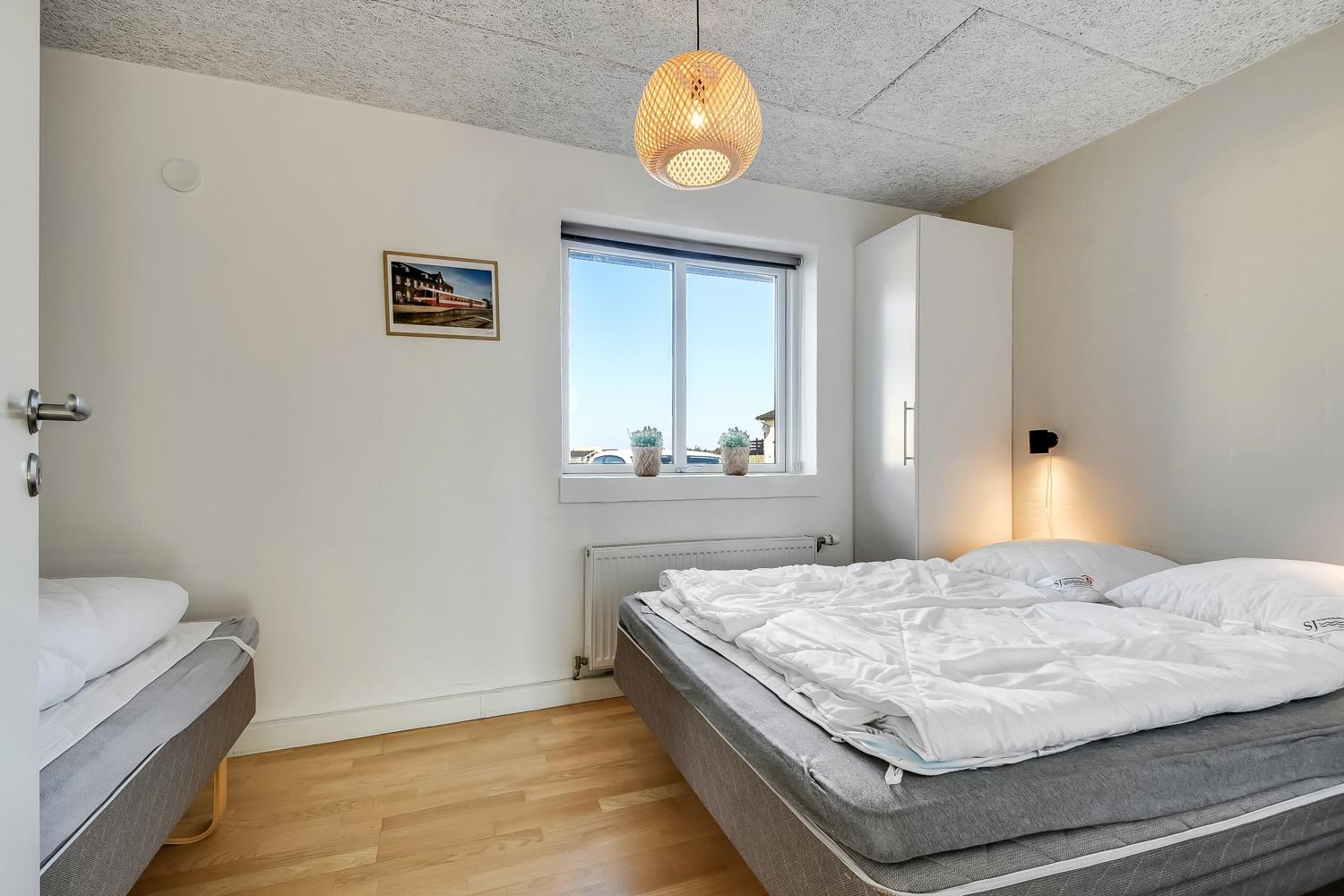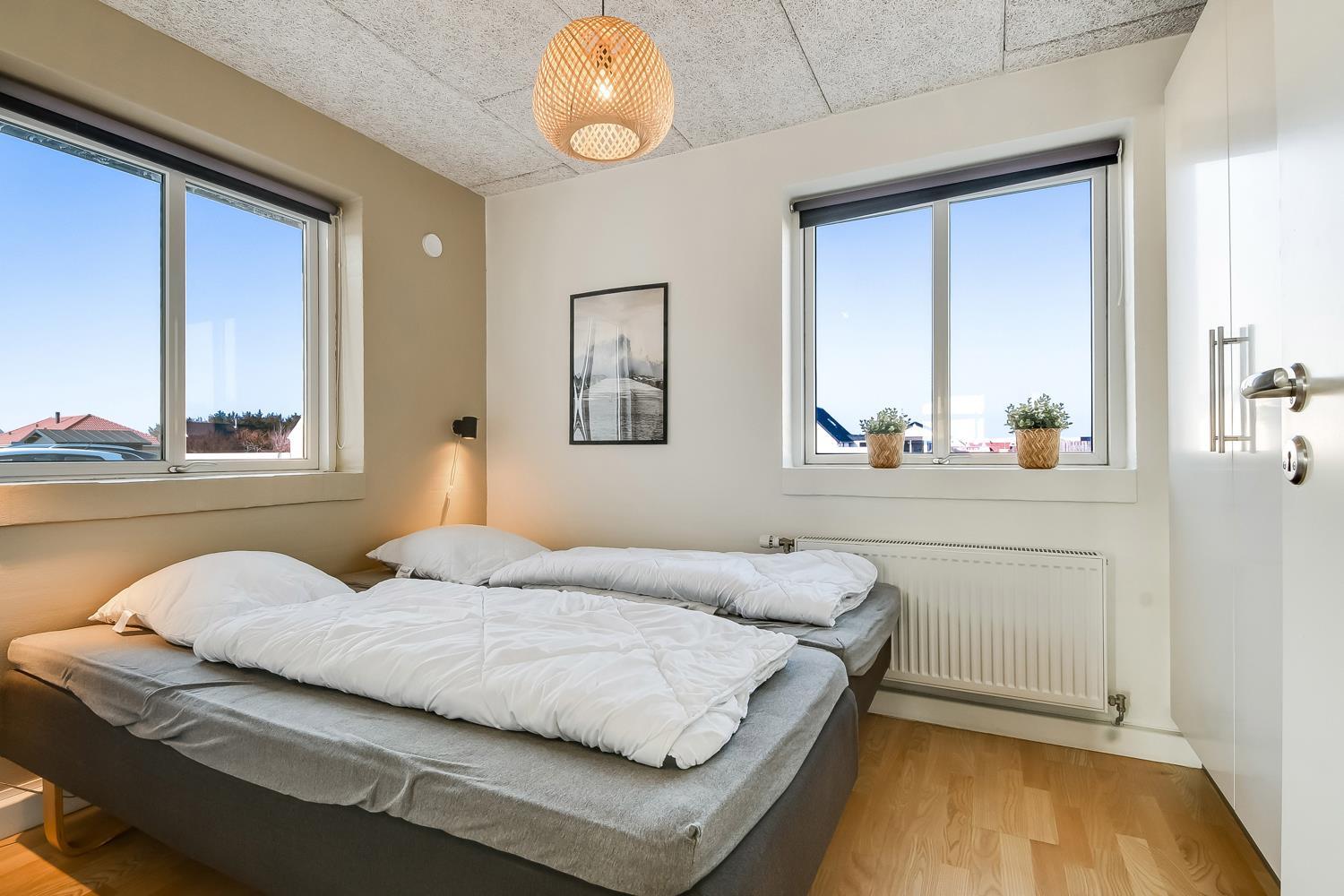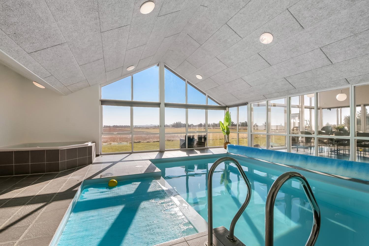 10 soverum: (DS + 1E) + (DS + 1E) + (DS + 1E) + (DS) + (DS) + (DS) + (DS) + (DS) + (DS) + (DS) og dertil kommer 4 store hemse alle med 3 sovepladser. Det 425 m2 store luksushus er indrettet med alle tænkelige, moderne faciliteter og er særdeles veludstyret for såvel en som flere familier der ønsker at tilbringe en afslappende ferie i et wellness-luksushus sammen. Rummelig, lys og venlig opholdsstue med store vinduespartier, fladskærm, parabol med danske, tyske, norske og svenske programmer. Radio. Meget veludstyret og velindrettet køkken med stor spiseplads, 2 håndvaske, 2 opvaskemaskiner, 2 komfure med ovne, mikroovn samt 3 køleskabe med fryser. Huset er indrettet med et stort aktivitetsrum med billard, bordtennisbord, bordfodbold, fladskærm, parabol og Playstation. Flot pool-wellnesrum hvor familien rigtig kan slappe af og more sig i den 24m2 store pool med ekstra, lille børnepool samt svømmetræner, i det indbydende spabad til 6 personer eller under koldtvandskarret. Fra poolrummet er der adgang til husets sauna samt til et badeværelse med bruser. Derudover er der endnu 2 badeværelser, begge med toilet, håndvask og bruser og et dejligt, rummeligt bryggers med vaskemaskine og tørretumbler. Indgangsdørenes bredde til badeværelserne er hhv. 60 cm, 60 cm og 80 cm. Huset er dels med gulvopvarmede klinker og dels med trægulve. Til de små er der 2 højstole og 2 babysenge. Huset lejes ikke ud til ungdomsgrupper. Adgang til Harboøre Centeret . Huset er lavet som et energi rigtigt hus der opvarmes med jordvarme. Depositum vintersæson kr. 8000 og sommersæson kr. 5000