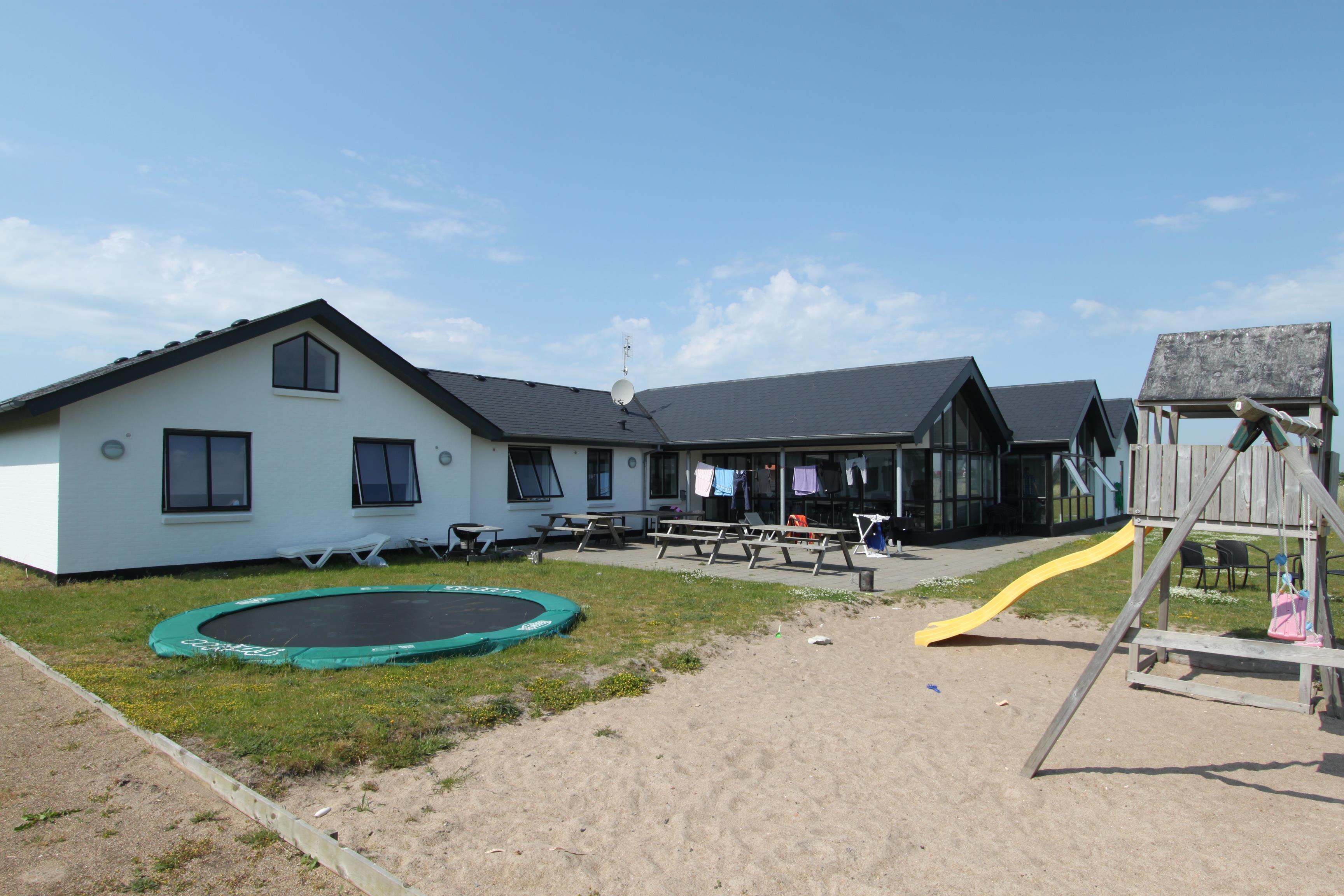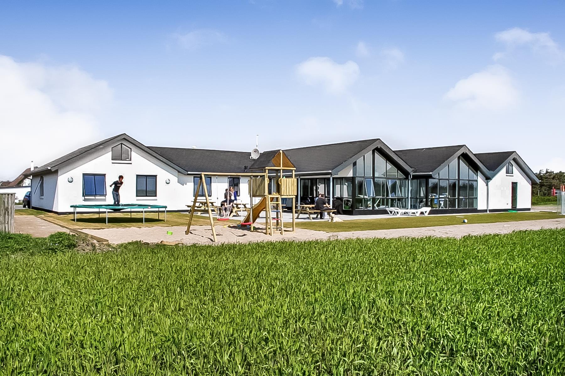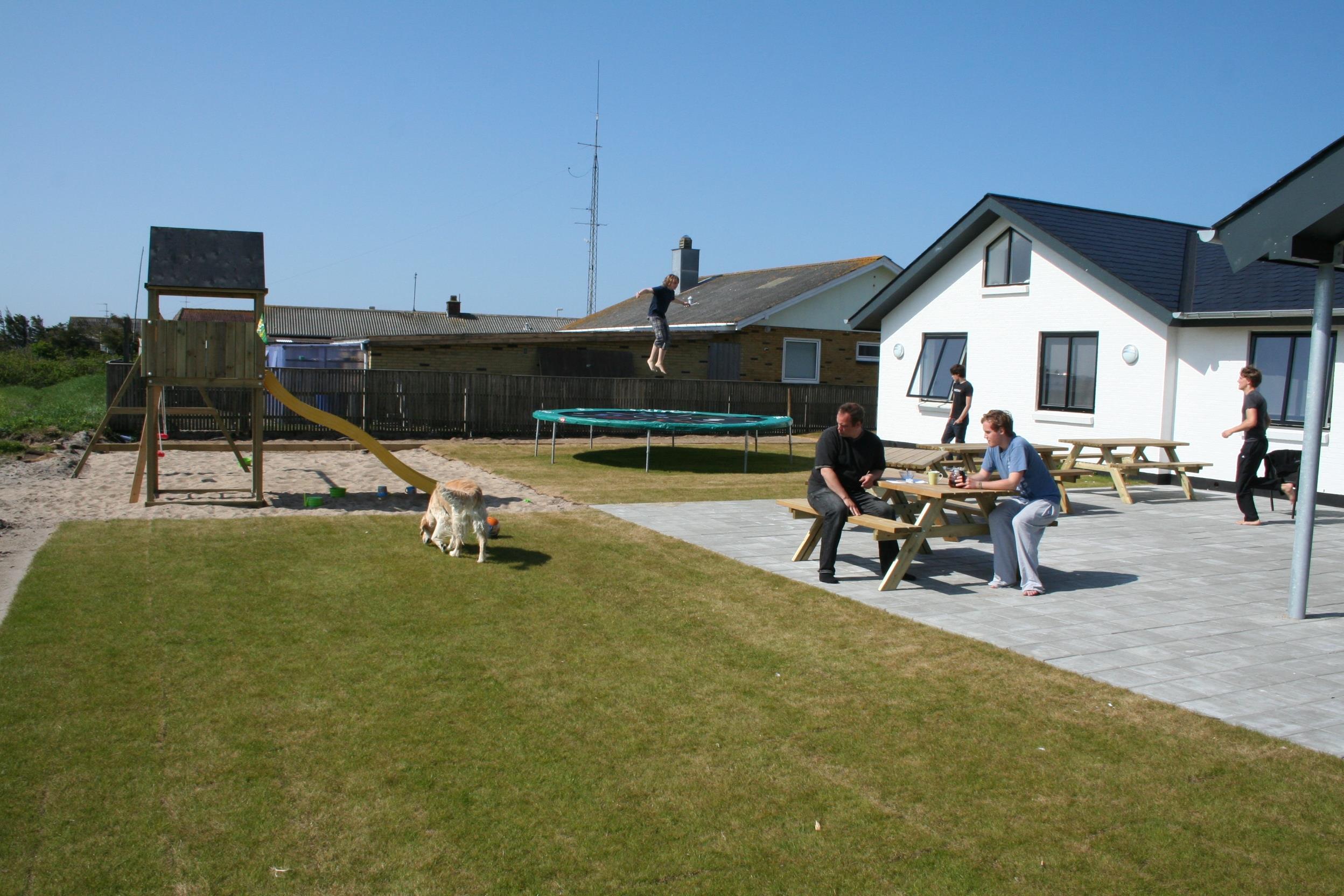 Huset er omgivet af flere terrasser, hvor man altid har mulighed for at finde læ på feriens solrige dage. Her finder man naturligvis havemøbler og liggestole og gasgrill. Til børnene er der desuden stor trampolin, sandkasse og gyngestativ. Dette storslåede feriehus er beliggende på en 1.700 m2 skøn naturgrund i Vrist kun 250 m fra stranden. Grunden er velbeliggende, centralt med kun 50 m til indkøb og samtidig ud til åbne markområder.