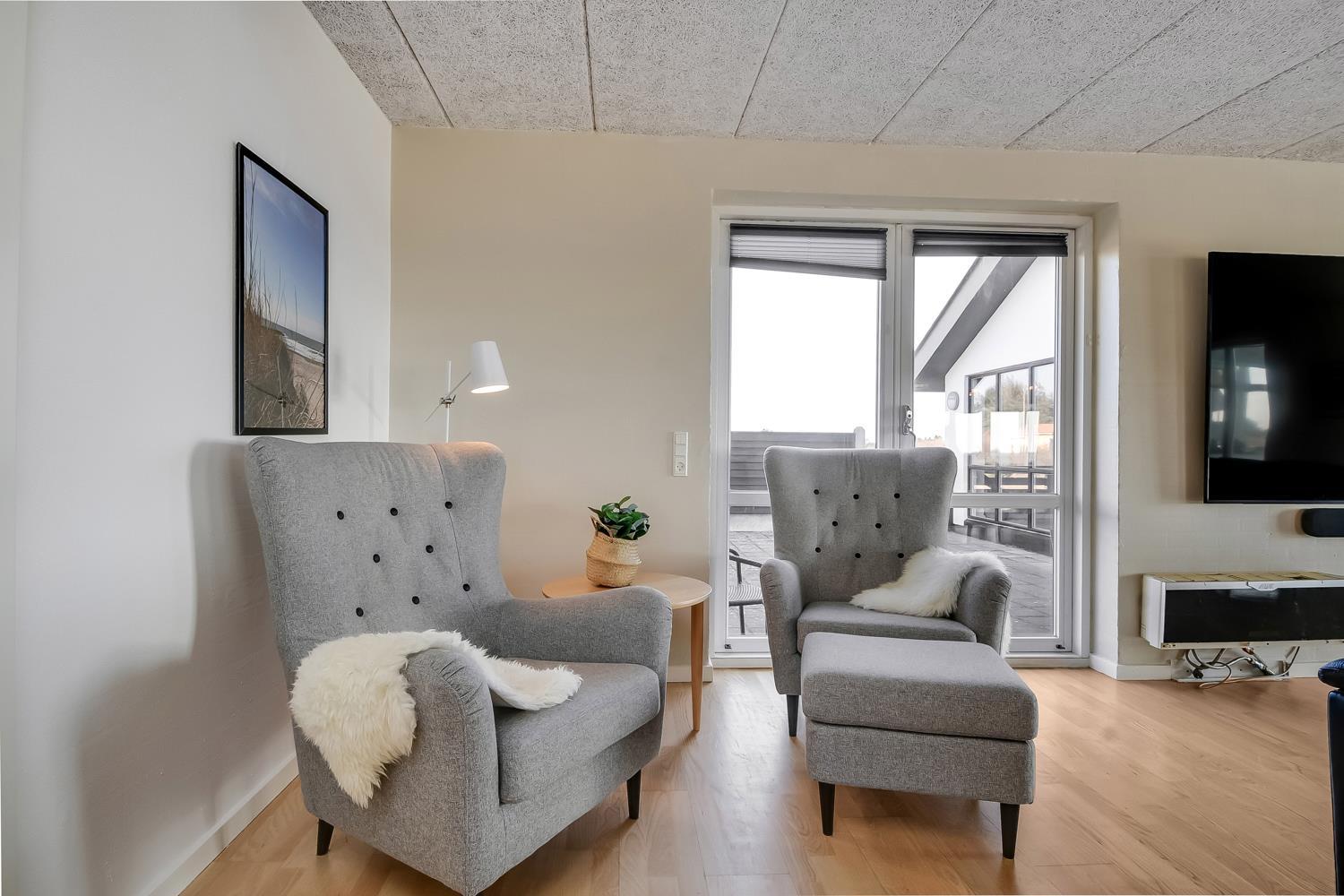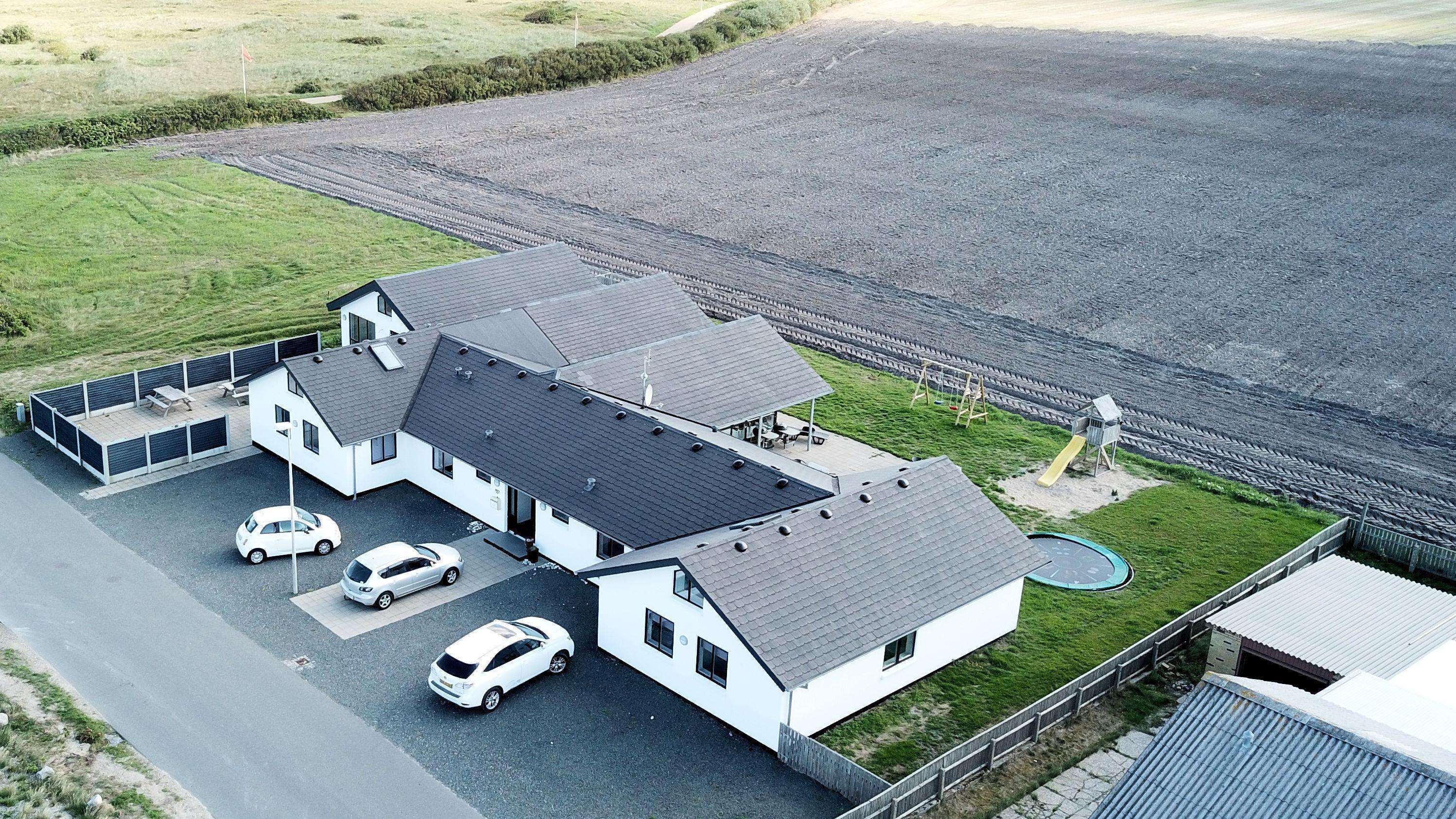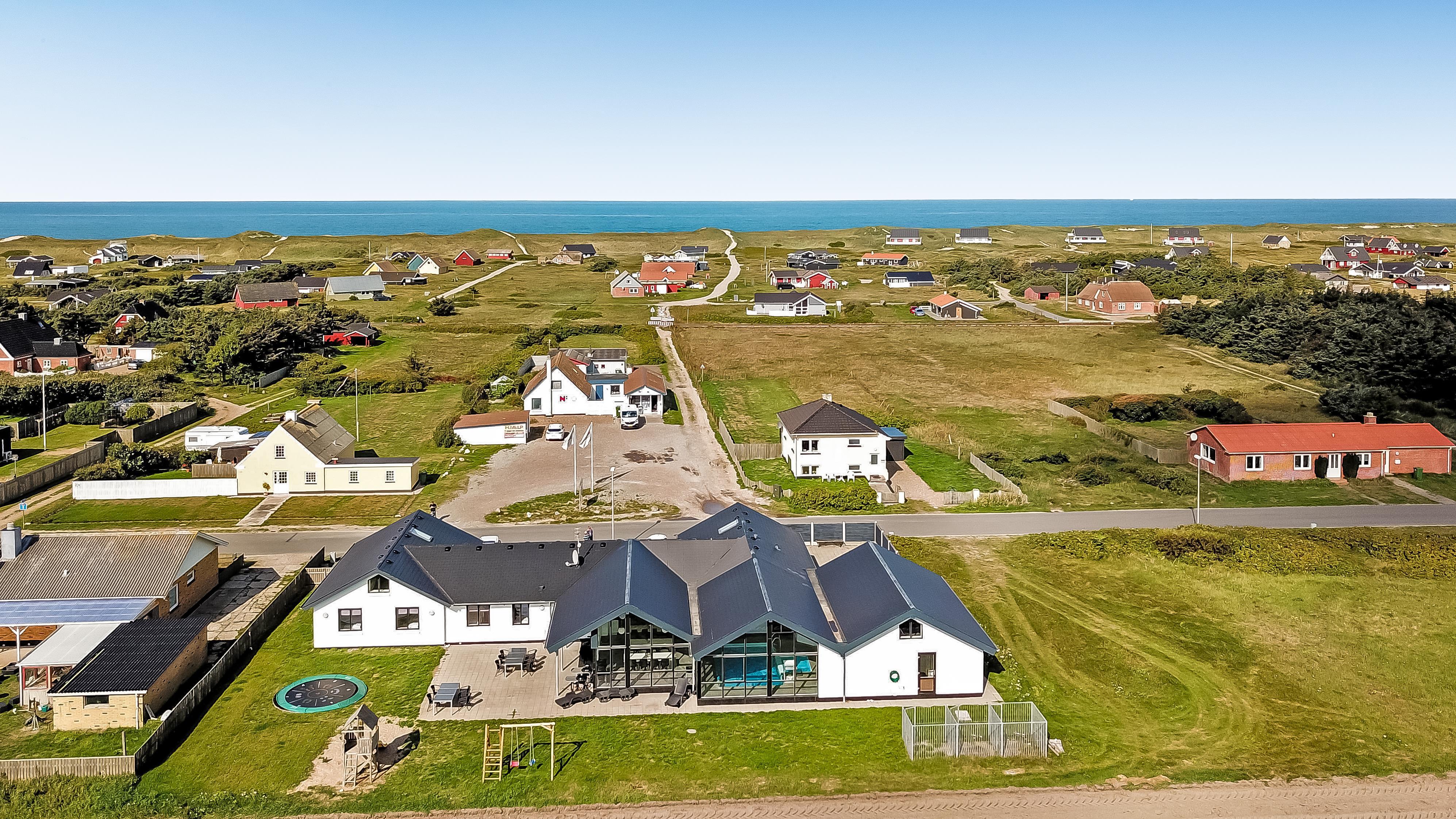 Huset er omgivet af flere terrasser, hvor man altid har mulighed for at finde læ på feriens solrige dage. Her finder man naturligvis havemøbler og liggestole og gasgrill. Til børnene er der desuden stor trampolin, sandkasse og gyngestativ. Dette storslåede feriehus er beliggende på en 1.700 m2 skøn naturgrund i Vrist kun 250 m fra stranden. Grunden er velbeliggende, centralt med kun 50 m til indkøb og samtidig ud til åbne markområder.