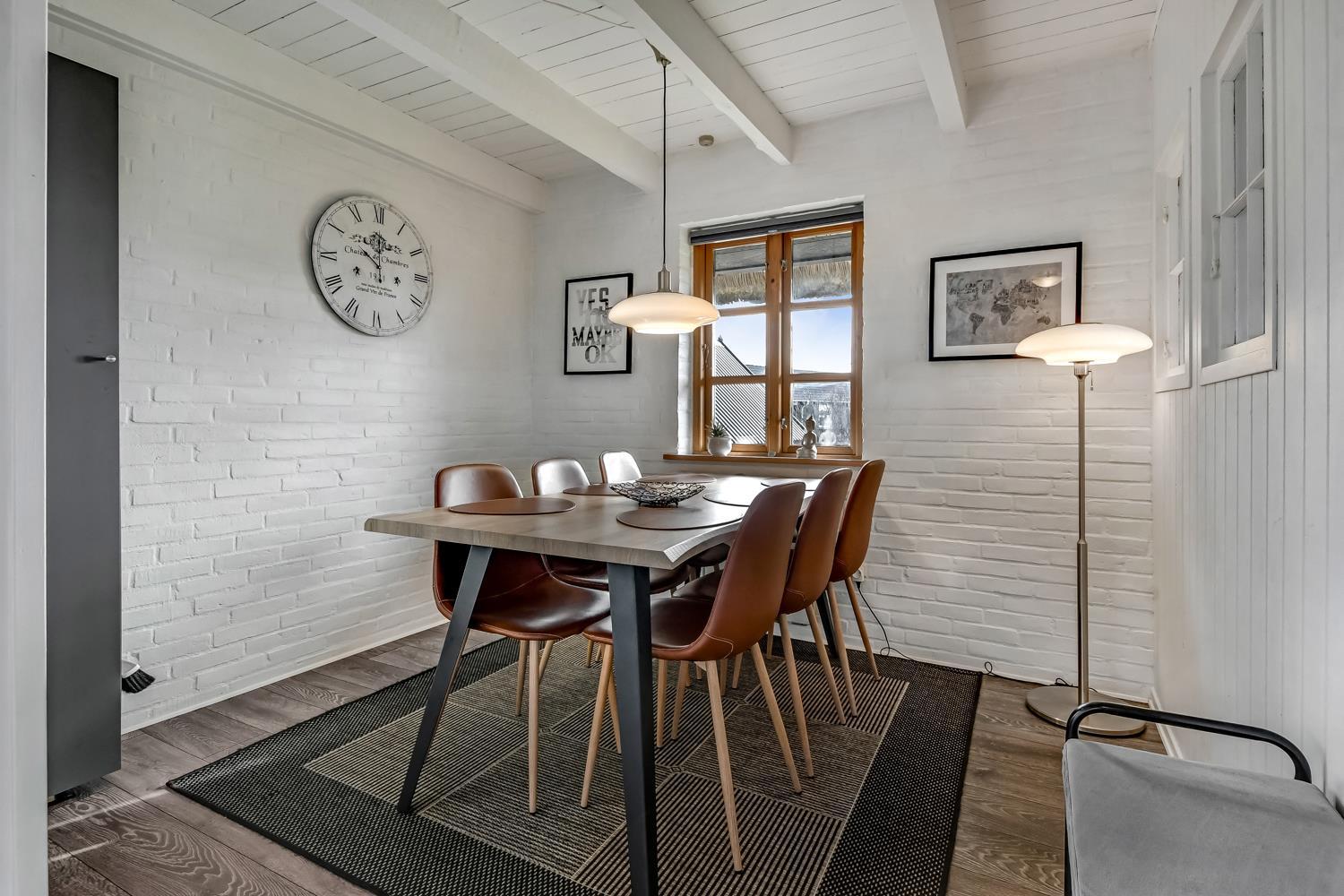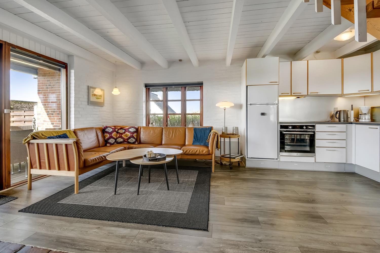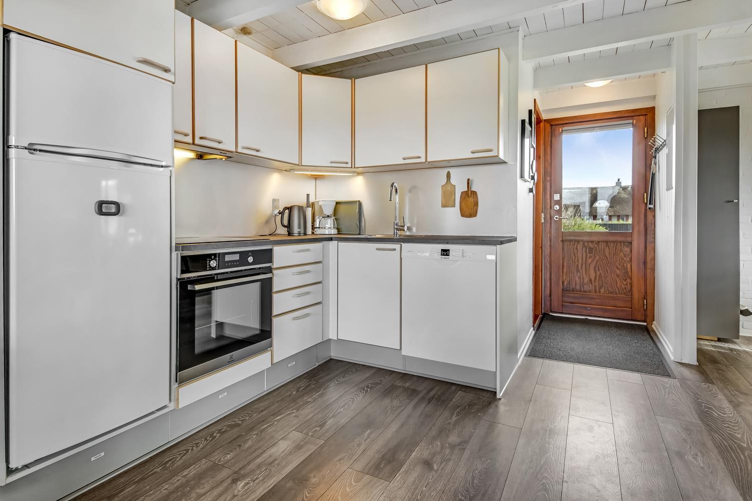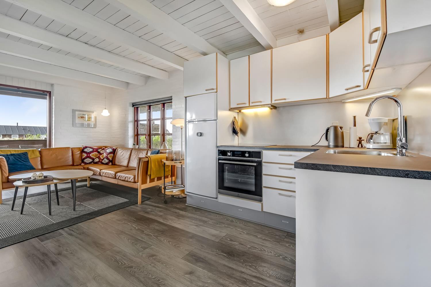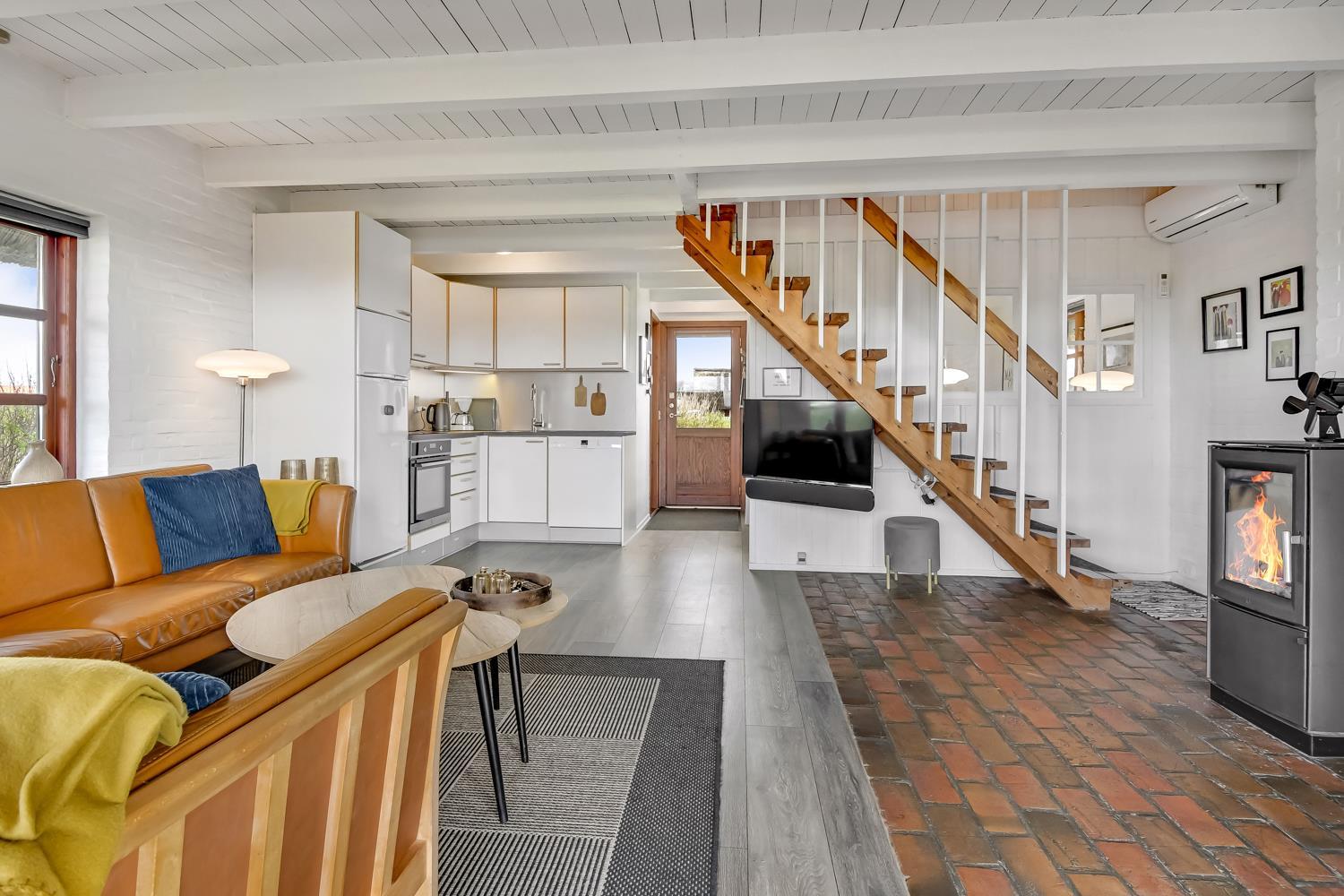 Huset er i to etager med samlingspunktet i huset i stuen, som hænger sammen med køkkenet i et rum. Herfra er der også adgang til overetagen, terrassen og den nordvendte entre. I stuen er der brændeovn, varmepumpe og sofagruppe og smart-TV med danske og tyske programmer samt mulighed for streaming af TV / radio / Apps, så har du en mobiltelefon eller et andet device med kan du streame hvad du nu har abonnement. Her er endvidere også et lille spisestue. Køkkenet byder på glaskeramisk komfur, køle/fryseskab samt opvaskemaskine og mikrobølgeovn. Det sidste rum i den nedre etage er badeværelset som har et toilet, håndvaskv vaskemaskine og og ny smart brusekabine. Tager man trappen op ovenpå er der op hver side et soveværelse. Der er "master-bedroom" mod syd med dobbeltseng, hyggeligt møblement og udgang til den sydvendte balkon. Det andet soveværelse har ligeledes dobbeltseng og hertil en enkeltseng, så her kan man sove 3. Der er opstillet tørretumbler i skuret. Har man el-bil eller en Plug-In hybrid, så er der ved Ladeboks til Type 2 ladestik, der kan lade op til 11 kWh. Ikke ryger hus. Max 1 husdyr tilladt.