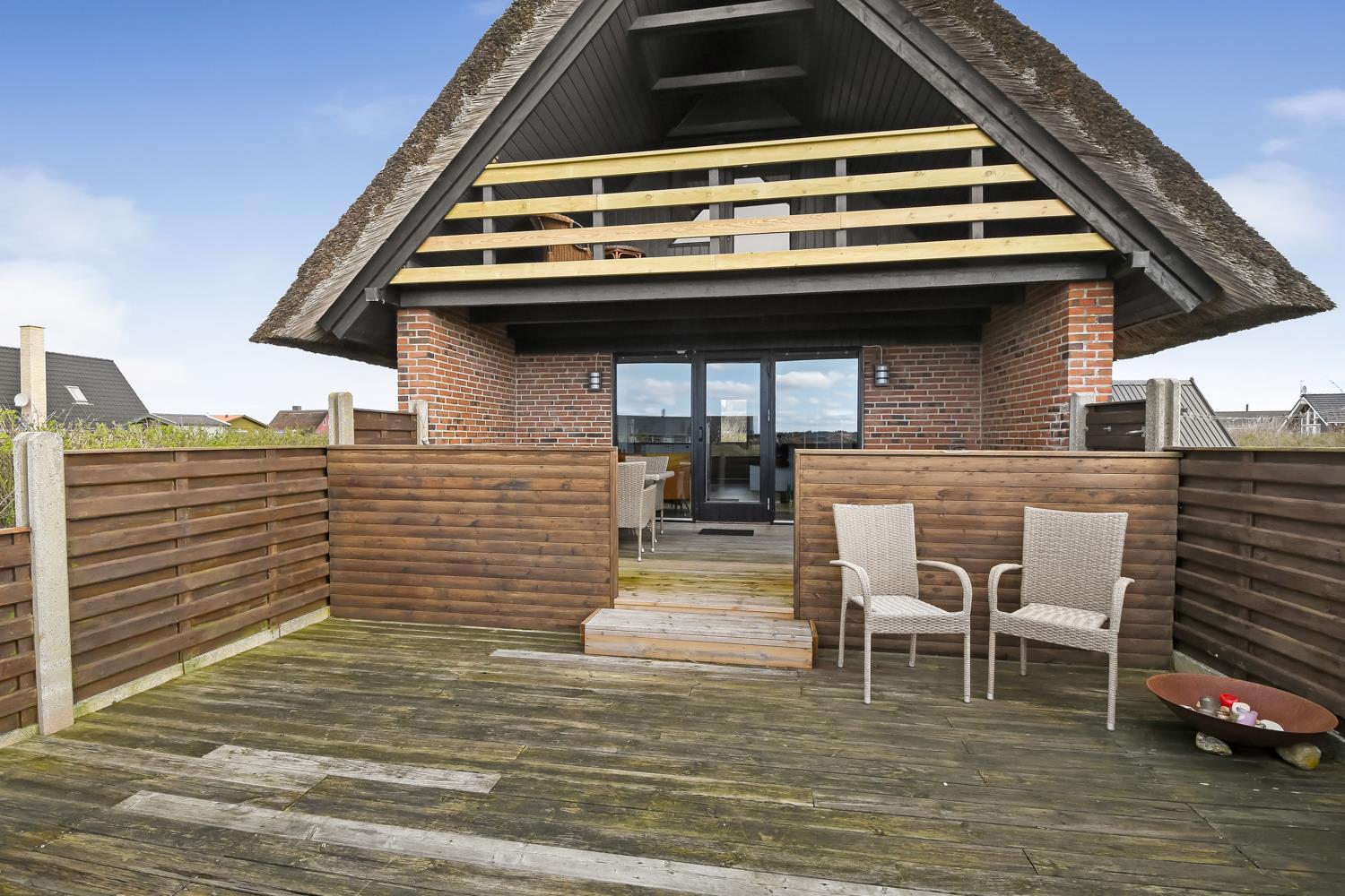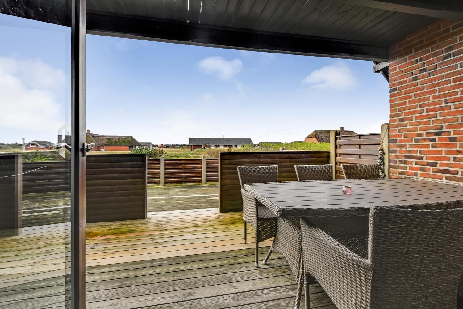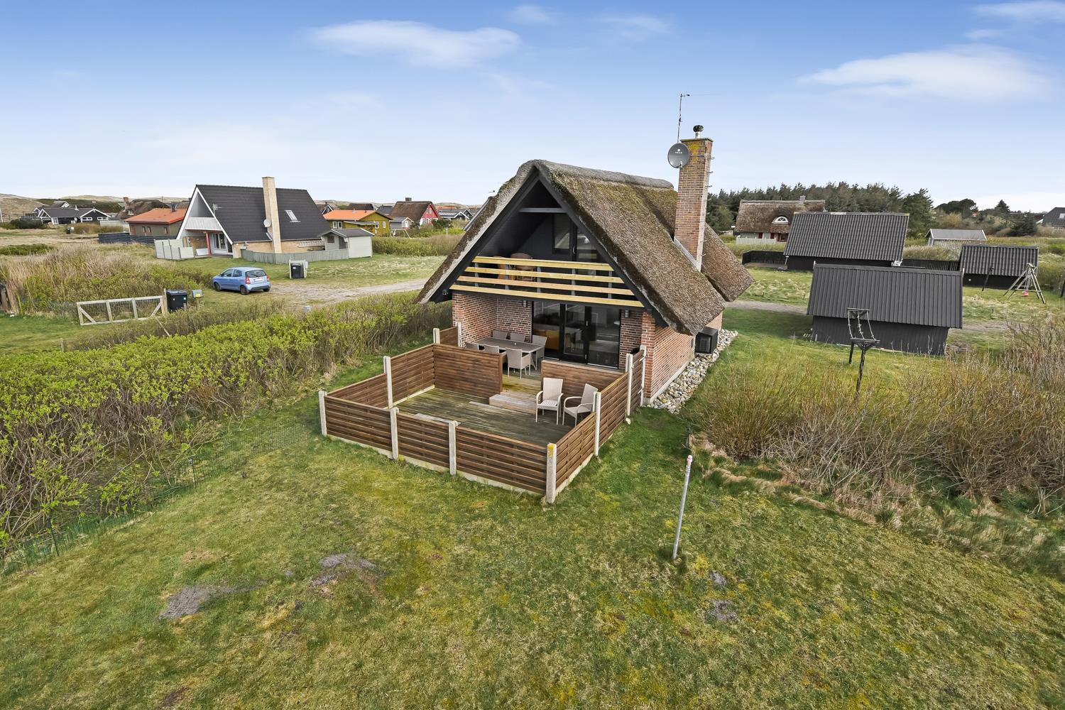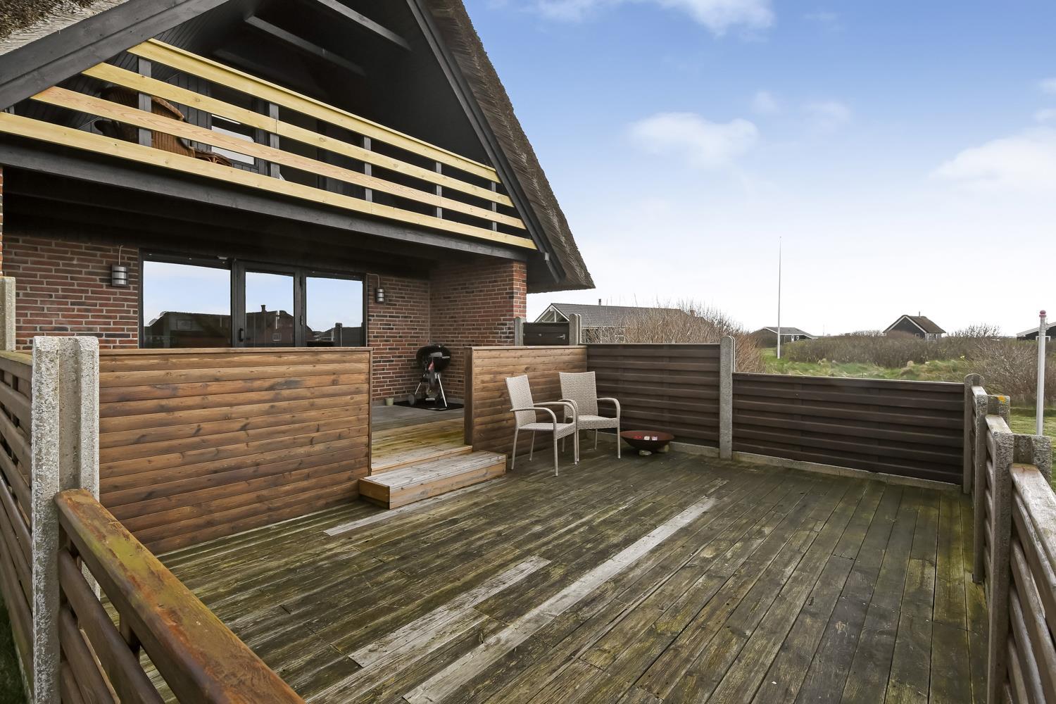 Huset har en forholdvis stor sydvendt terrasse som kan lukkes af. Her er også havemøbler til, så man kan straks benytte de gode dage til sol og frisk luft. Rundt om huset er der også lidt have og på østsiden kan man ofte finde læ på græsplænen, da der både er buske og hus i vejen for den dominerende sydvestvendte vindretning.Det er meget nemt at komme til stranden og man kan følge vejen direkte derop. Her er mange muligheder for rekreation da man kan bade, løbe, vandre, lystfiske, finde rav eller blot sjove sten. Kan man lide at flyve med drage er der absolut gode muligheder her. Vil man ud at se på egnens yderligere attraktioner er der kun 14 km til Thyborøn, som også markerer grænsen mod Nationalpark Thy og 13 km til 800 år gamle handelsby Lemvig.