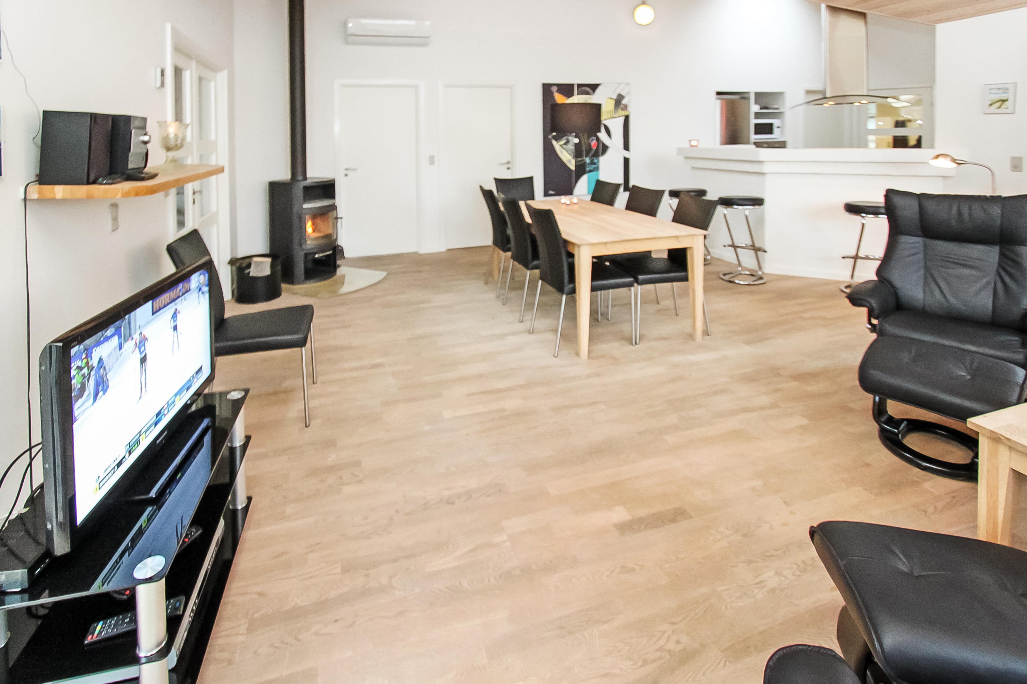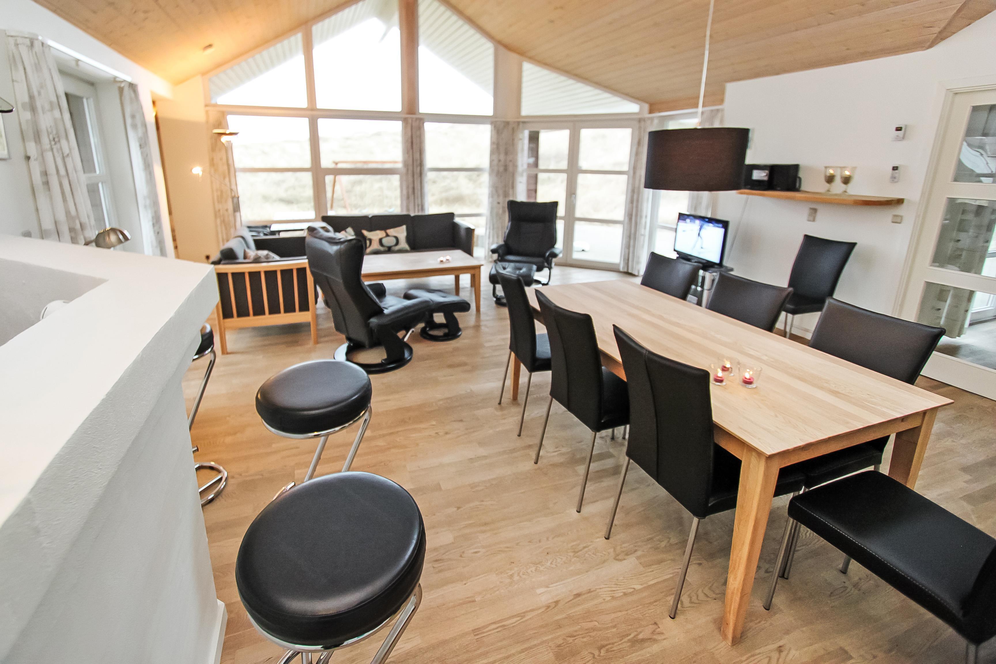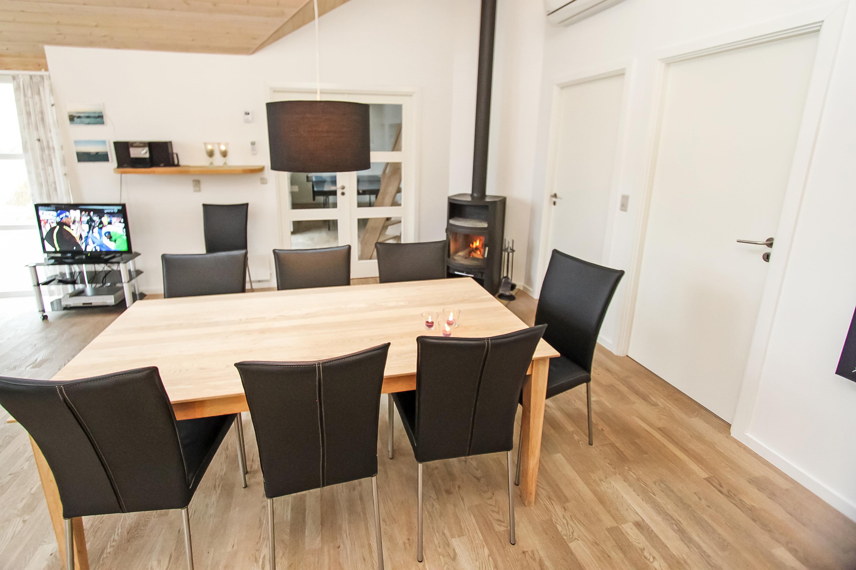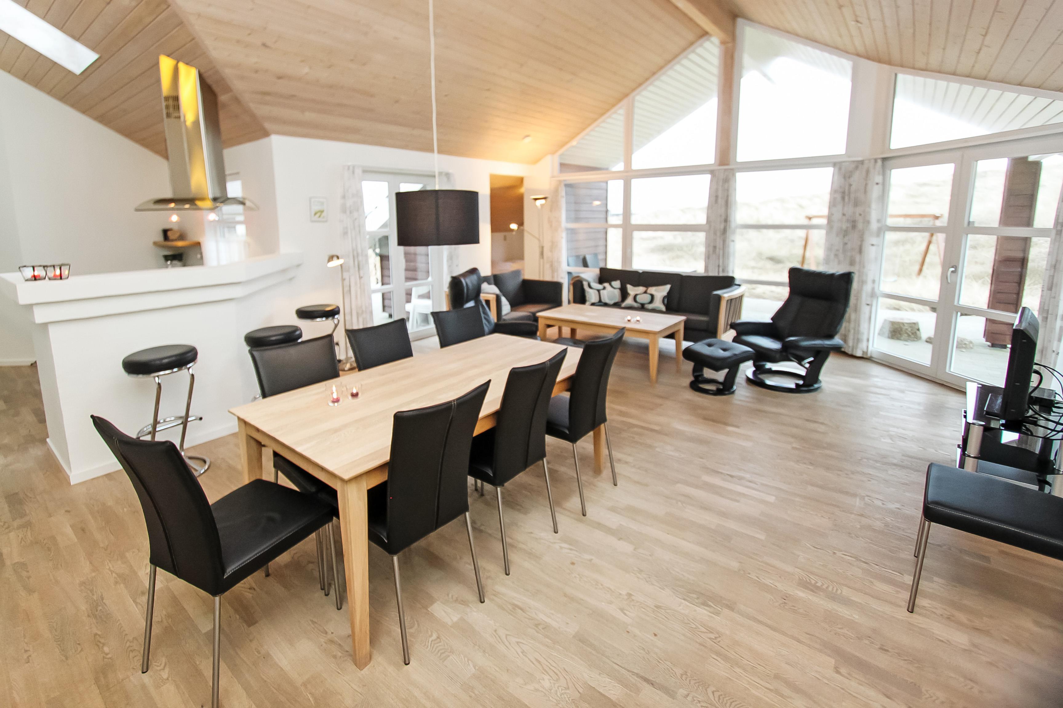 Når bilen er parkeret byder et dejligt hus jer velkommen. Huset er ca. 128 m2 med aktivitetsrum. Huset er velindrettet og har trægulve overalt. 2 badeværelser begge med toilet og håndvask, det ene med 3-personers spabad, bruser og direkte adgang til husets sauna. Det andet er indrettet med bruser. Stort bryggers med vaskemaskine og ekstra håndvask. Køkkenet er udstyret med alle moderne hjælpemidler, såsom mikroovn, opvaskemaskine og 80 l. fryser. Den er kombineret med husets smagfuldt indrettede stue, som er med tv med danske og tyske tv kanaler, DVD-afspiller, brændeovn og varmepumpe sørger for en behagelig varme og en billigere el-regning, og stereo m/CD. 3 rummelige soverum – 2 med dobbeltsenge, 1 med dobbeltseng og 1 seng. Alkove med 2 liggemuligheder. Fra husets aktivitetsrum er der opgang til hems. Aktivitetsrummet indeholder bordtennis og bob. Barnestol til de mindste gæster. Gratis internet. Ikke rygerhus. Husdyr ikke tilladt.