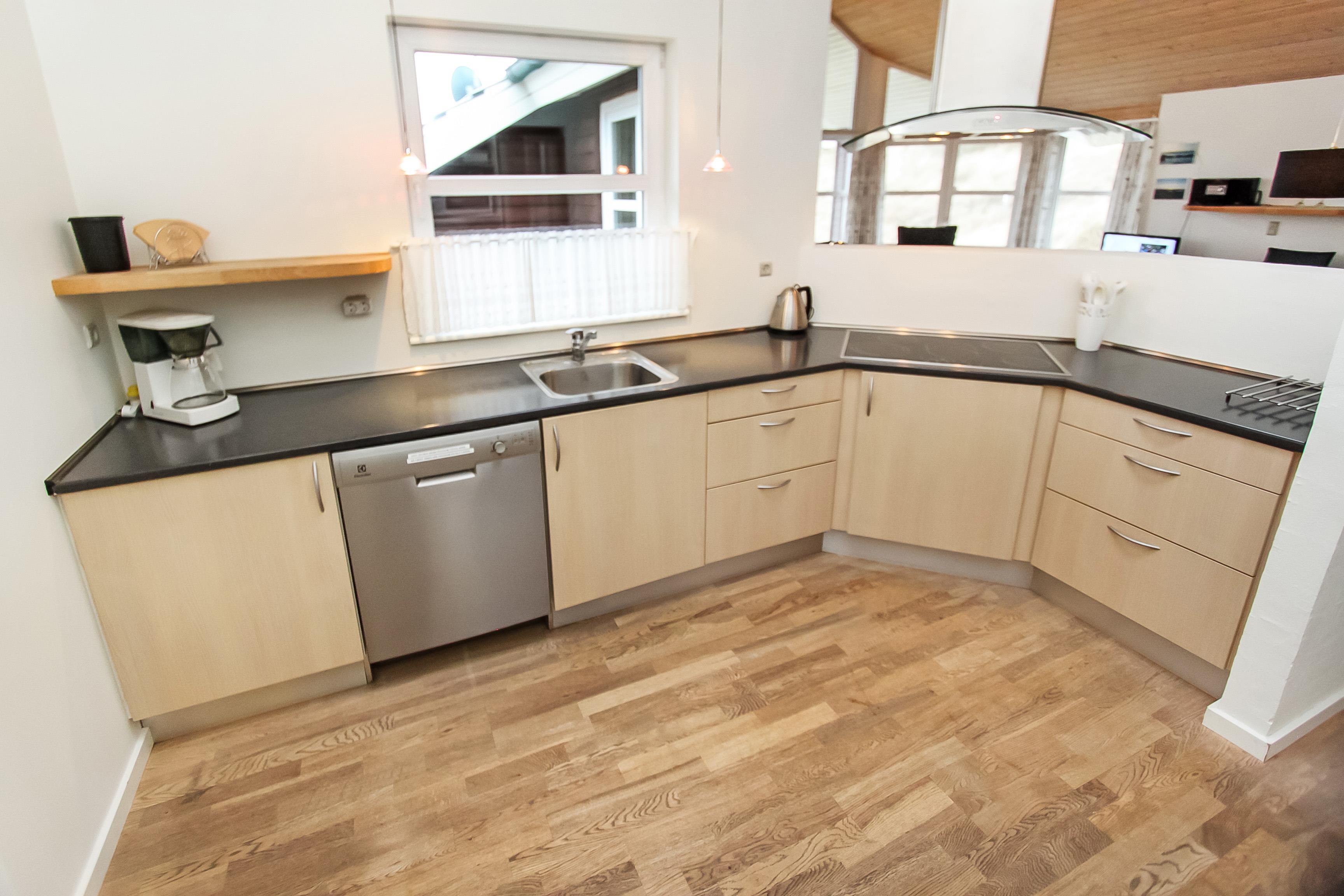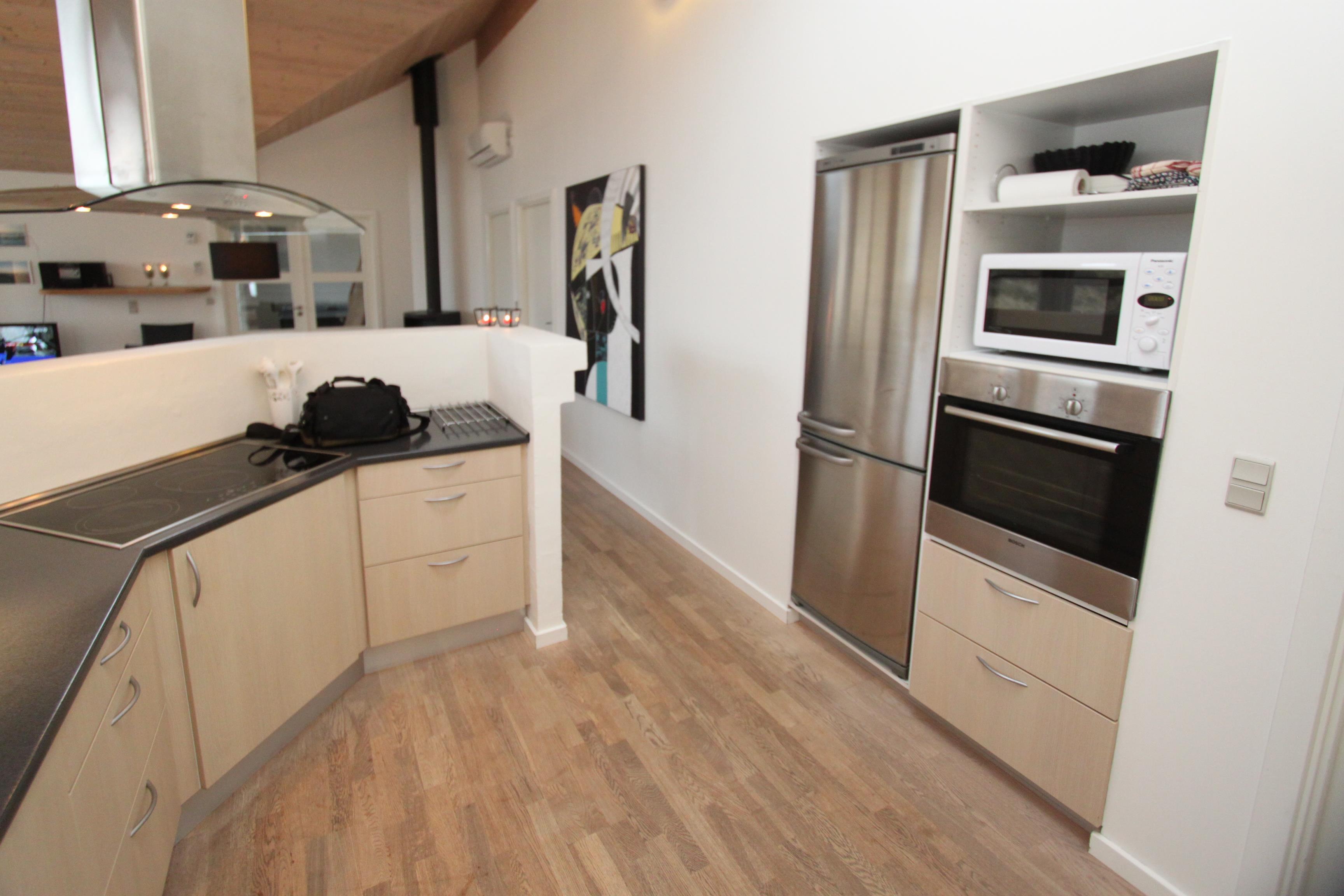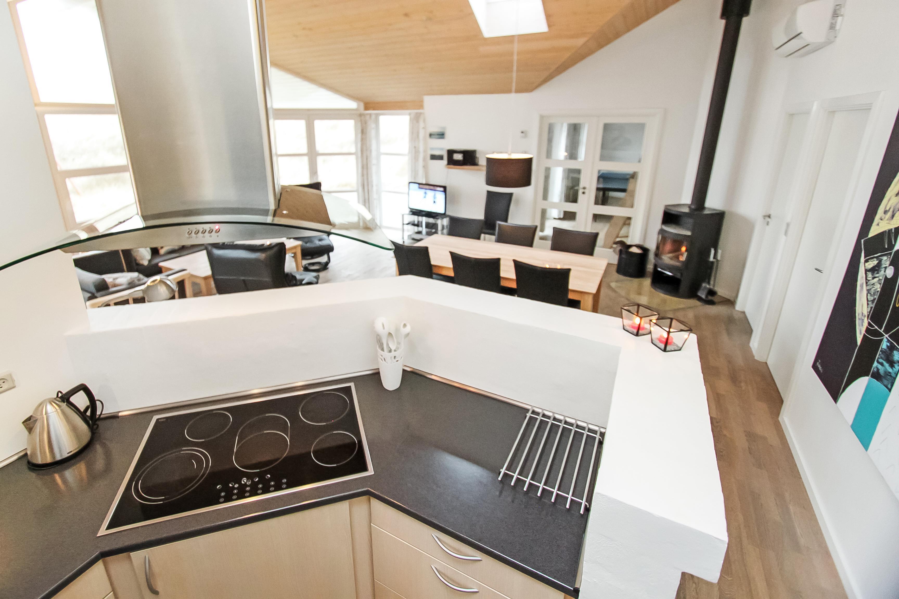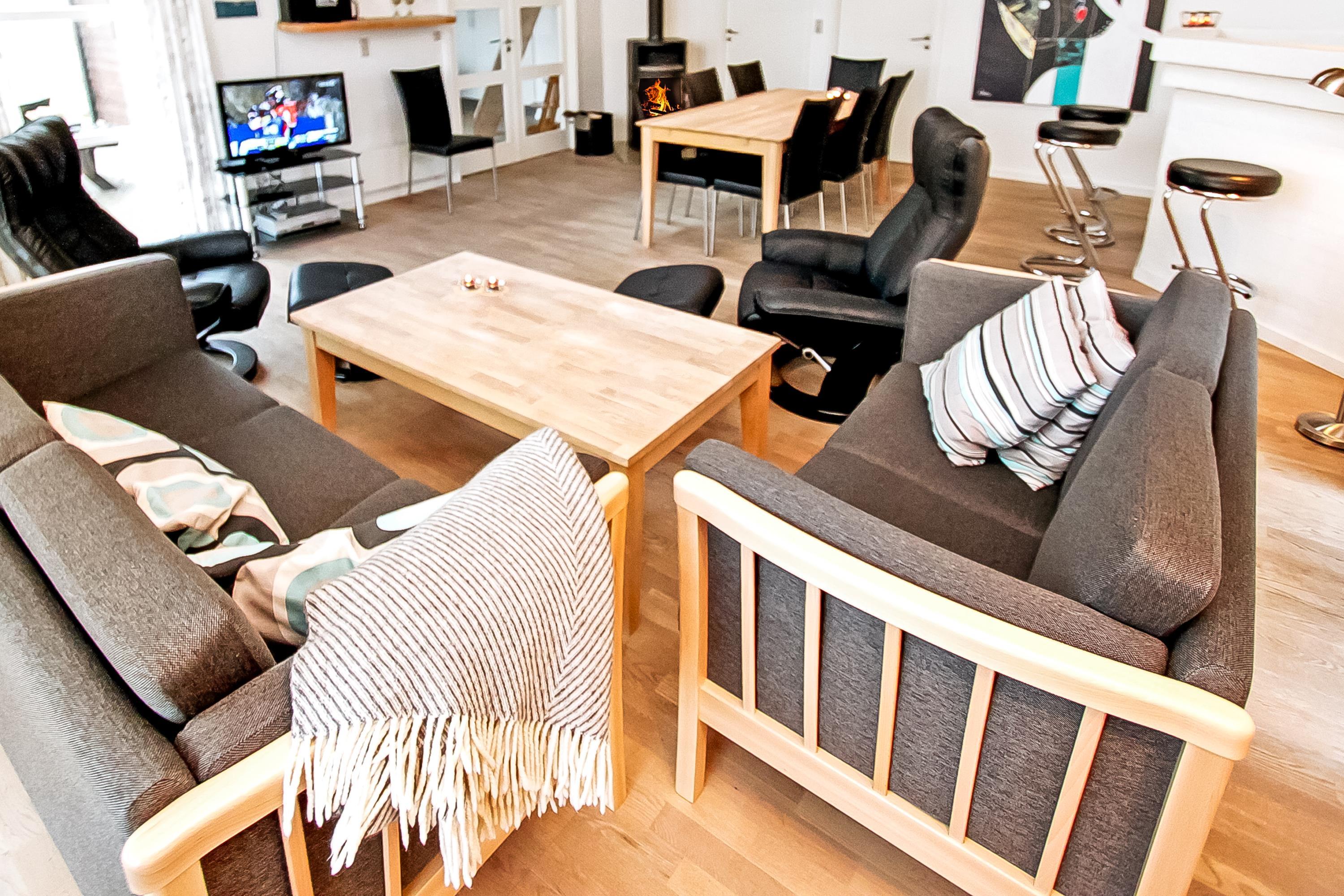 Når bilen er parkeret byder et dejligt hus jer velkommen. Huset er ca. 128 m2 med aktivitetsrum. Huset er velindrettet og har trægulve overalt. 2 badeværelser begge med toilet og håndvask, det ene med 3-personers spabad, bruser og direkte adgang til husets sauna. Det andet er indrettet med bruser. Stort bryggers med vaskemaskine og ekstra håndvask. Køkkenet er udstyret med alle moderne hjælpemidler, såsom mikroovn, opvaskemaskine og 80 l. fryser. Den er kombineret med husets smagfuldt indrettede stue, som er med tv med danske og tyske tv kanaler, DVD-afspiller, brændeovn og varmepumpe sørger for en behagelig varme og en billigere el-regning, og stereo m/CD. 3 rummelige soverum – 2 med dobbeltsenge, 1 med dobbeltseng og 1 seng. Alkove med 2 liggemuligheder. Fra husets aktivitetsrum er der opgang til hems. Aktivitetsrummet indeholder bordtennis og bob. Barnestol til de mindste gæster. Gratis internet. Ikke rygerhus. Husdyr ikke tilladt.