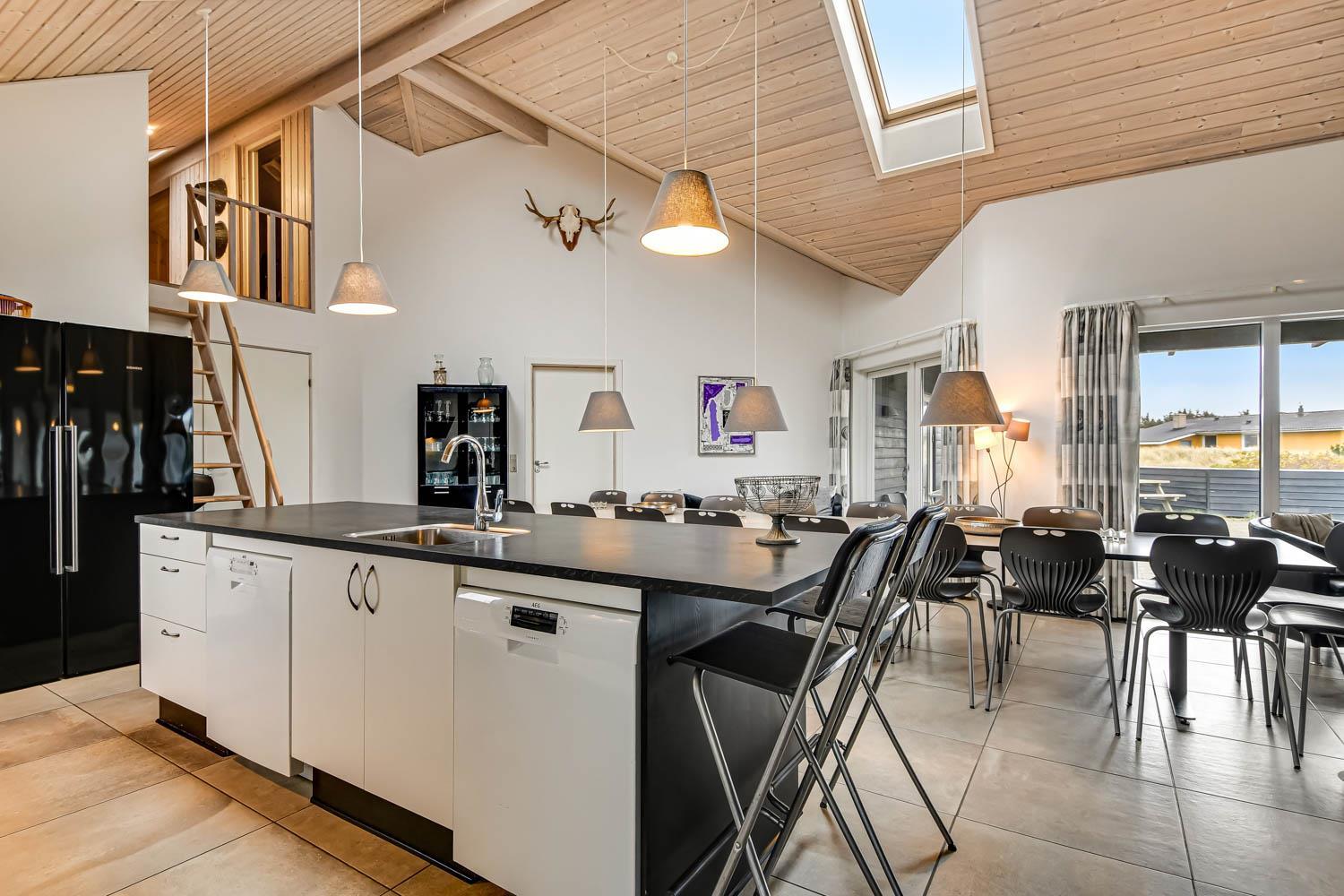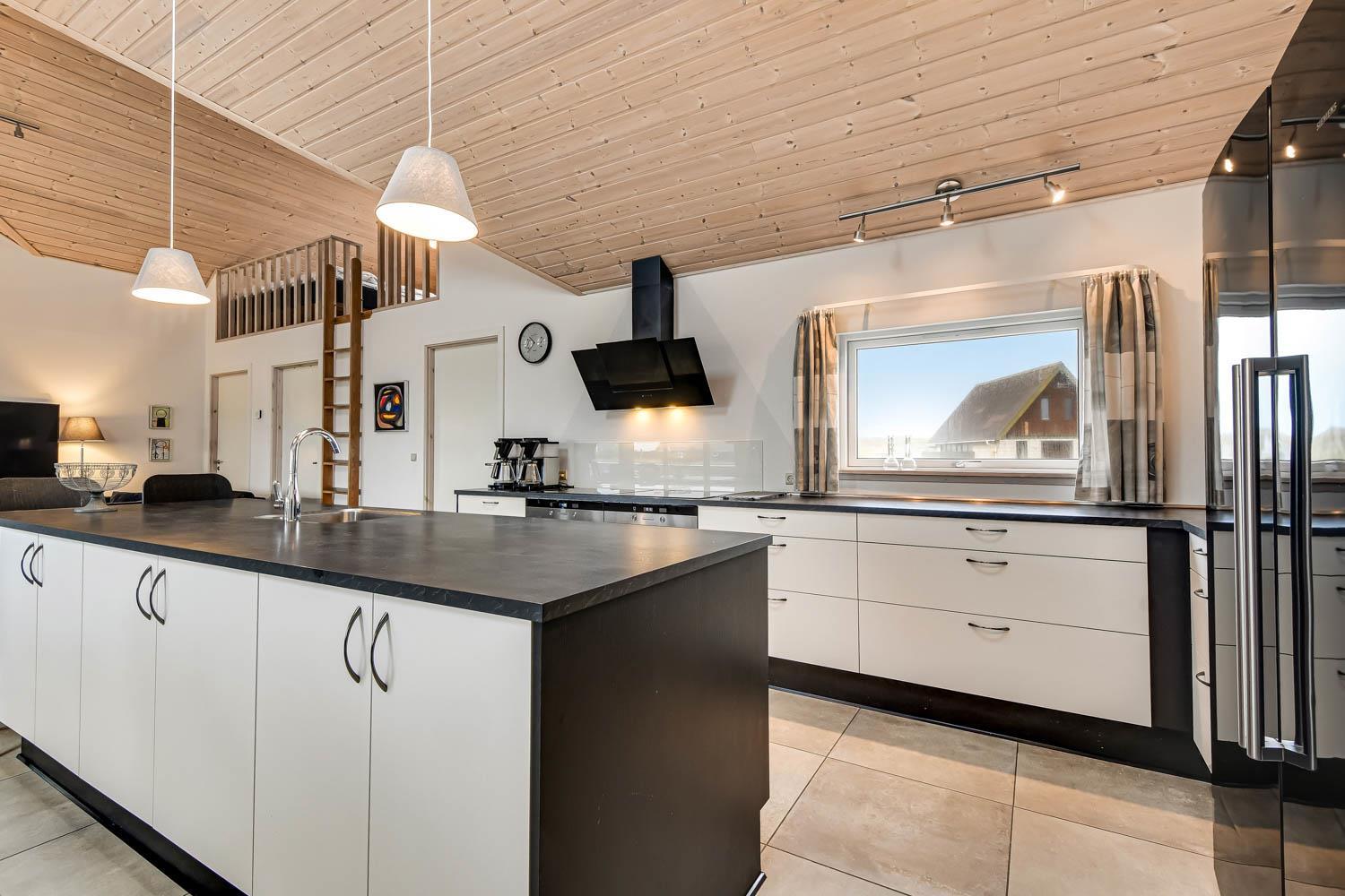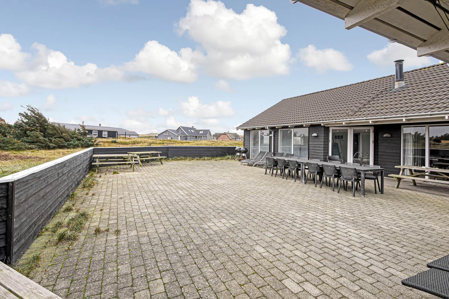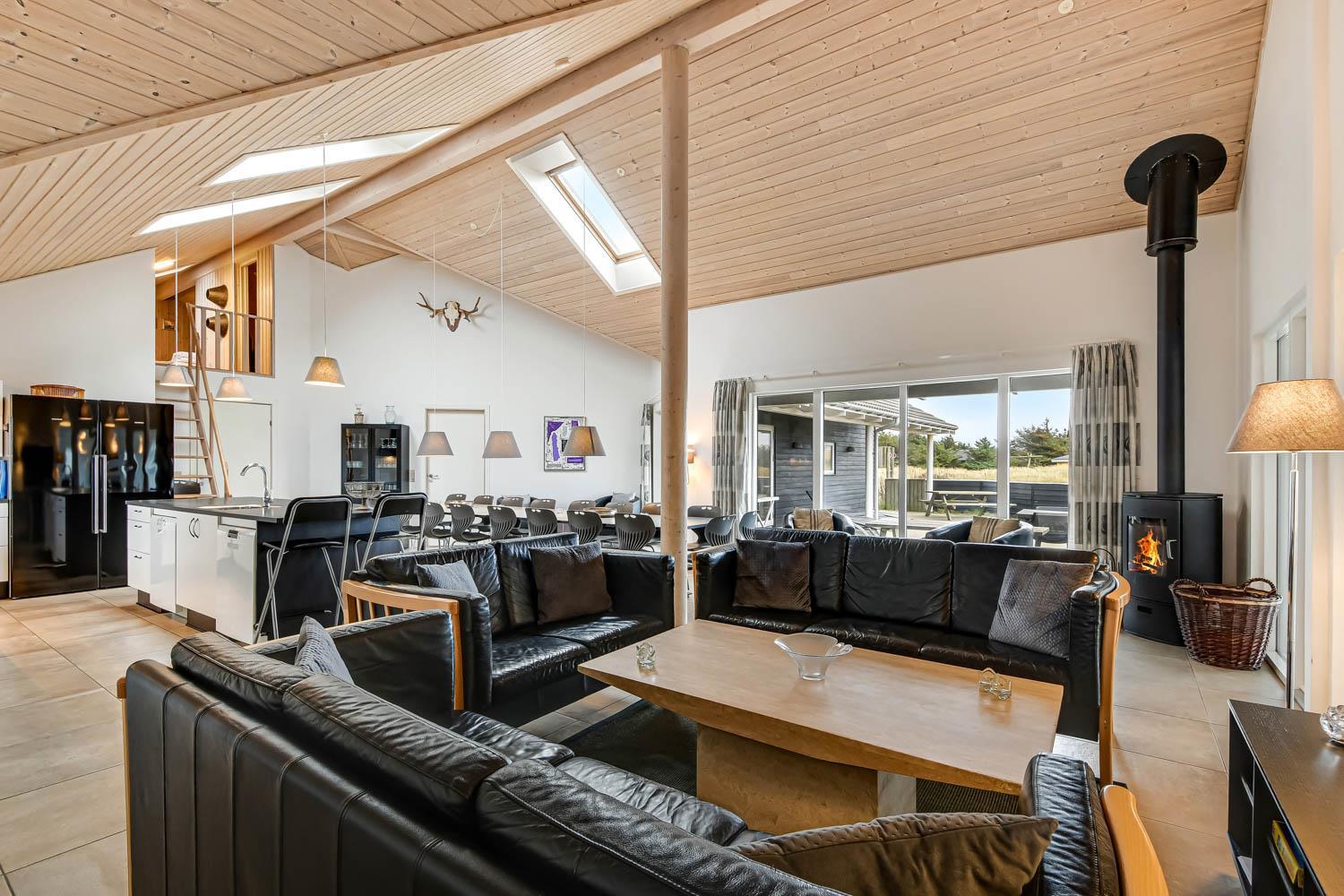 Huset er 320 m2 stort og har 8 dejlige soverum (1DS, 1DS, 1DS, 1DS, 1DS, 2ES, 2ES, 2ES). Derudover forefindes 6 sovemuligheder fordelt på 2 hemse samt en herlig legehems. I hjertet af huset findes en stort, veludstyret køkken / alrum med alt i hårde hvidevarer. 2 elektriske, keramiske kogeplader, 2 indbygningsovne, stor emhætte, opvaskemaskine, mikroovn, stort køleskab og separat stor fryser (250 L). Nyd maden ved det store spisebord, kig ud af vinduet og se de store høje klitter direkte ved Vesterhavet eller slap af i de bløde kvalitetsmøbler. Se TV på dansk og tysk på et af husets 5 fjernsyn. Der er klinker med gulvvarme i opholdsrummene og trægulve i soveværelserne. Skulle det blive for koldt, eller skal stemningen blusses op, sætter man blot gang i husets brændeovn, hvor flammerne og den intensive varme kan nydes.