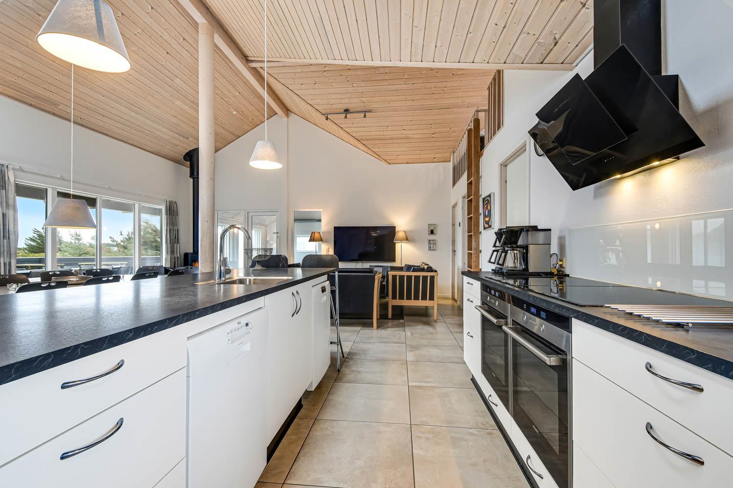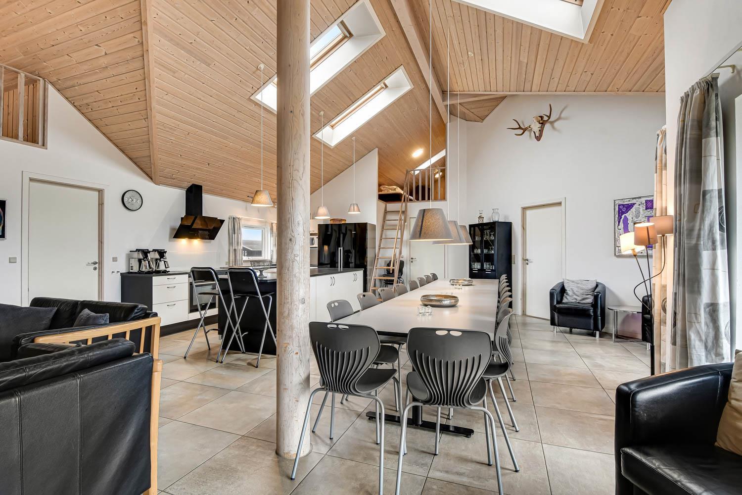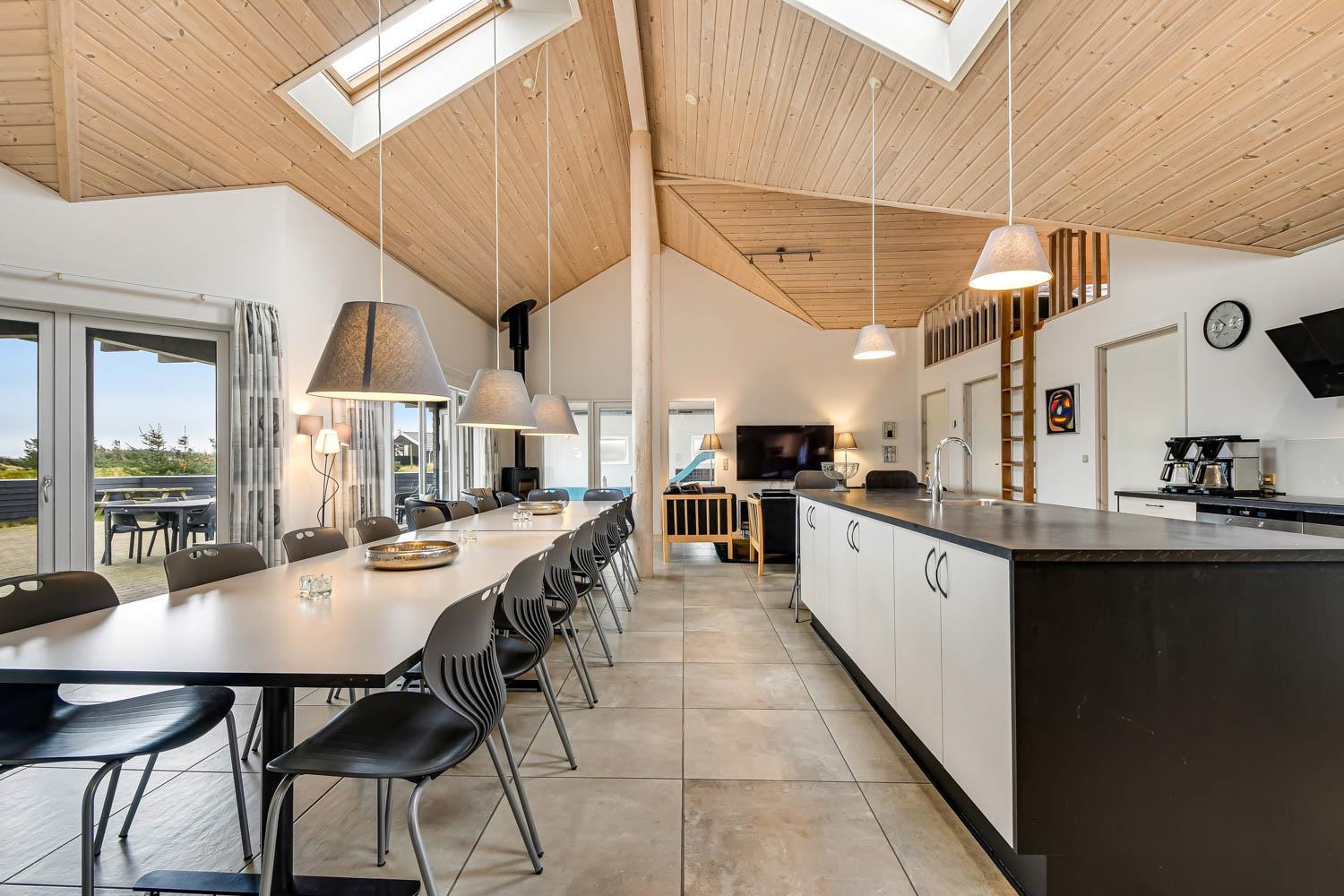 Huset er 320 m2 stort og har 8 dejlige soverum (1DS, 1DS, 1DS, 1DS, 1DS, 2ES, 2ES, 2ES). Derudover forefindes 6 sovemuligheder fordelt på 2 hemse samt en herlig legehems. I hjertet af huset findes en stort, veludstyret køkken / alrum med alt i hårde hvidevarer. 2 elektriske, keramiske kogeplader, 2 indbygningsovne, stor emhætte, opvaskemaskine, mikroovn, stort køleskab og separat stor fryser (250 L). Nyd maden ved det store spisebord, kig ud af vinduet og se de store høje klitter direkte ved Vesterhavet eller slap af i de bløde kvalitetsmøbler. Se TV på dansk og tysk på et af husets 5 fjernsyn. Der er klinker med gulvvarme i opholdsrummene og trægulve i soveværelserne. Skulle det blive for koldt, eller skal stemningen blusses op, sætter man blot gang i husets brændeovn, hvor flammerne og den intensive varme kan nydes.