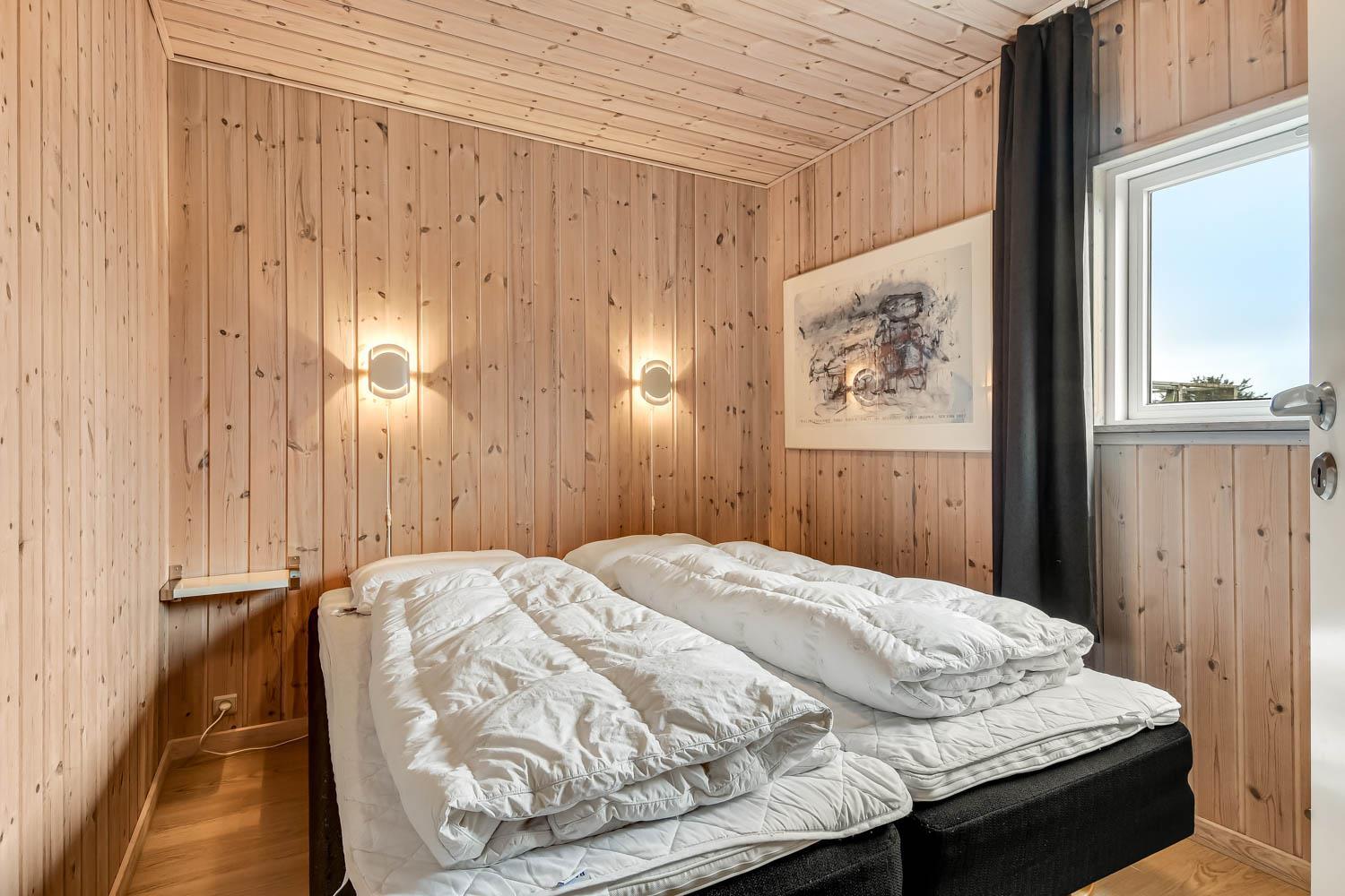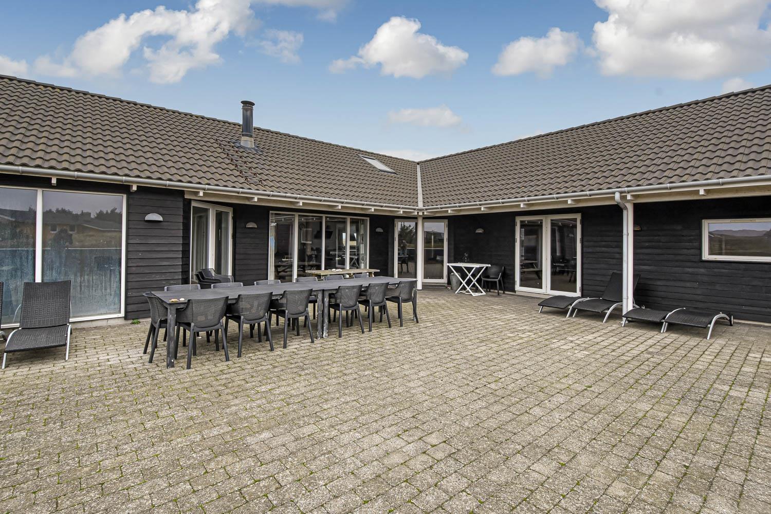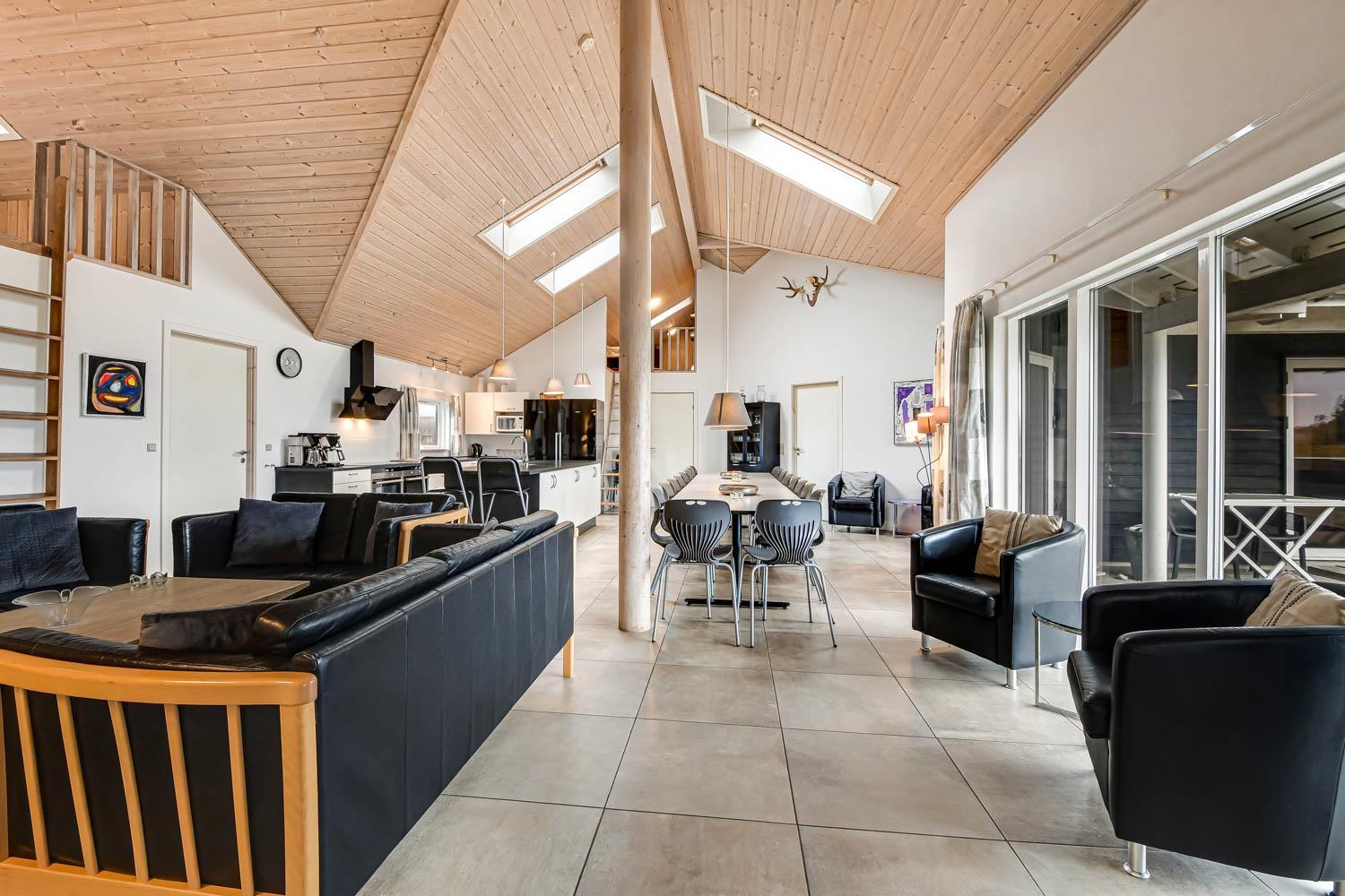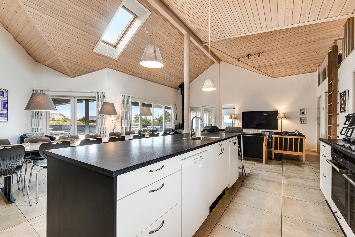Huset er 320 m2 stort og har 8 dejlige soverum (1DS, 1DS, 1DS, 1DS, 1DS, 2ES, 2ES, 2ES). Derudover forefindes 6 sovemuligheder fordelt på 2 hemse samt en herlig legehems. I hjertet af huset findes en stort, veludstyret køkken / alrum med alt i hårde hvidevarer. 2 elektriske, keramiske kogeplader, 2 indbygningsovne, stor emhætte, opvaskemaskine, mikroovn, stort køleskab og separat stor fryser (250 L). Nyd maden ved det store spisebord, kig ud af vinduet og se de store høje klitter direkte ved Vesterhavet eller slap af i de bløde kvalitetsmøbler. Se TV på dansk og tysk på et af husets 5 fjernsyn. Der er klinker med gulvvarme i opholdsrummene og trægulve i soveværelserne. Skulle det blive for koldt, eller skal stemningen blusses op, sætter man blot gang i husets brændeovn, hvor flammerne og den intensive varme kan nydes.