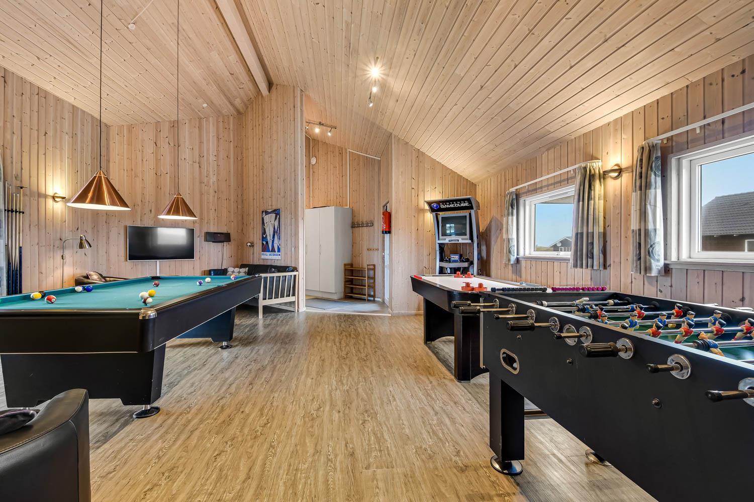 Husets store wellnes poolafdeling rummer også 5-6 pers, spabad og sauna. Poolen er 20 m2 stor og har bl.a. ruschebane og modstrømsanlæg. Aktivitetsrummet indeholder: Bordfodbold, pool/billard, airhockey og TV med spillekonsol (Playstation 3). 4 badeværelser, med toilet, bruser, håndvask samt gulvvarme. Vaskemaskine og tørretumbler er en selvfølge. Til børnene er der 2 barnesenge og 2 barnestole. Max. 2 husdyr er tilladt. Huset lejes ikke ud til ungdomsgrupper. Adgang til Harboøre Centeret. Depositum vintersæson kr. 7000 og sommersæson kr. 3500. Har man el-bil eller en Plug-In hybrid, så er der opsat ladeboks ved huset.