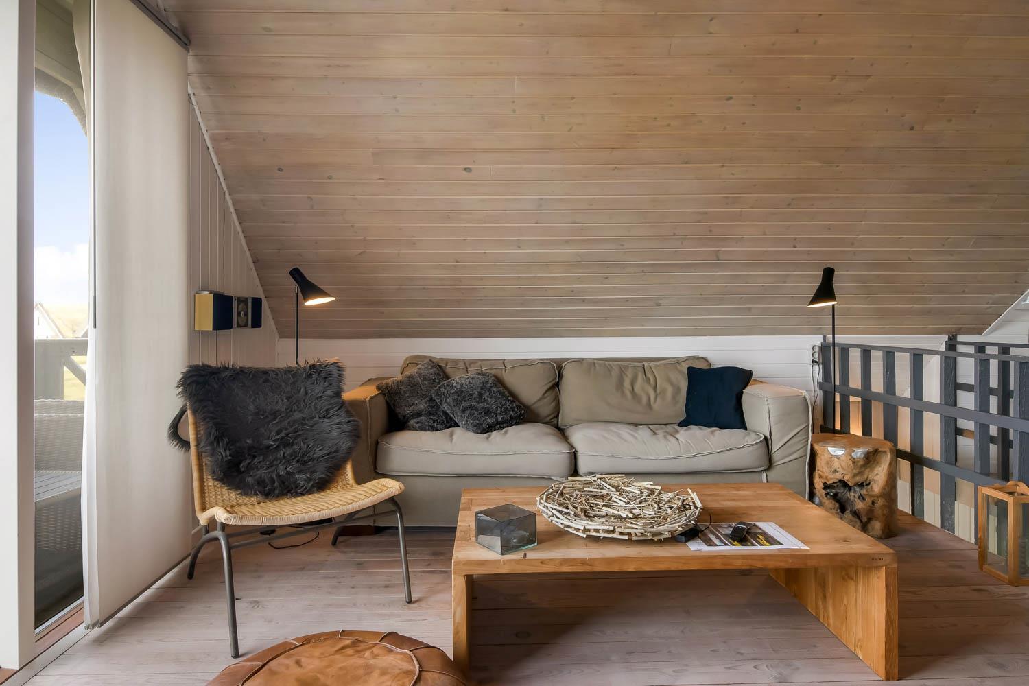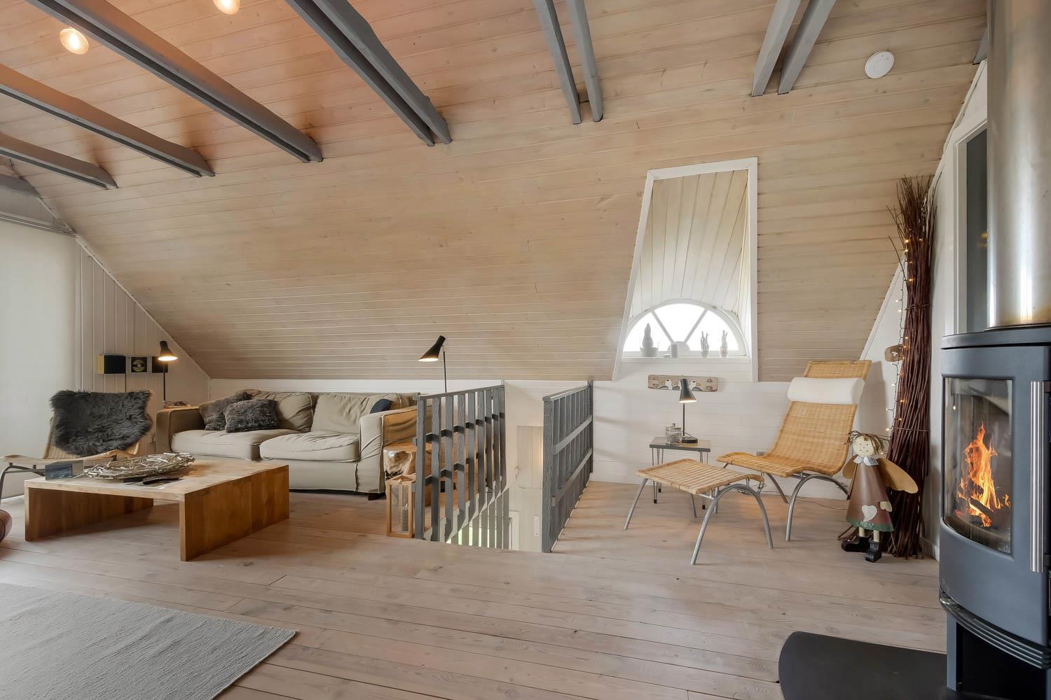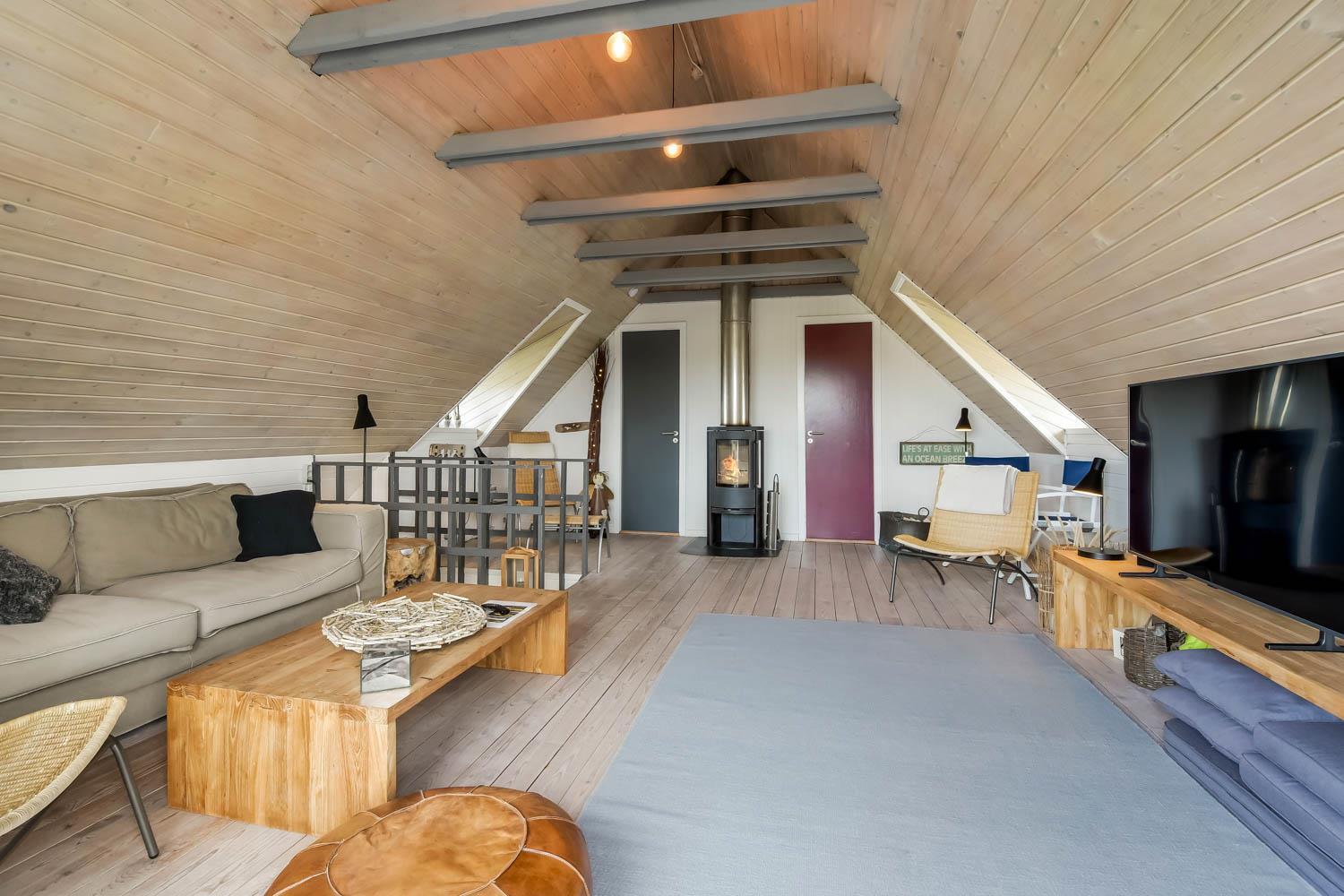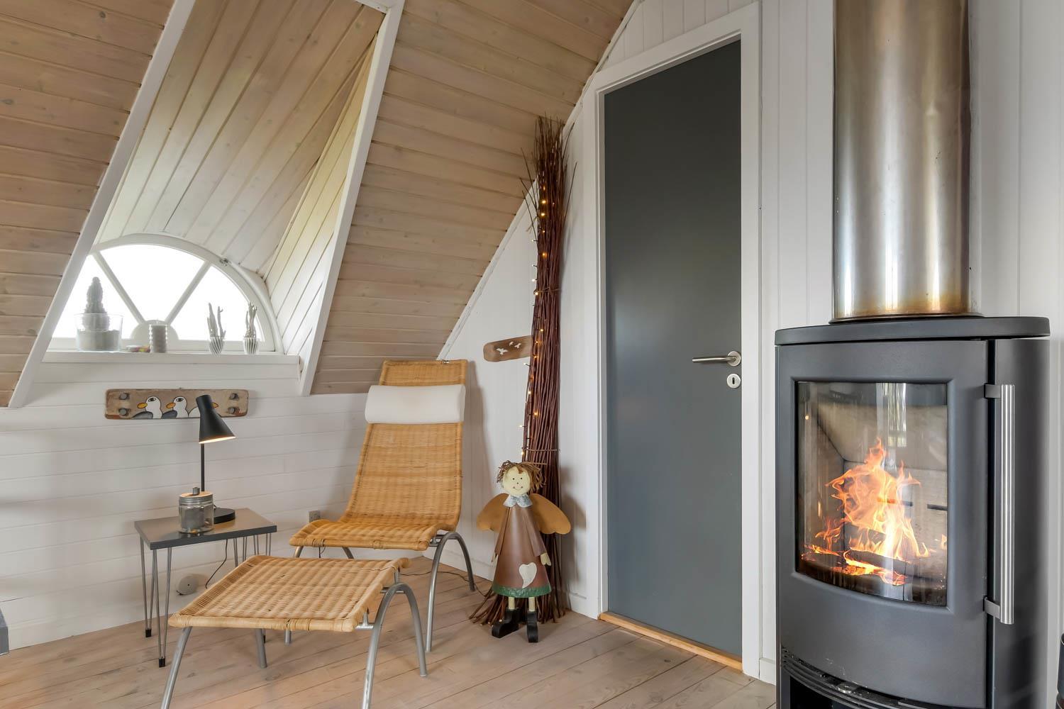 Via den brugervenlige trappe i opholdsstuen kommer I let op på 1. Etage. Her er der endnu et dejligt opholdsrum. FRA ET 55” SMARTTV KAN DER NYDES UNDERHOLDING FRA BLANDT ANDET DANSK TV1 OG TV 2 OG FRA DE UTALLIGE TYSKE OG ANDRE UDENLANDSKE SATELLIT PROGRAMMER. SMARTTV’ET GIVER ENDVIDERE MULIGHED FOR STREAMING AF EGNE ABONNEMENTER AF BLANDT ANDET NETFLIX, HBO OG VIAPLAY. DER ER OGSÅ MULIGHED FOR AT LYTTE TIL MUSIK FRA HUSETS BLUETOOTH-HØJTTALER. Nyd flammerne ved den hyggelige brændeovn som sammen med den opsatte varmepumpe i stueetagen sørger for et minimalt forbrug til opvarmning. Udgang til balkon med unik udsigt til Vesterhavet. På 1. etage findes også 2 af de dejlige soverum (1DS, 1DS)
