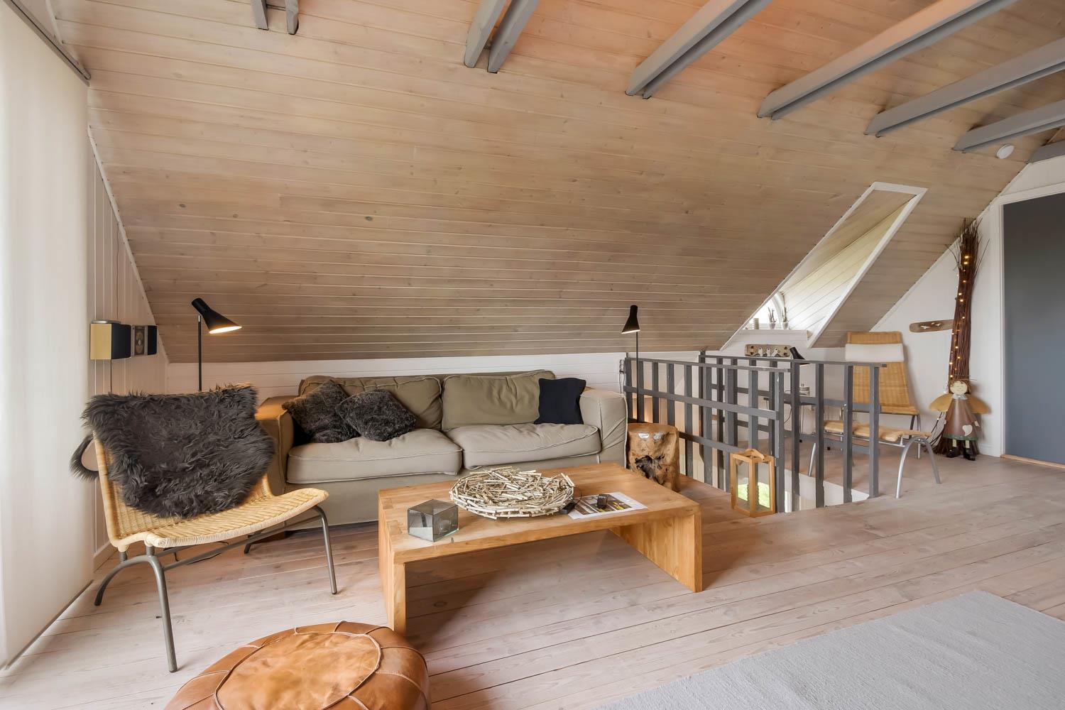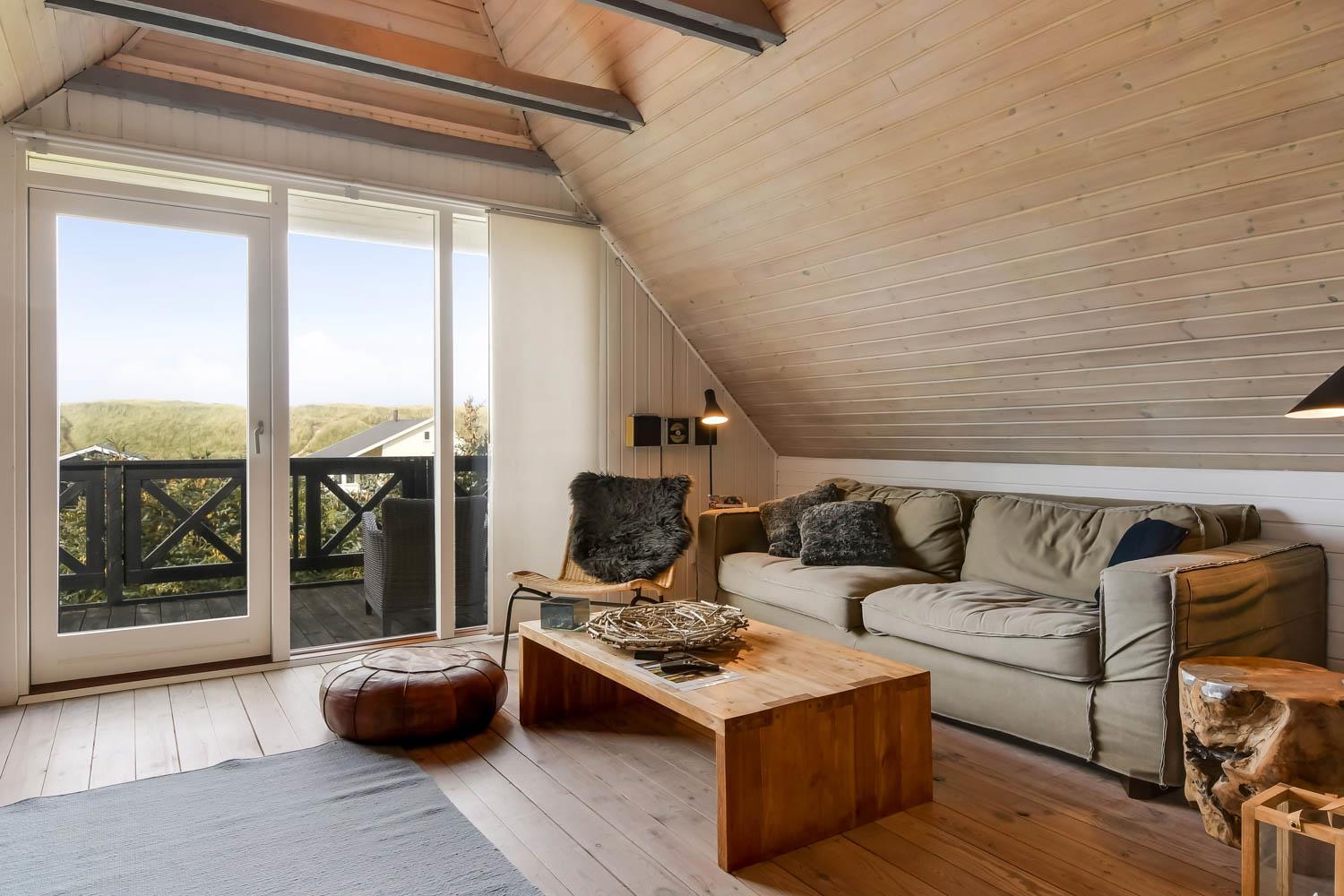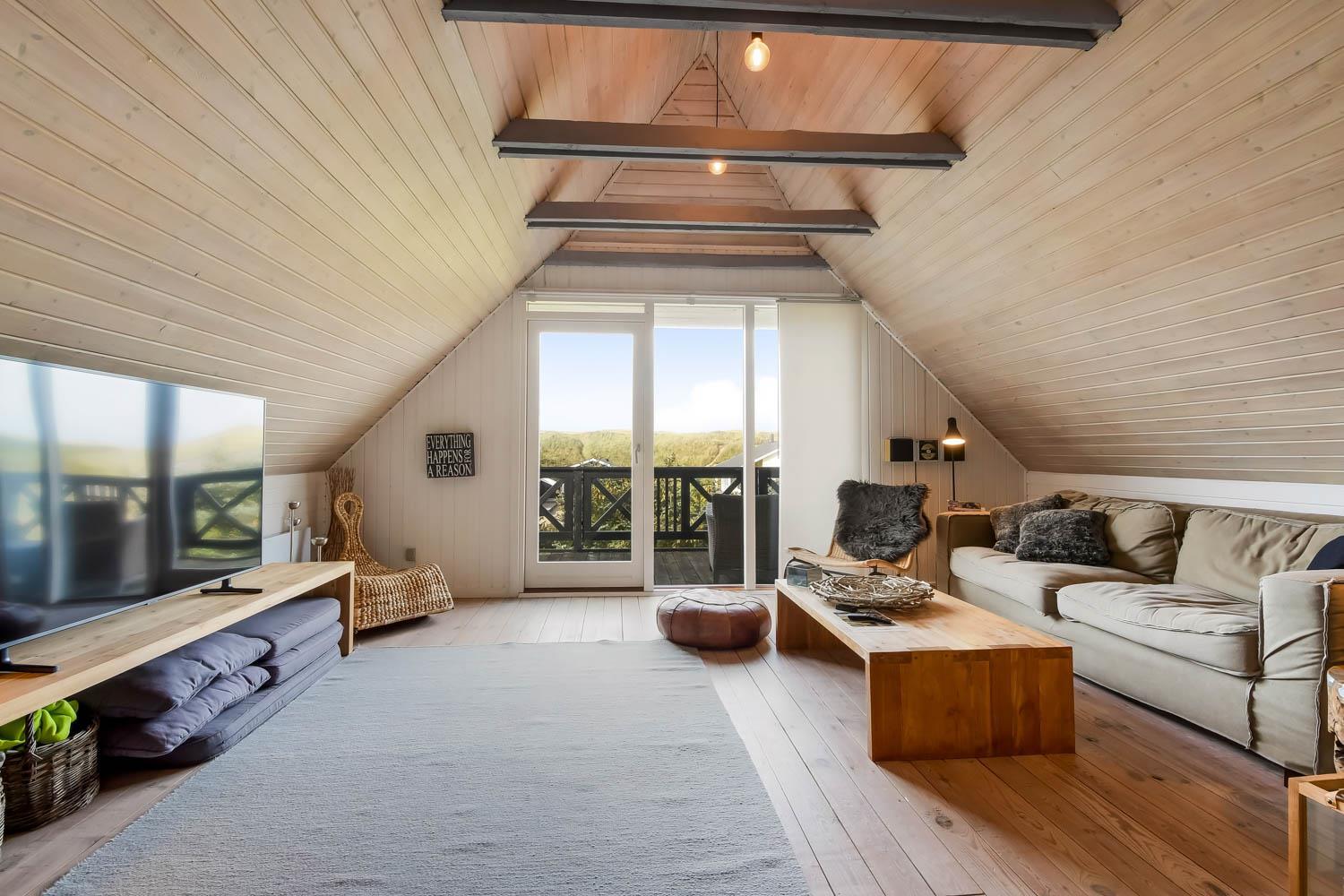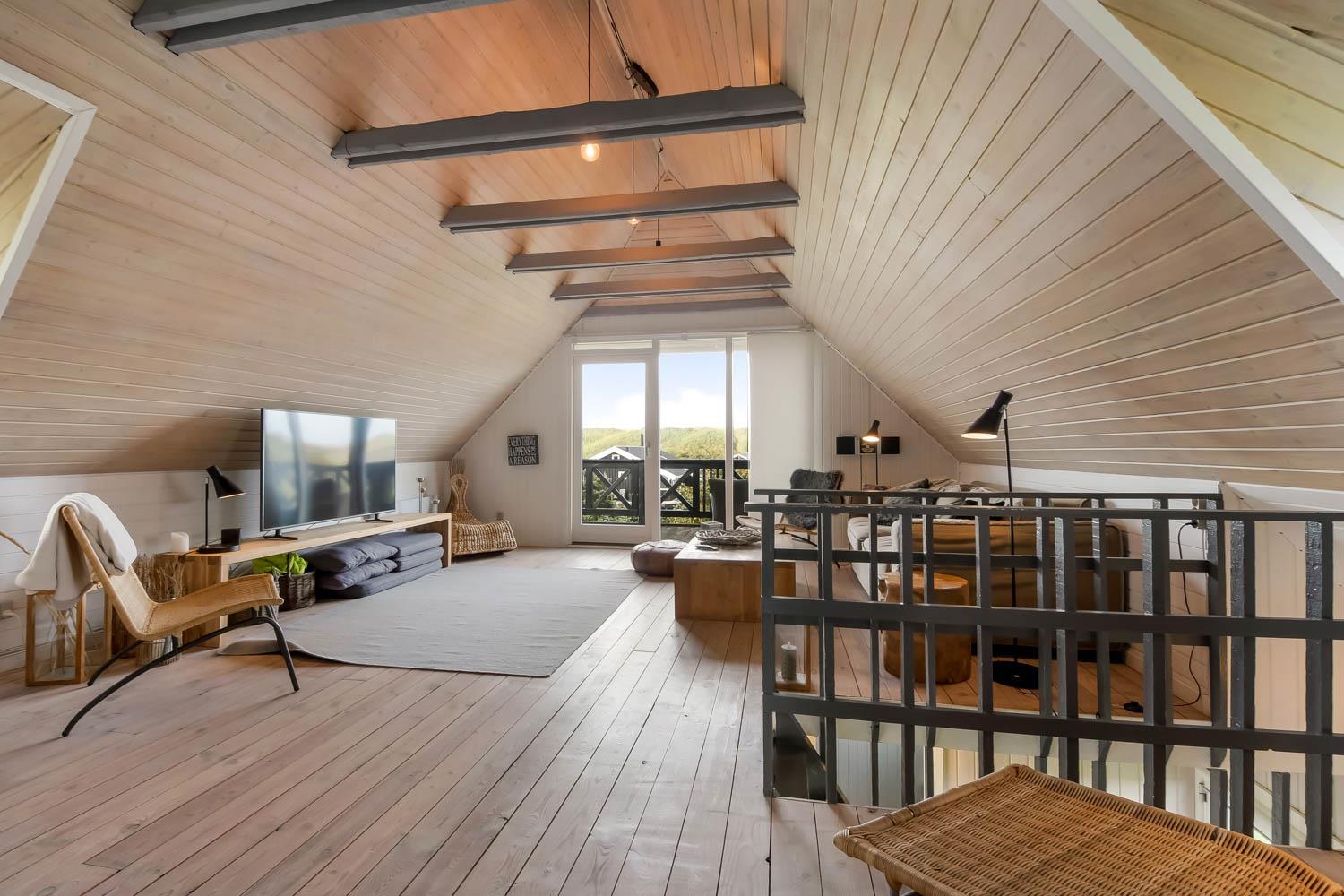 Via den brugervenlige trappe i opholdsstuen kommer I let op på 1. Etage. Her er der endnu et dejligt opholdsrum. FRA ET 55” SMARTTV KAN DER NYDES UNDERHOLDING FRA BLANDT ANDET DANSK TV1 OG TV 2 OG FRA DE UTALLIGE TYSKE OG ANDRE UDENLANDSKE SATELLIT PROGRAMMER. SMARTTV’ET GIVER ENDVIDERE MULIGHED FOR STREAMING AF EGNE ABONNEMENTER AF BLANDT ANDET NETFLIX, HBO OG VIAPLAY. DER ER OGSÅ MULIGHED FOR AT LYTTE TIL MUSIK FRA HUSETS BLUETOOTH-HØJTTALER. Nyd flammerne ved den hyggelige brændeovn som sammen med den opsatte varmepumpe i stueetagen sørger for et minimalt forbrug til opvarmning. Udgang til balkon med unik udsigt til Vesterhavet. På 1. etage findes også 2 af de dejlige soverum (1DS, 1DS)