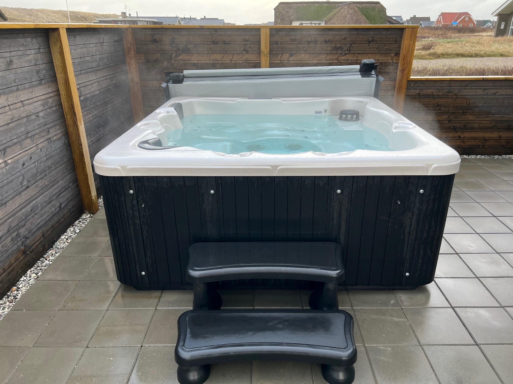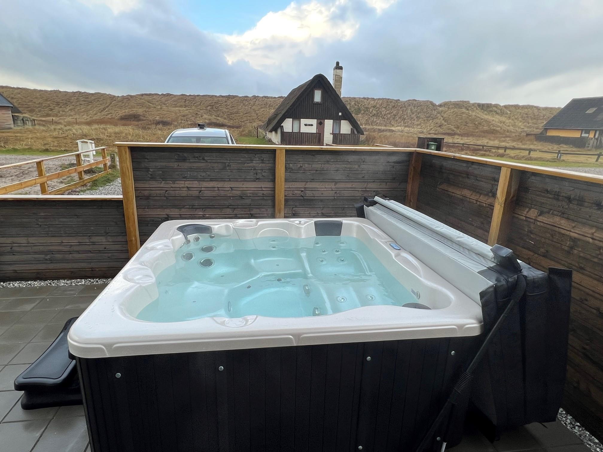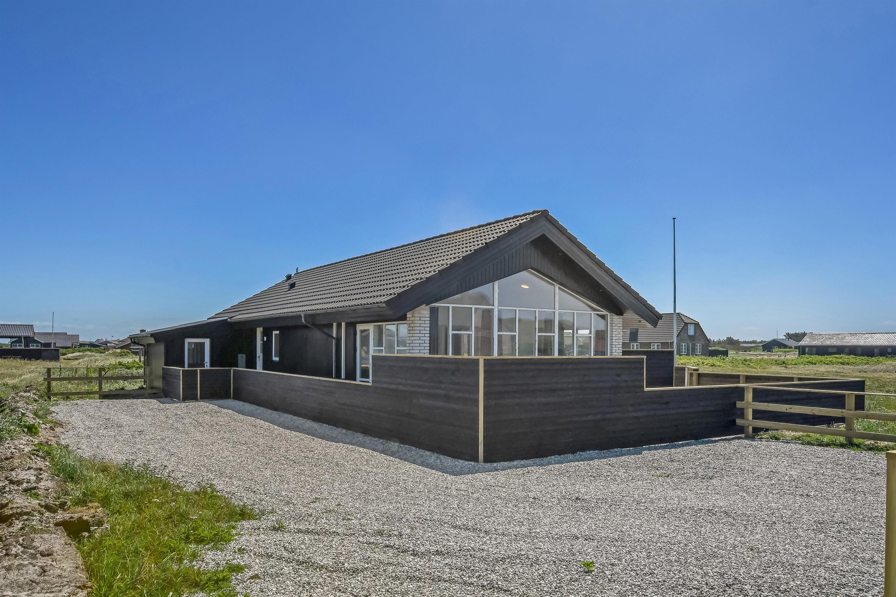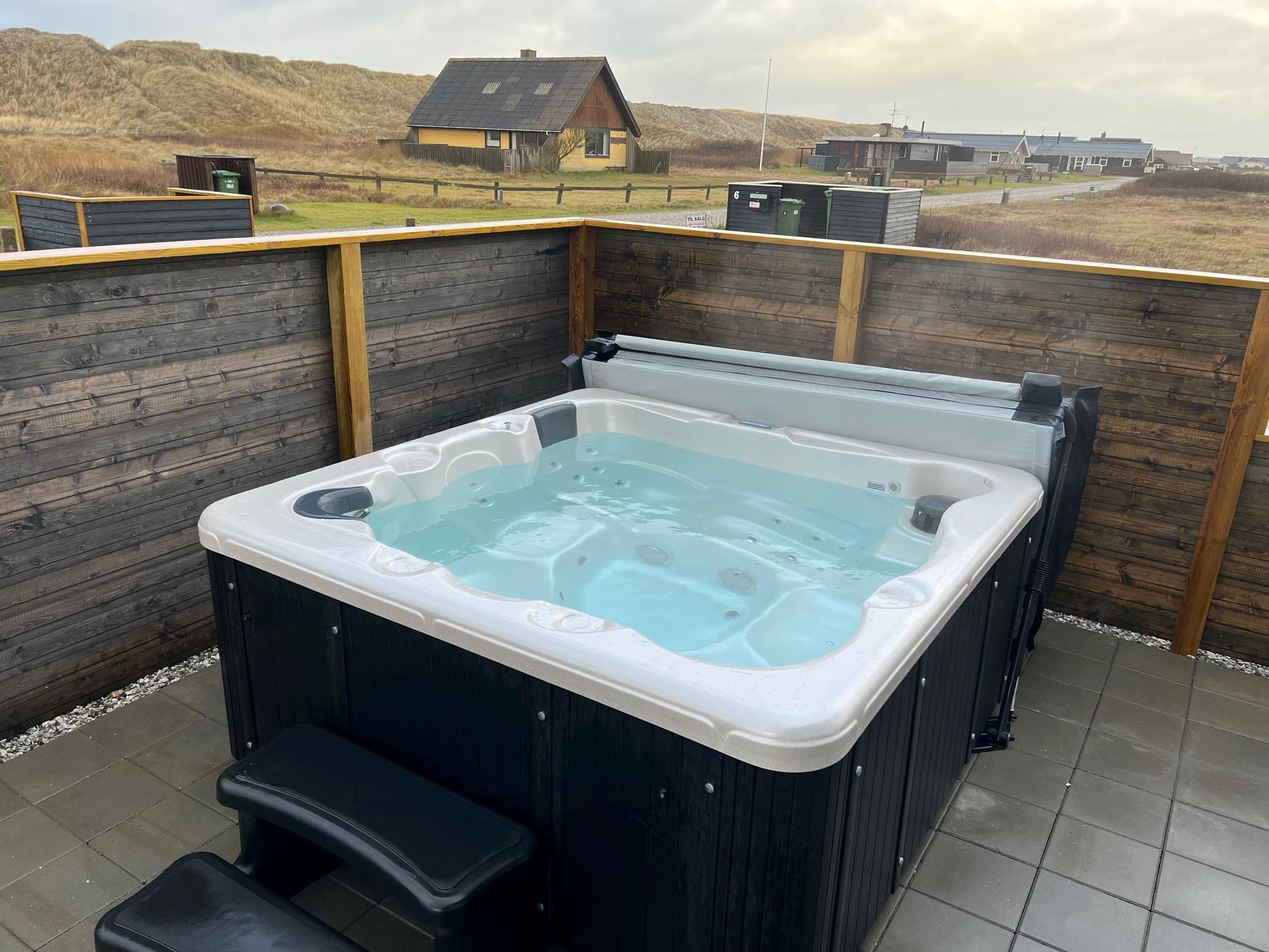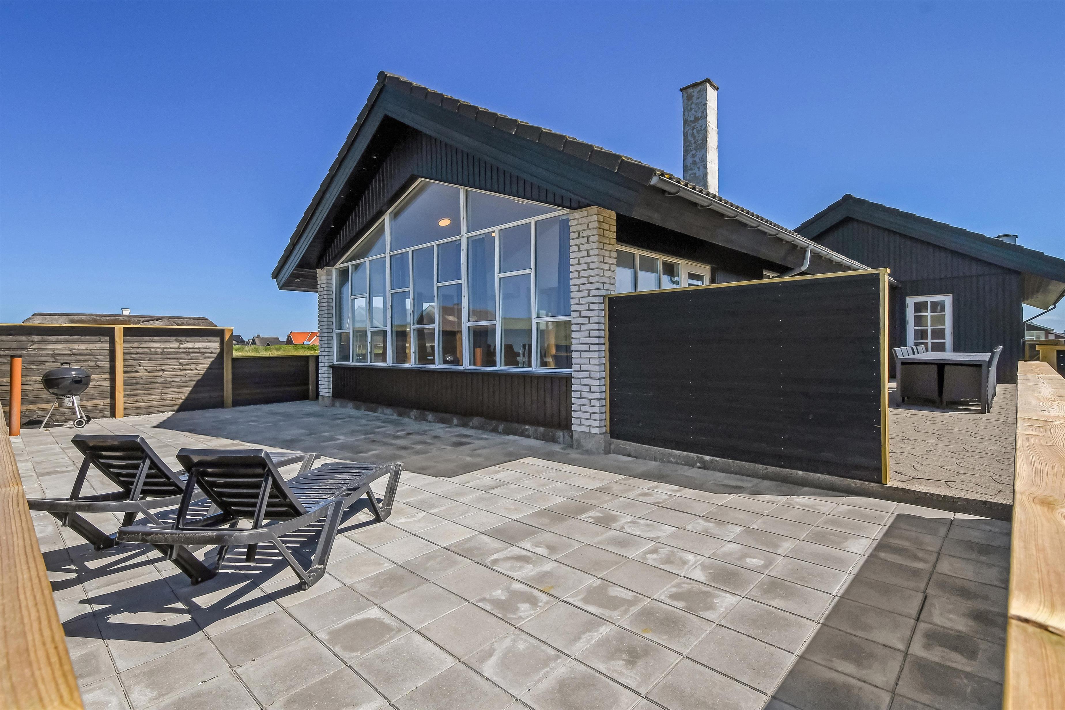 Huset er beliggende på en fantastisk 2500m2 stor naturgrund beliggende i 2. række til det brusende Vesterhav. Fra aktivitetsrummet samt fra stuen og spisestuen er der direkte adgang til husets 130m2 store flisebelagte terrasse. Terrassen er ligeledes lukket med en stakit højde på cirka 1 meter. Helt speciel oplevelse at sidde i den udendørs spa på de mørke aftener med den klare stjernehimmel, ren terapi for sjæl og krop eller måske en frisk dukkert i Vesterhavet som er lige på den ande side af klitterne. Der er 2 km til indkøb samt aktiviteter i Harboøre Hallen.