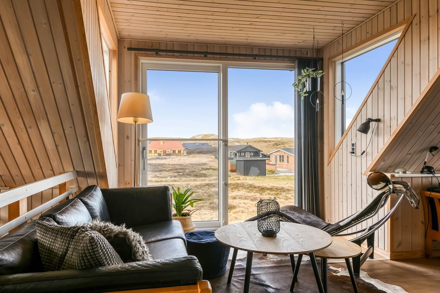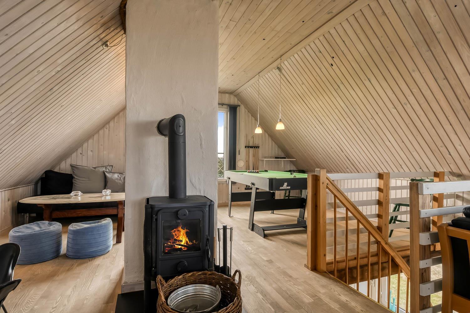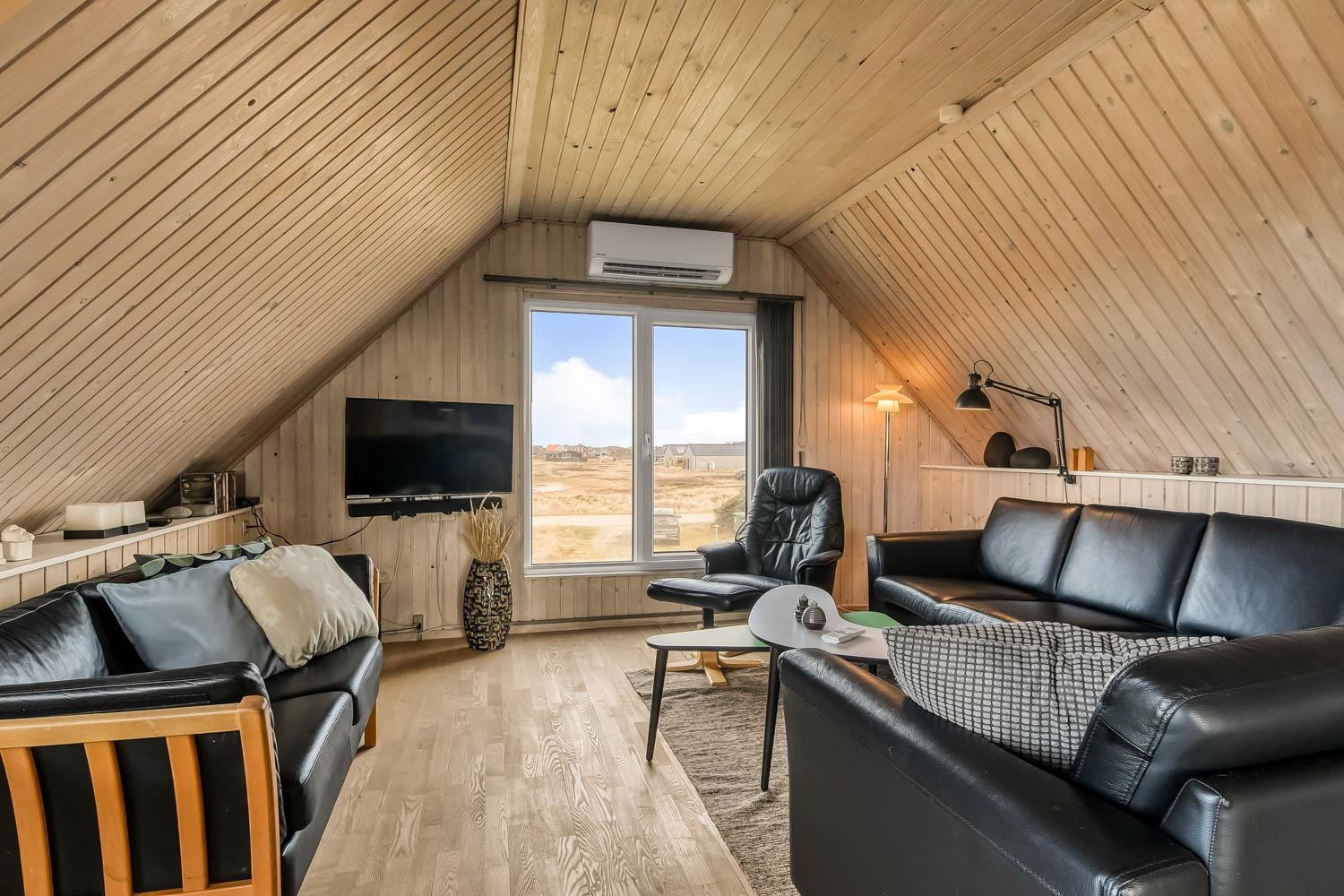 Via trappen for enden af opholdsstuen kommer I op på 1. etage. Her er der en dejlig stor stue med en fantastisk kanap med udsigt til klitterne ved Vesterhavet og over landskabet. Nyd at de dejlige møbler i kanappen sammen med udsigten til en skøn solnedgang. Derudover indrettet med nye moderne lædermøbler, lille brændeovn, varmepumpe, fladskærms-TV med danske og tyske kanaler samt en Chromecast. Der forefindes også et aktivitets område med Pool bord og sofagruppe velegnet til brætspil. Sidst med ikke mindst er det et dejlig stort soveværelse (1DS + 1S) samt et skrivebord med computerskærm (HDMI) hvis der skulle blive behov for hjemmearbejde.