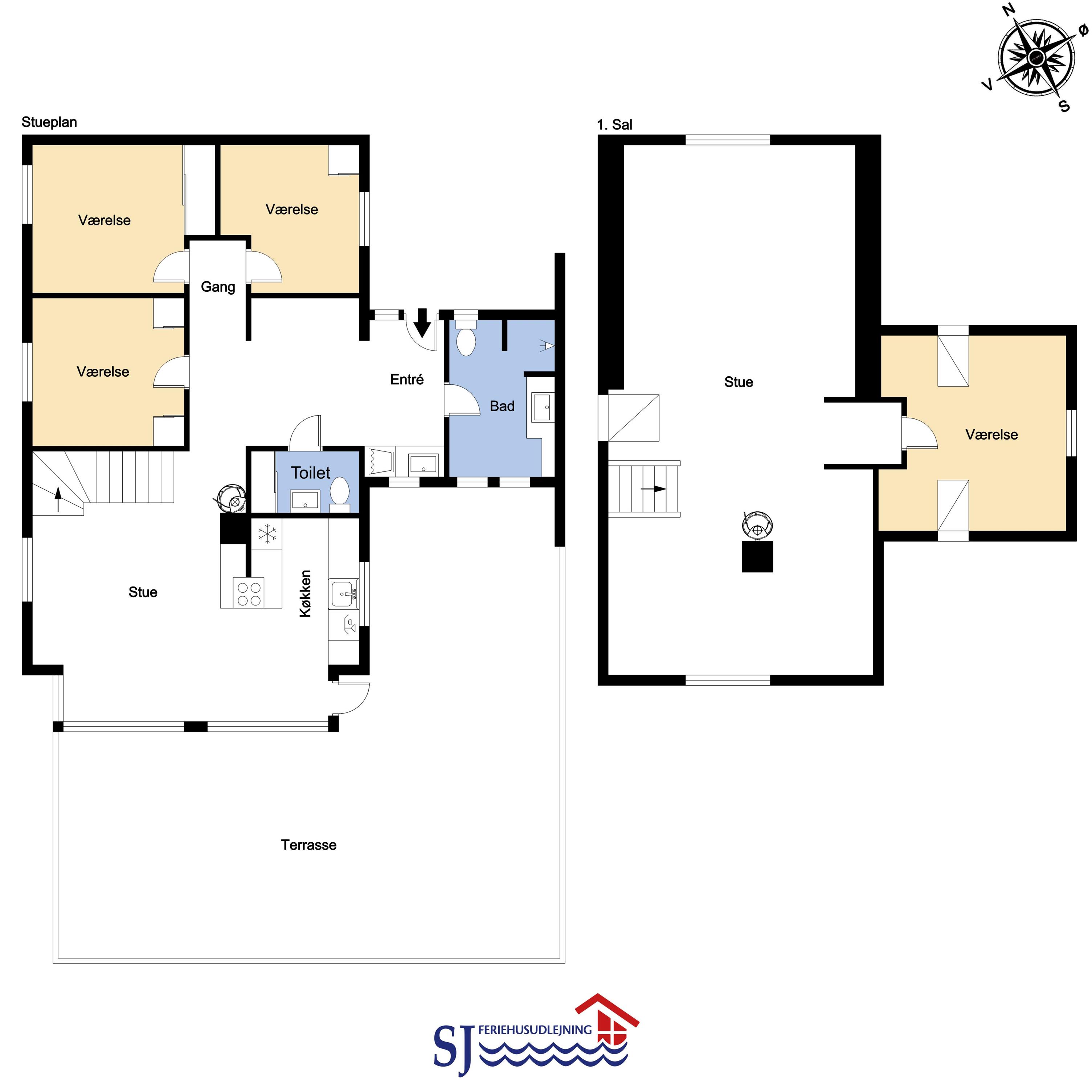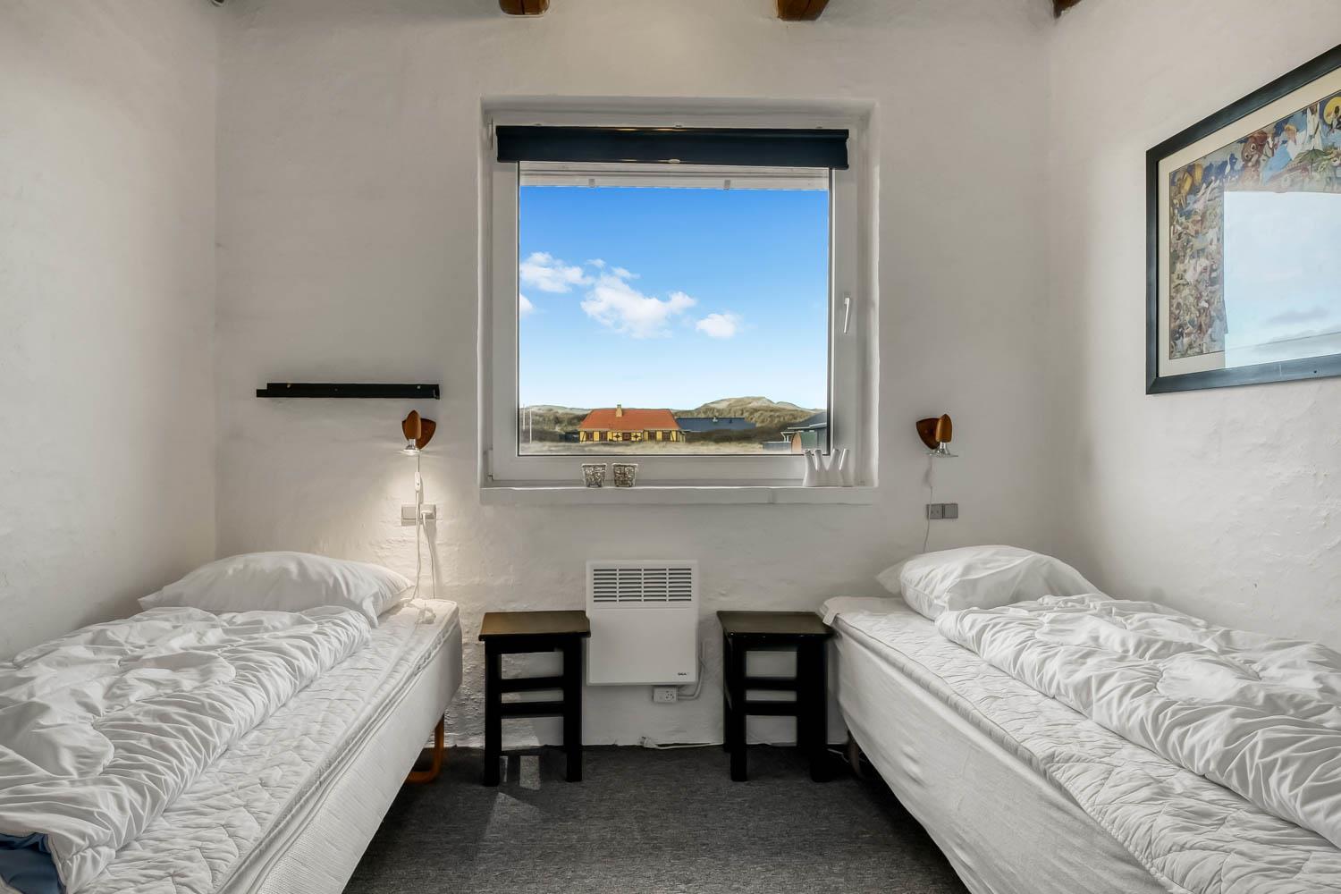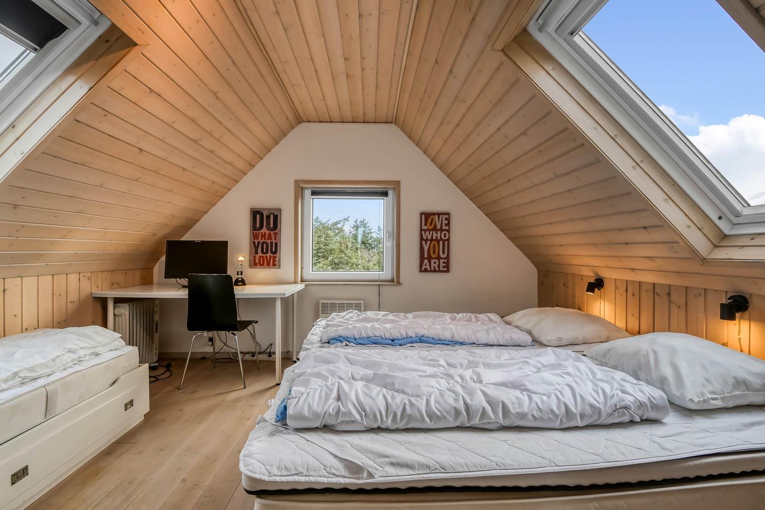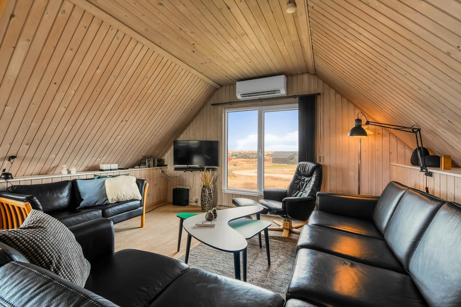 Via trappen for enden af opholdsstuen kommer I op på 1. etage. Her er der en dejlig stor stue med en fantastisk kanap med udsigt til klitterne ved Vesterhavet og over landskabet. Nyd at de dejlige møbler i kanappen sammen med udsigten til en skøn solnedgang. Derudover indrettet med nye moderne lædermøbler, lille brændeovn, varmepumpe, fladskærms-TV med danske og tyske kanaler samt en Chromecast. Der forefindes også et aktivitets område med Pool bord og sofagruppe velegnet til brætspil. Sidst med ikke mindst er det et dejlig stort soveværelse (1DS + 1S) samt et skrivebord med computerskærm (HDMI) hvis der skulle blive behov for hjemmearbejde.
