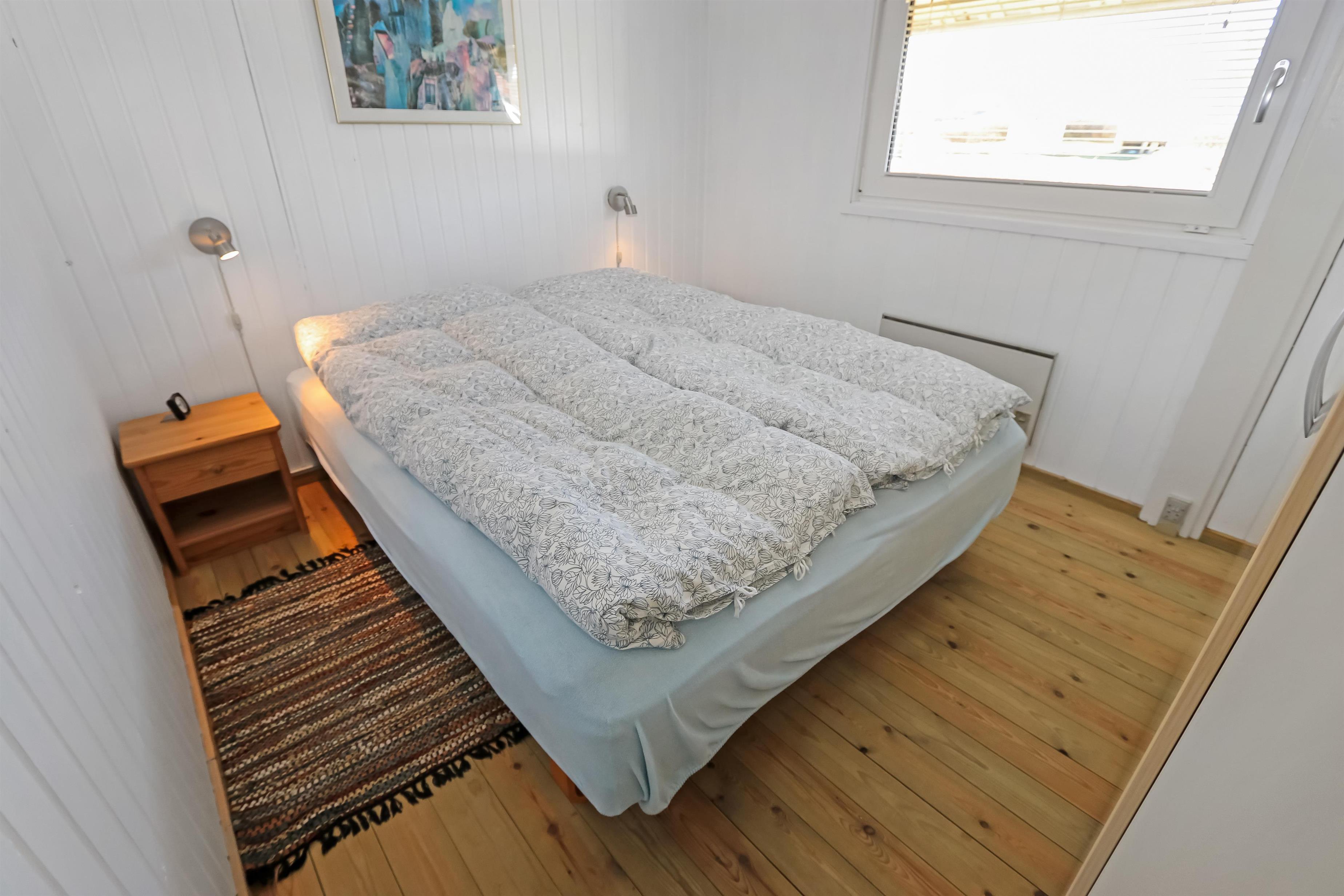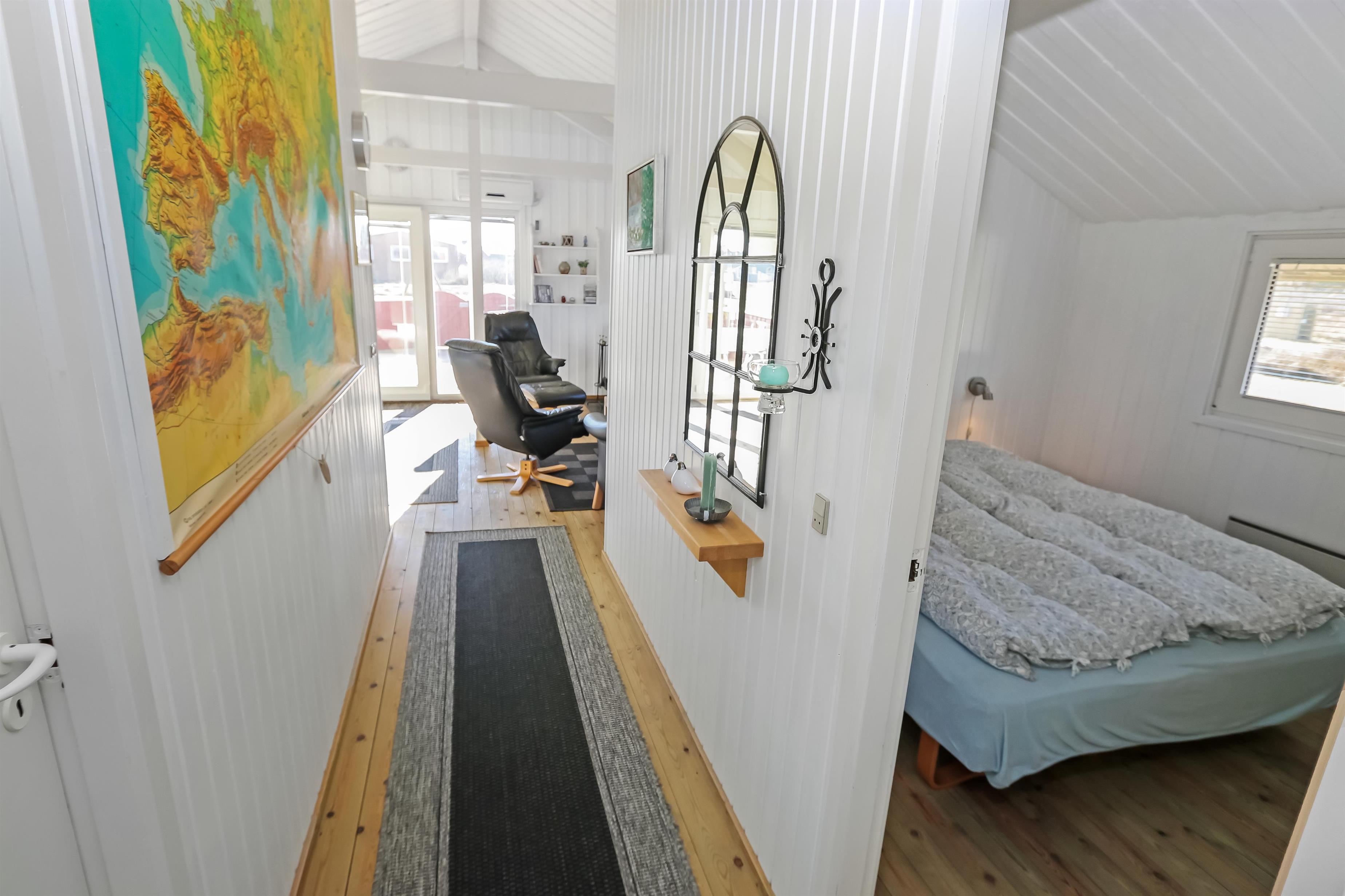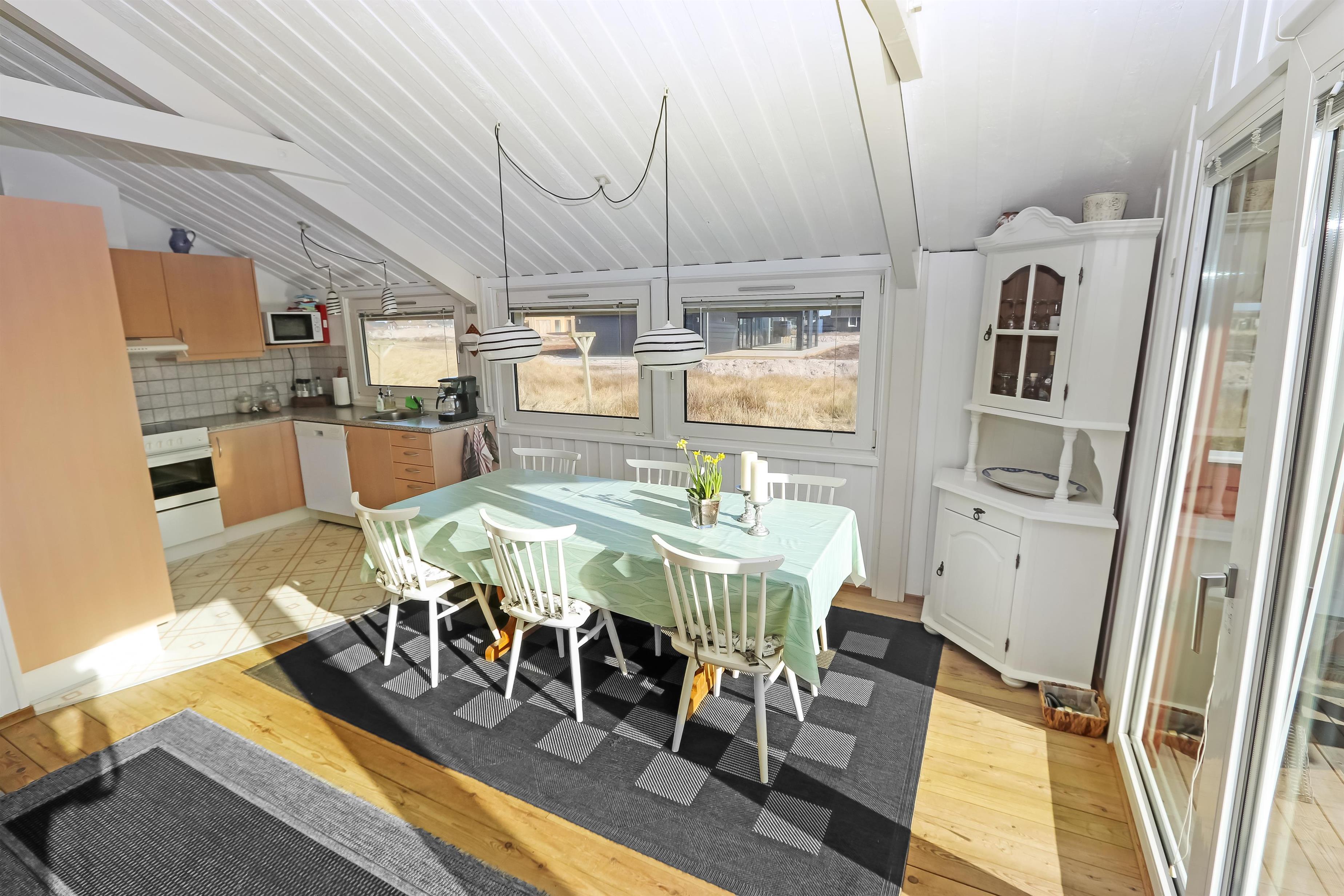 Meget velplejet og hyggeligt indrettet feriehus i træ. Kombineret køkken/stue som er i lyse farver og lysindfaldet fra vinduespartierne giver en meget hyggeligt stemning. Trægulv i stue og linolium i køkkenafdelingen. Stuen er indrettet med TV med danske og tyske programmer, internet brændeovn, varmepumpe, stereoanlæg med CD og DVD. Køkkenet er veludstyret og indeholder bl.a. el-komfur, køleskab med 40 l frostboks, emhætte, mikroovn og opvaskemaskine. Flot badeværelse med bruser, håndvask, toilet og vaskemaskine og gulvvarme. Til de små er der en højstol. 3 soverum: 1DS + 1DS + 2S, soverummene er også med trægulve. 1 husdyr er tilladt.