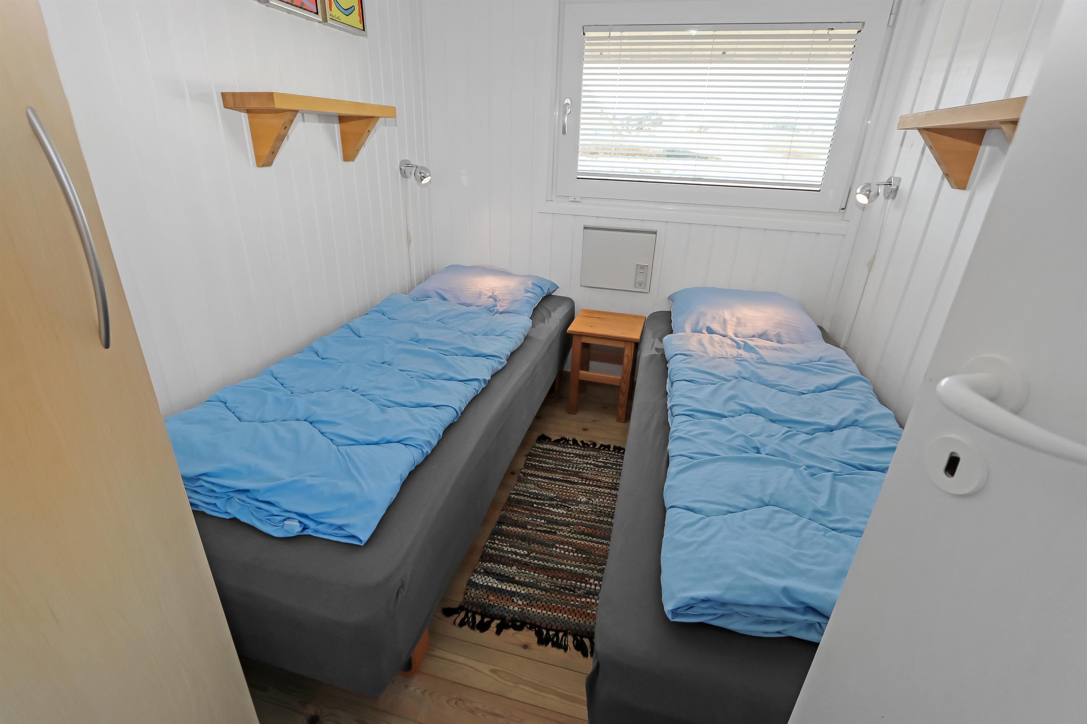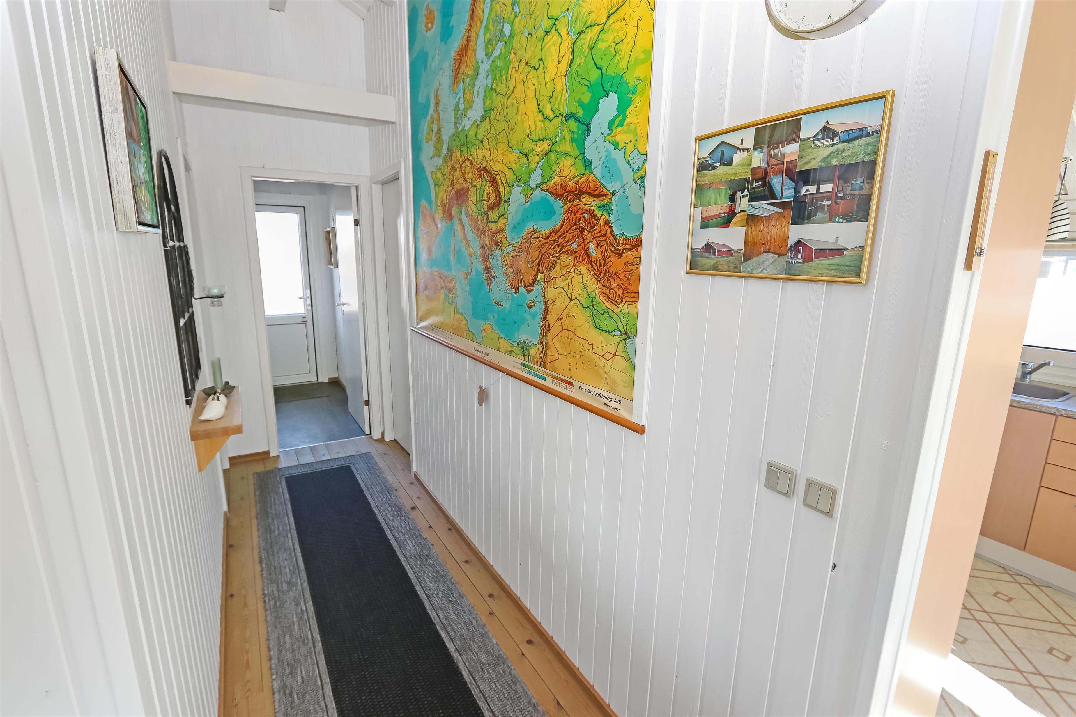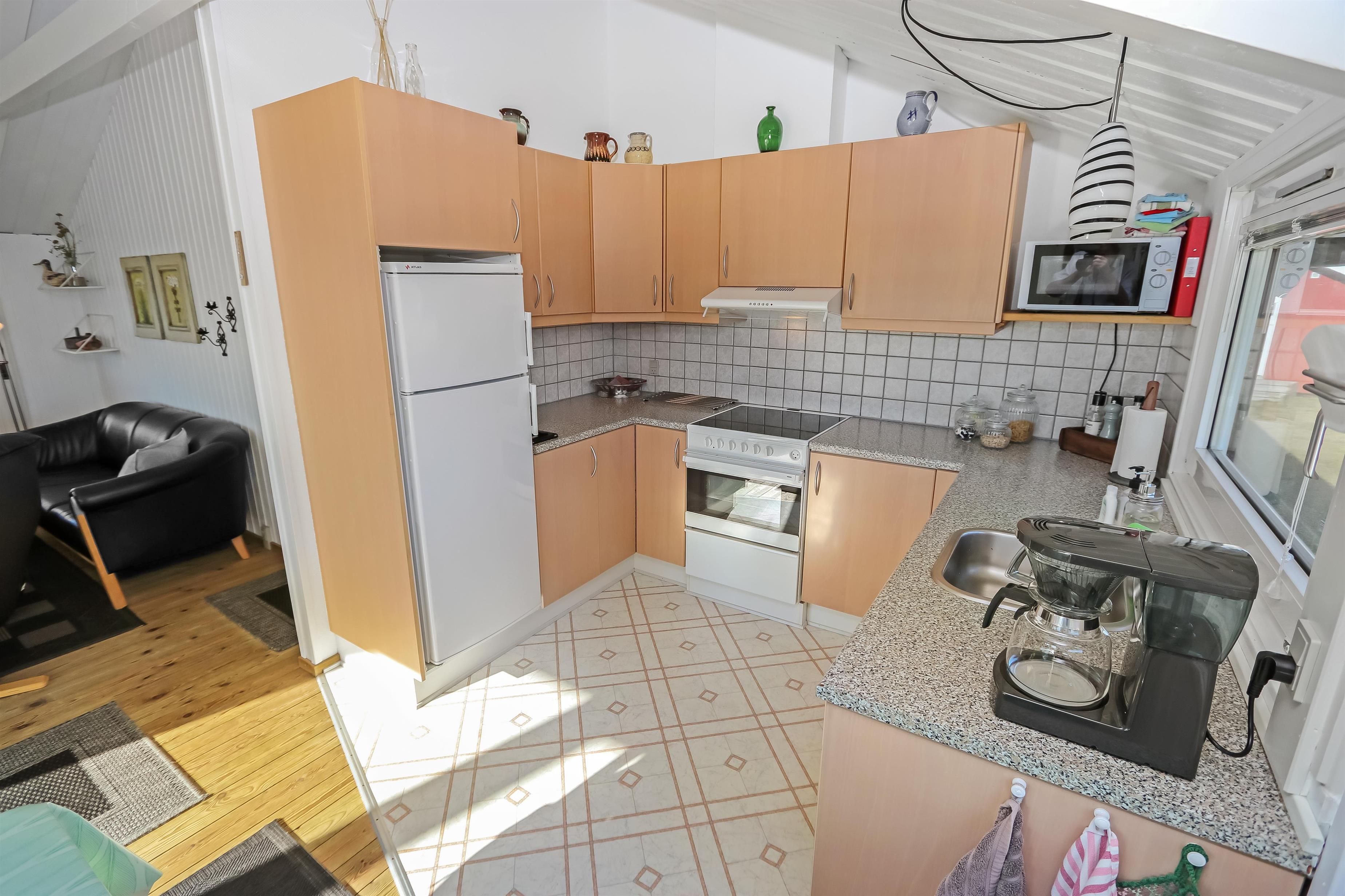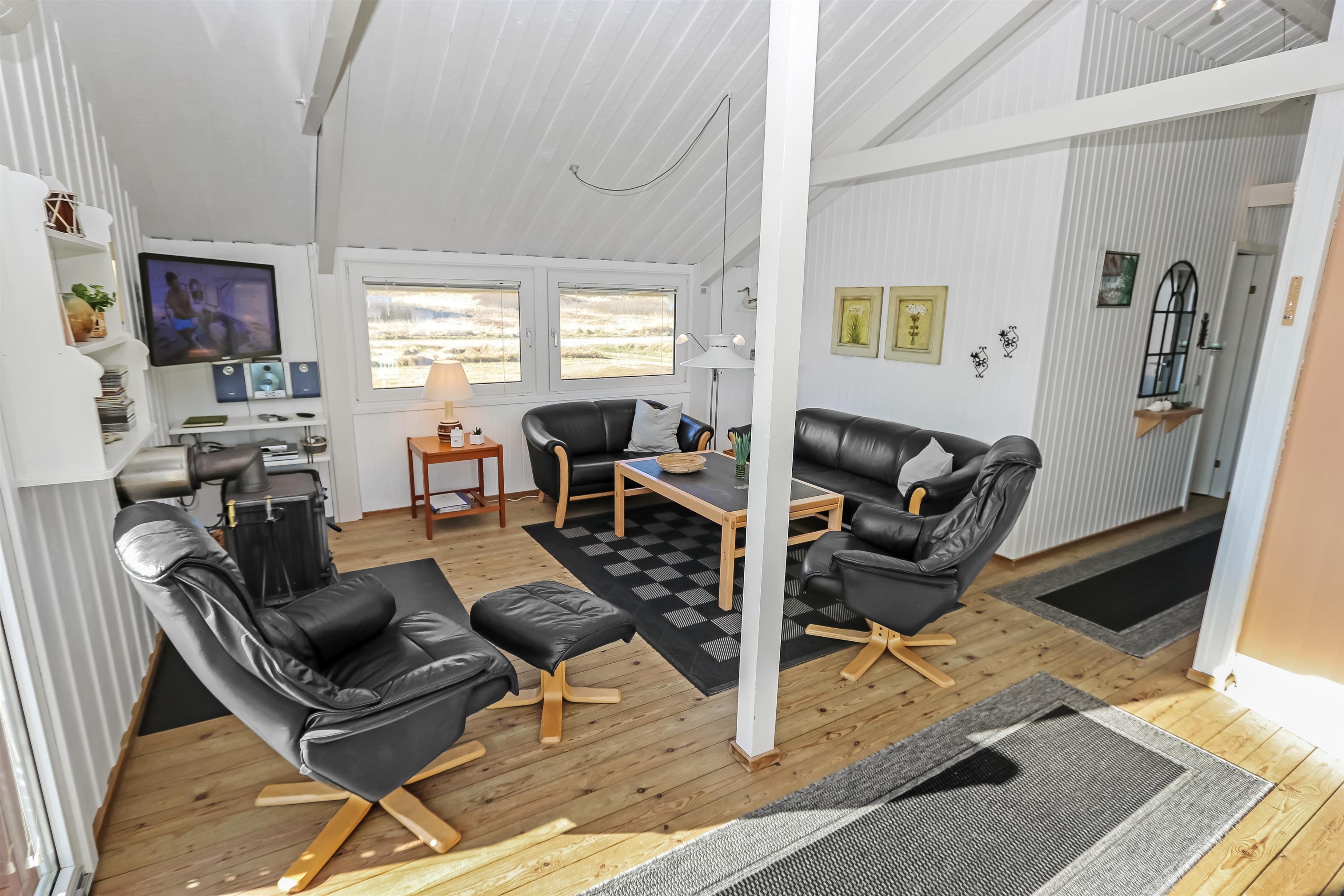 Meget velplejet og hyggeligt indrettet feriehus i træ. Kombineret køkken/stue som er i lyse farver og lysindfaldet fra vinduespartierne giver en meget hyggeligt stemning. Trægulv i stue og linolium i køkkenafdelingen. Stuen er indrettet med TV med danske og tyske programmer, internet brændeovn, varmepumpe, stereoanlæg med CD og DVD. Køkkenet er veludstyret og indeholder bl.a. el-komfur, køleskab med 40 l frostboks, emhætte, mikroovn og opvaskemaskine. Flot badeværelse med bruser, håndvask, toilet og vaskemaskine og gulvvarme. Til de små er der en højstol. 3 soverum: 1DS + 1DS + 2S, soverummene er også med trægulve. 1 husdyr er tilladt.