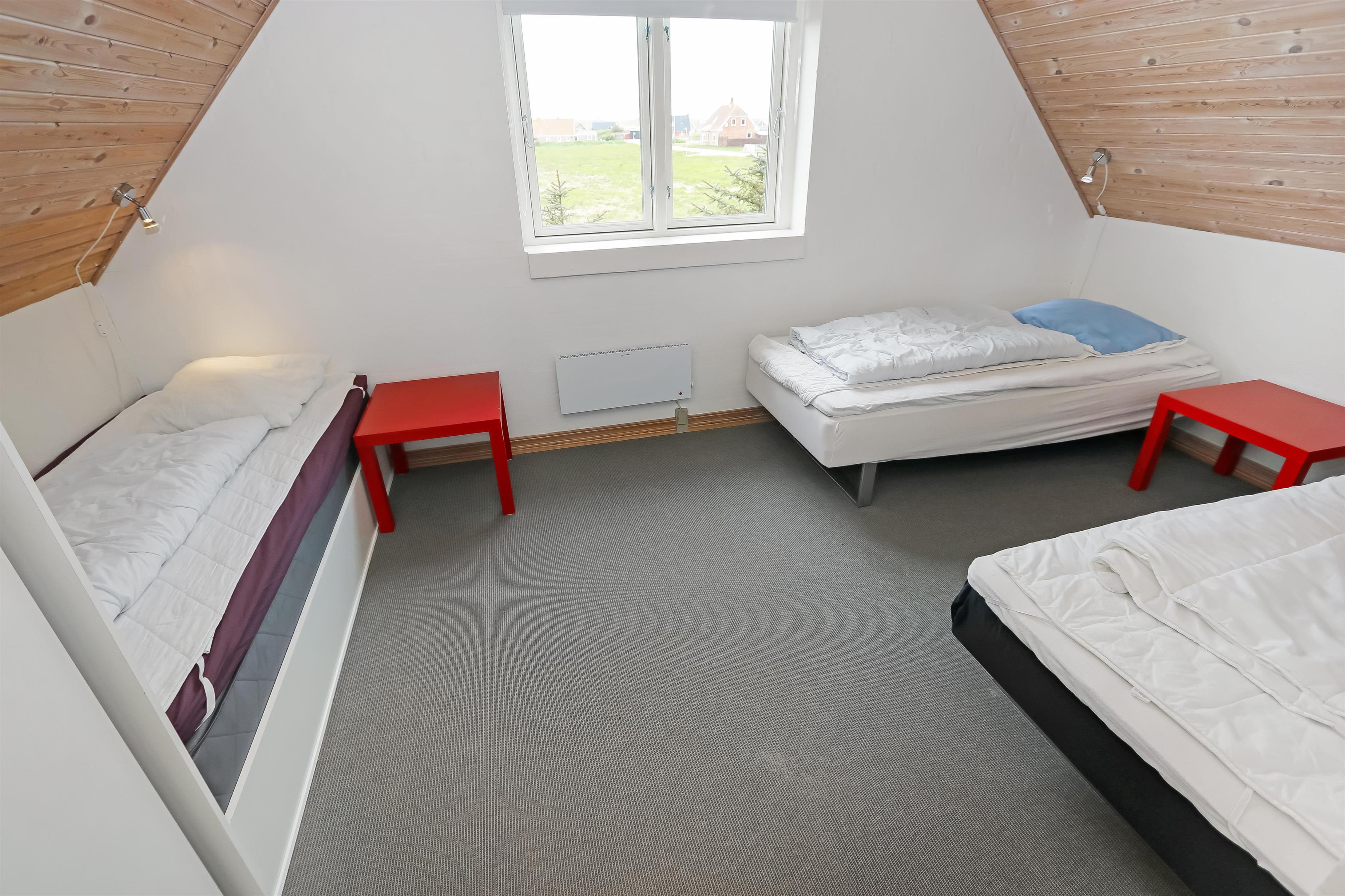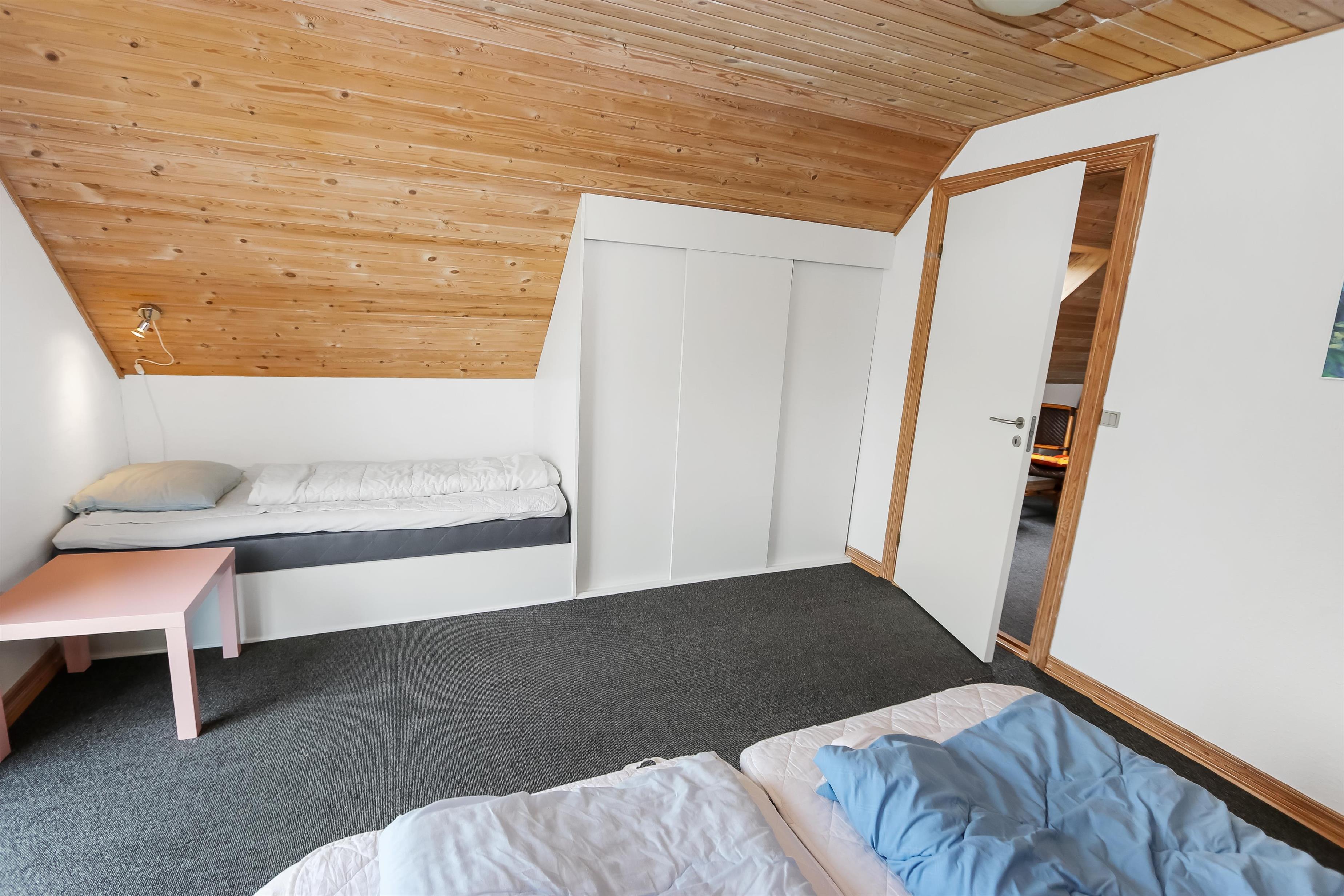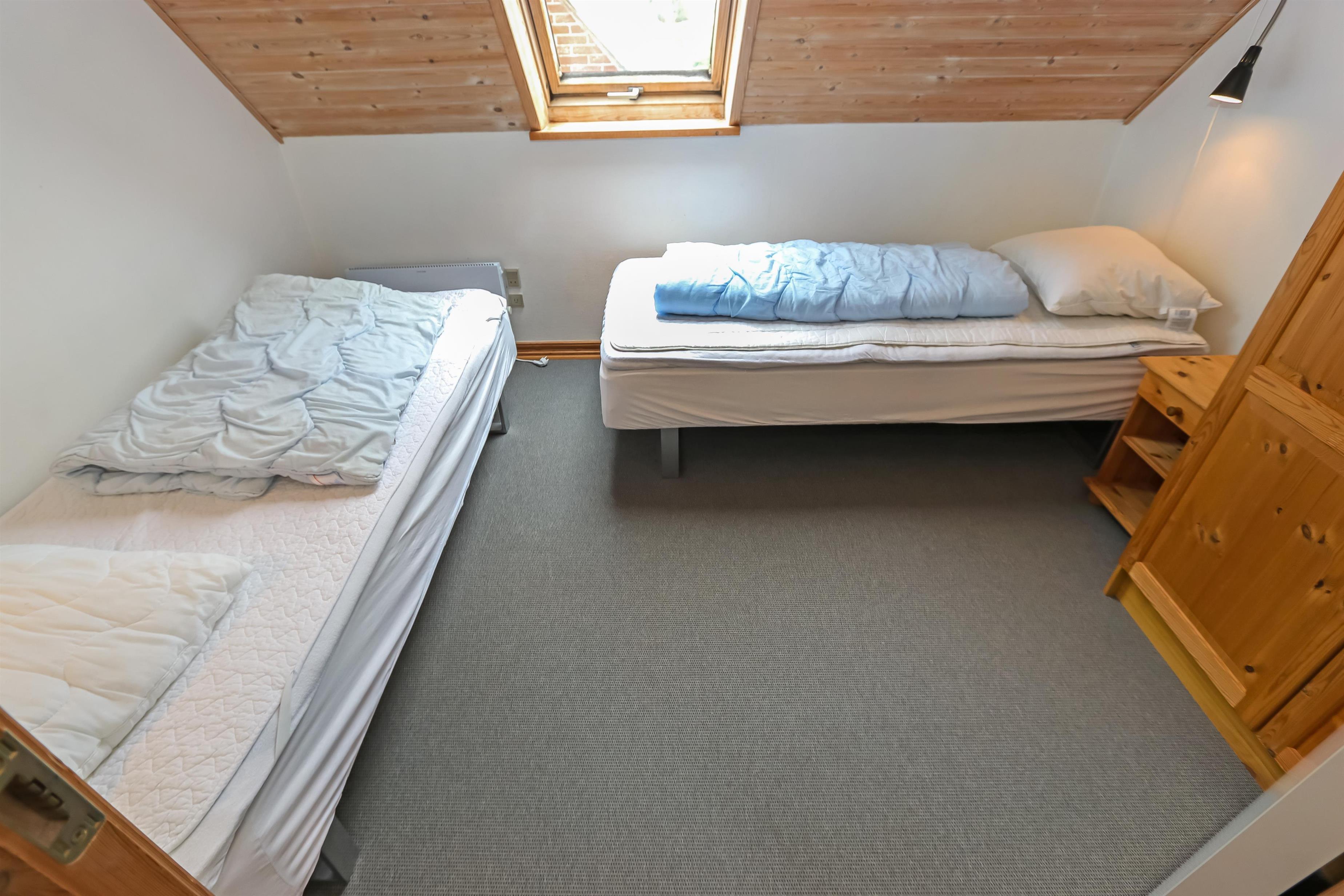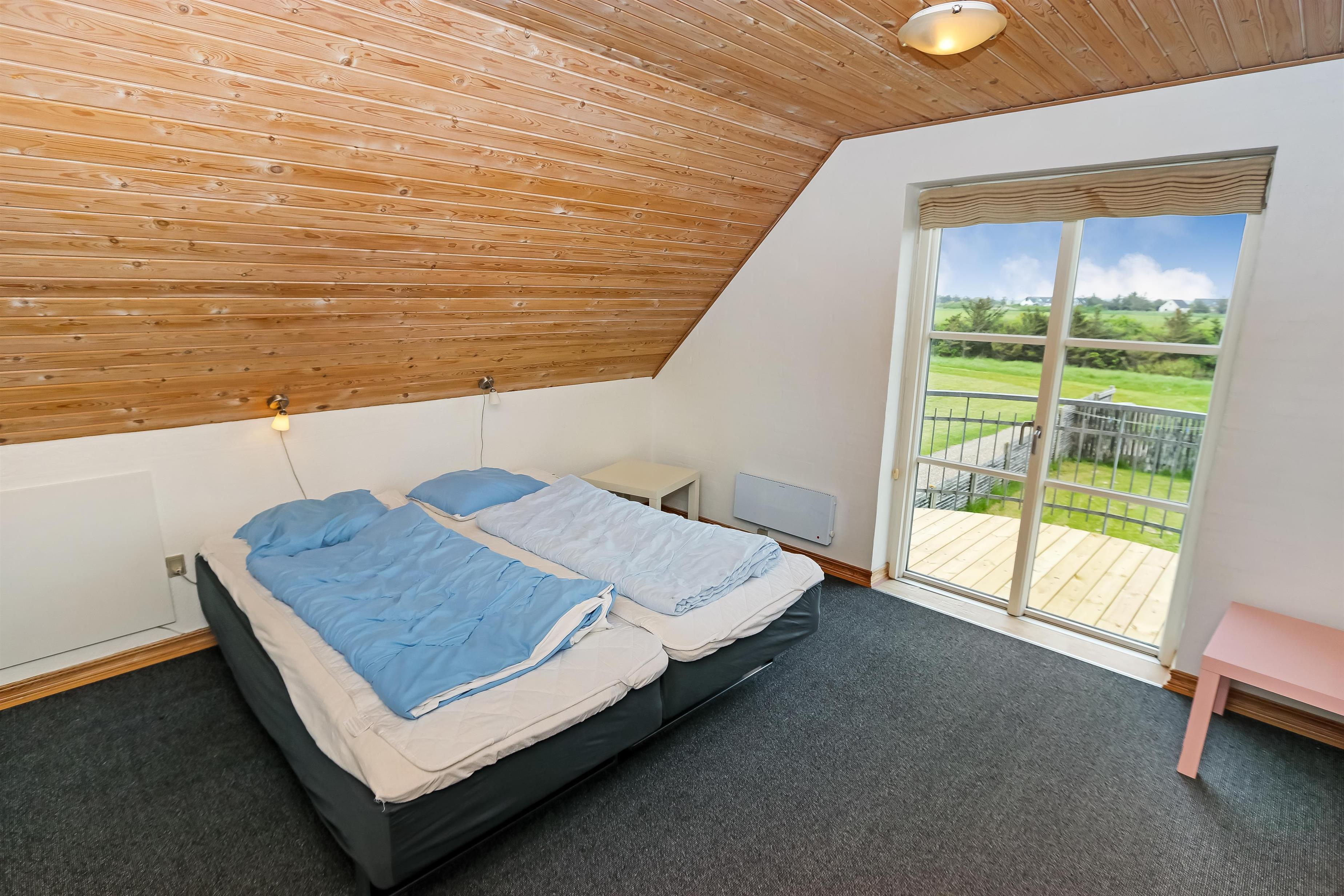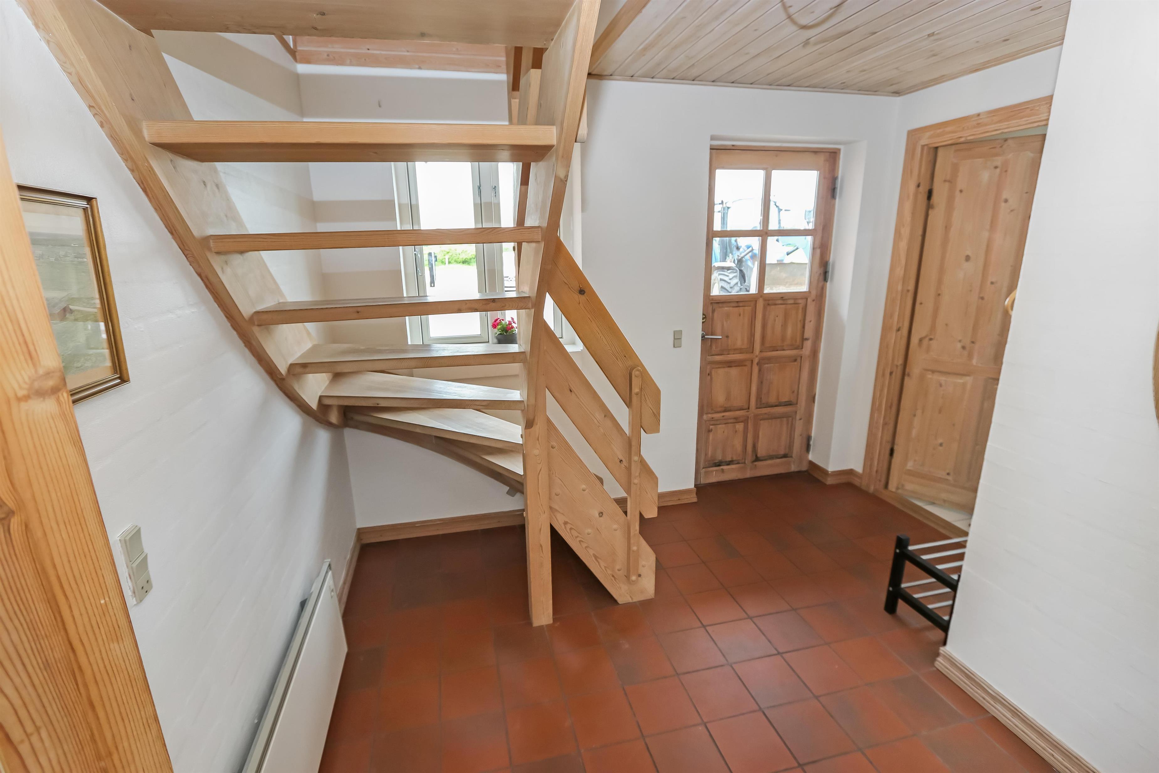 Via trappen i entréen kommer I op på 1. etage. Her er der 3 soverum (1DS+1ES, 1DS+1ES, 2ES). Der er også en repos med siddeplads ved vinduet. Fra det ene soveværelse er der udgang til en pragtfuld nyanlagt altan med udsigt over landskabet.