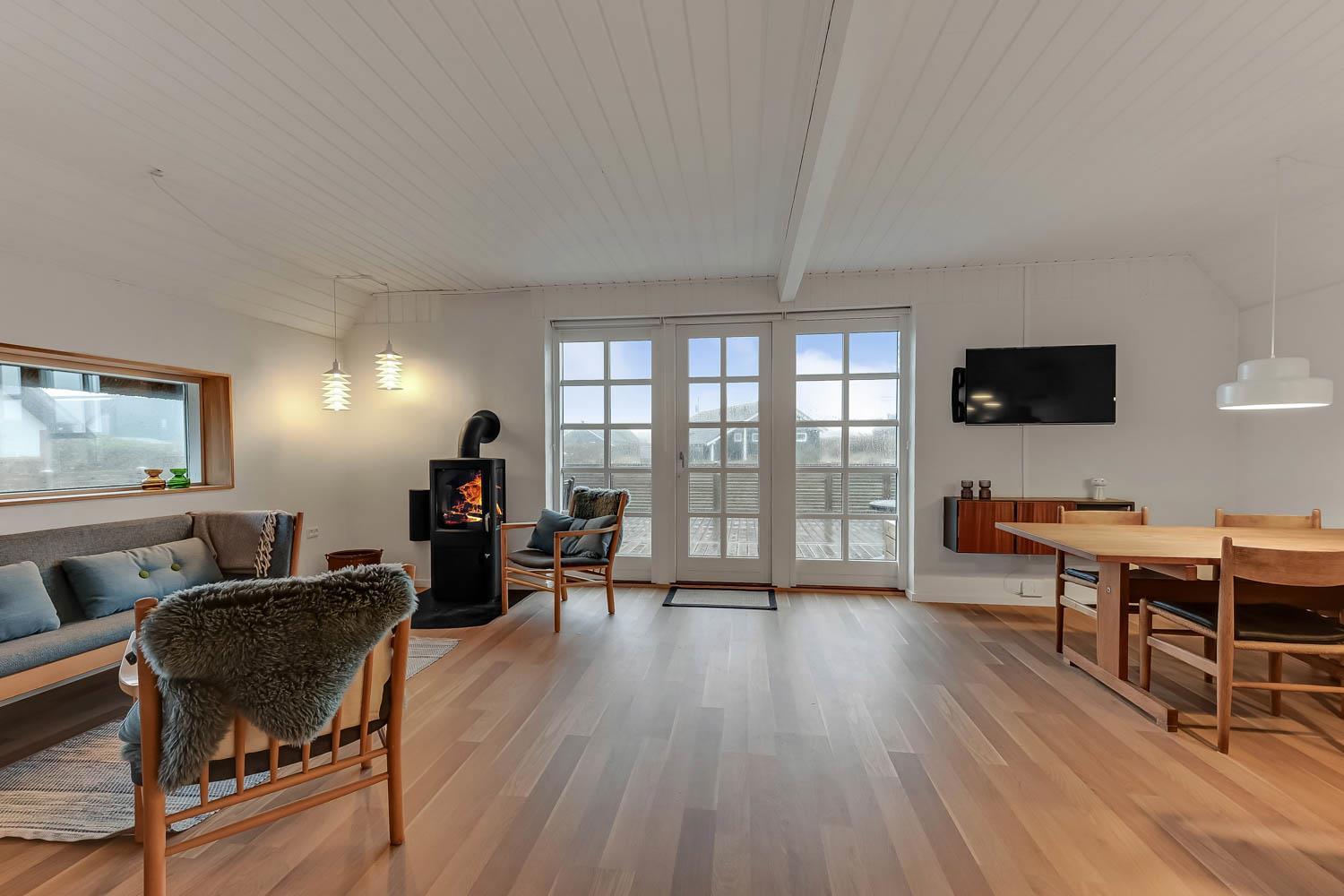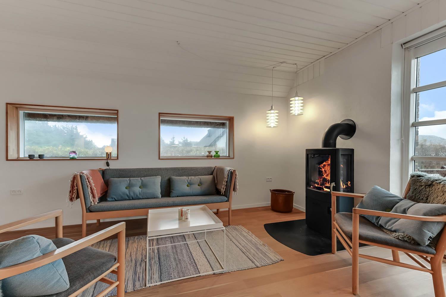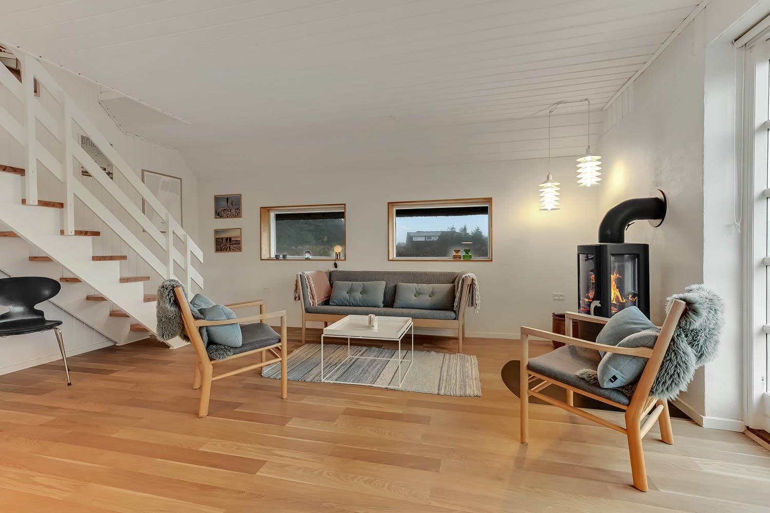 Huset som er 100 m2 fordelt på 2 etager er renoveret i 2020. Veludstyret køkken / alrum med alt i service / køkkengrej og alt i hårde hvidevarer. Køkkenhjørnet har bl.a. komfur med glaskeramiske kogeplader, emhætte, opvaskemaskine og køleskab med fryseboks. Nyd maden ved spisebordet, kig ud af vinduet og se de store høje klitter ved Vesterhavet eller slap af i de pæne møbler eller afspil musik fra bluetooth højtaleren. Nyd flammerne ved den hyggelige brændeovn som sammen med den opsatte varmepumpe i stueetagen sørger for et minimalt forbrug til opvarmning. 3 dejlige soverum (1DS, 1DS, 1DS). Badeværelse med toilet, håndvask, bruser, vaskemaskine og klinkegulv. Der er praktiske hårde gulve i alle opholds- og soverum. Ikke ryger hus. Husdyr må ikke medbringes.