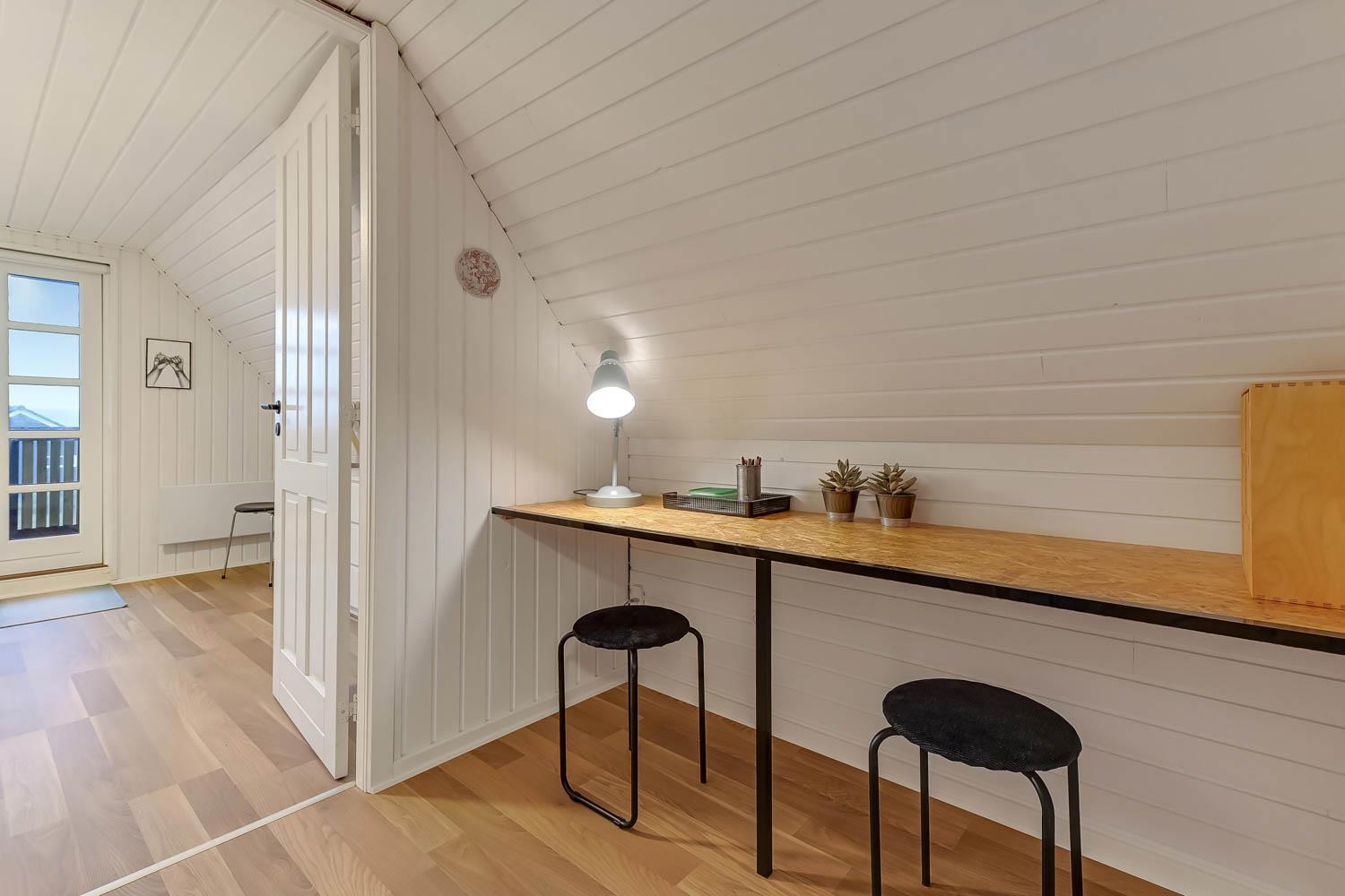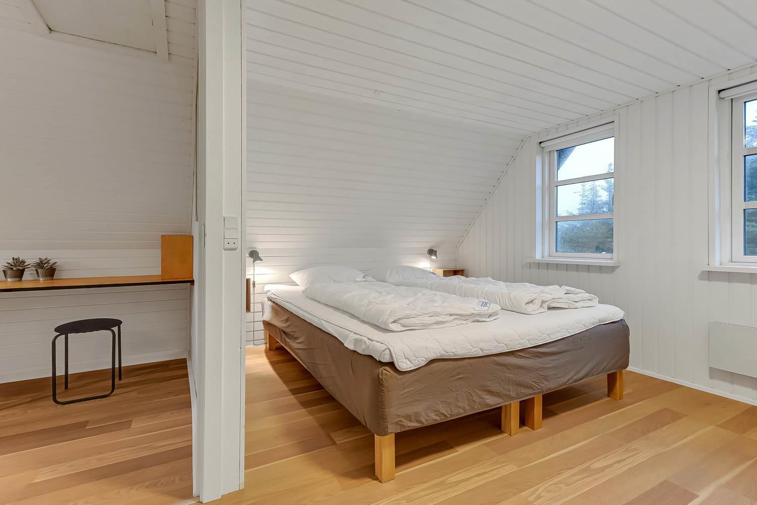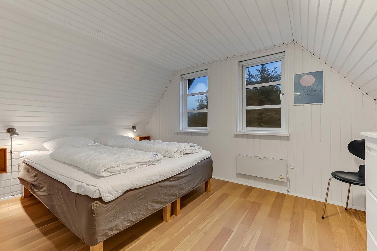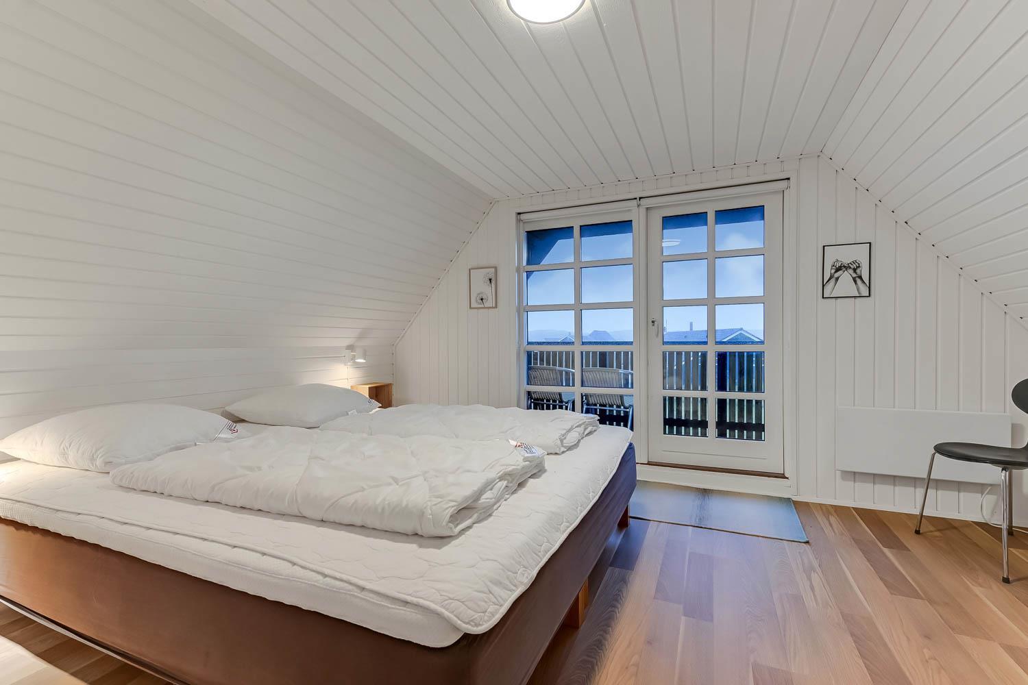 Via trappen i opholdsstuen kommer I op på 1. Etage. Her er der 2 soverum (1DS, 1DS). Fra det ene soveværelse er der udgang til en lille balkon med udsigt til klitterne ved Vesterhavet.