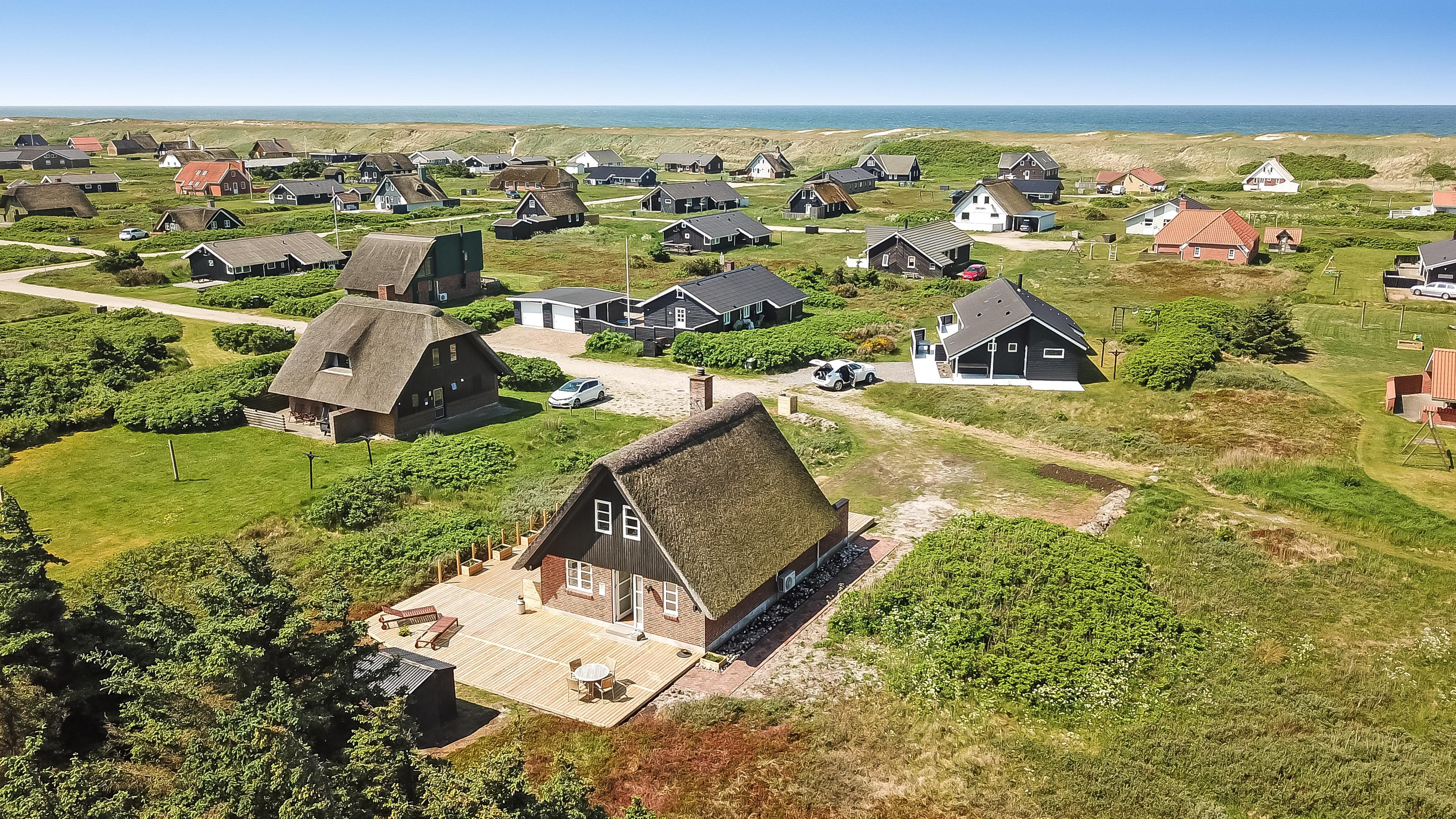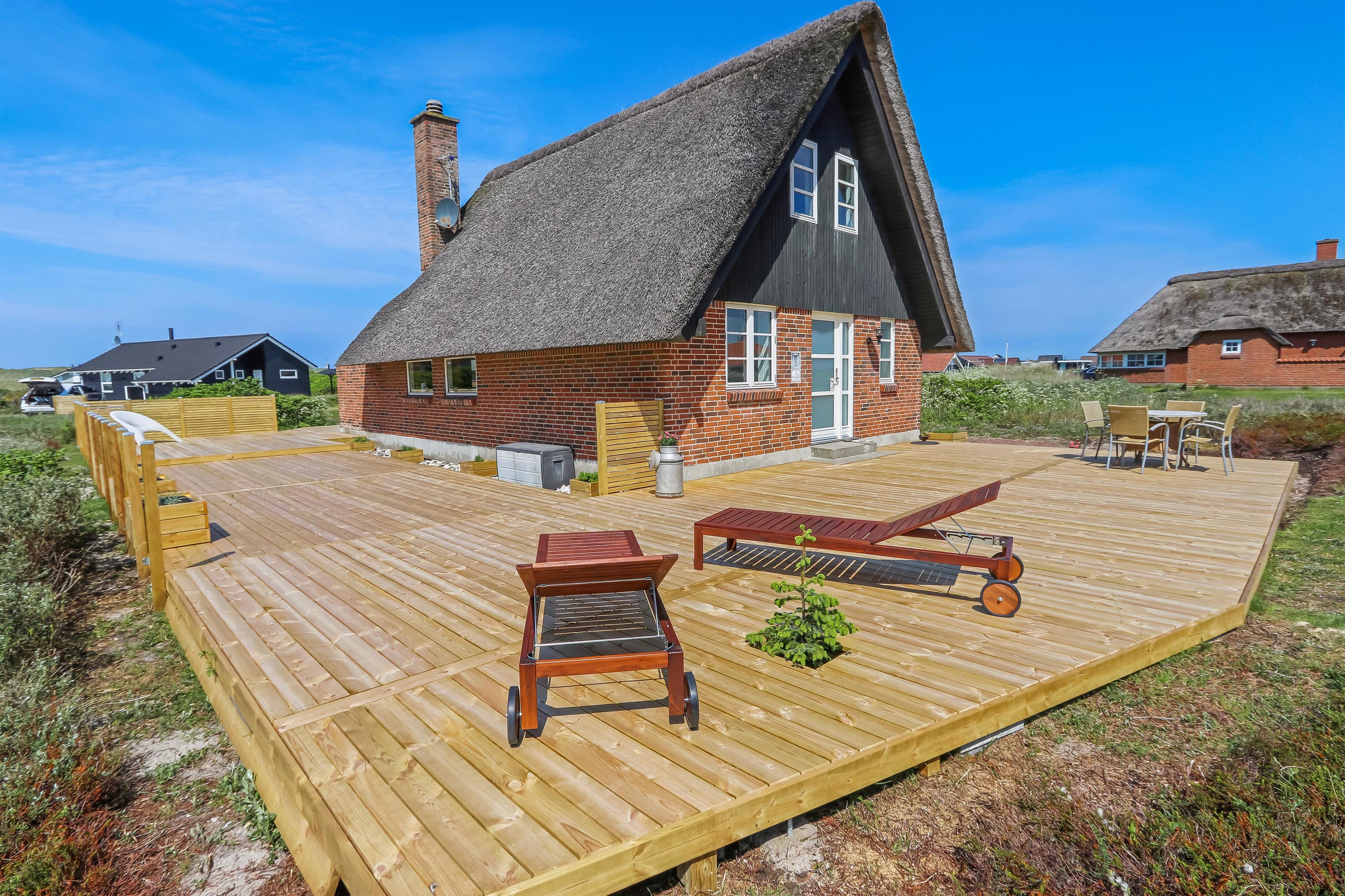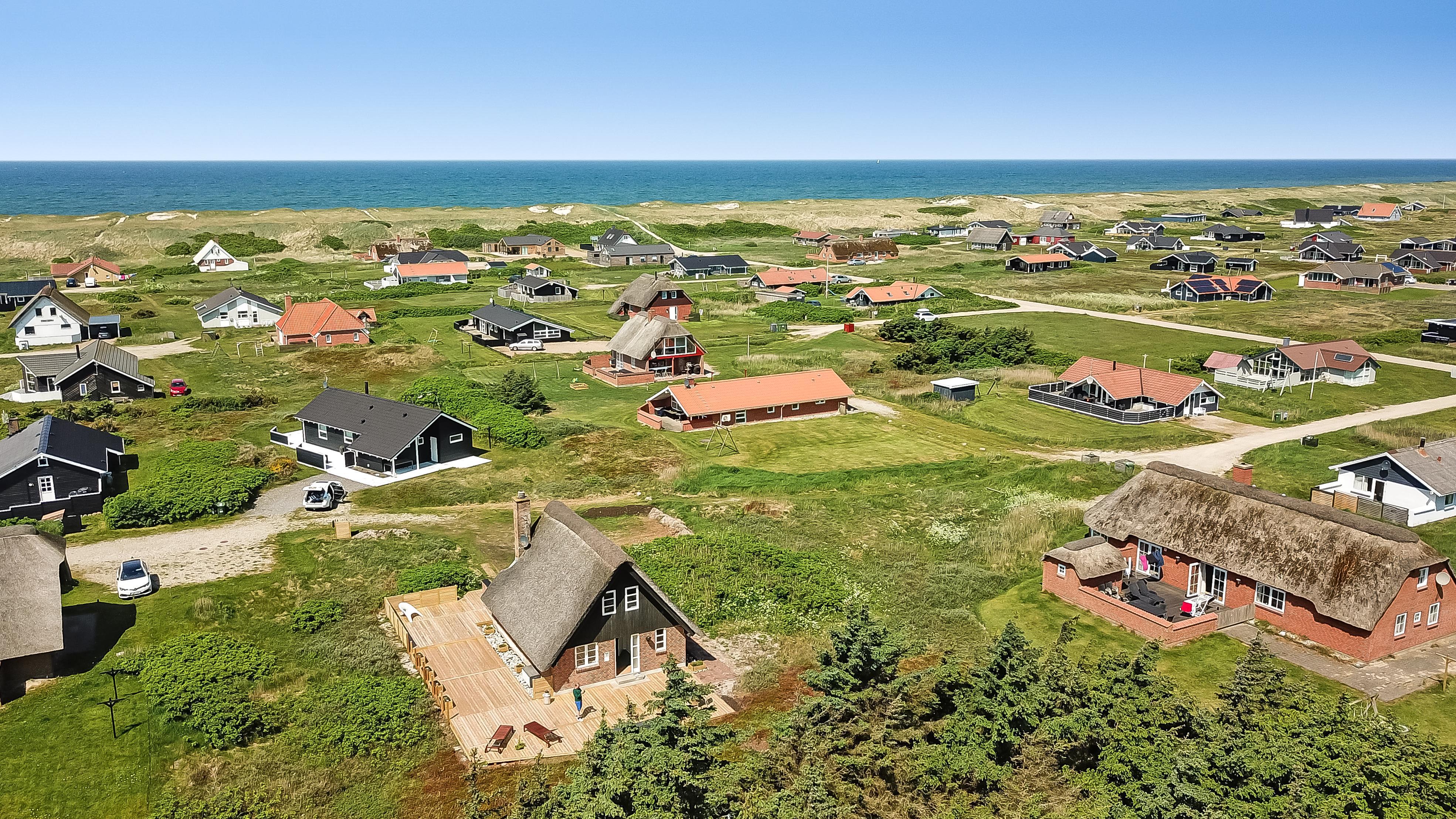 Romantisk, feriehus med stråtag og gratis Internet. Særdeles velholdt stenhus i 2 etager med klitudsigt. Et flot feriehus med god plads til hele familien eller til parret som ønsker en romantisk ferie. Nyd husets mange muligheder eller gå en dejlig tur ved Vesterhavet.