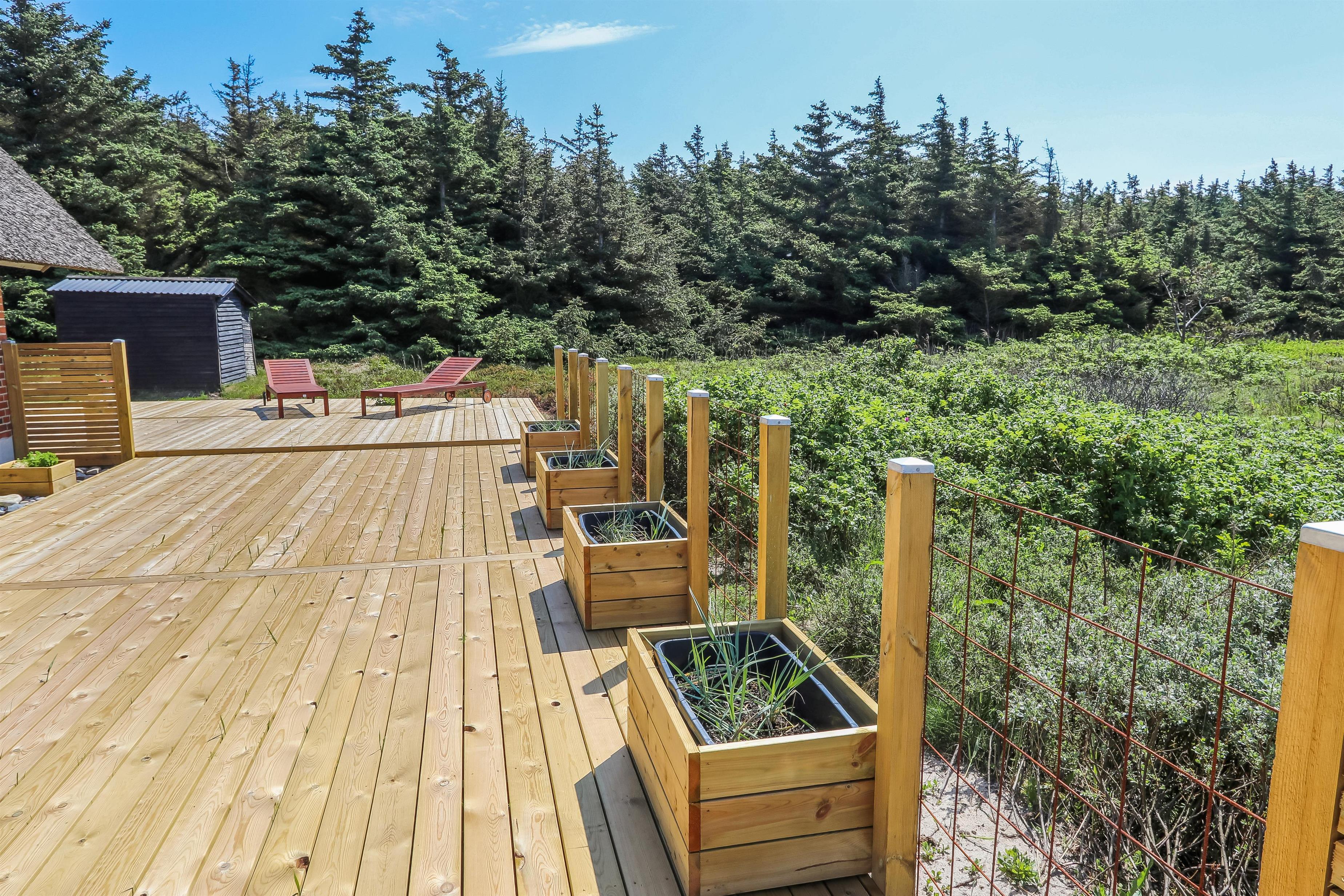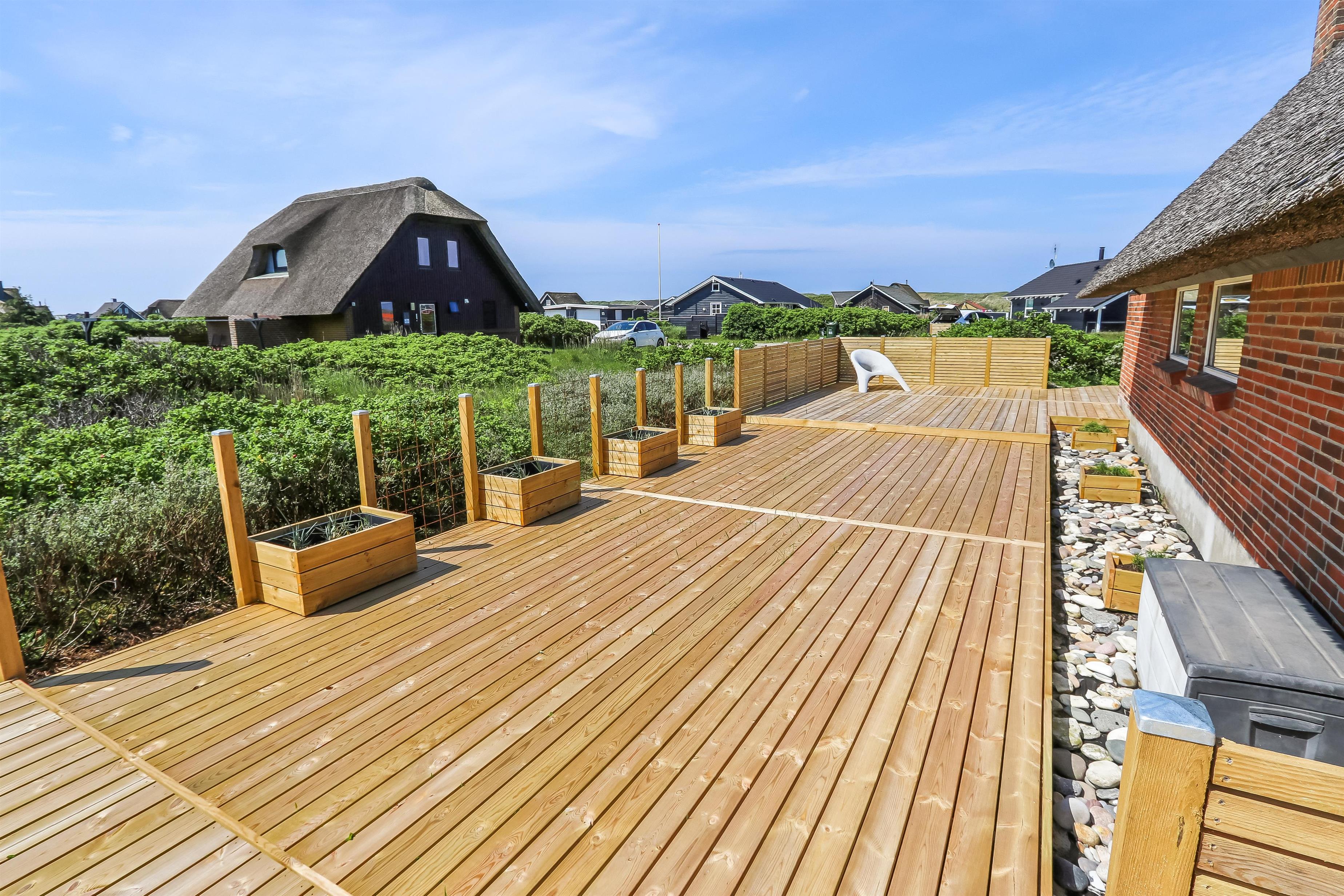 Feriehuset er beliggende på en 1.250 m2 stor naturgrund kun ca. 250 meter fra Vesterhavet. Delvis indhegnet terrasse med havemøbler, solvogne og grill. Gå en tur i det rolige feriehusområde, henover de høje klitter og straks derefter åbenbarer Vesterhavet sig. Hver dag byder Vesterhavet på nye maleriske oplevelse, der invitere til en frisk gå- eller løbetur. Eller hvad med en lille tur på ca. 10 - 15 min op til områdets lille købmand, som i sæsonen har åbent og byder på frisk morgenbrød og hvor de daglige indkøb også kan klares. Så hvad enten du er til aktiv ferie eller total afslapning danner dette flotte feriehus en dejlig ramme både hvad angår hus, beliggenhed og omgivelser. Indenfor kort køreafstand nås både den aktive handelsby i Lemvig med flere specialbutikker eller den unikke fiskerby Thyborøn, som udover den aktive fiskerihavn også byder på badestrand og op til flere aktivitetstilbud, som alle er et besøg værd.