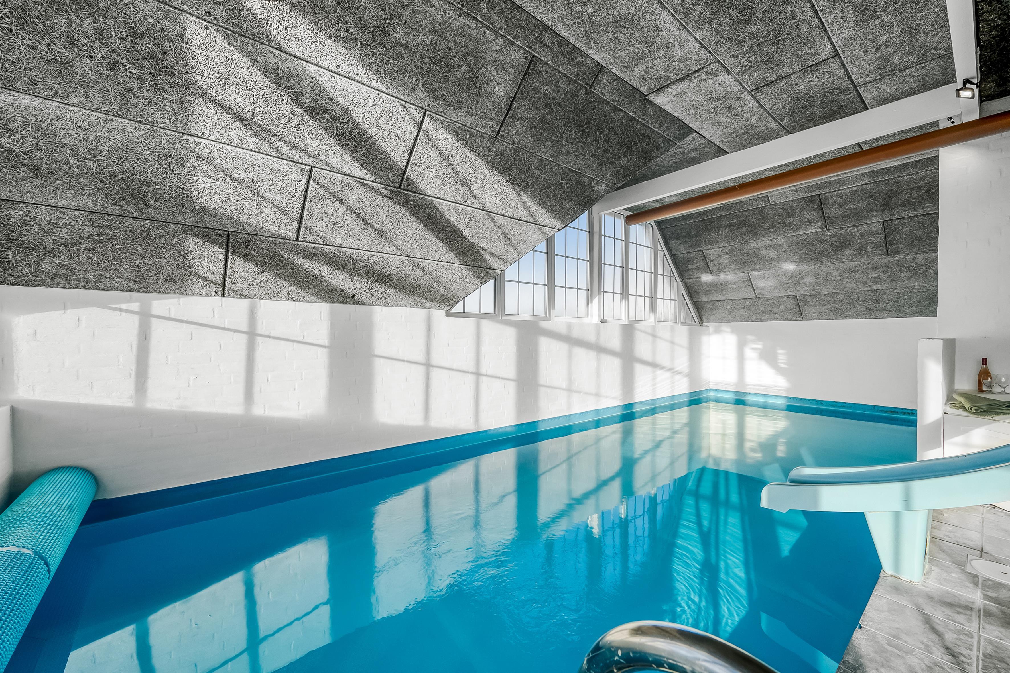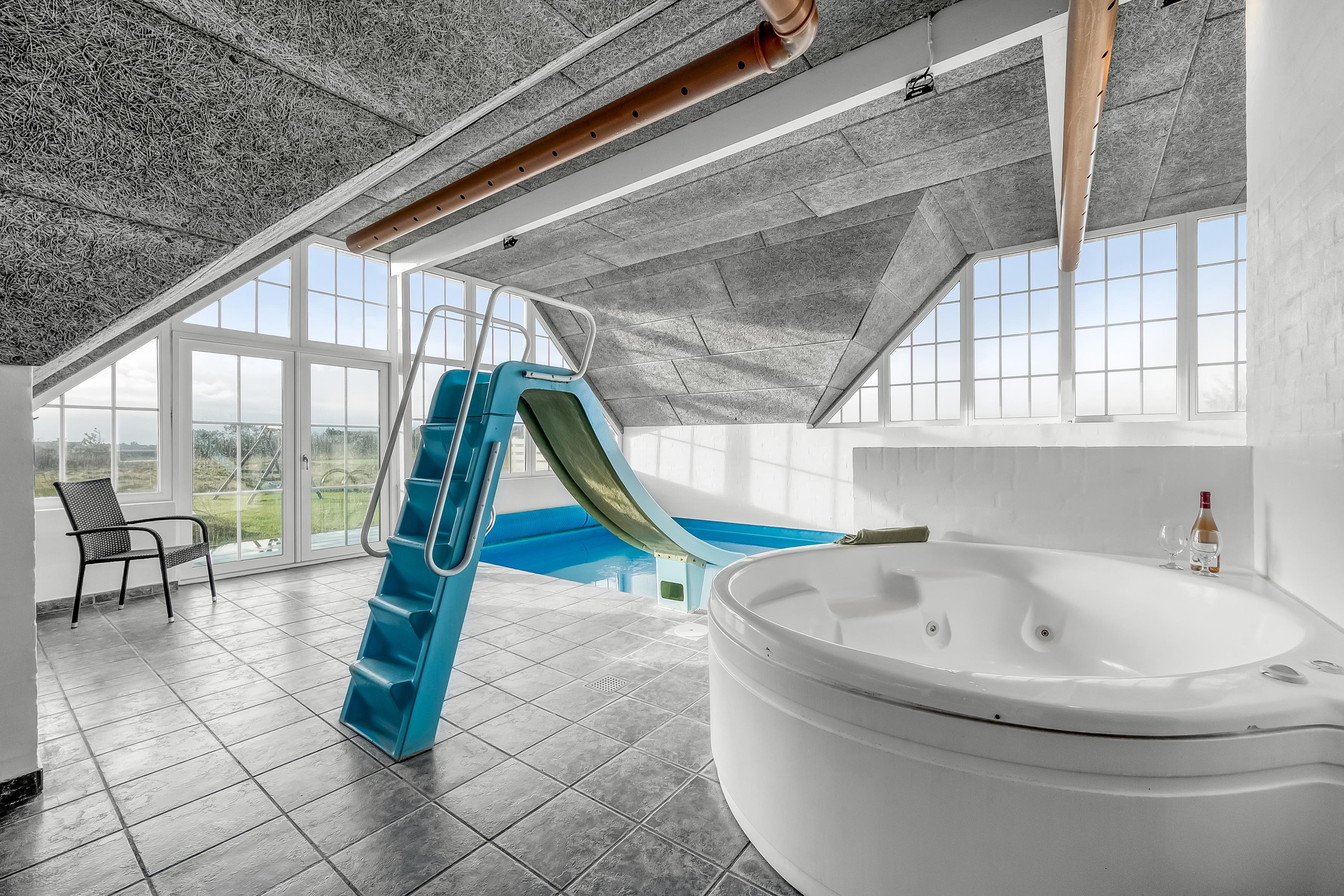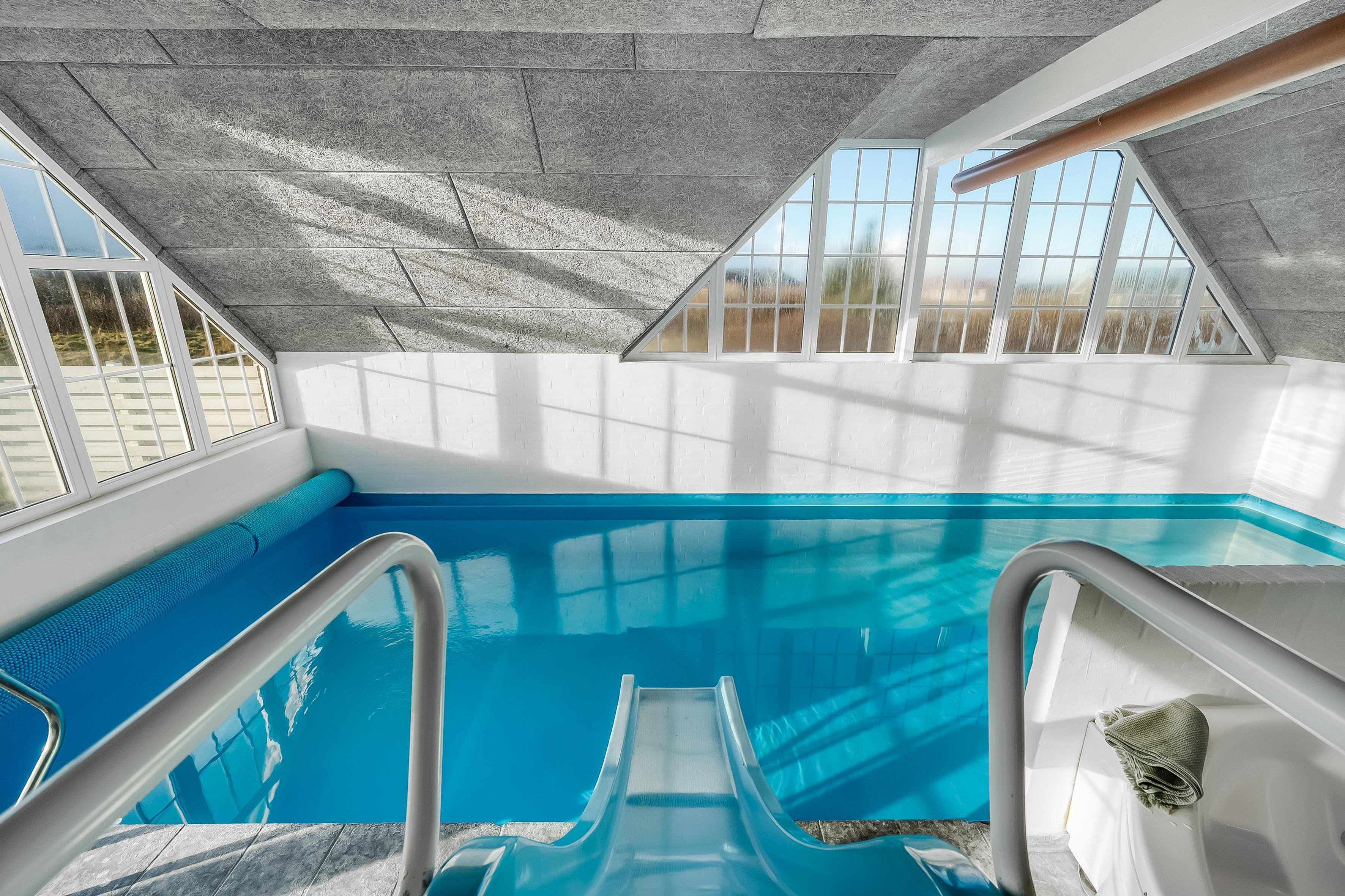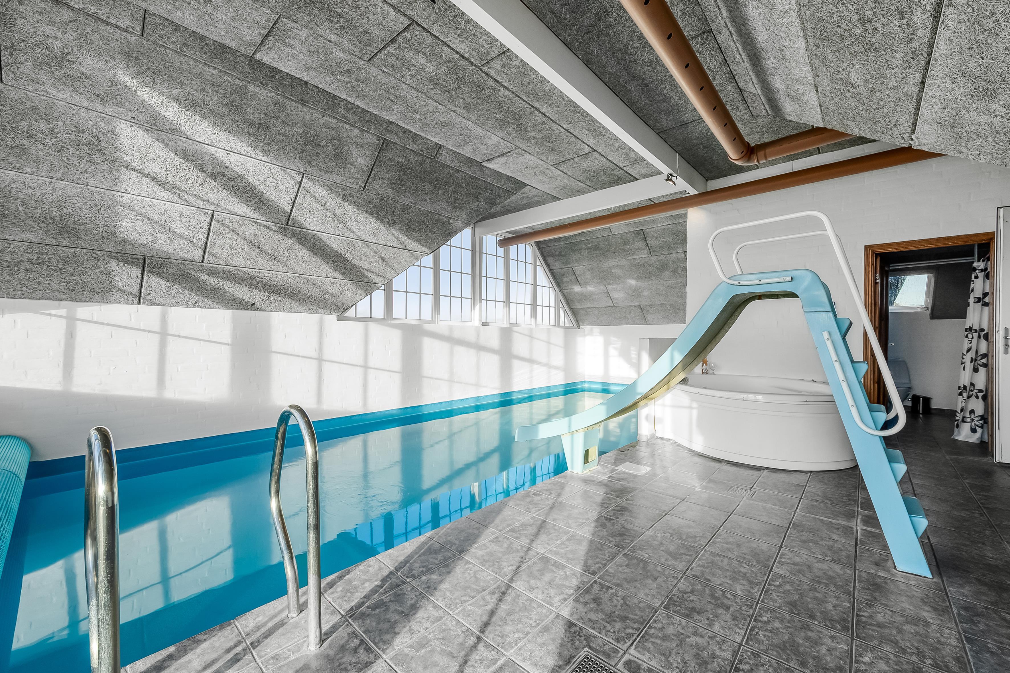 Udenfor finder du en dejlig terrasse, hvor du kan nyde solen, samt en grill til hyggelige grill-aftener. For børnene er der en sandkasse og gynger, der sikrer timevis af underholdning. Husets opvarmede pool og den tilhørende vandrutsjebane, er den perfekte underholdning for både børn og voksne . Efter en dag i solen kan du desuden slappe af i det indendørs spa, der har plads til op til 4 personer, eller nyde en afslappende stund i saunaen.