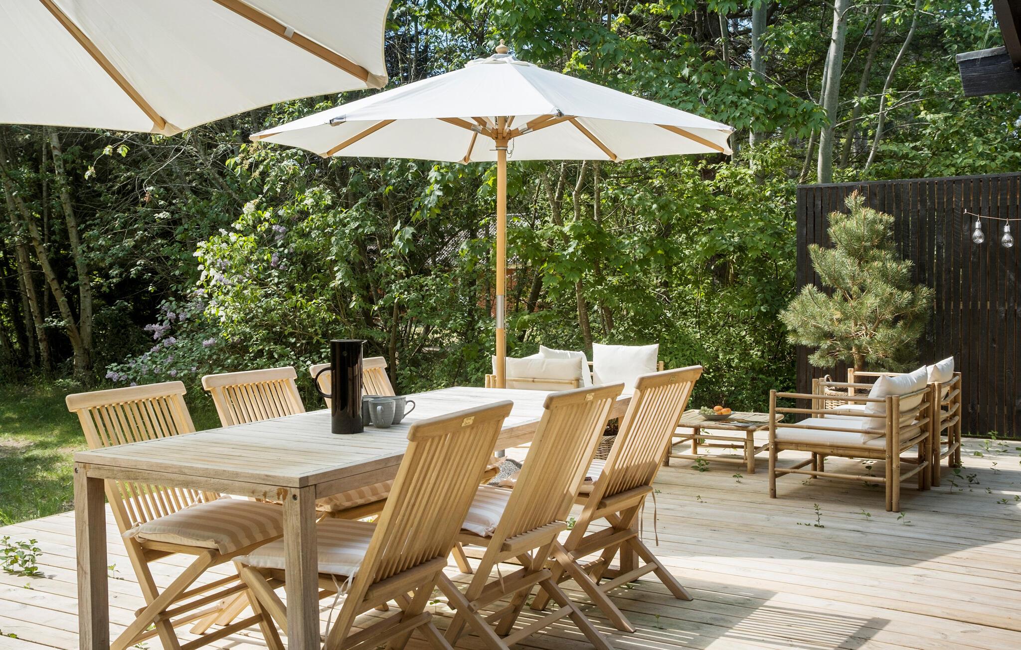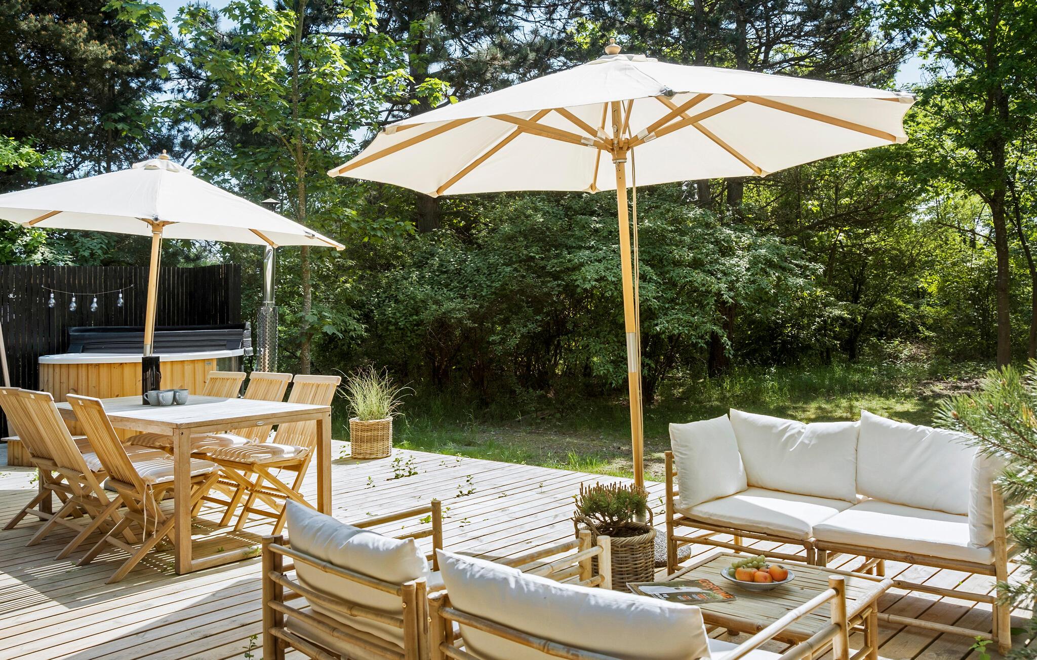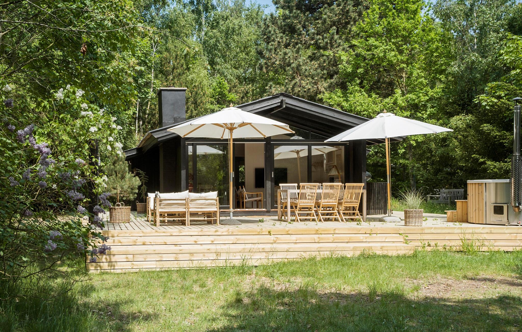 Smagfuldt og hyggeligt feriehus med vildmarksbad og stor træterrasse.