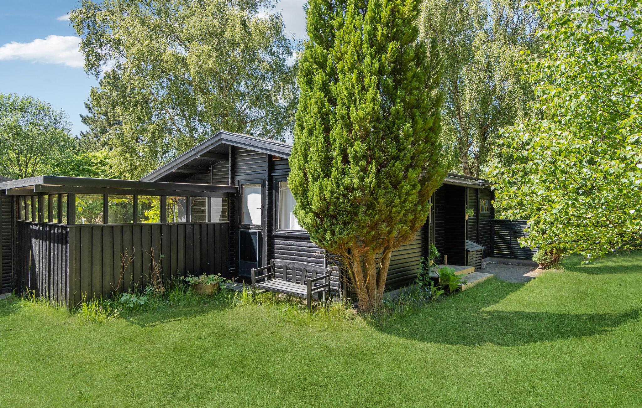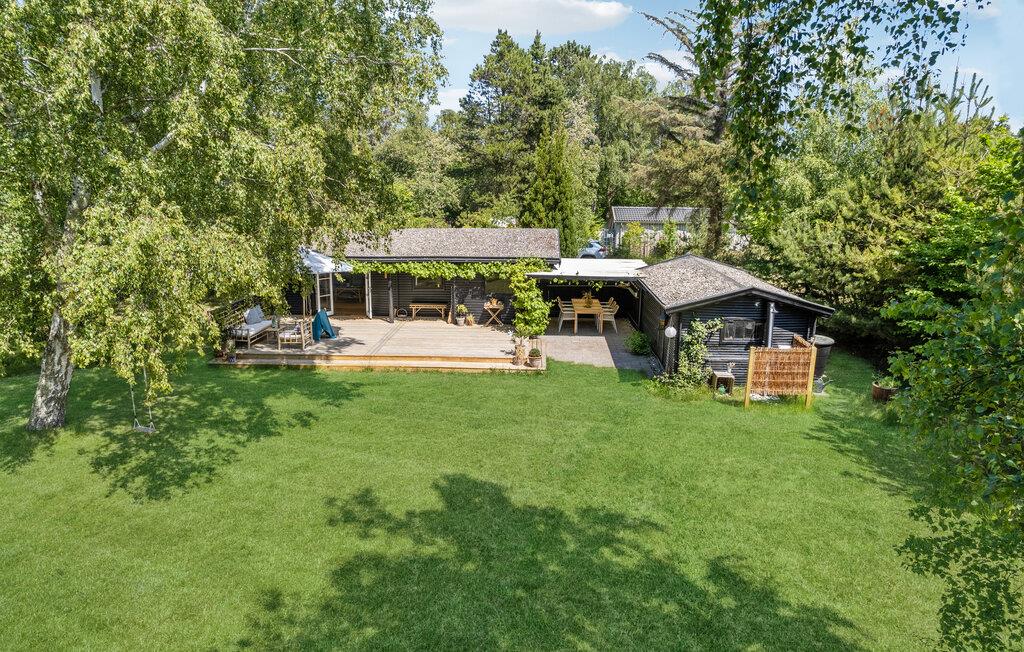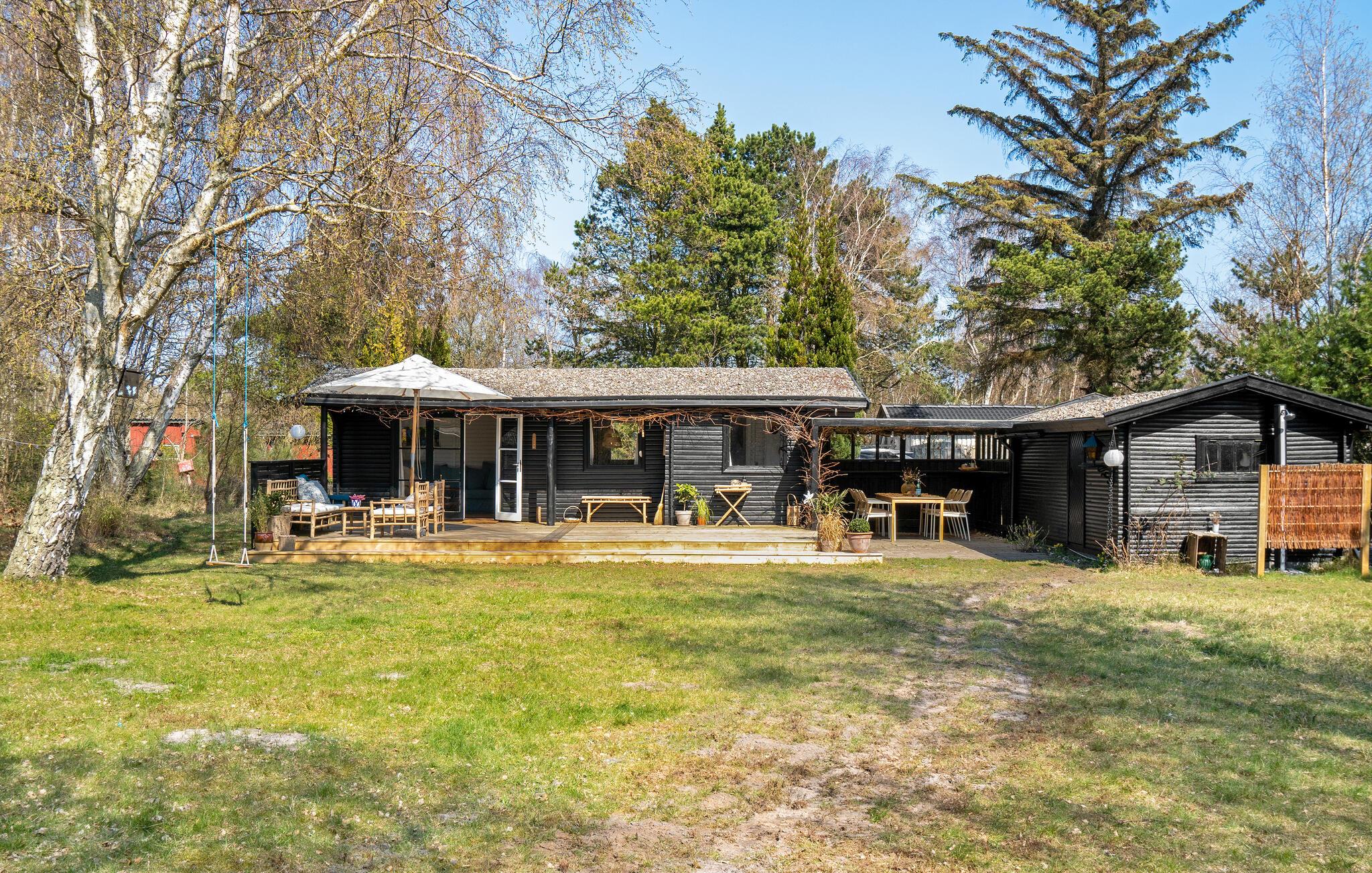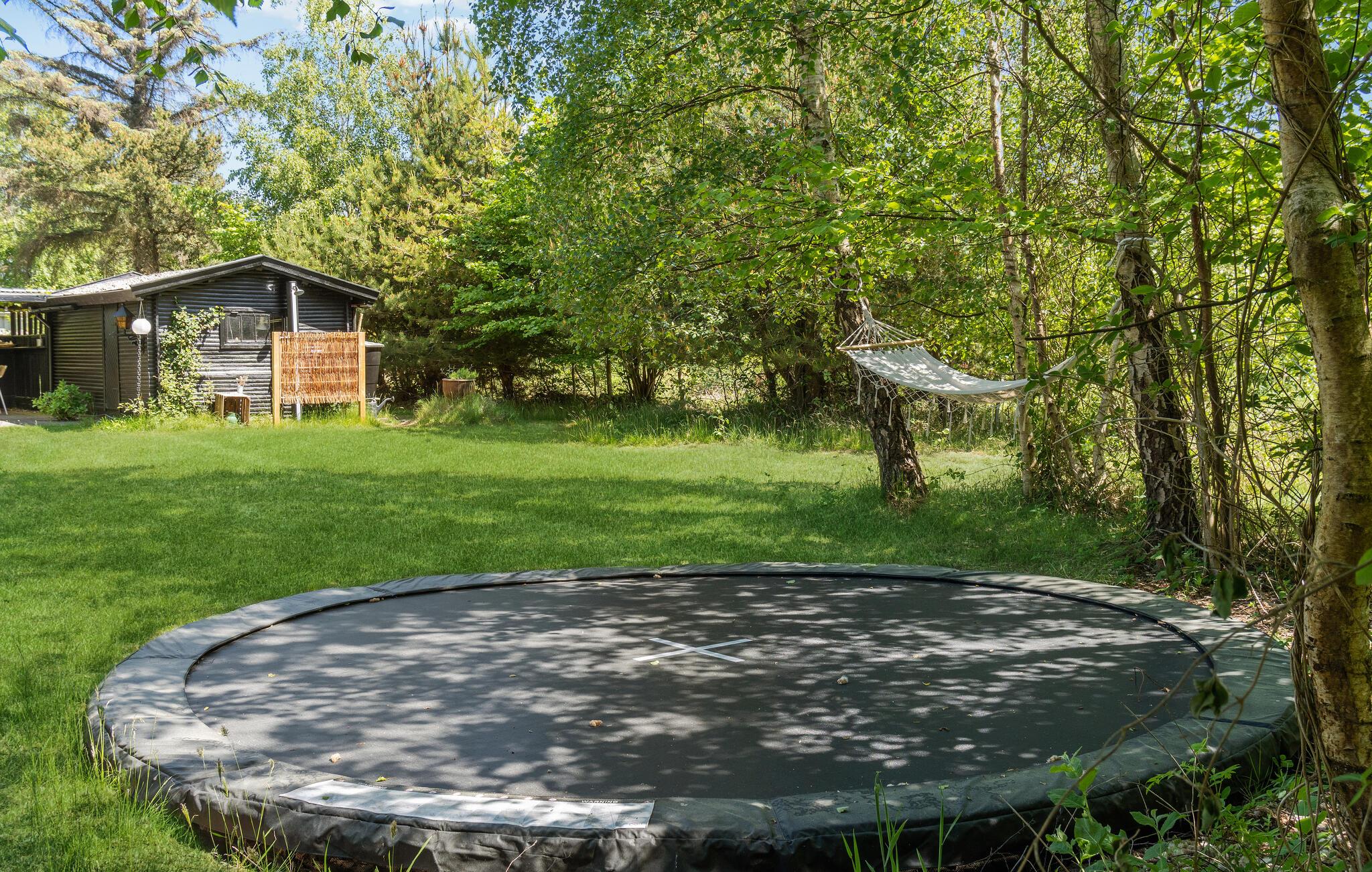 Charmerende sommerhus nær Yderby Lyng Strand med stor terrasse, trampolin og moderne faciliteter.